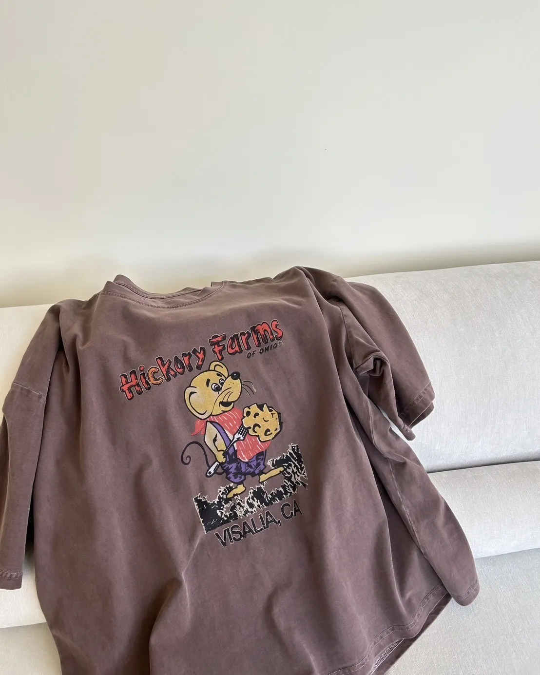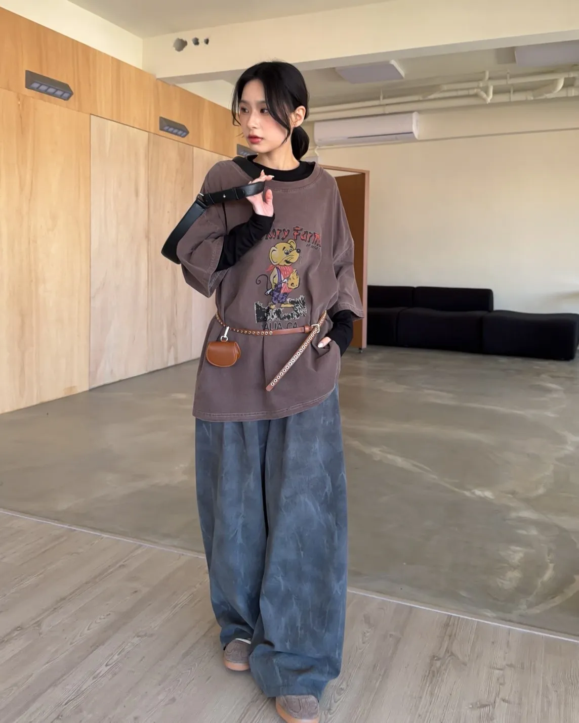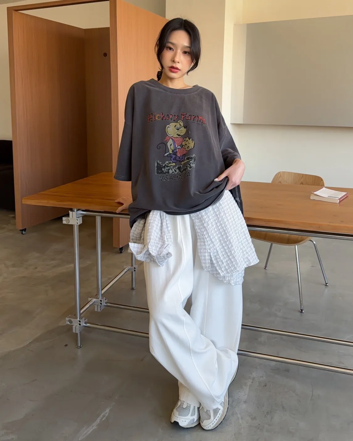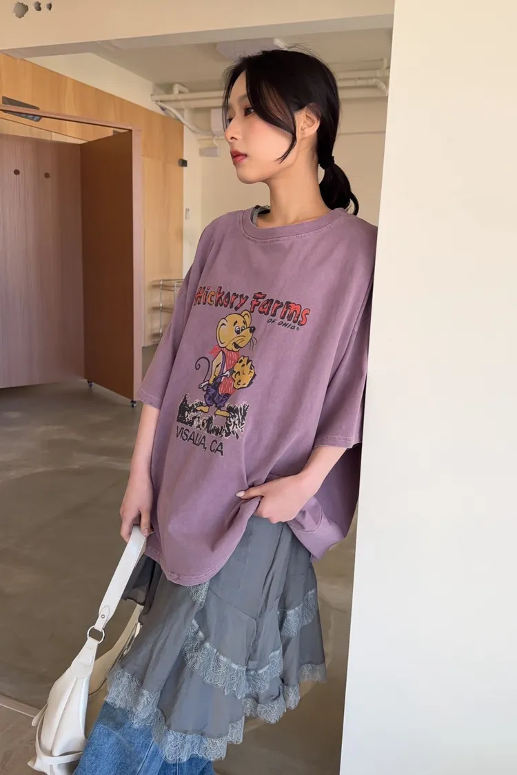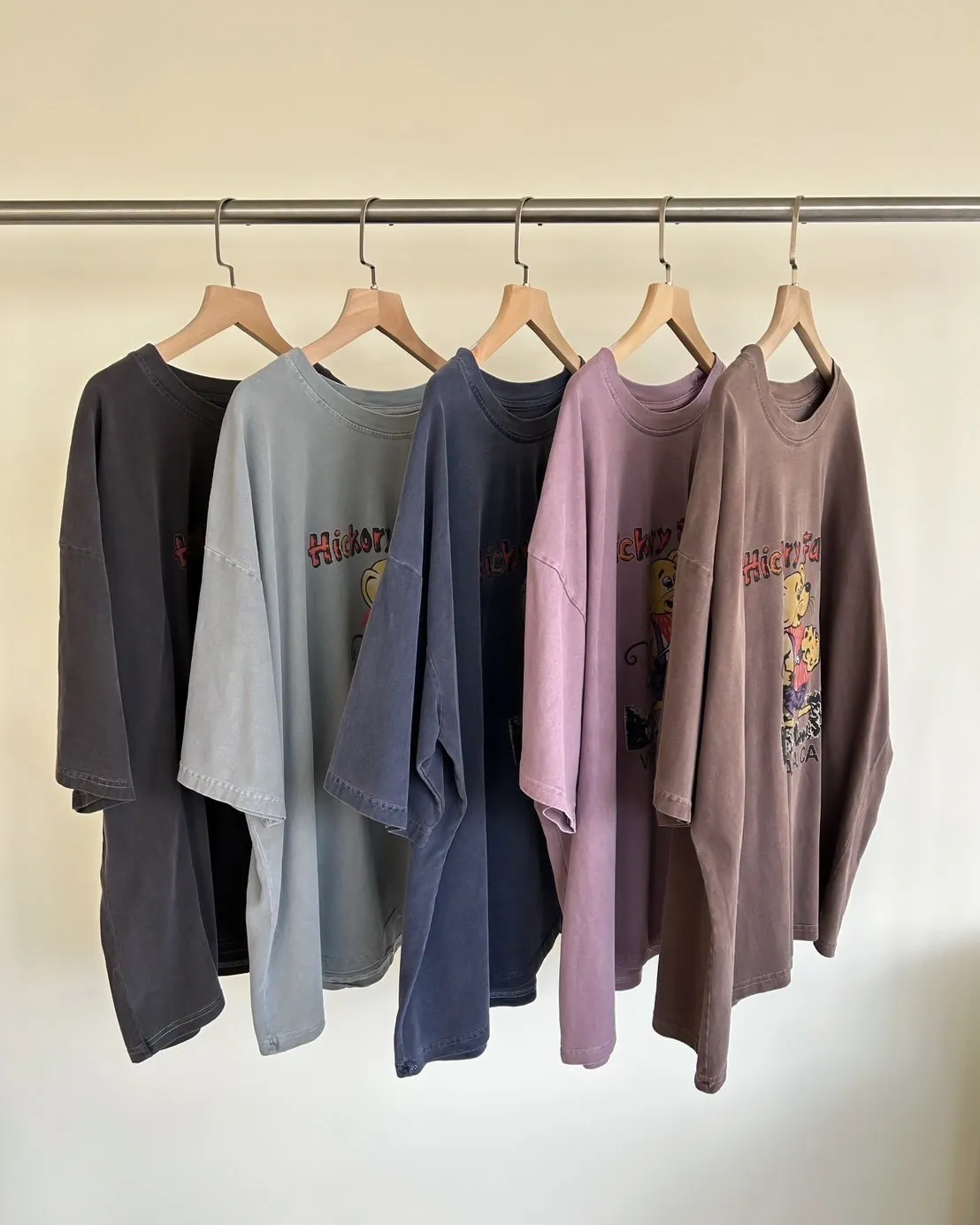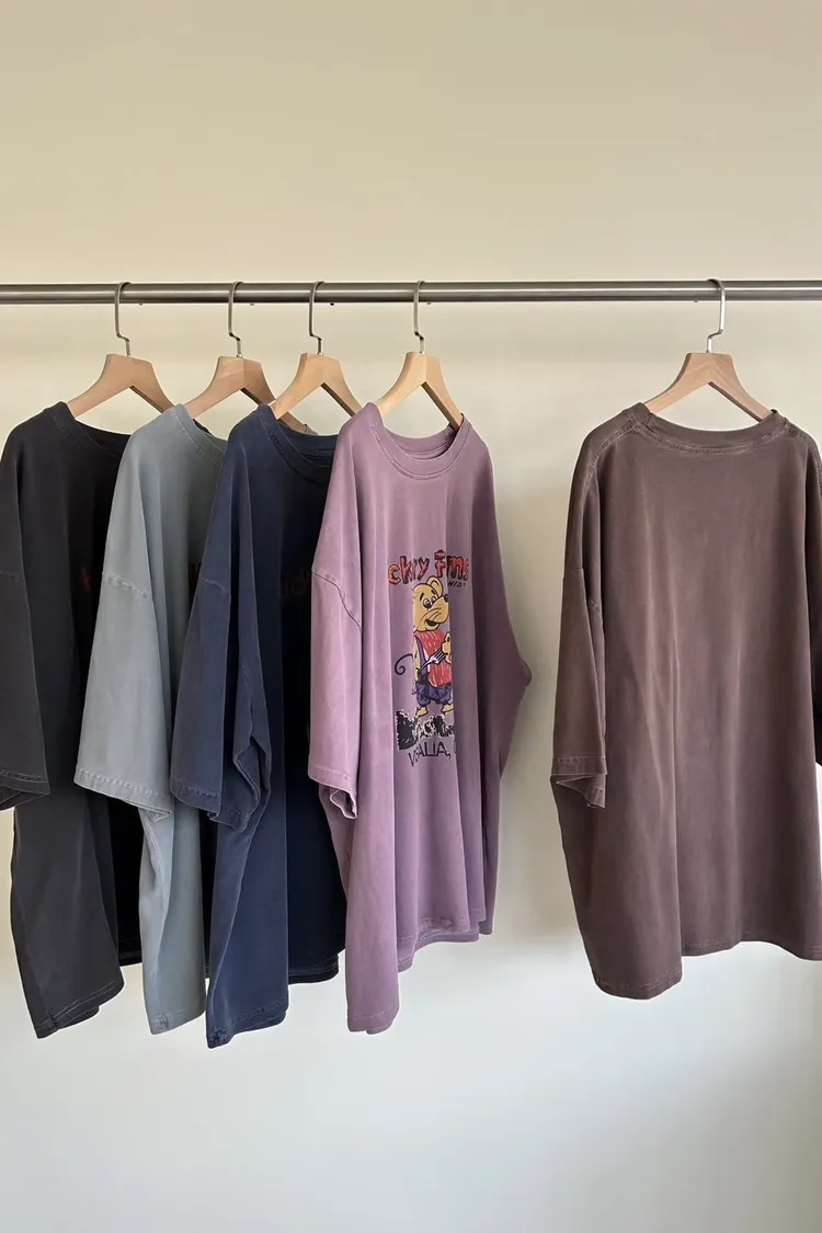 寬鬆落肩 刷白水洗做舊 老鼠起司印花