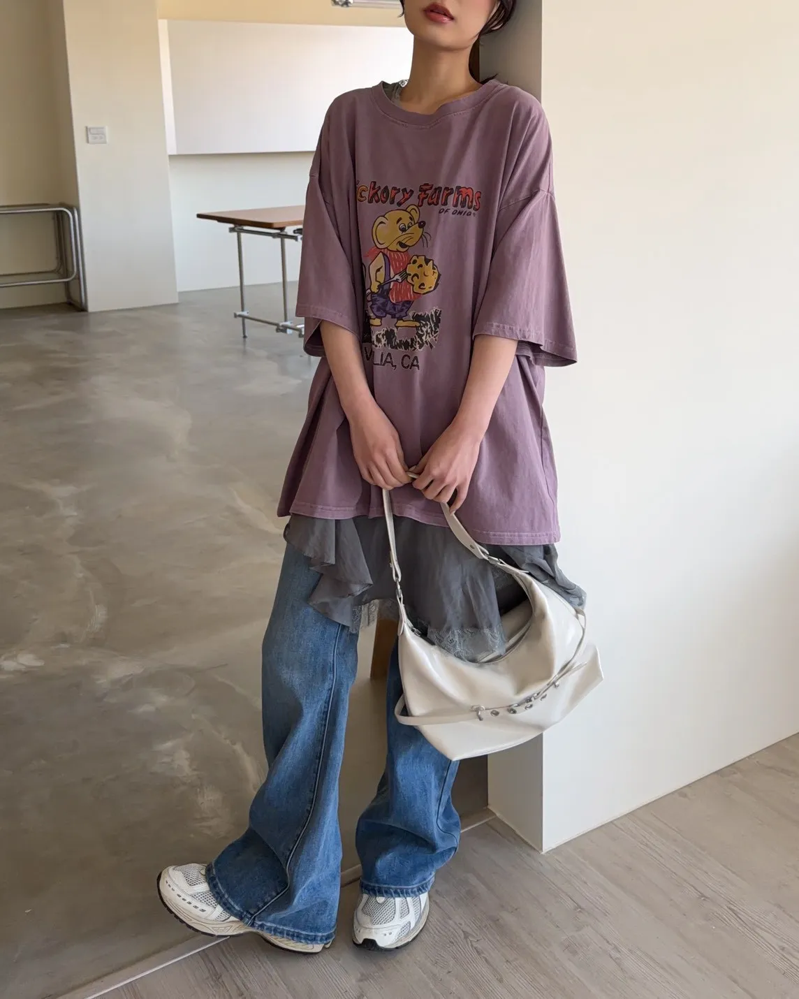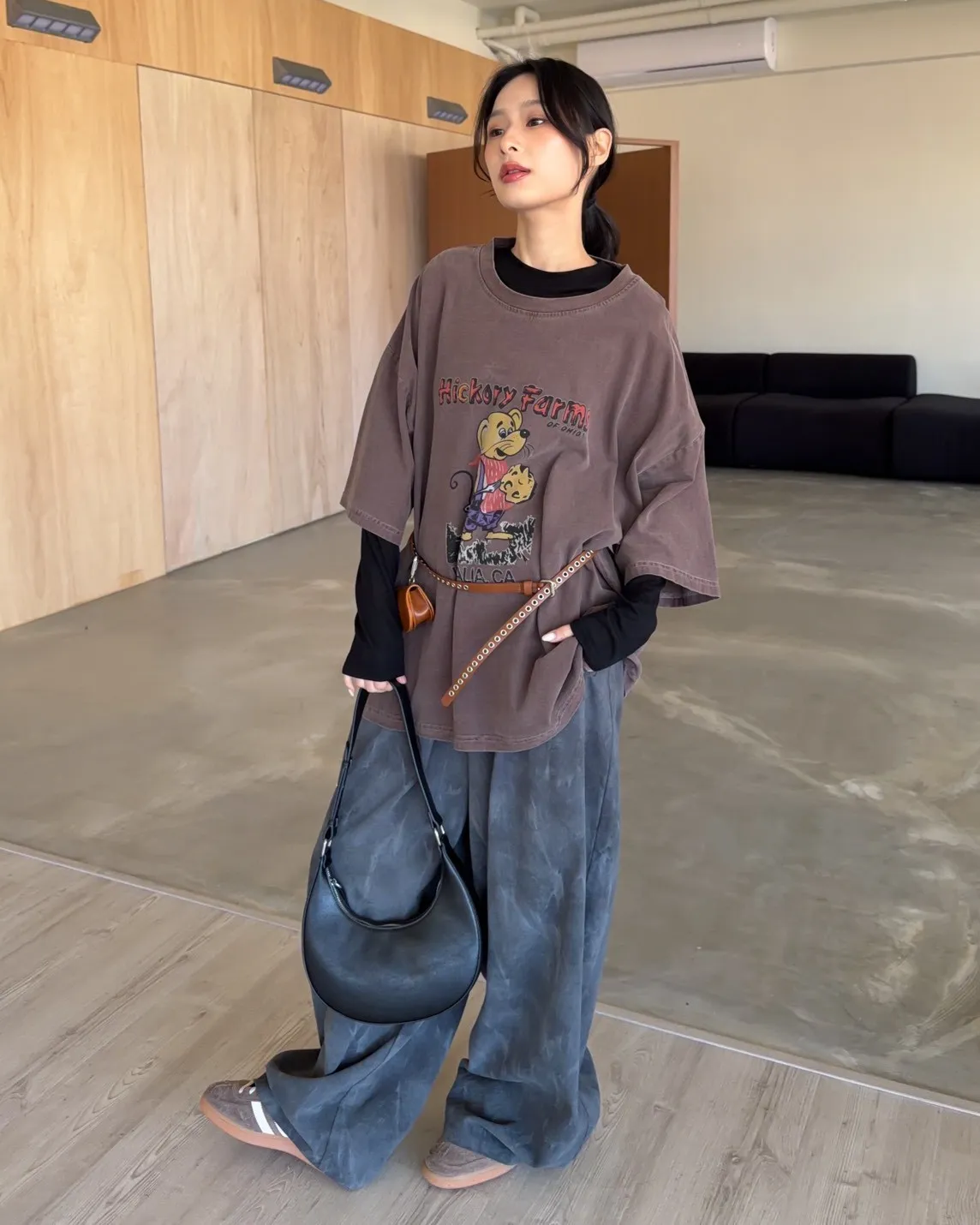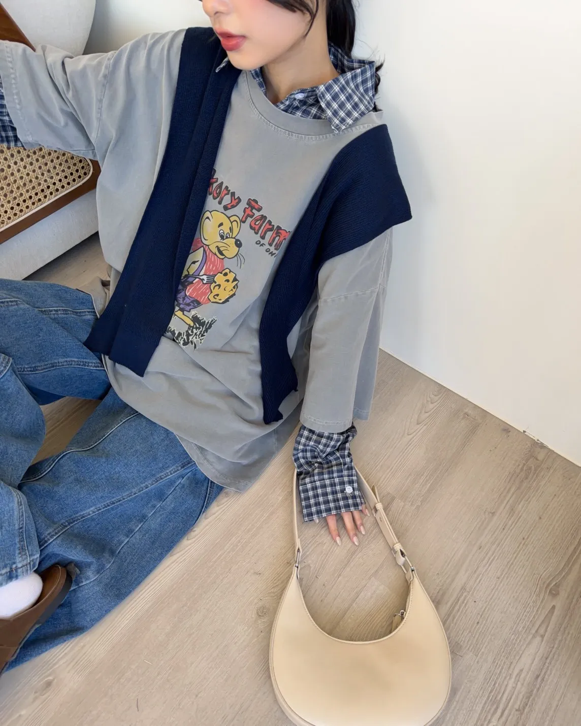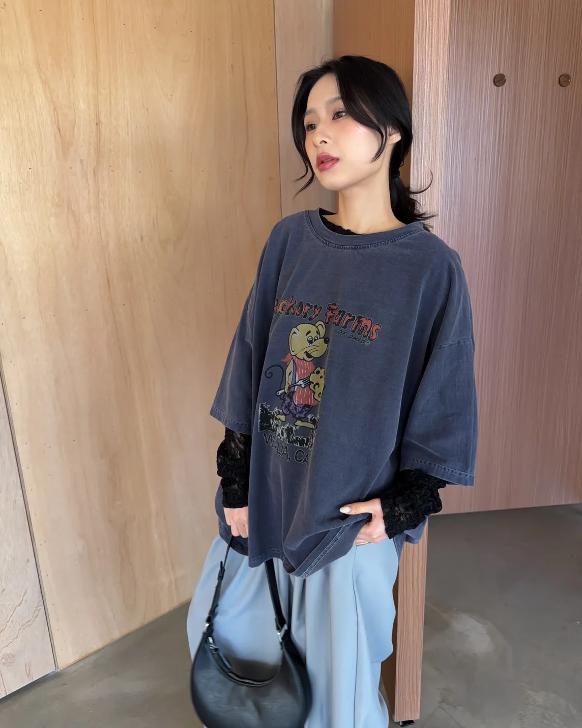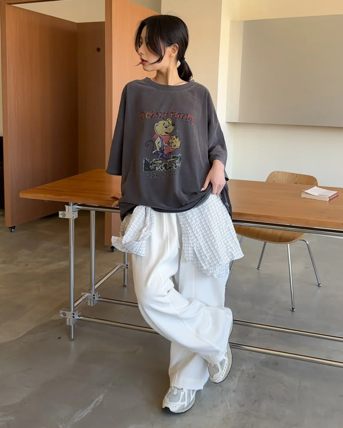 寬鬆落肩 刷白水洗做舊 老鼠起司印花