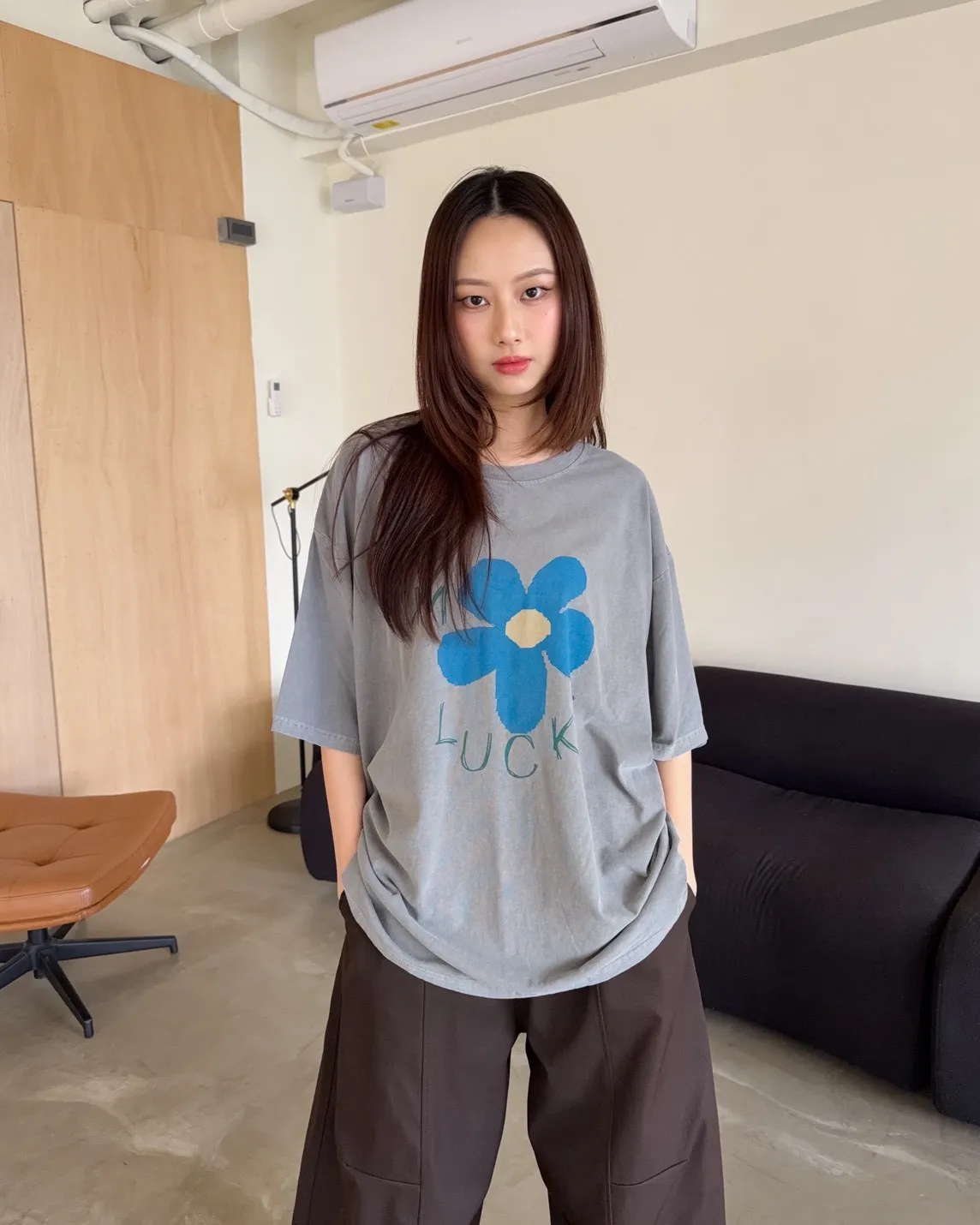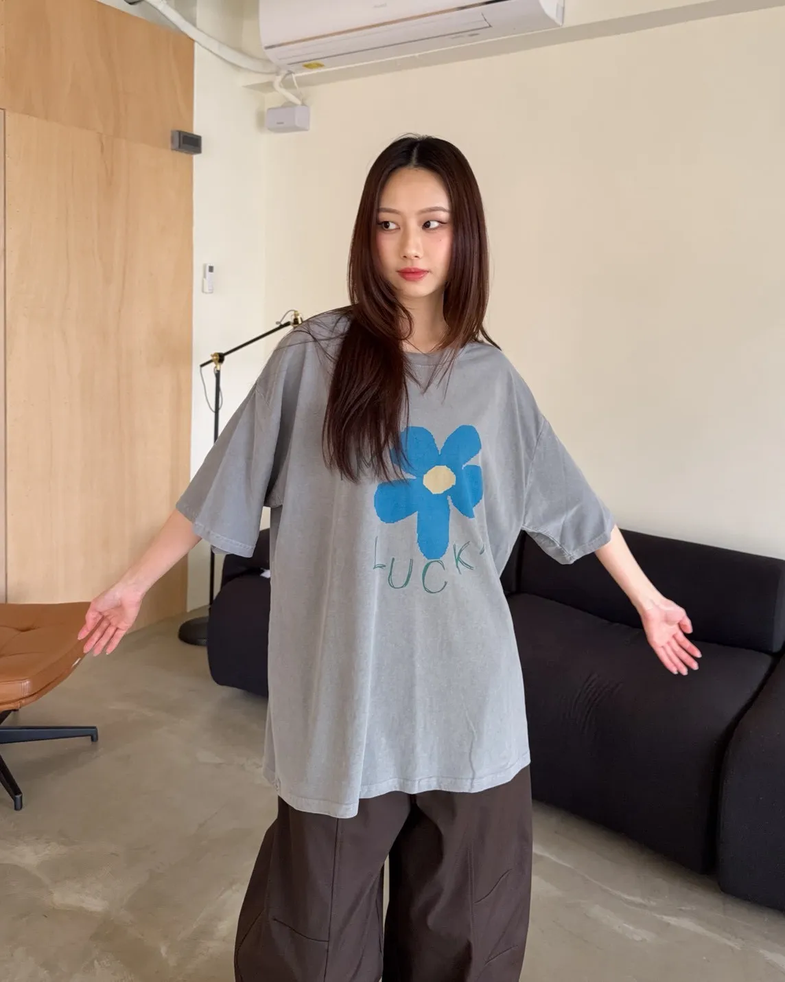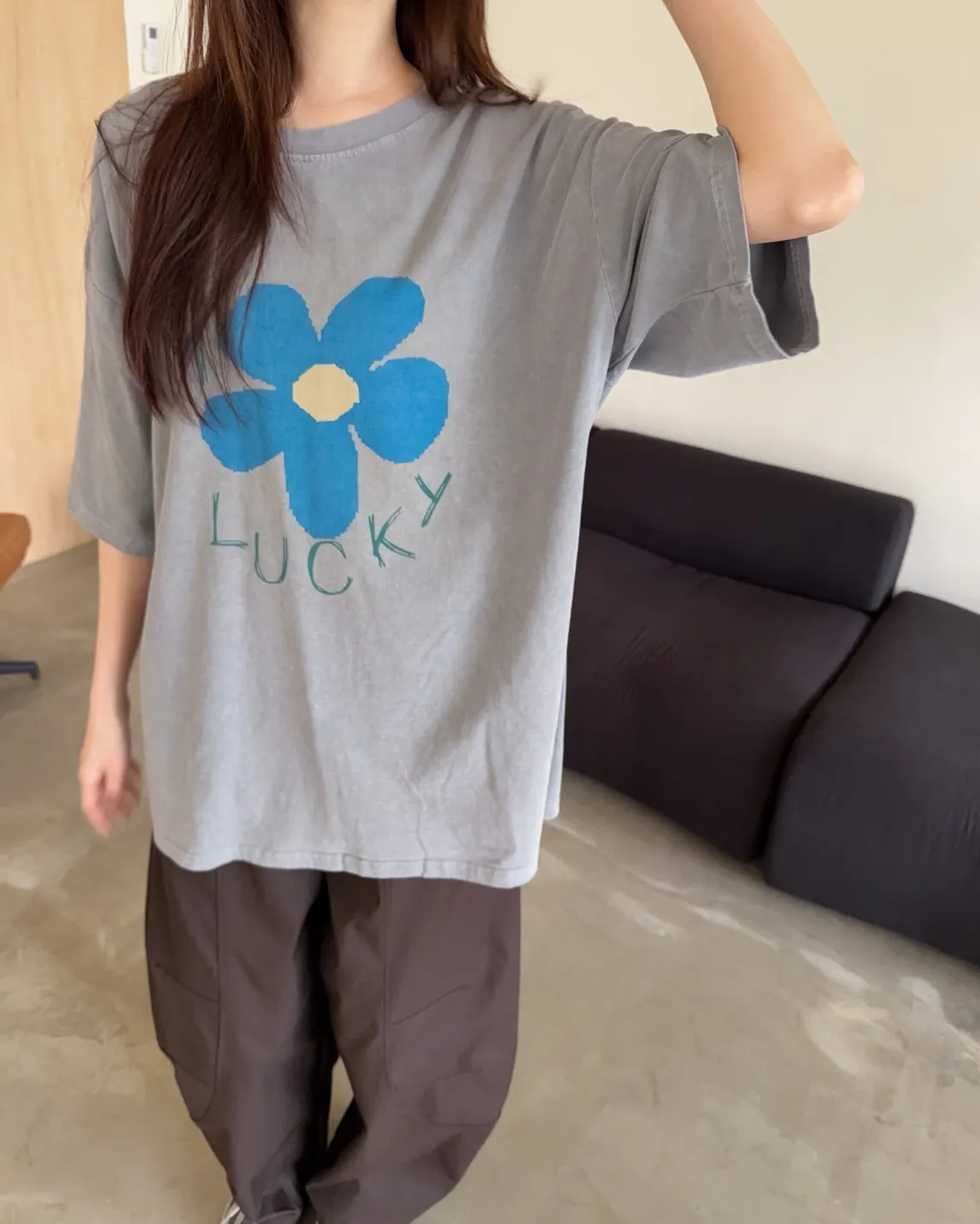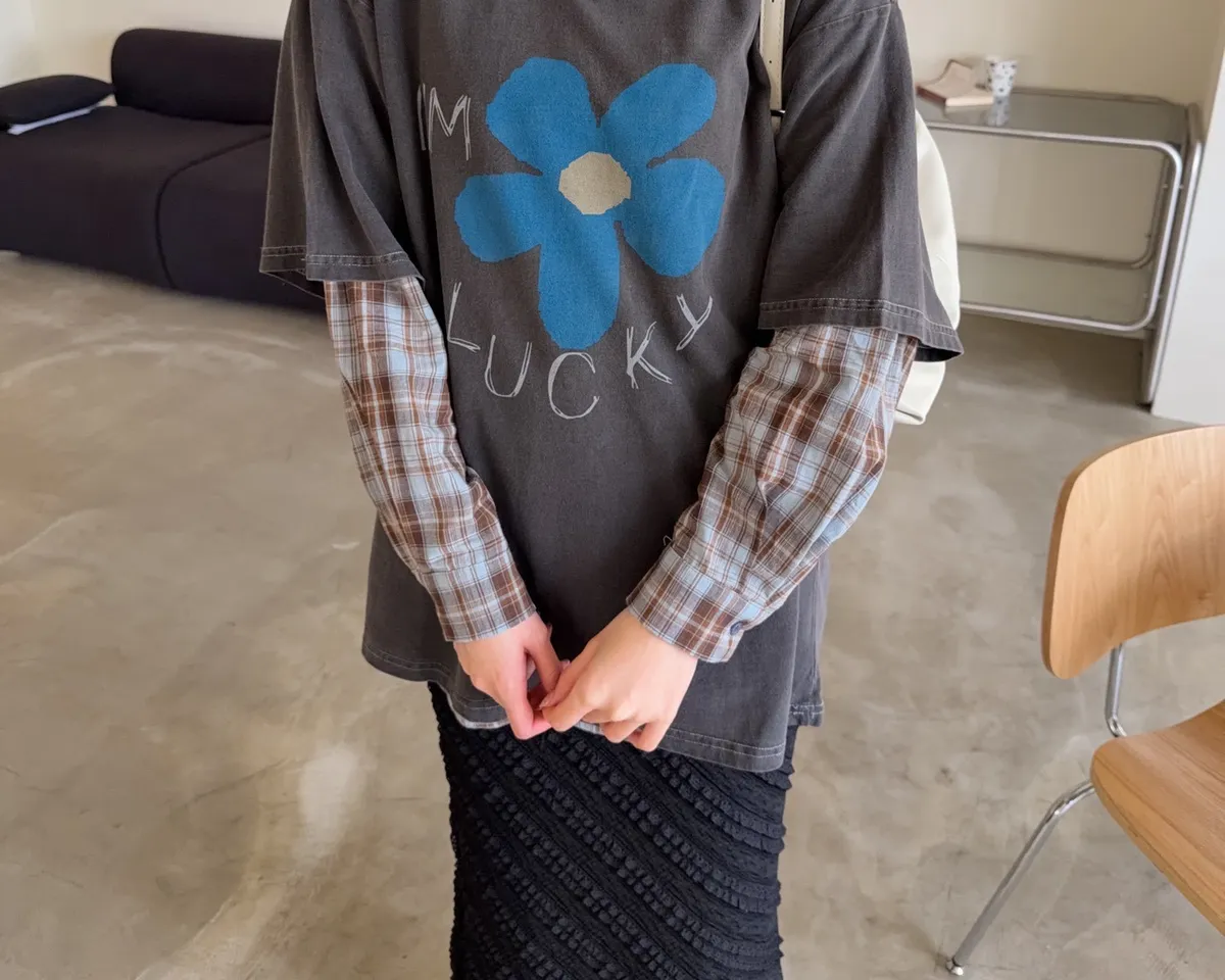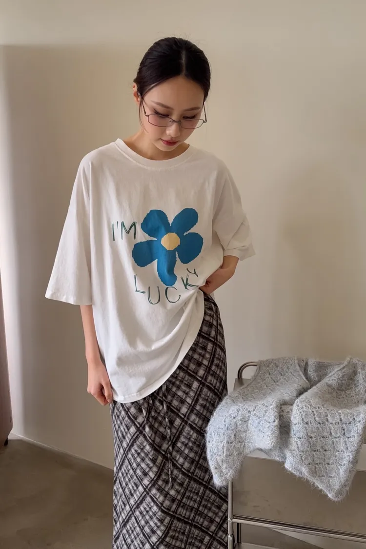 寬鬆落肩 水洗布料 藍色花朵印花 塗鴉感英文字