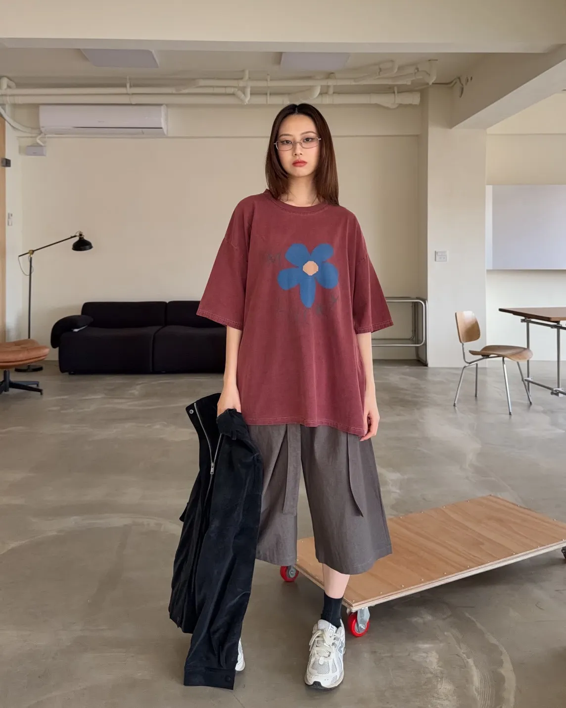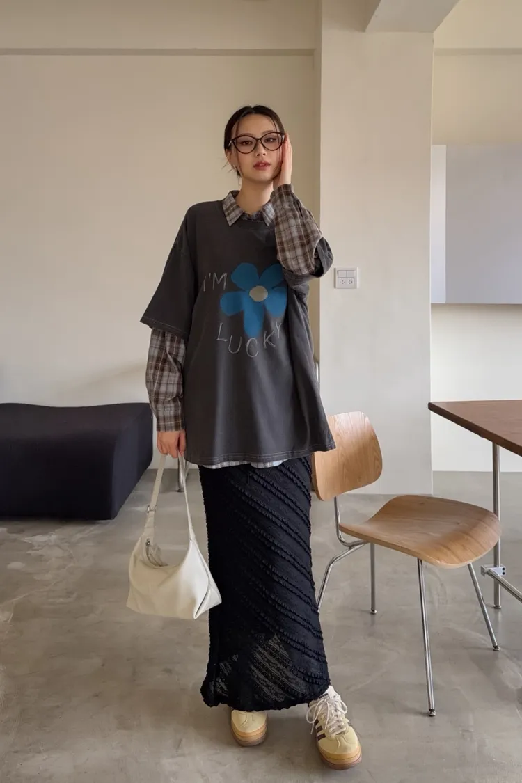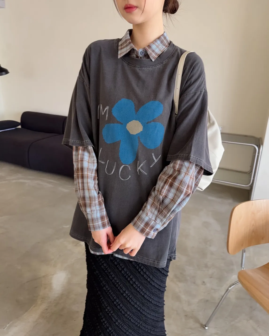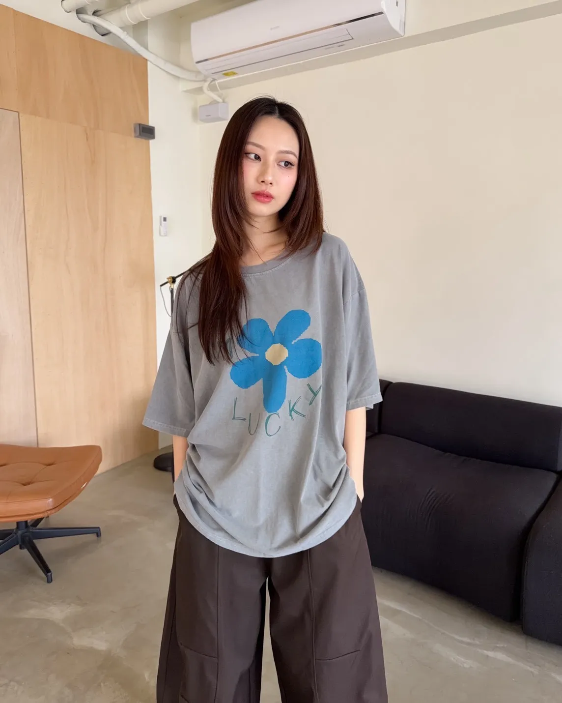 寬鬆落肩 水洗布料 藍色花朵印花 塗鴉感英文字
