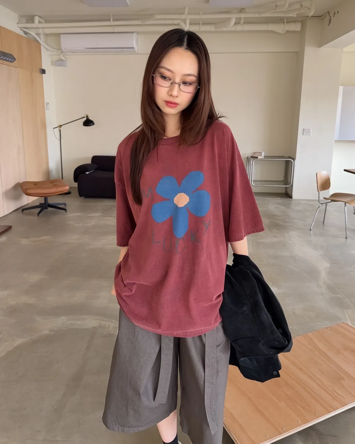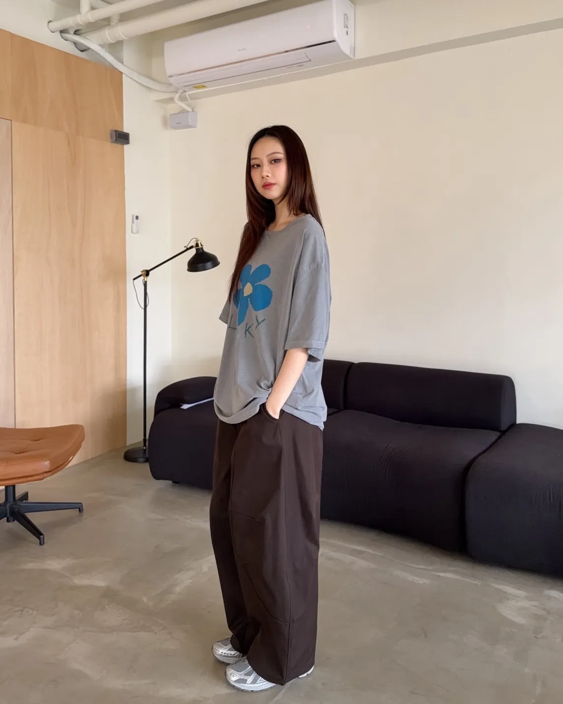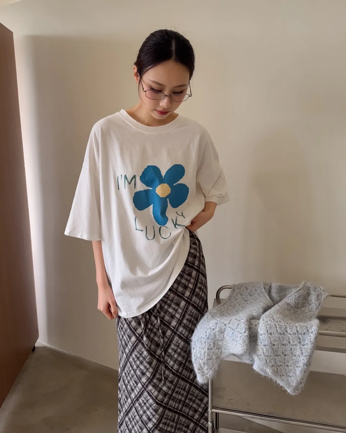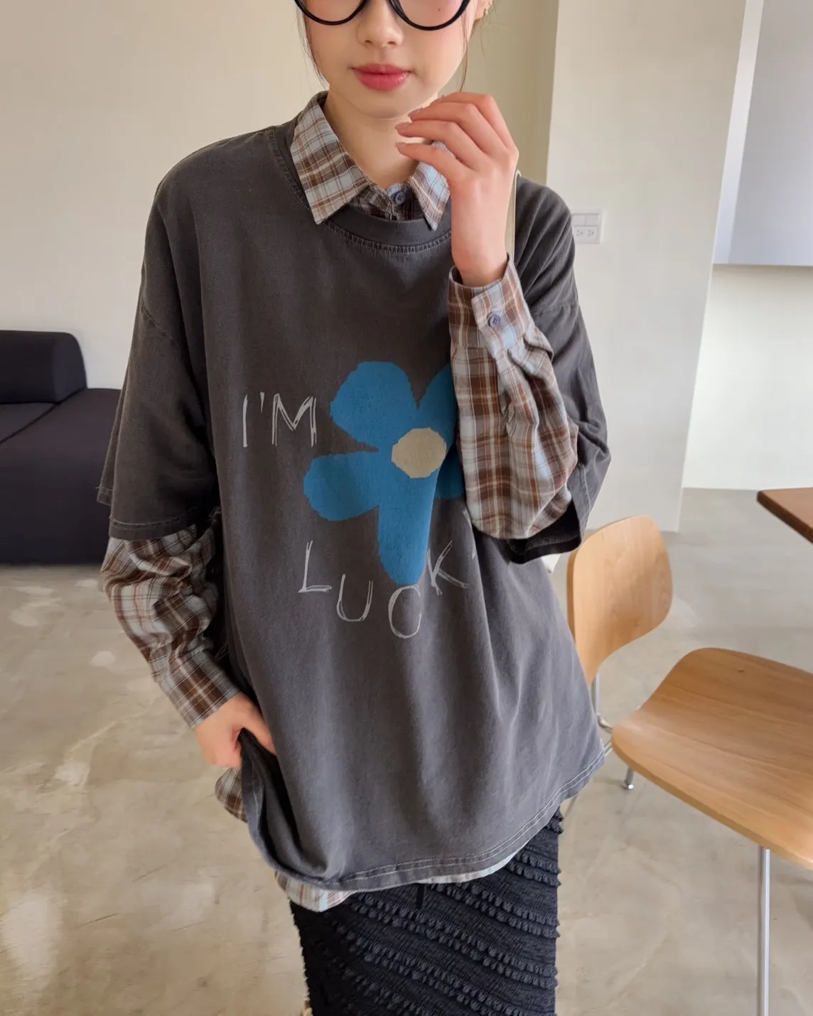 寬鬆落肩 水洗布料 藍色花朵印花 塗鴉感英文字