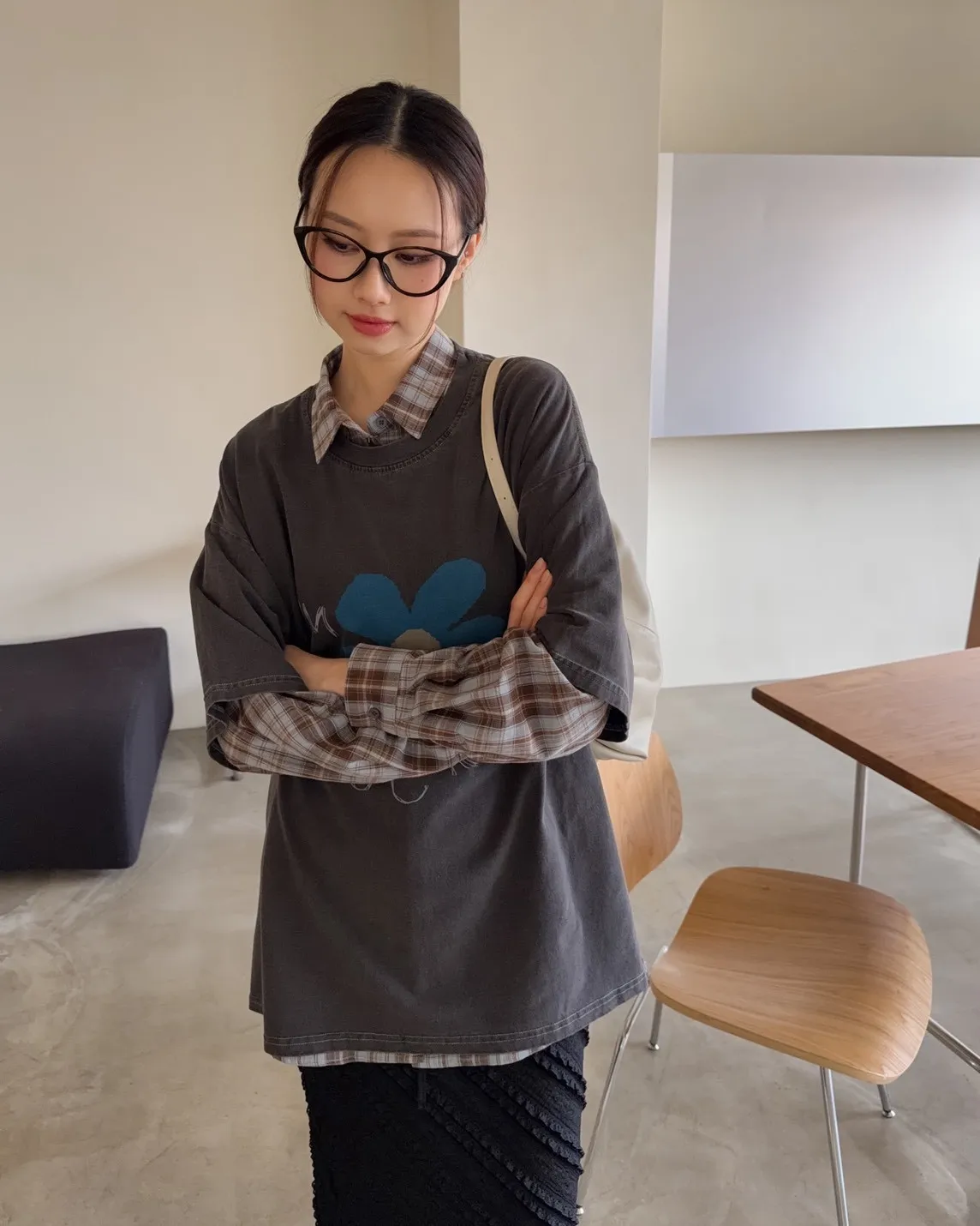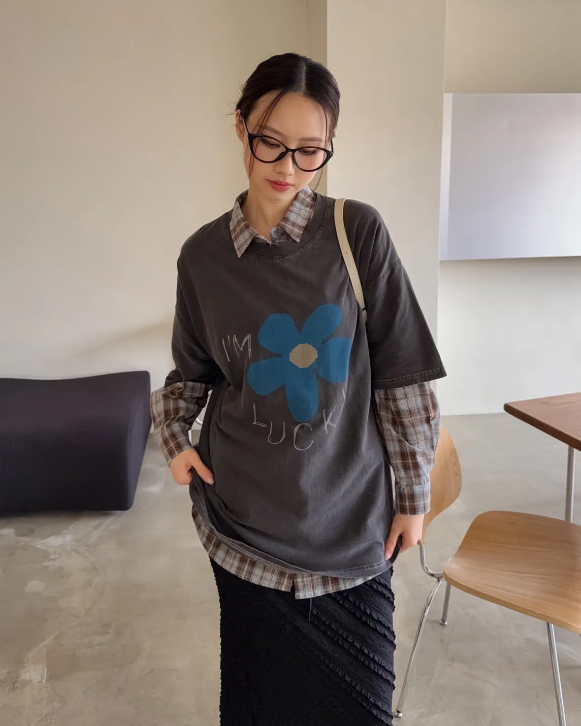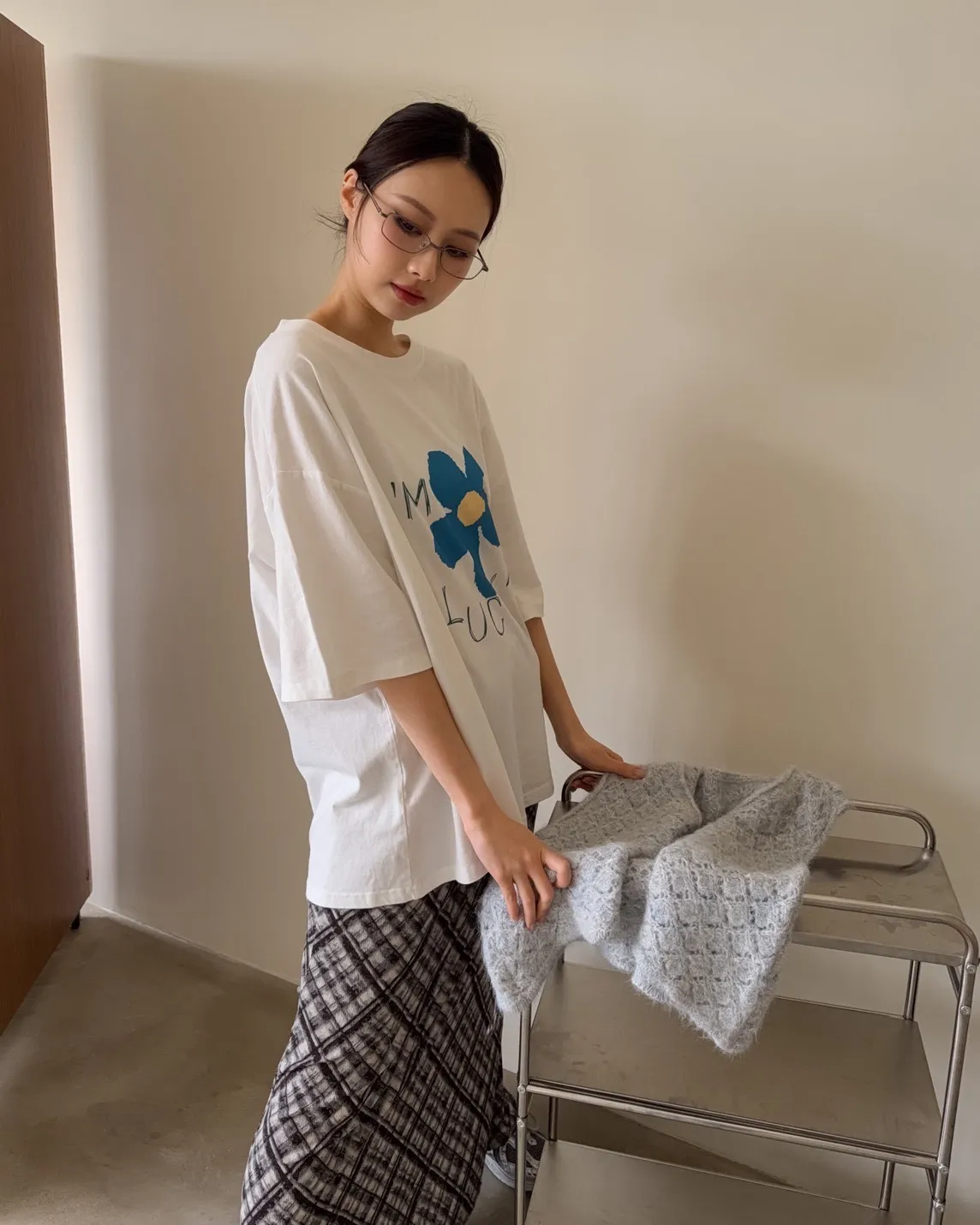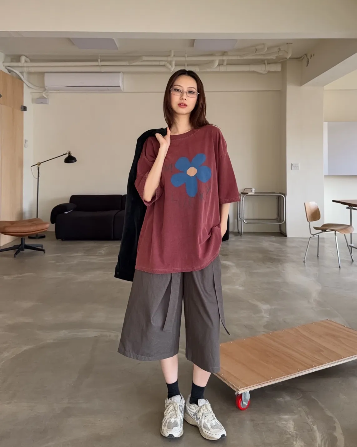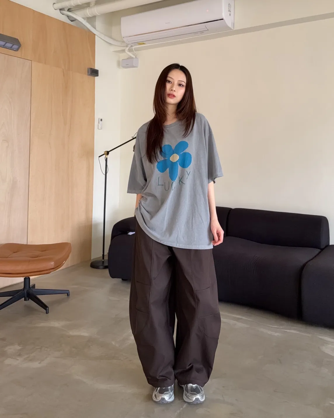 寬鬆落肩 水洗布料 藍色花朵印花 塗鴉感英文字
