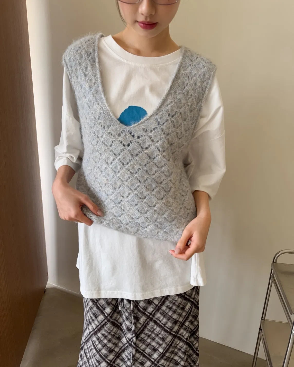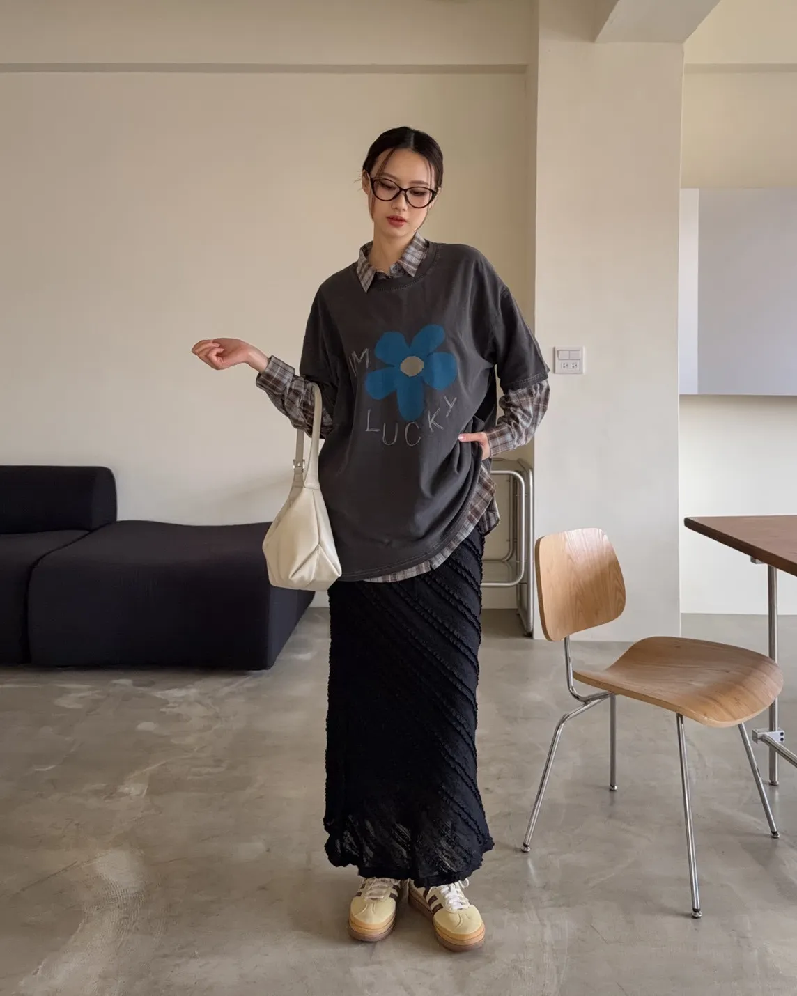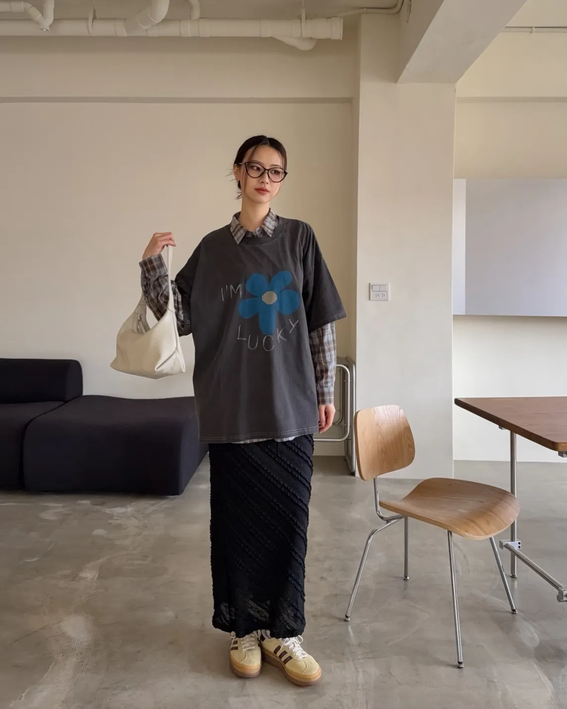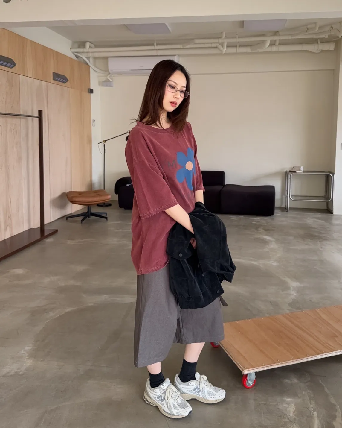 寬鬆落肩 水洗布料 藍色花朵印花 塗鴉感英文字