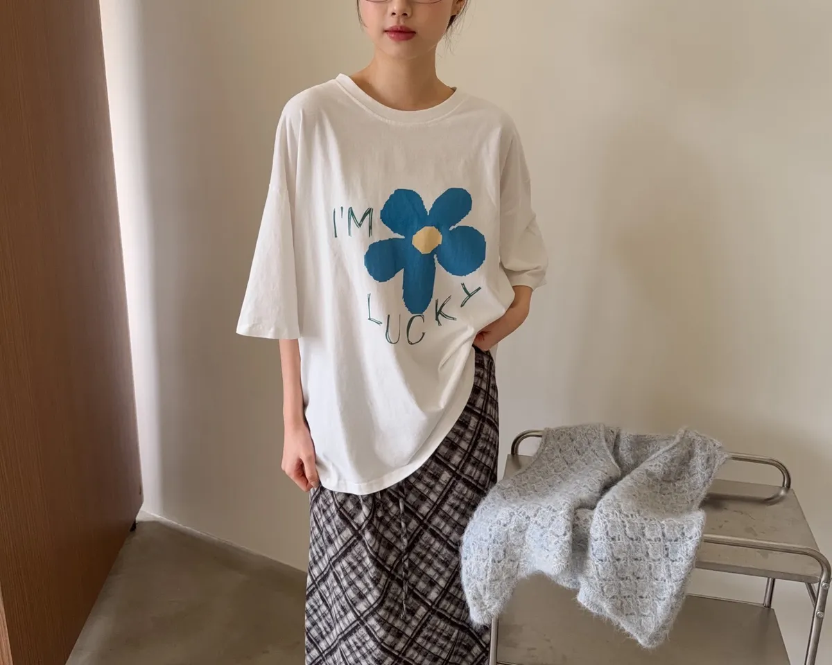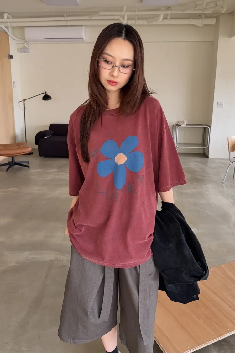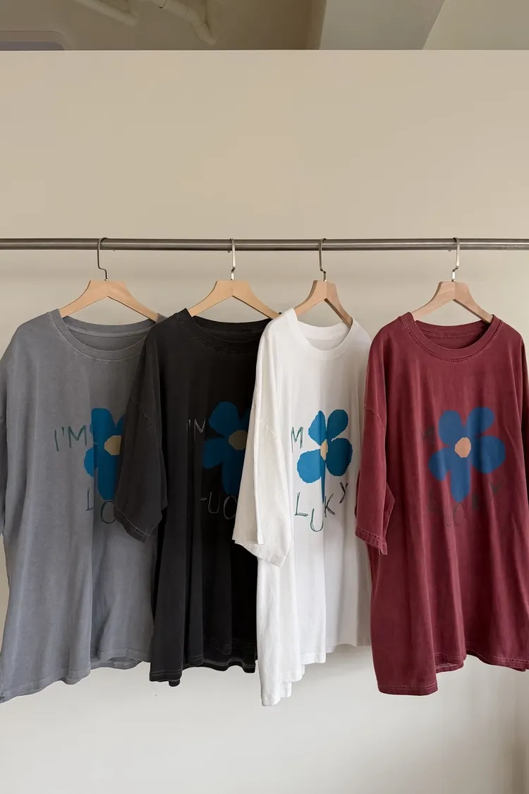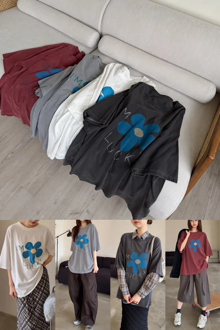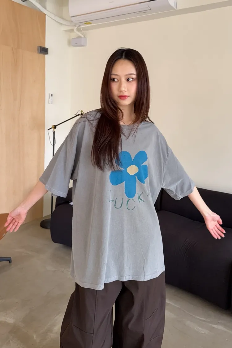 A0008幸運小藍花塗鴉水洗大T(白/紅/灰/深灰)