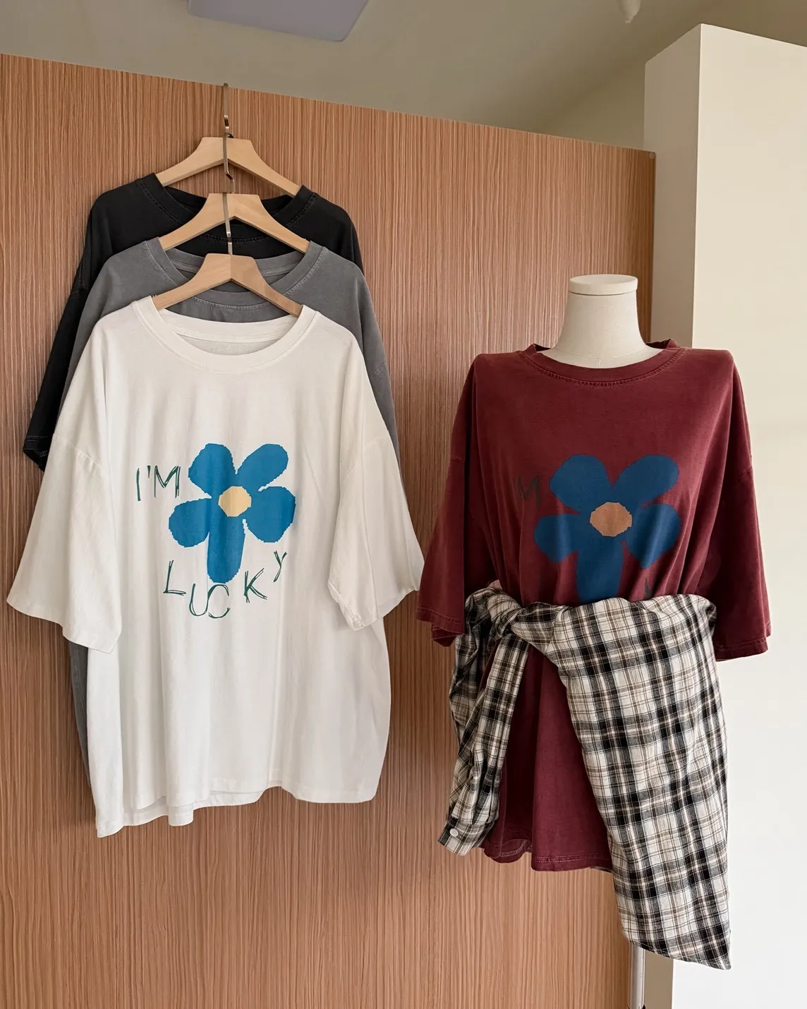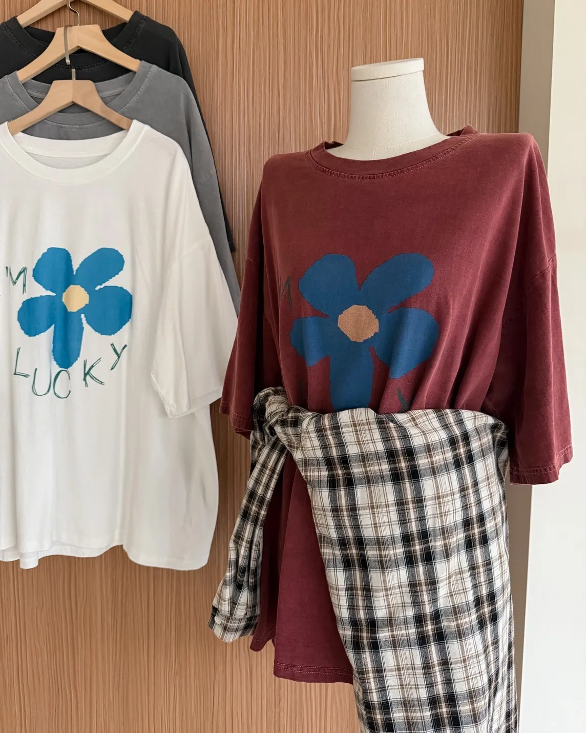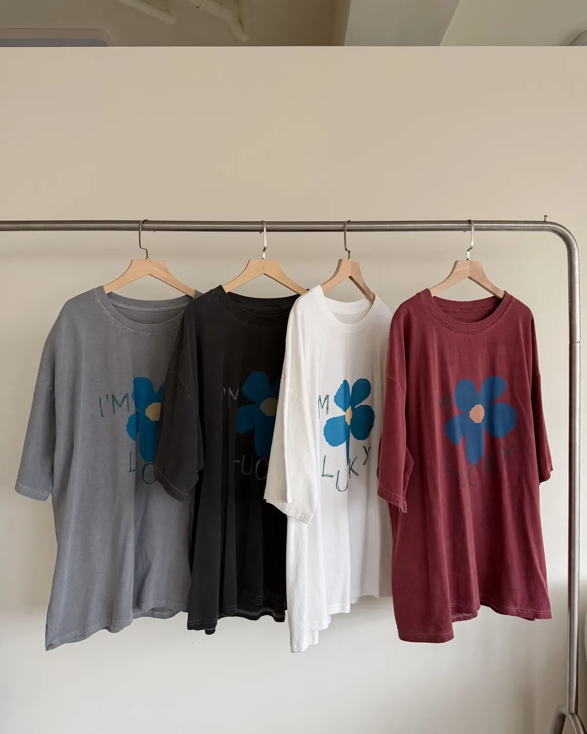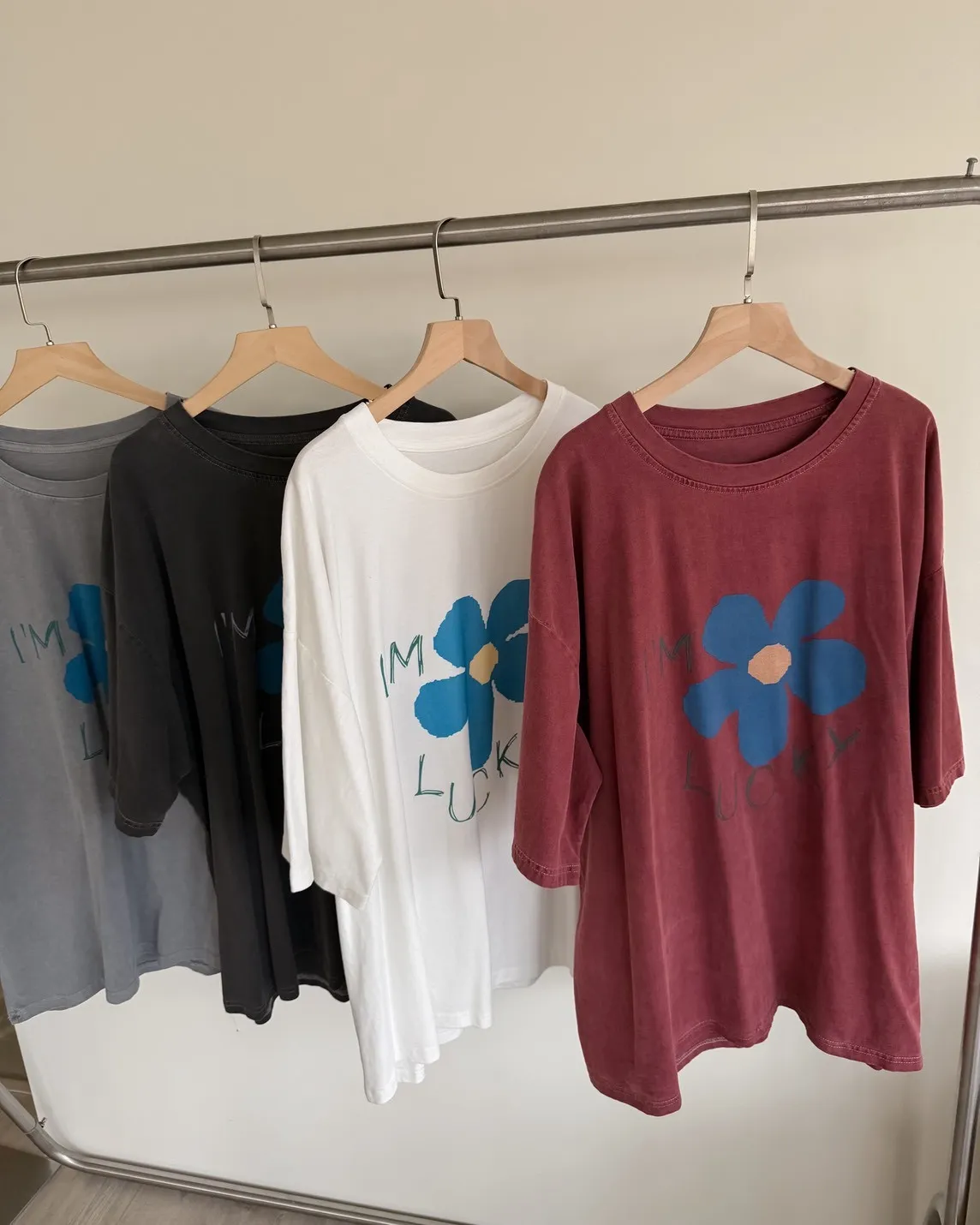 A0008幸運小藍花塗鴉水洗大T(白/紅/灰/深灰)