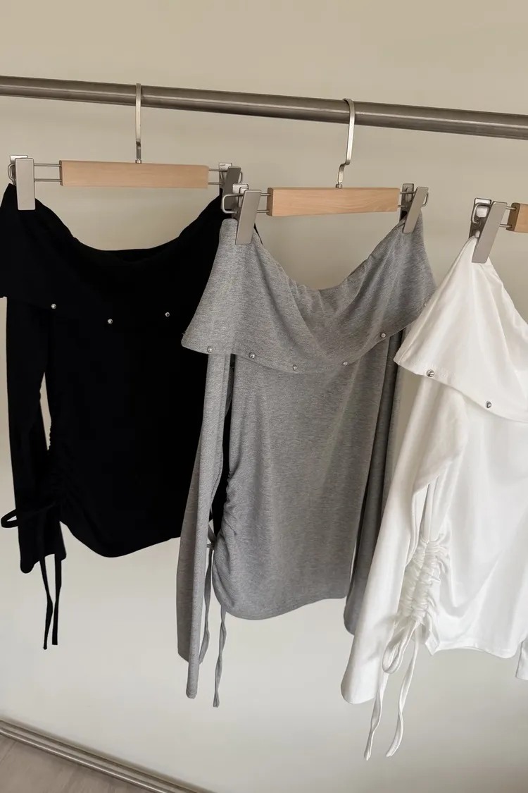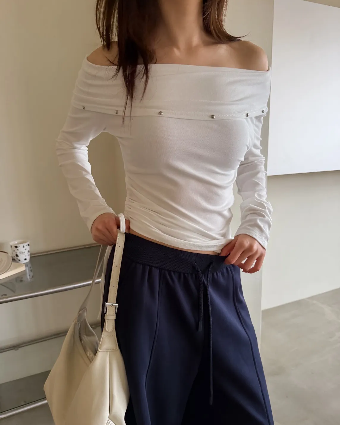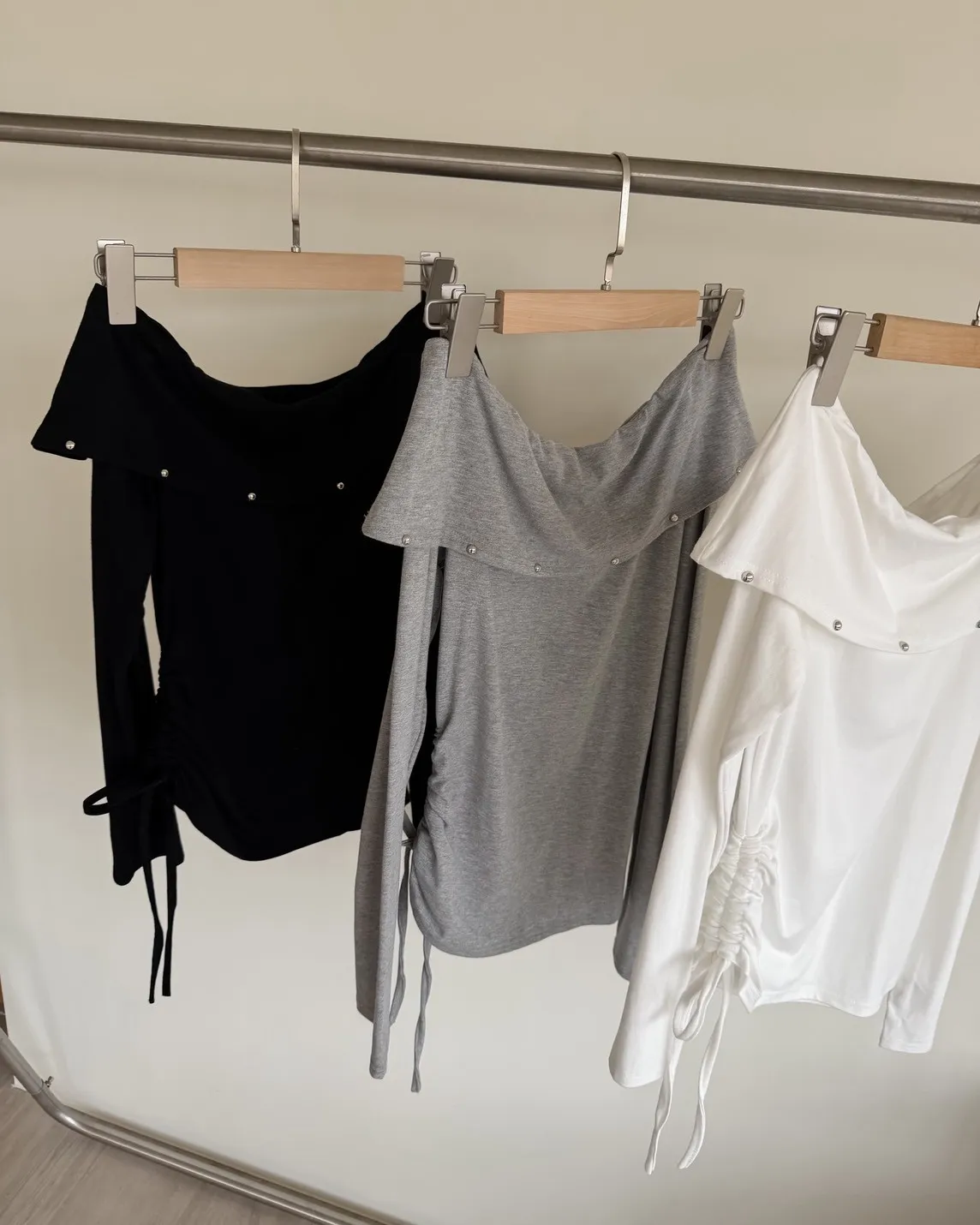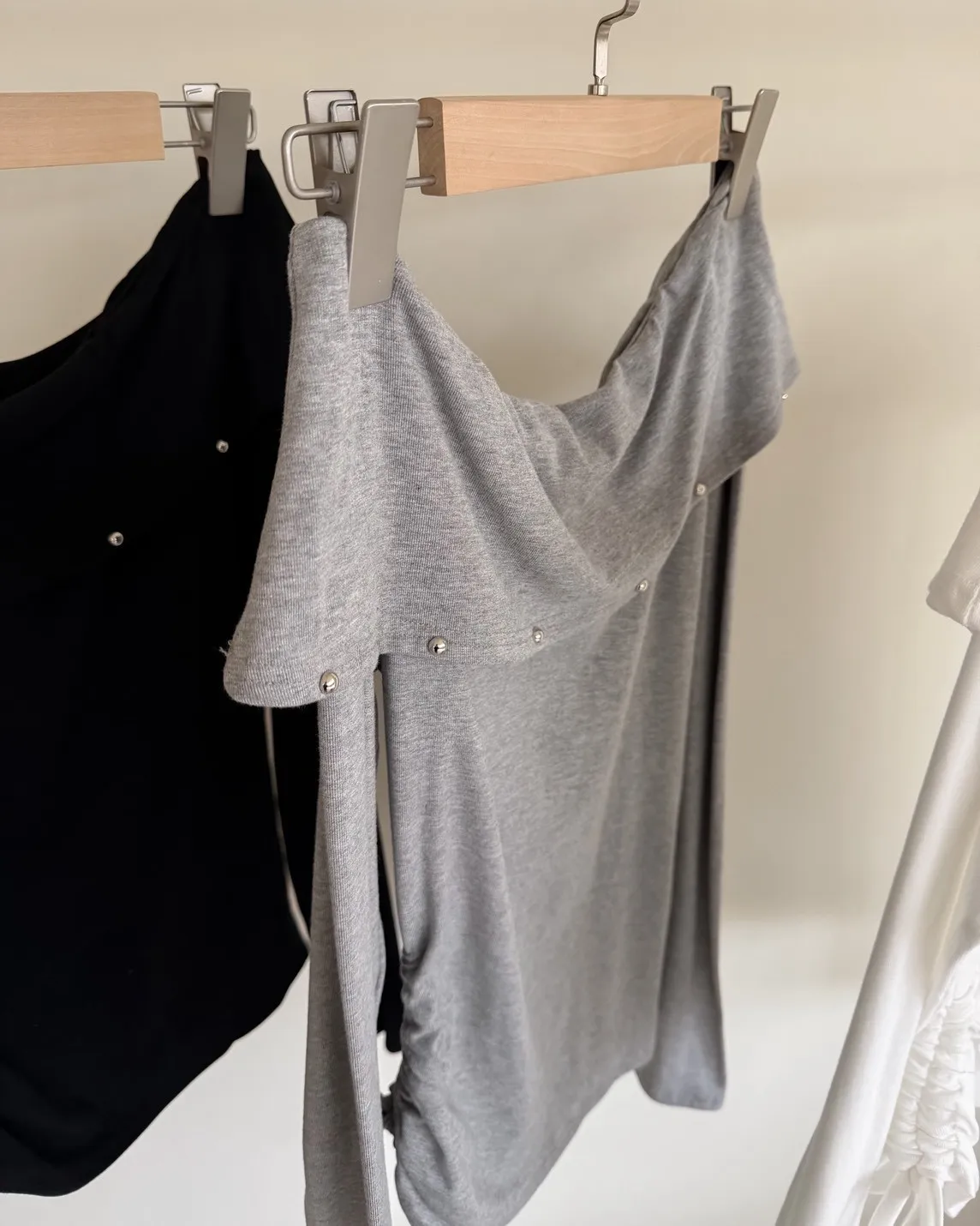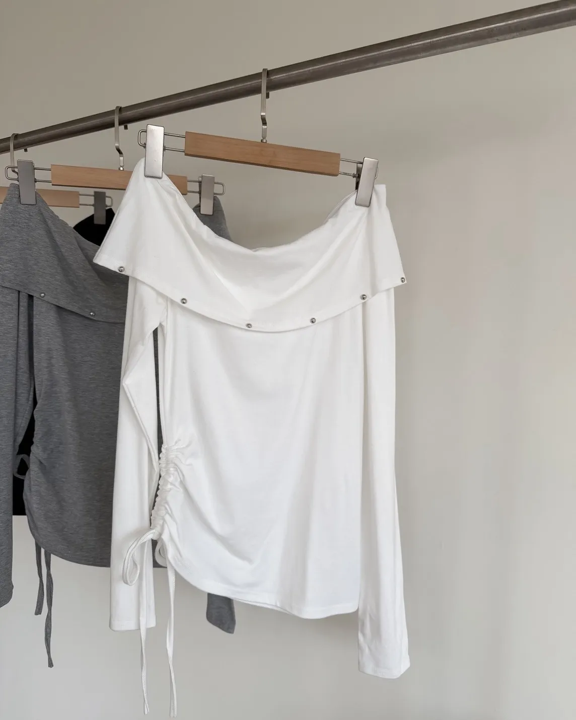A0018個性鉚釘一字領上衣(白/灰/黑)