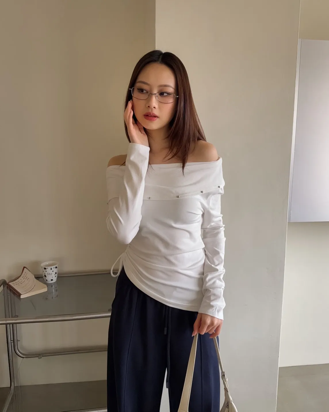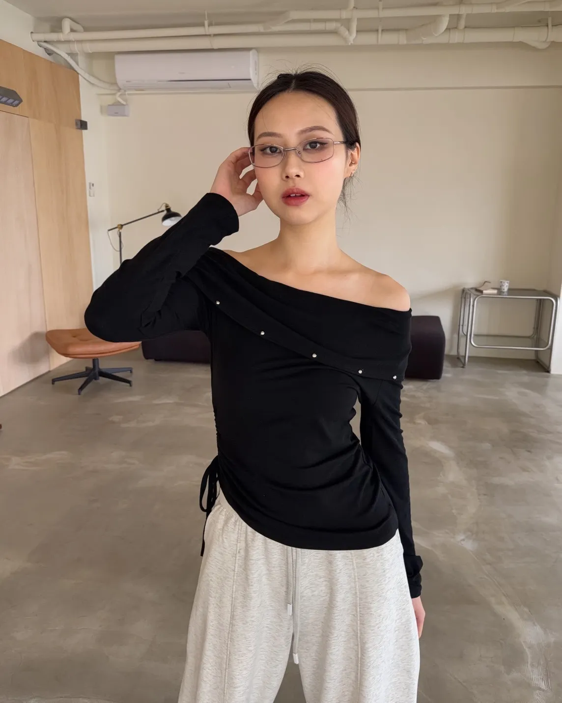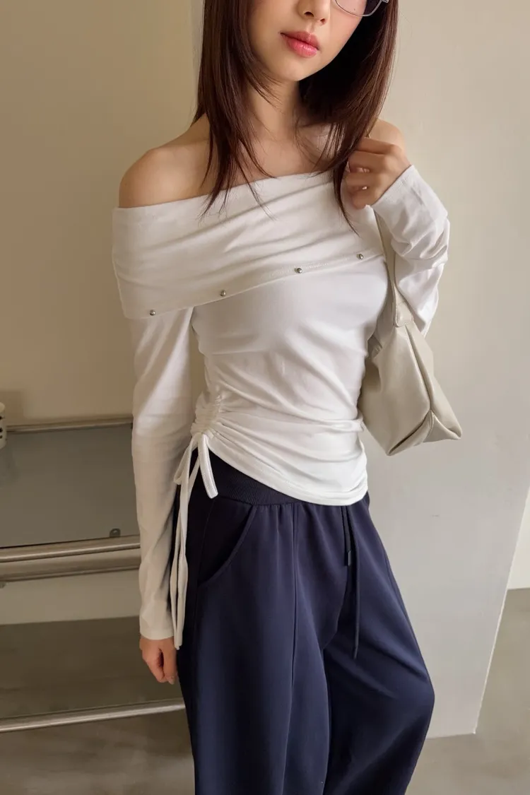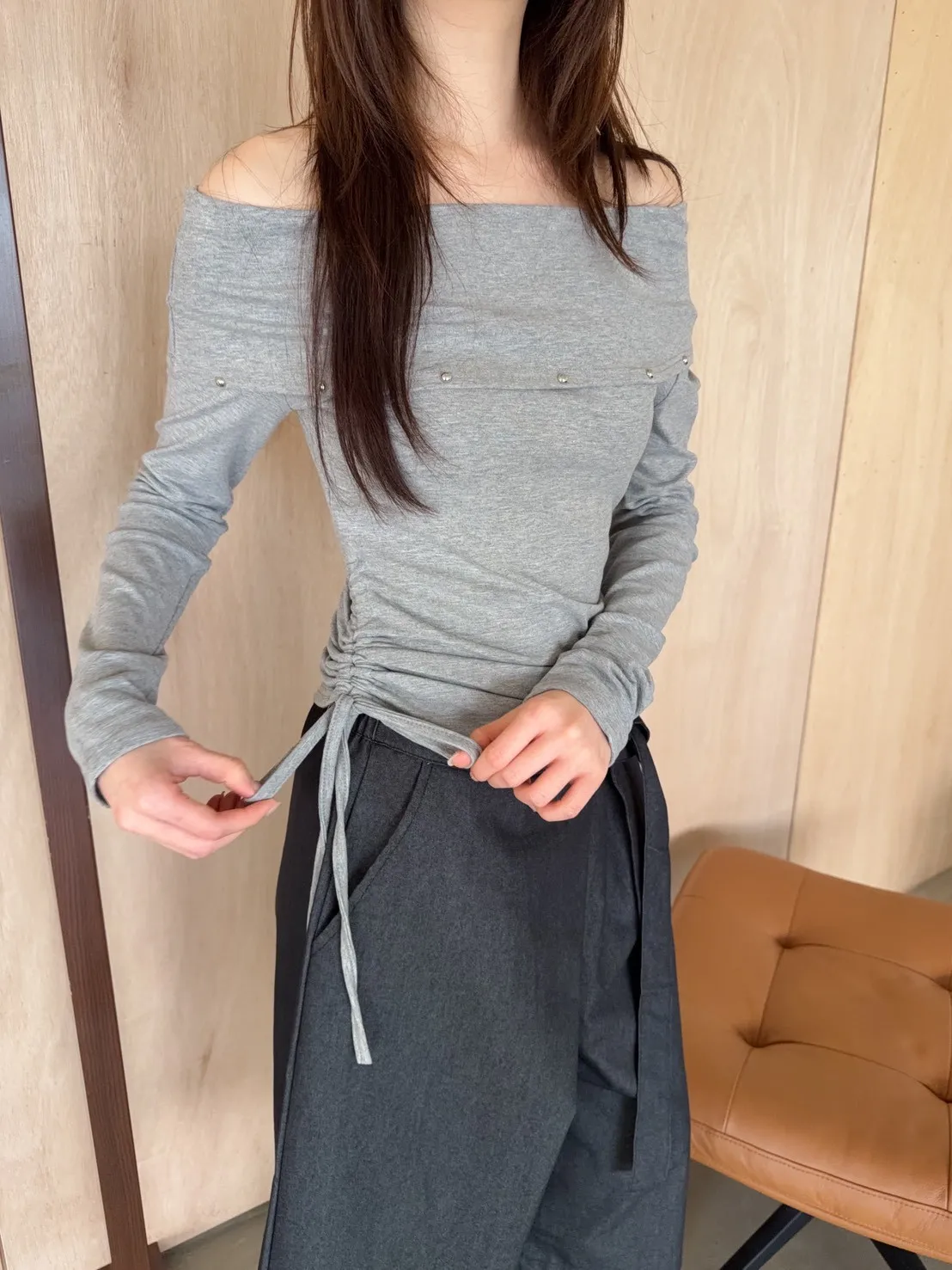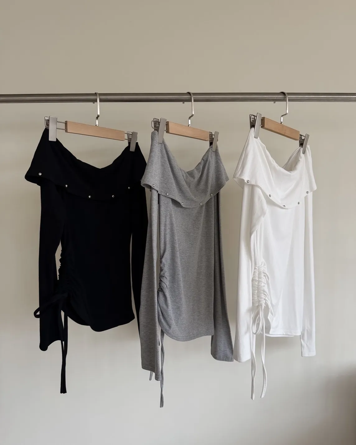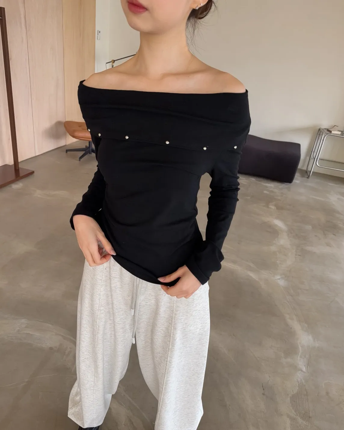 A0018個性鉚釘一字領上衣(白/灰/黑)
