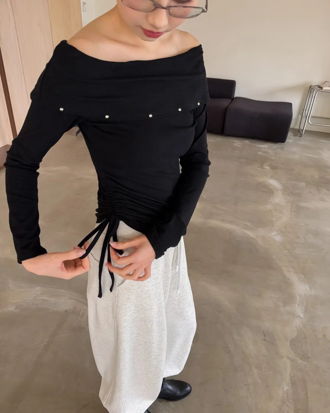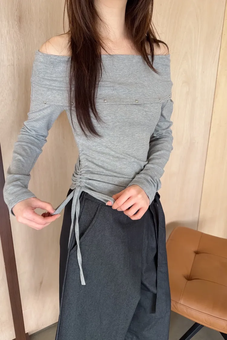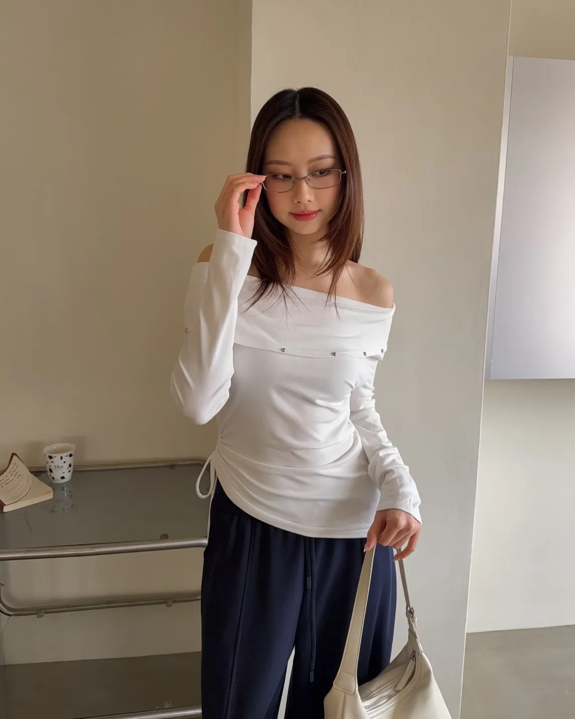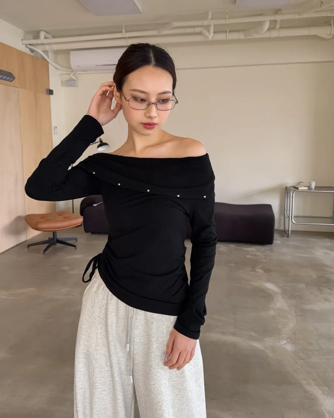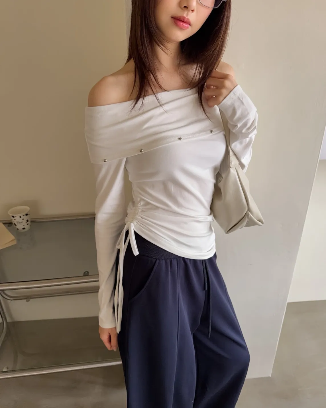 A0018個性鉚釘一字領上衣(白/灰/黑)