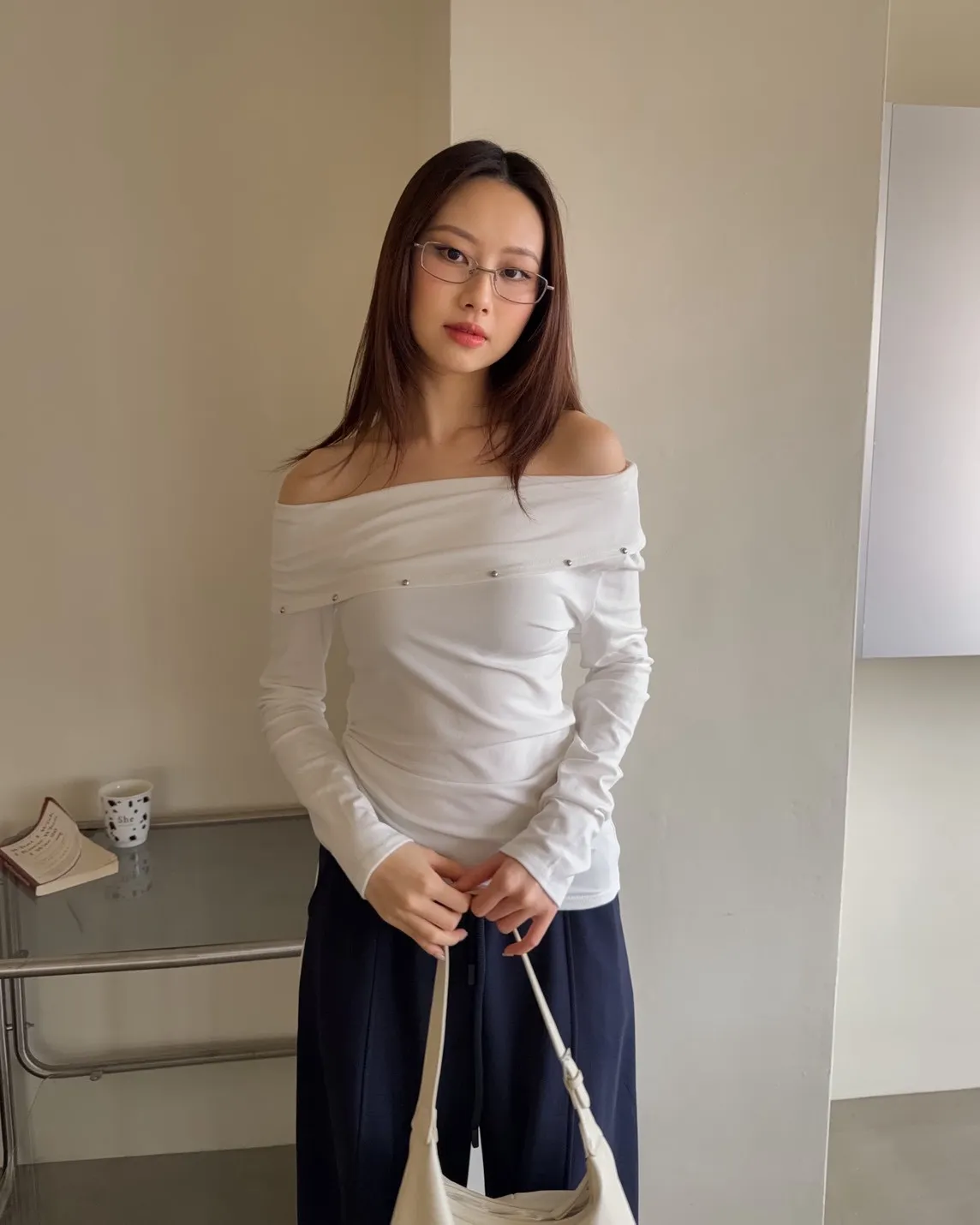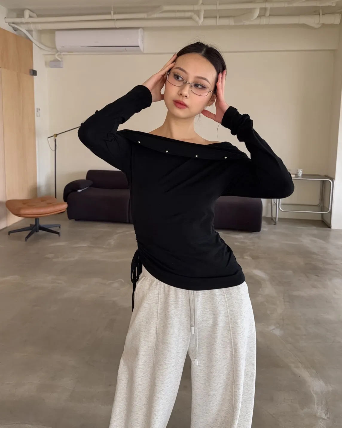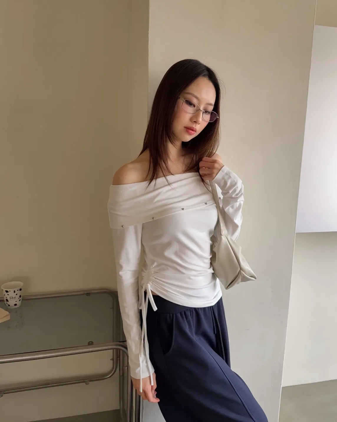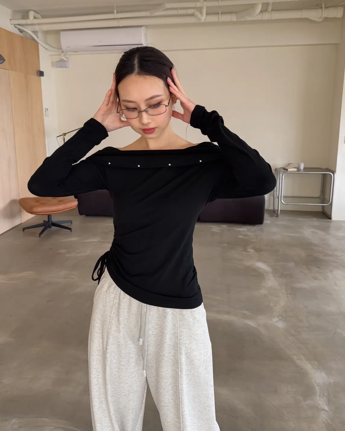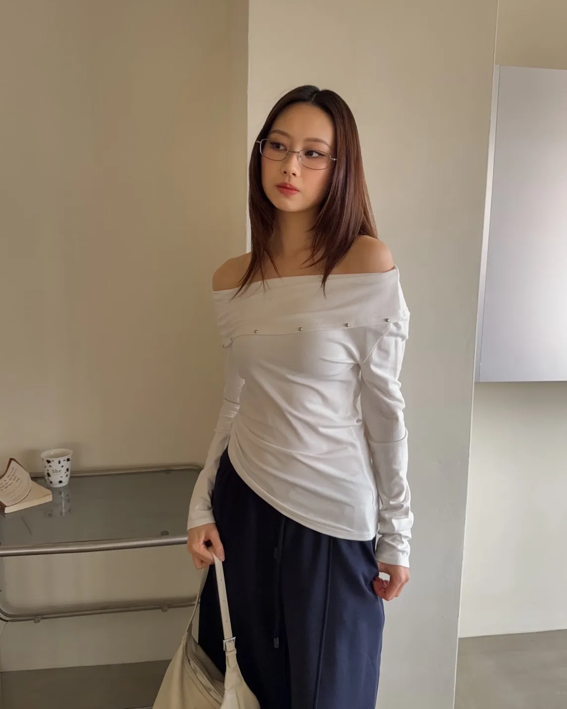 A0018個性鉚釘一字領上衣(白/灰/黑)