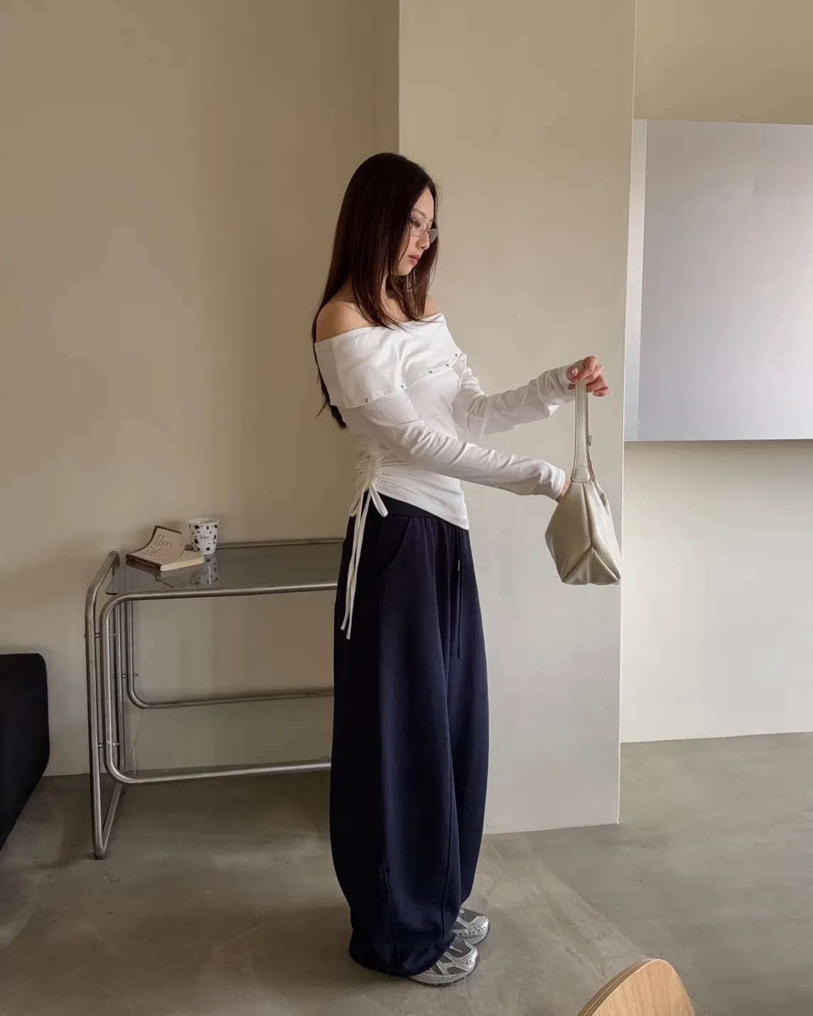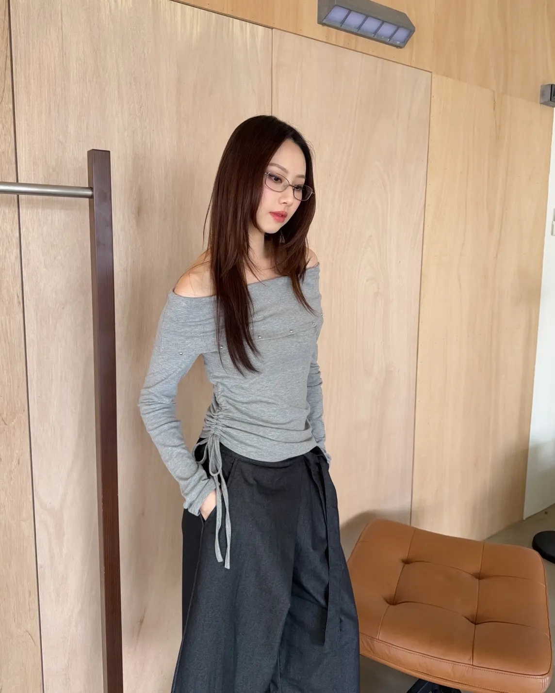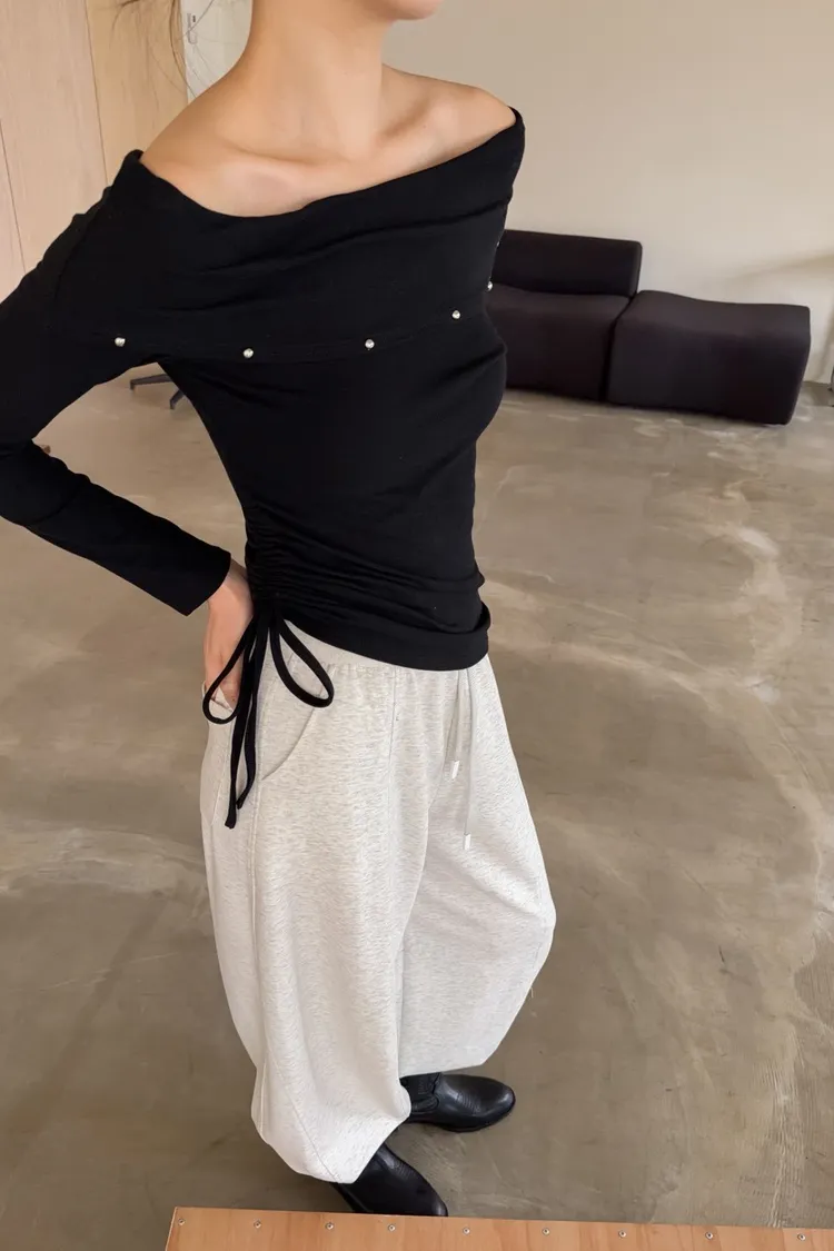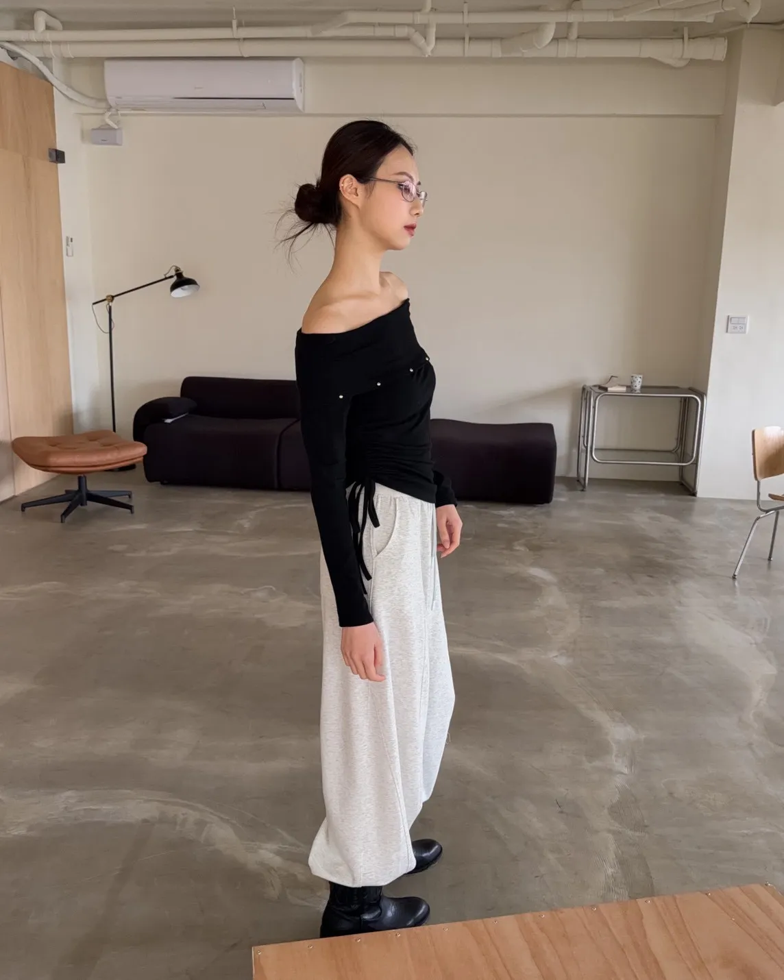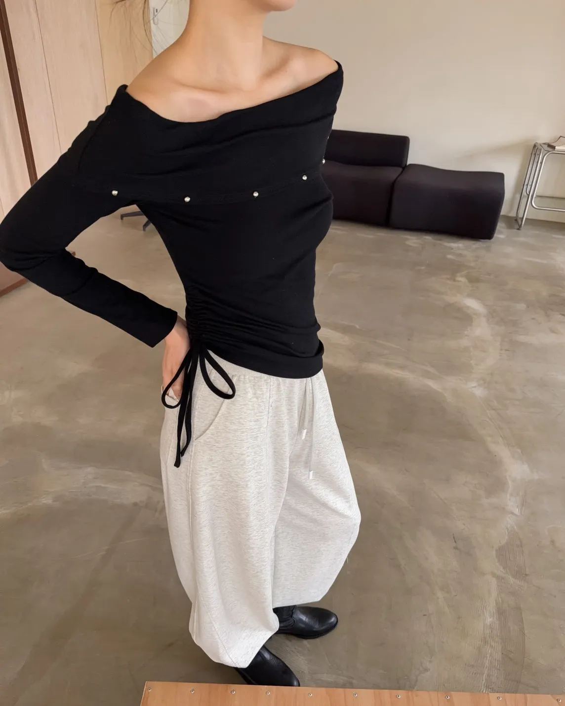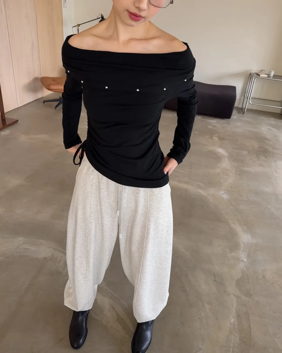 A0018個性鉚釘一字領上衣(白/灰/黑)