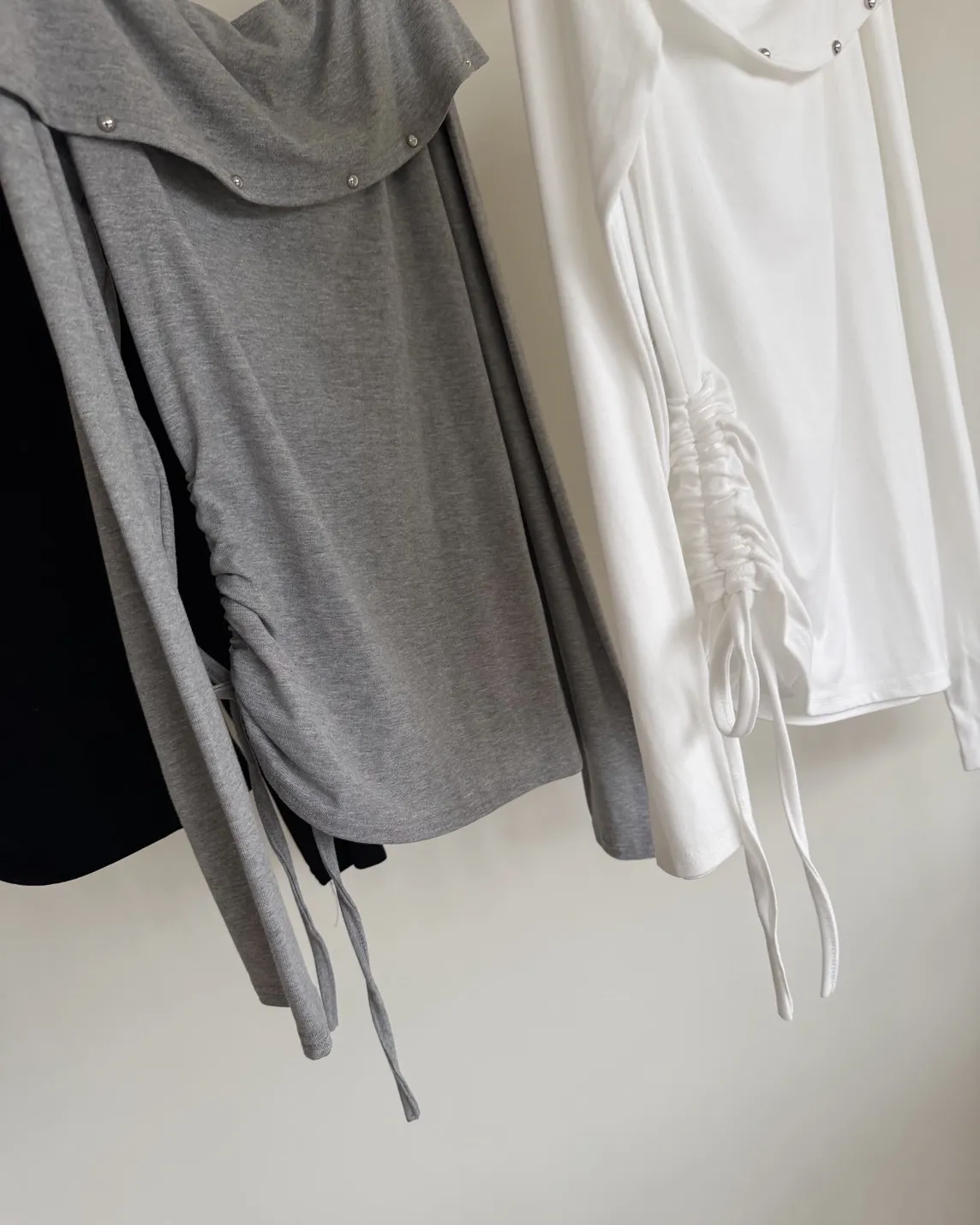 翻摺一字領 可穿斜肩 正面鉚釘裝飾 背面素面 單側抽繩