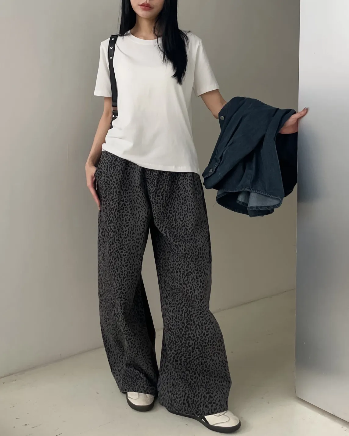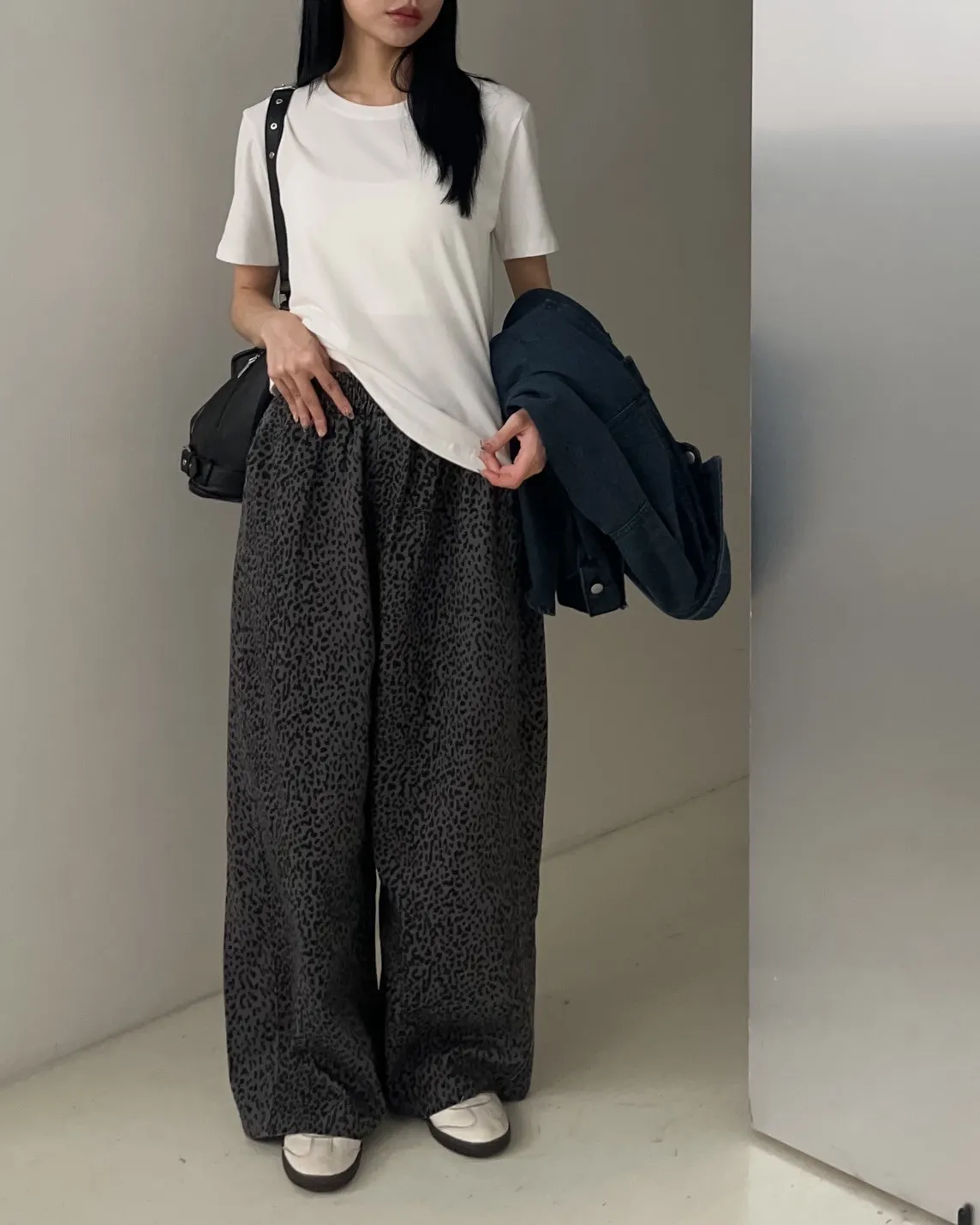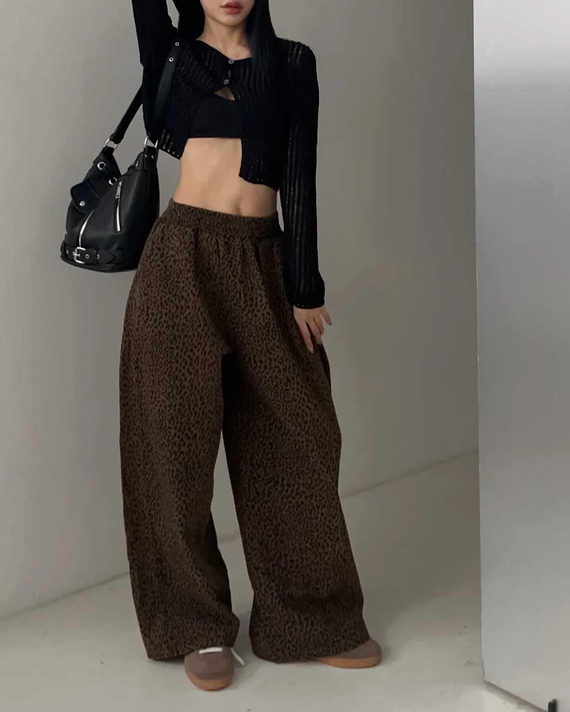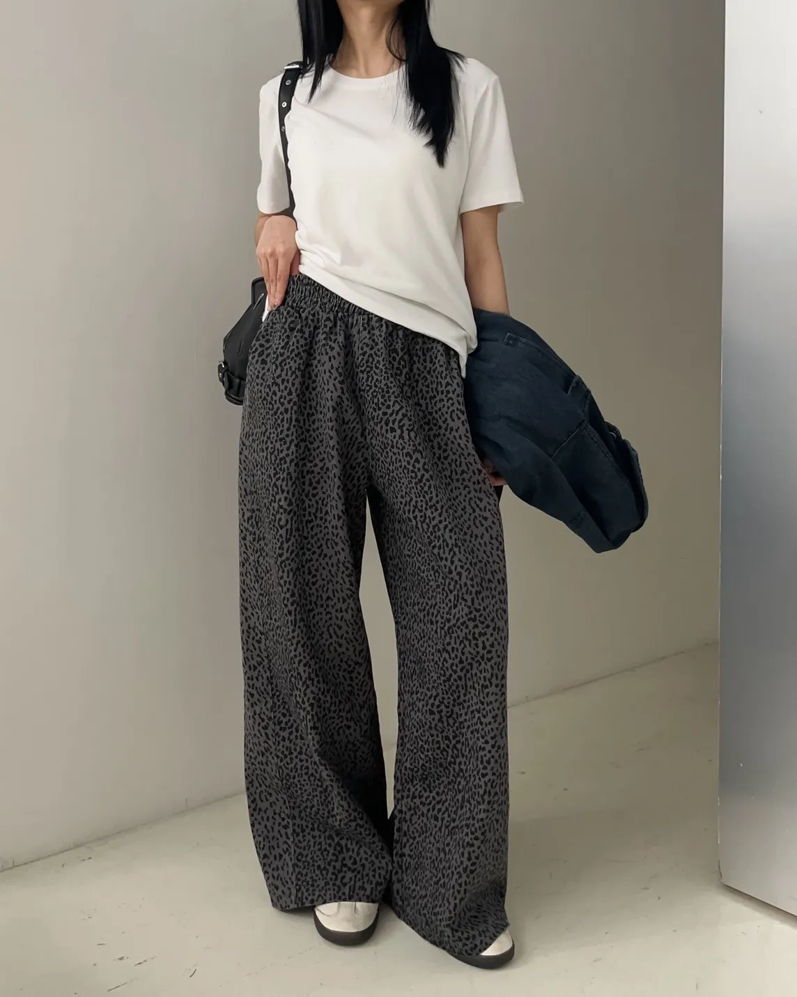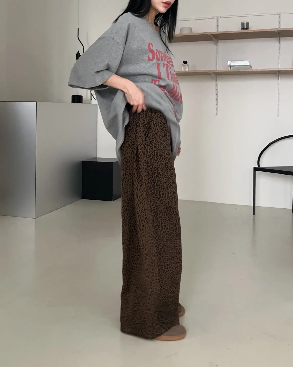 U0043挺版豹紋鬆緊寬褲(咖啡/灰)