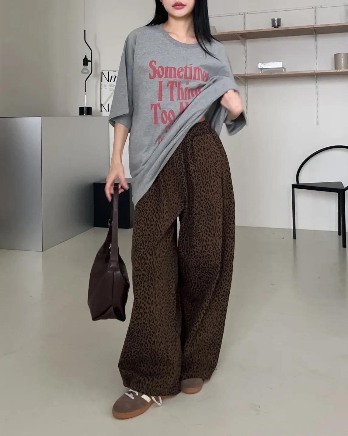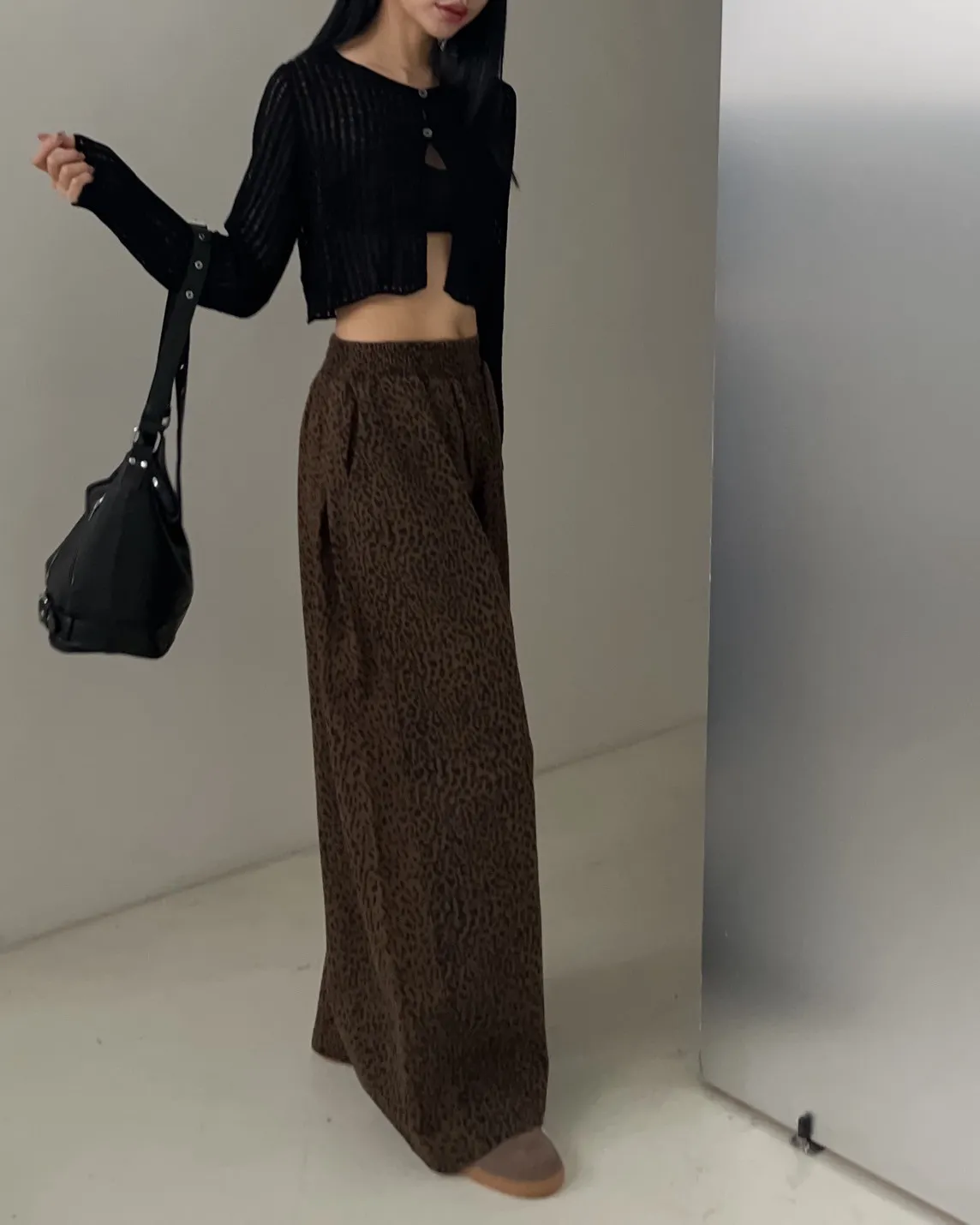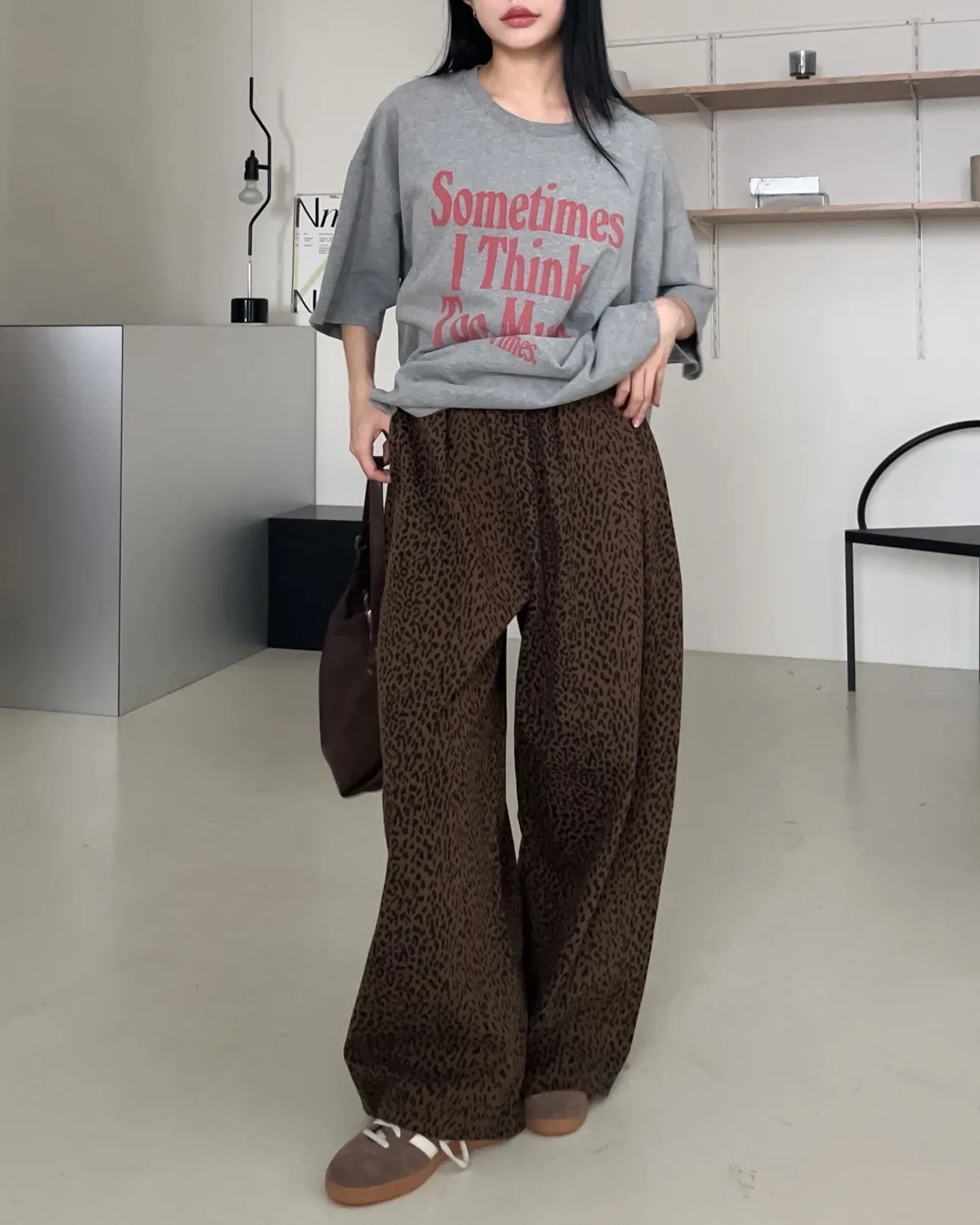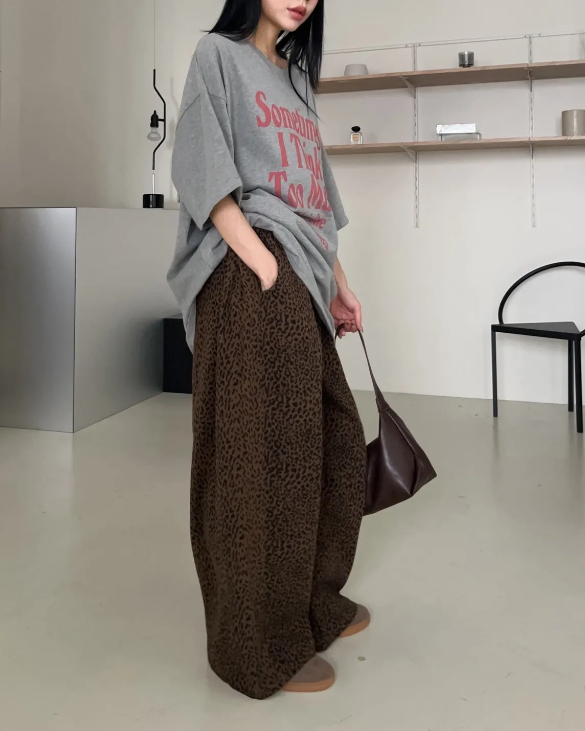 U0043挺版豹紋鬆緊寬褲(咖啡/灰)