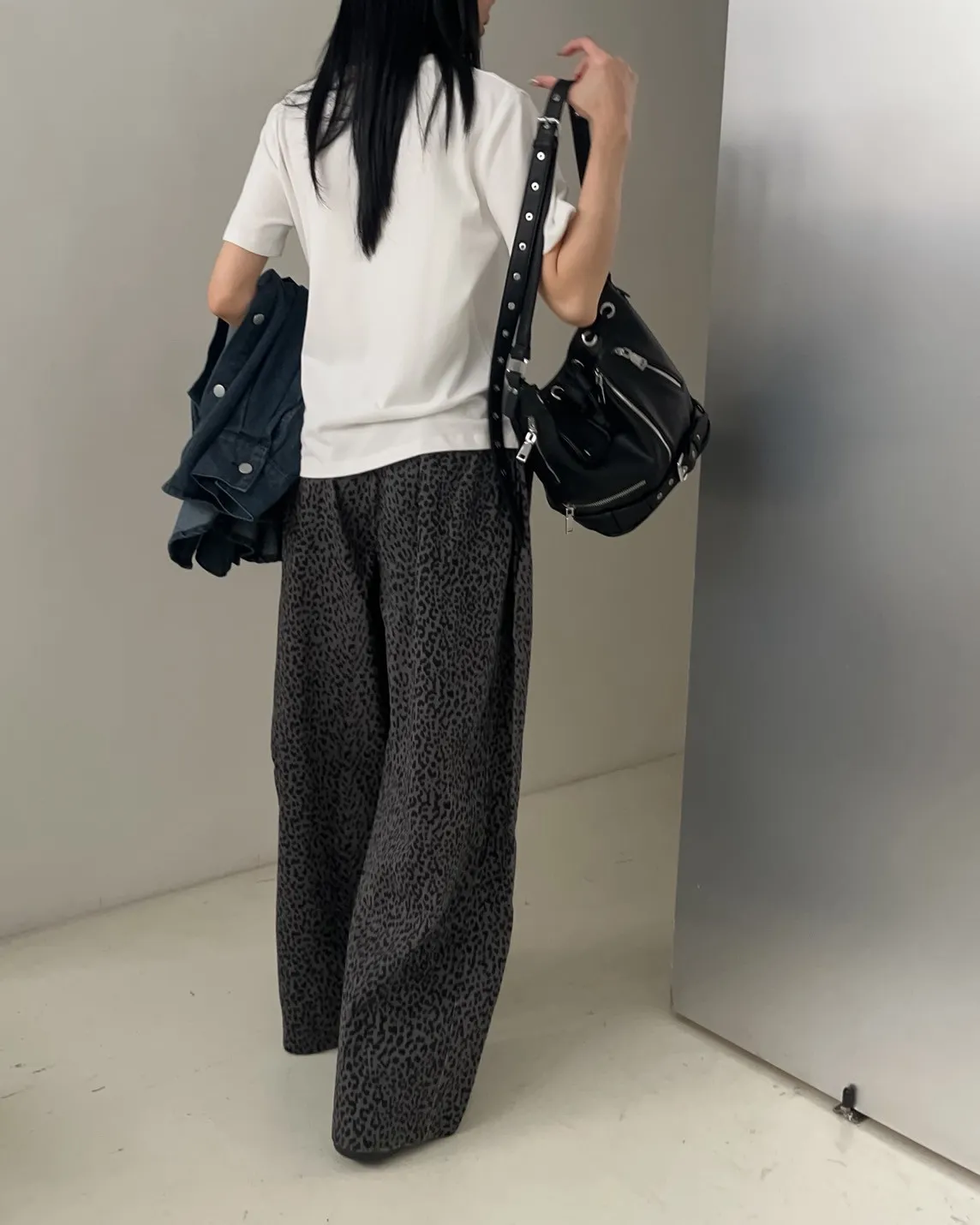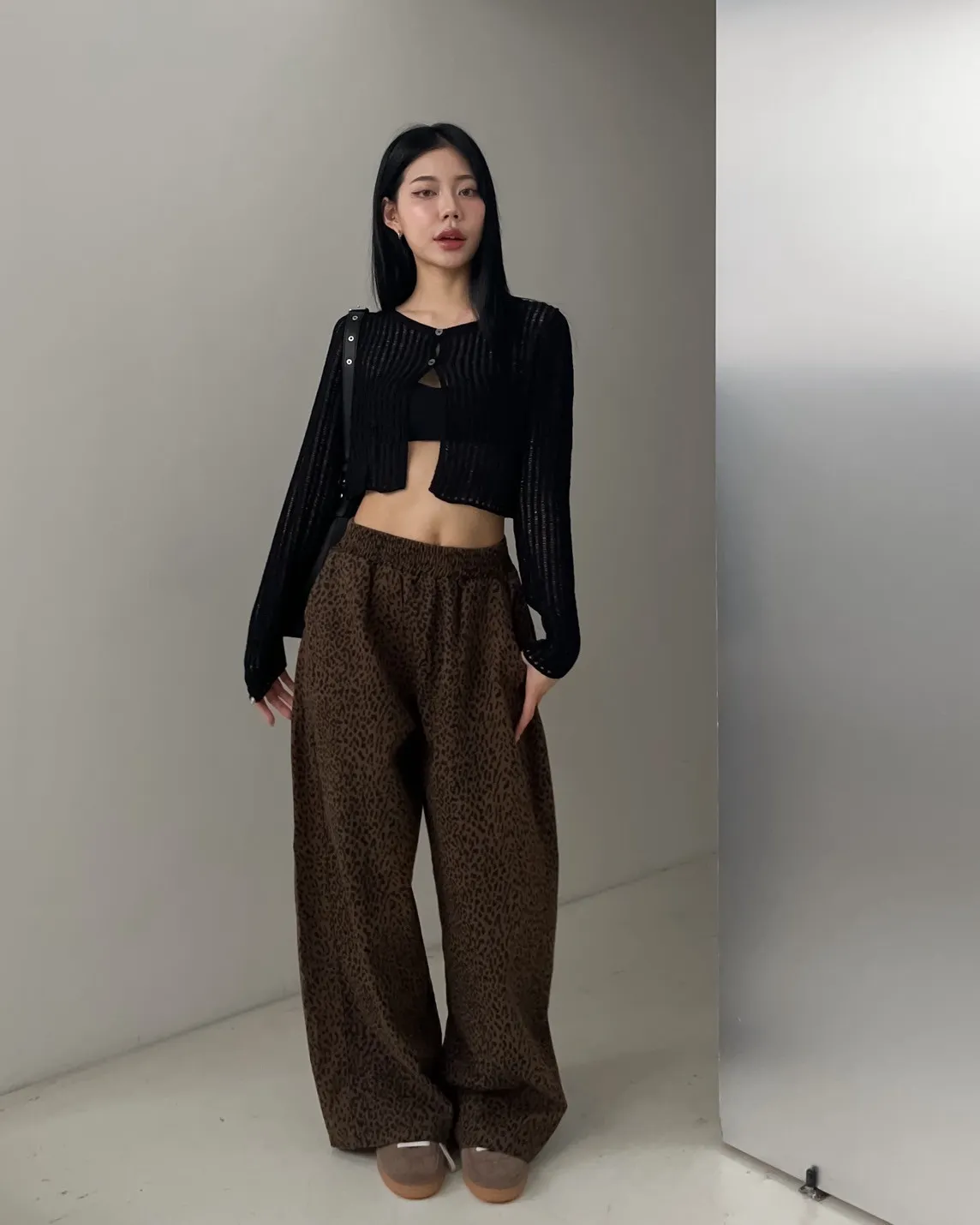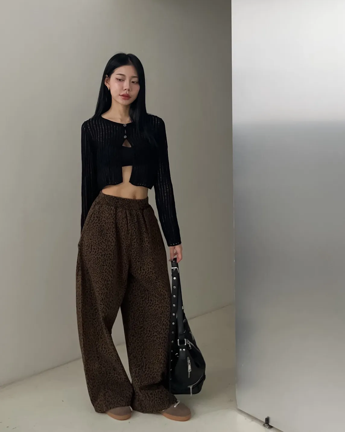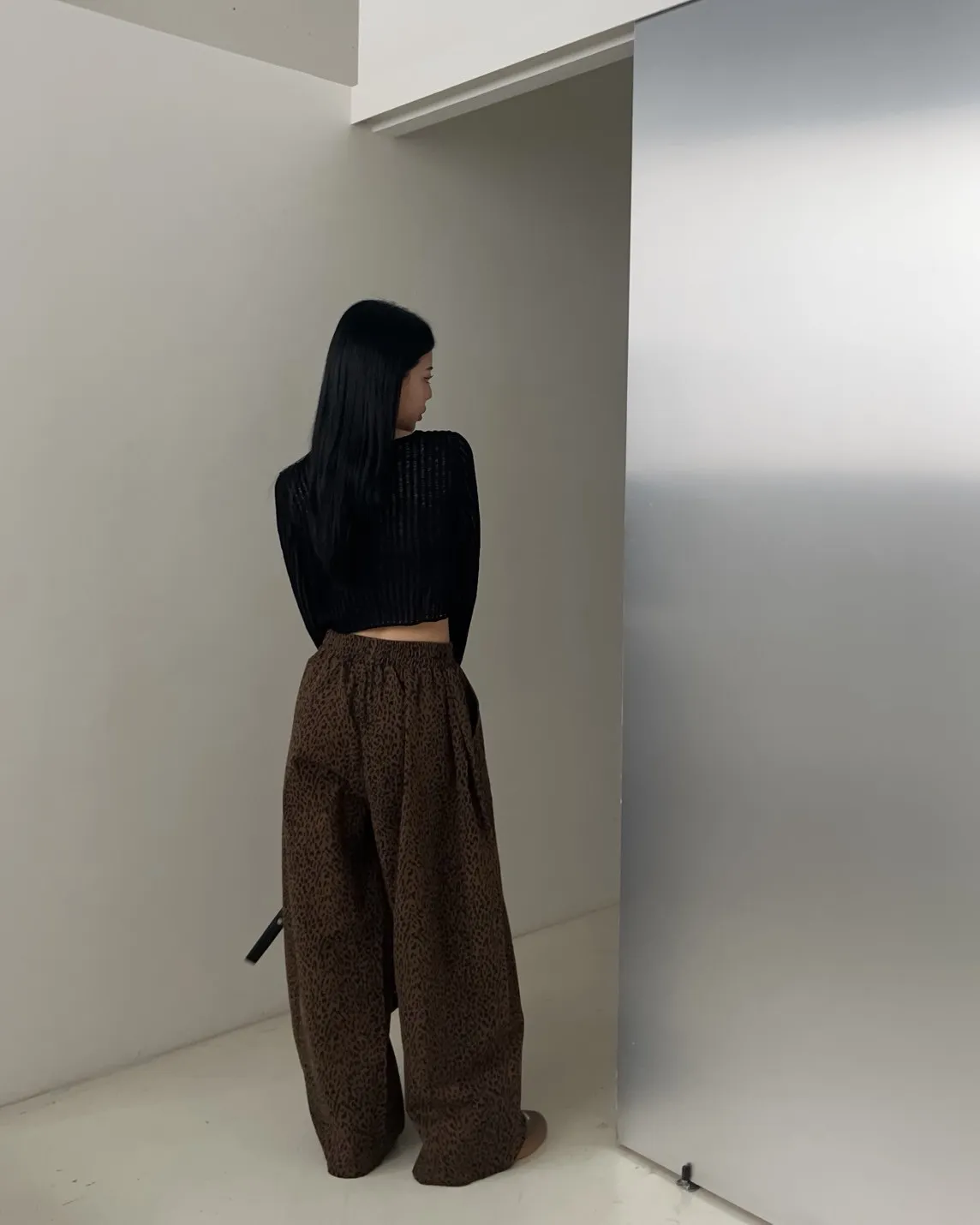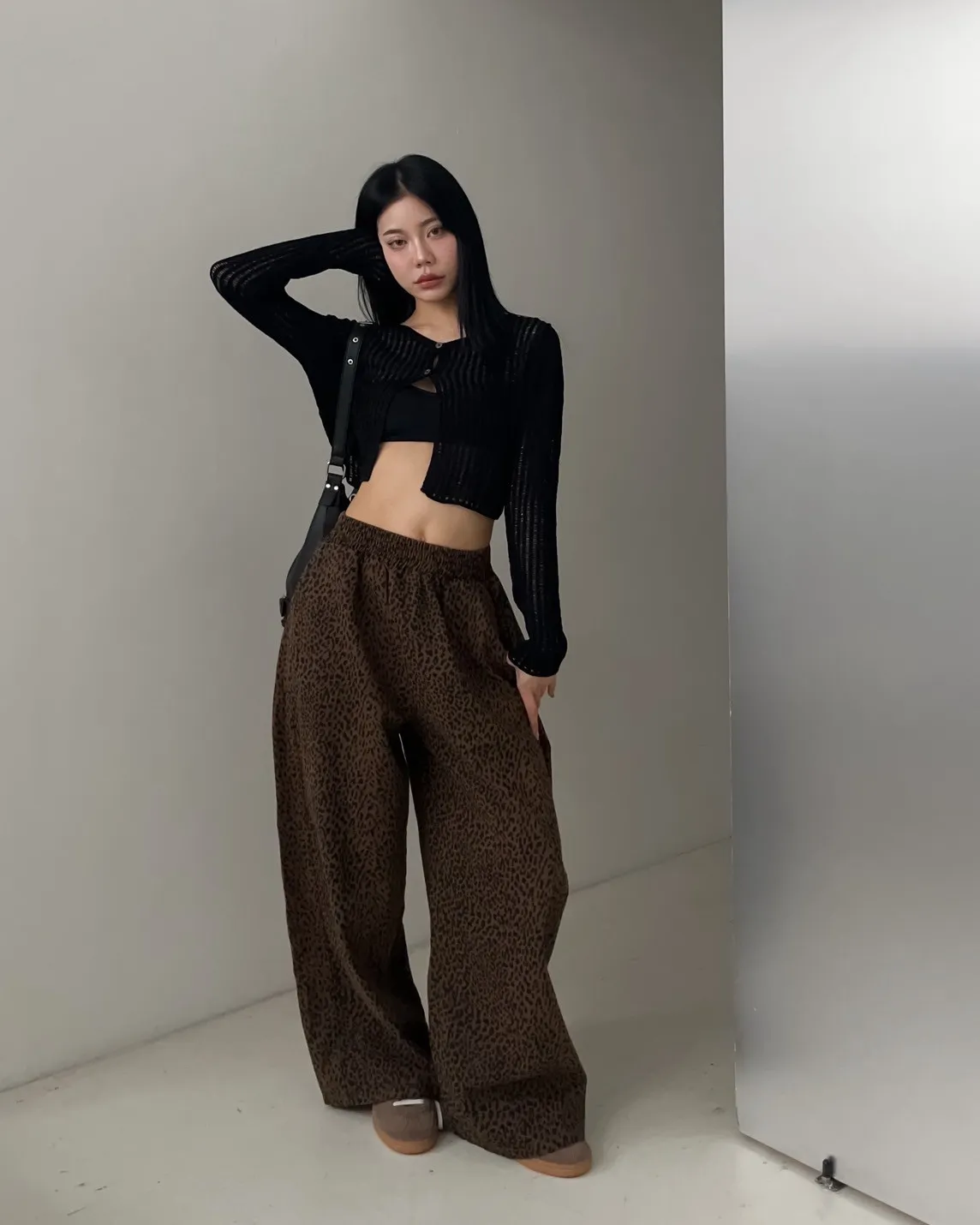 U0043挺版豹紋鬆緊寬褲(咖啡/灰)