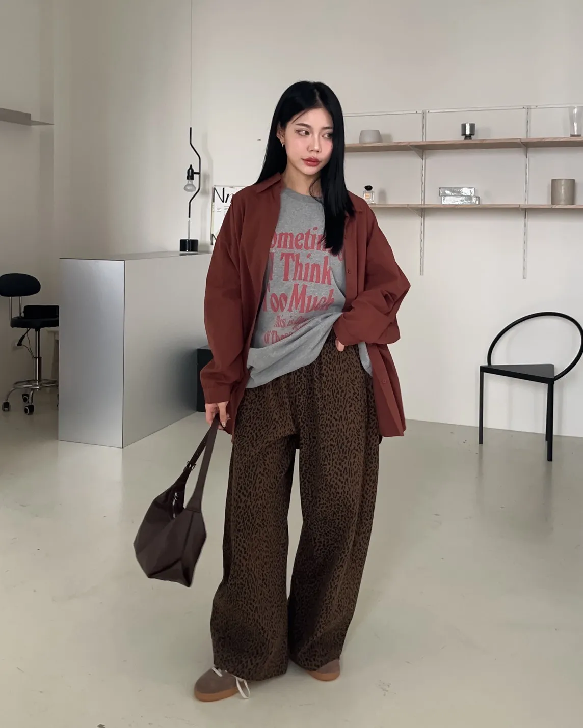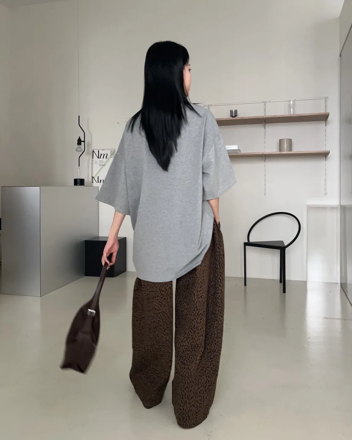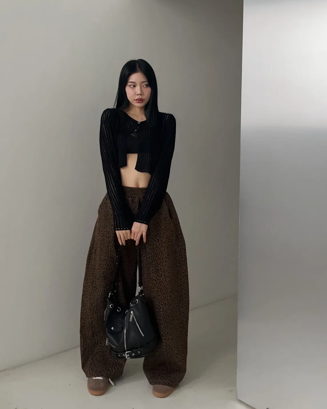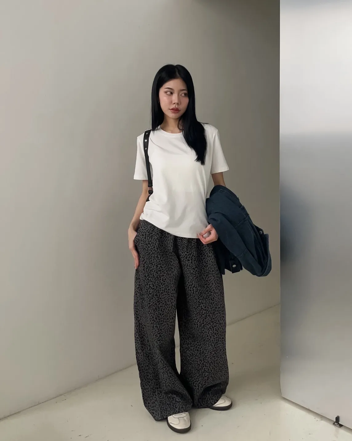 U0043挺版豹紋鬆緊寬褲(咖啡/灰)