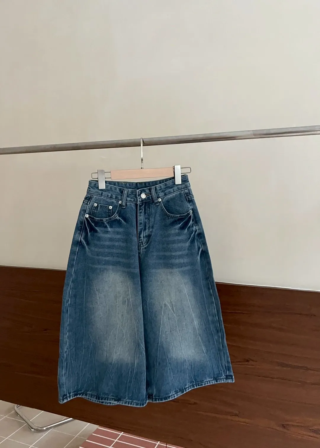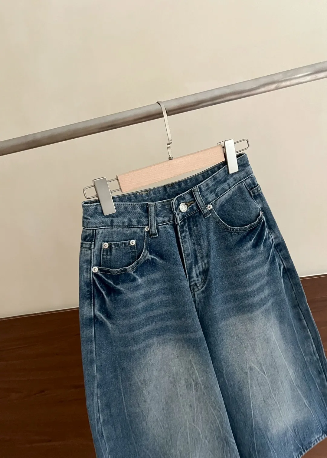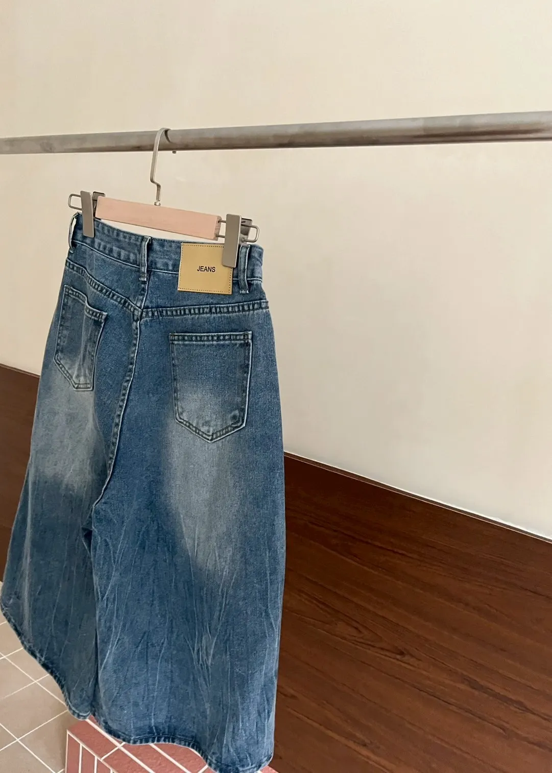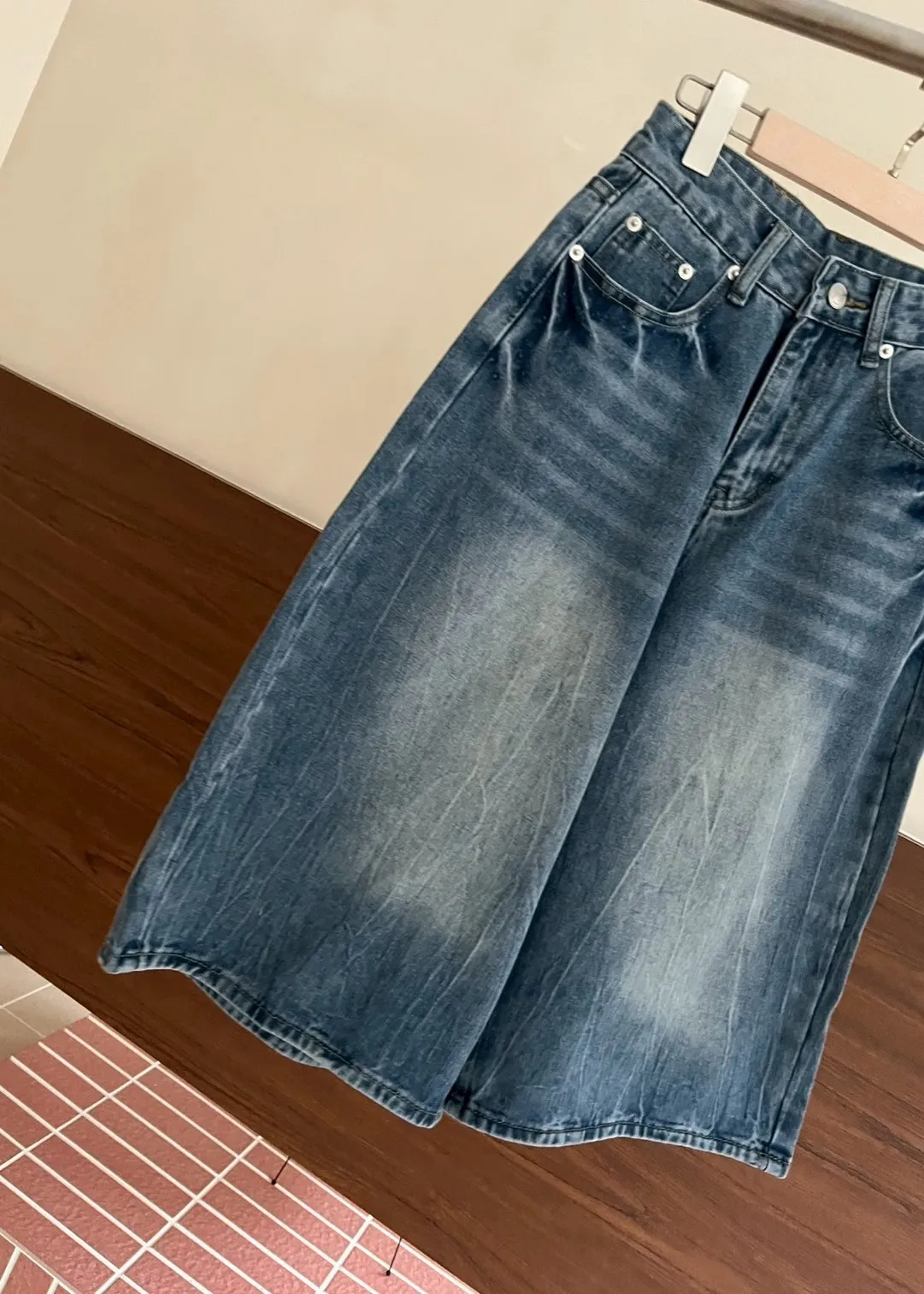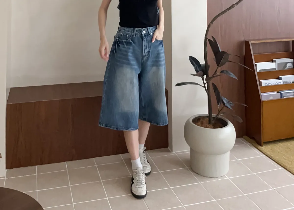 版型正常 兩側口袋 長度七分 立體水波壓紋 腿部刷白 後皮標裝飾