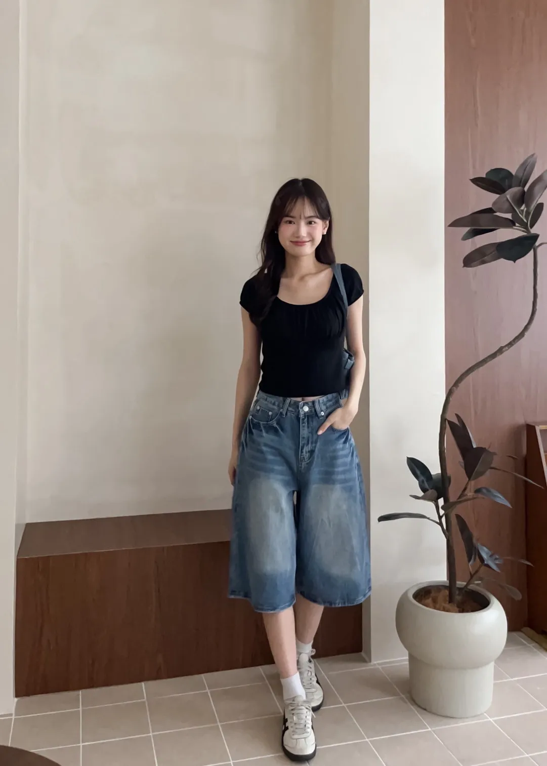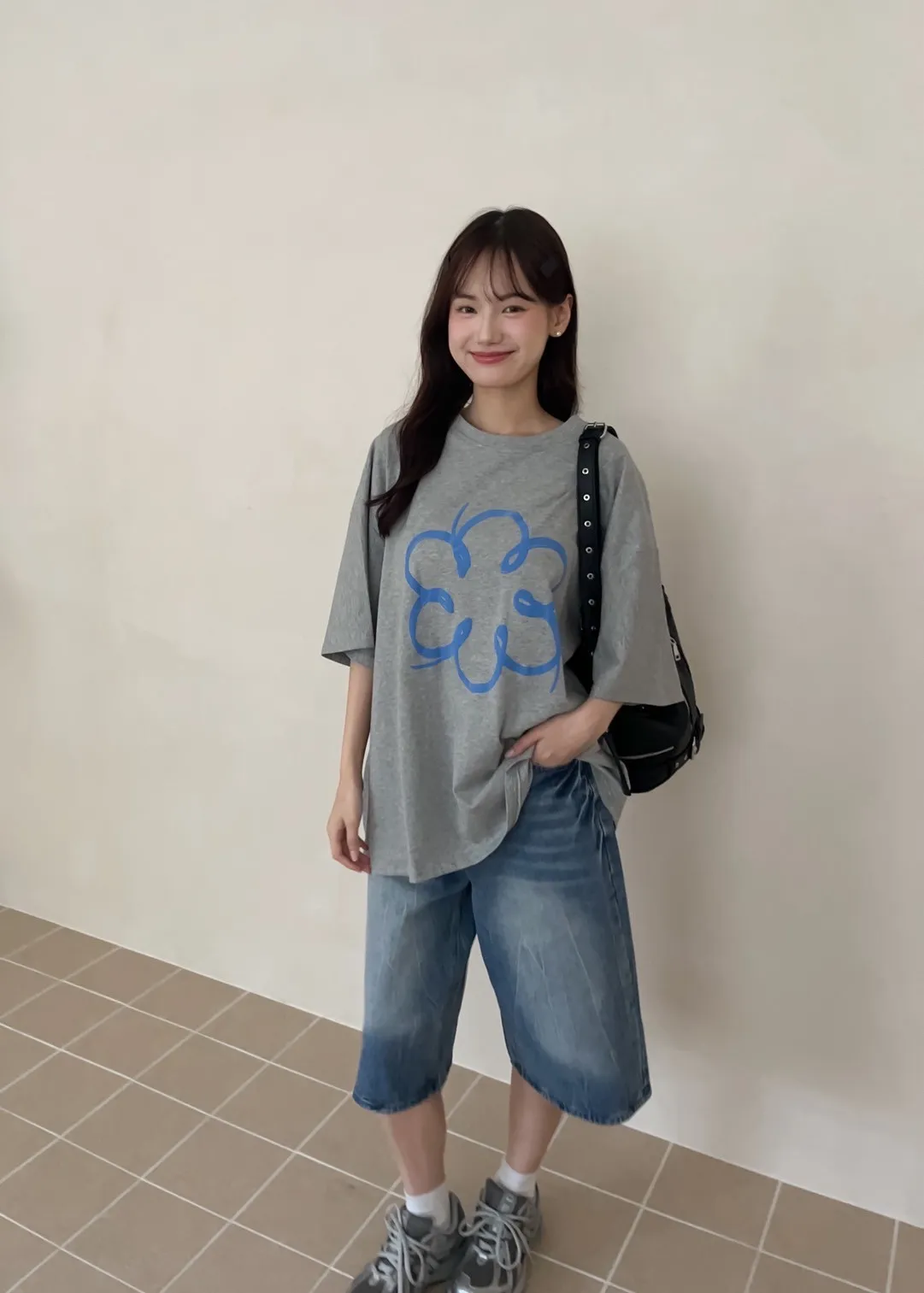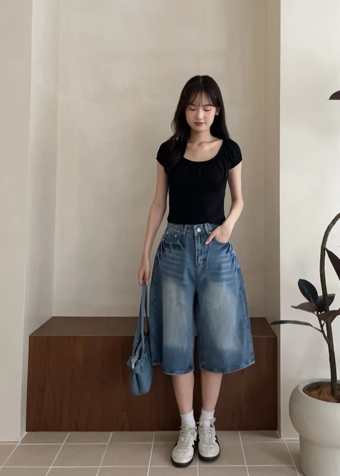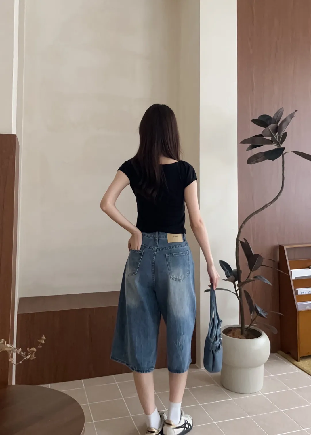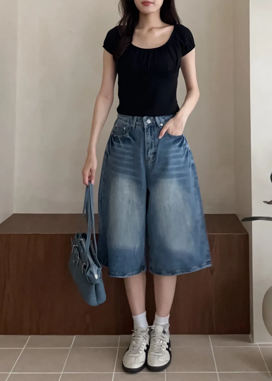 版型正常 兩側口袋 長度七分 立體水波壓紋 腿部刷白 後皮標裝飾