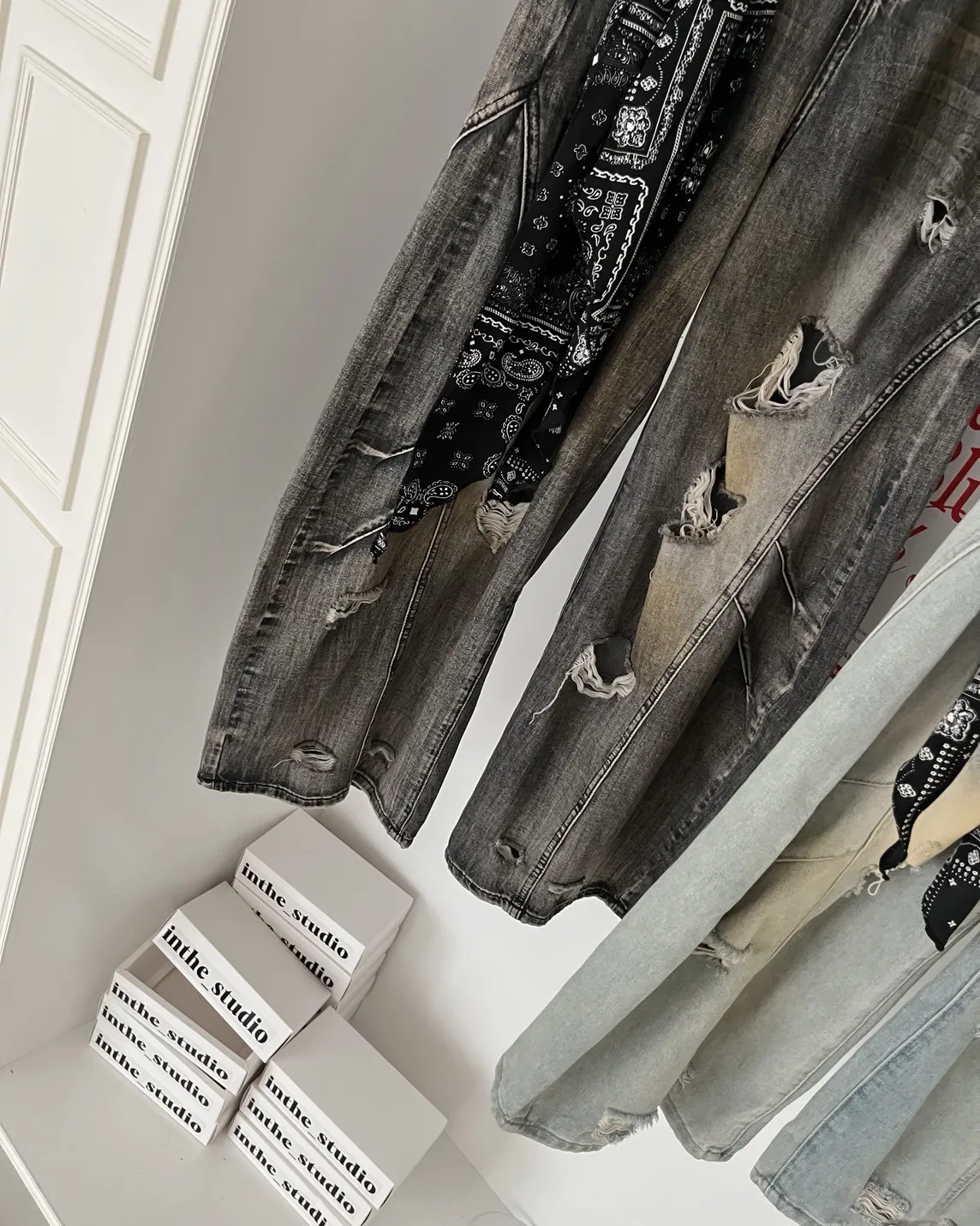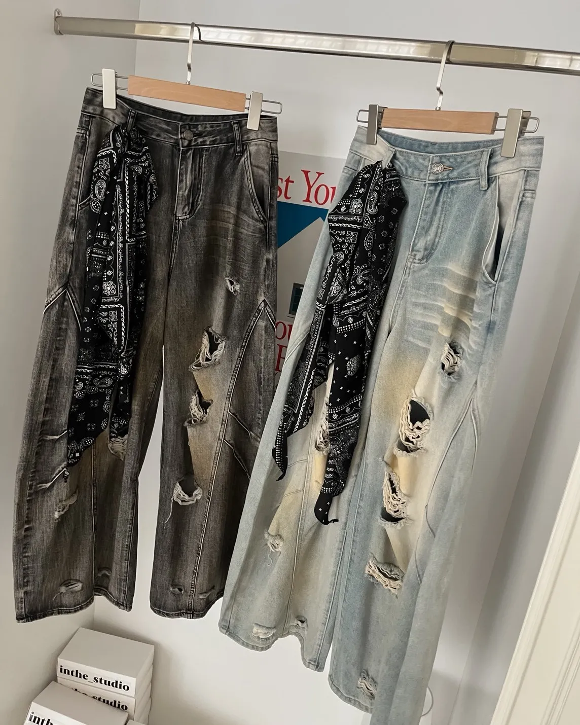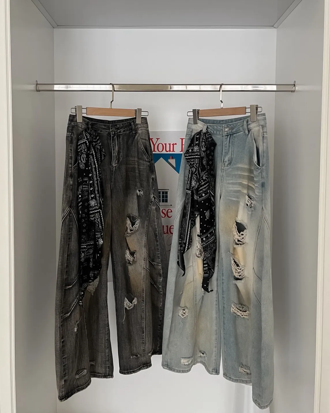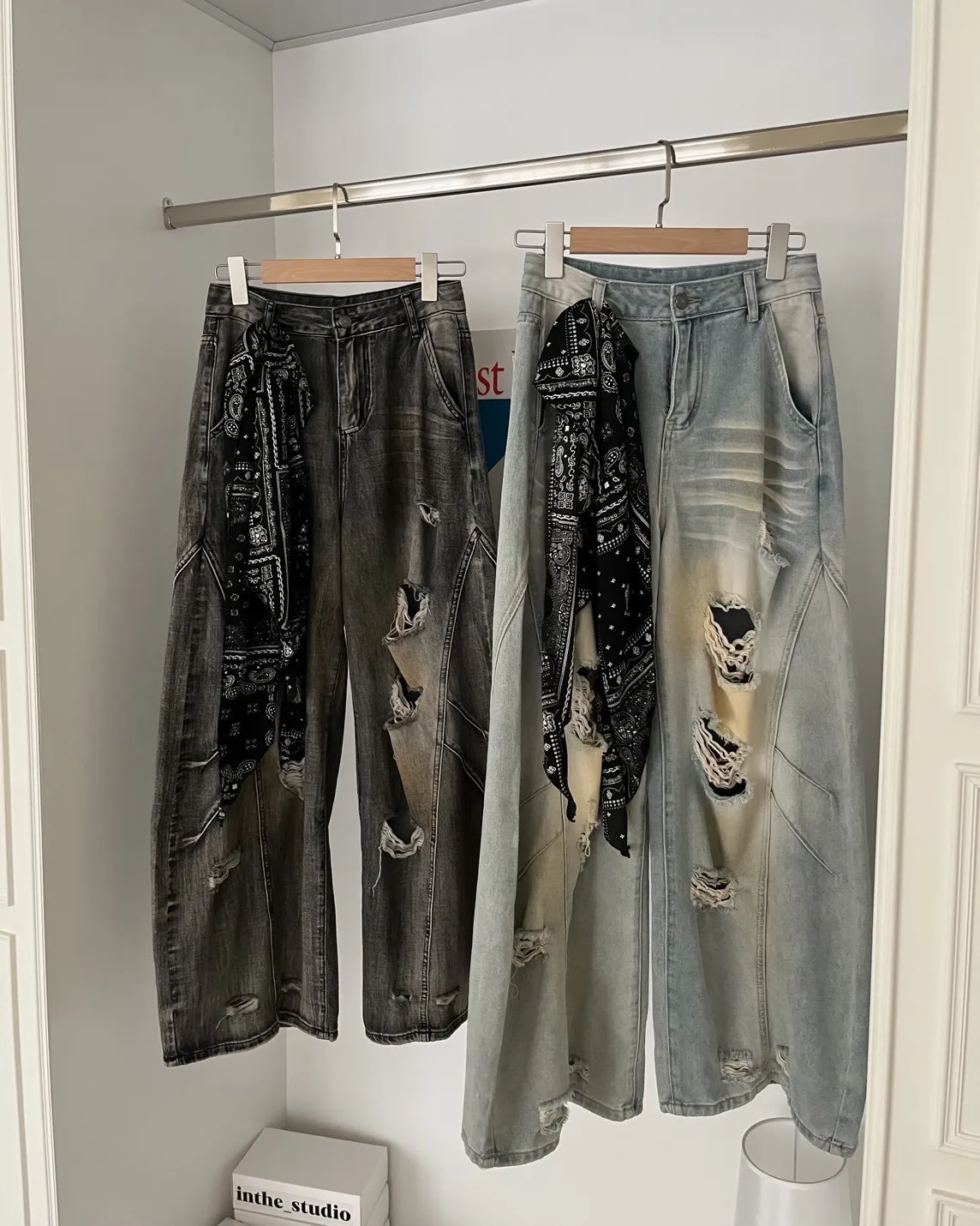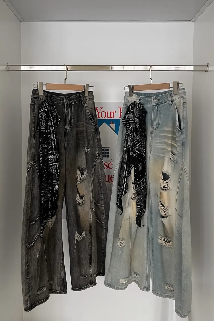 V0003(附三角巾)廢土風刷破小彎刀牛仔褲(藍/灰)