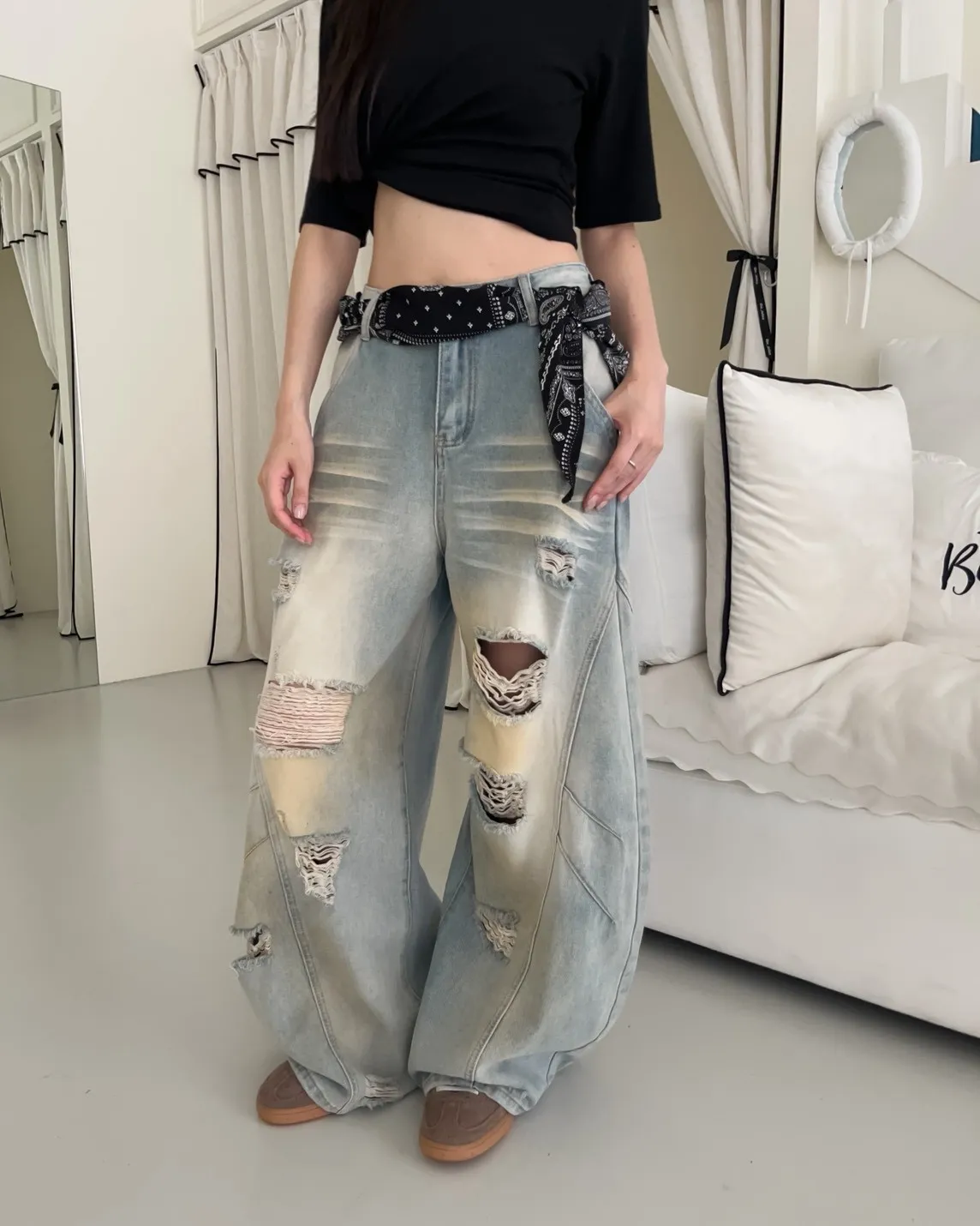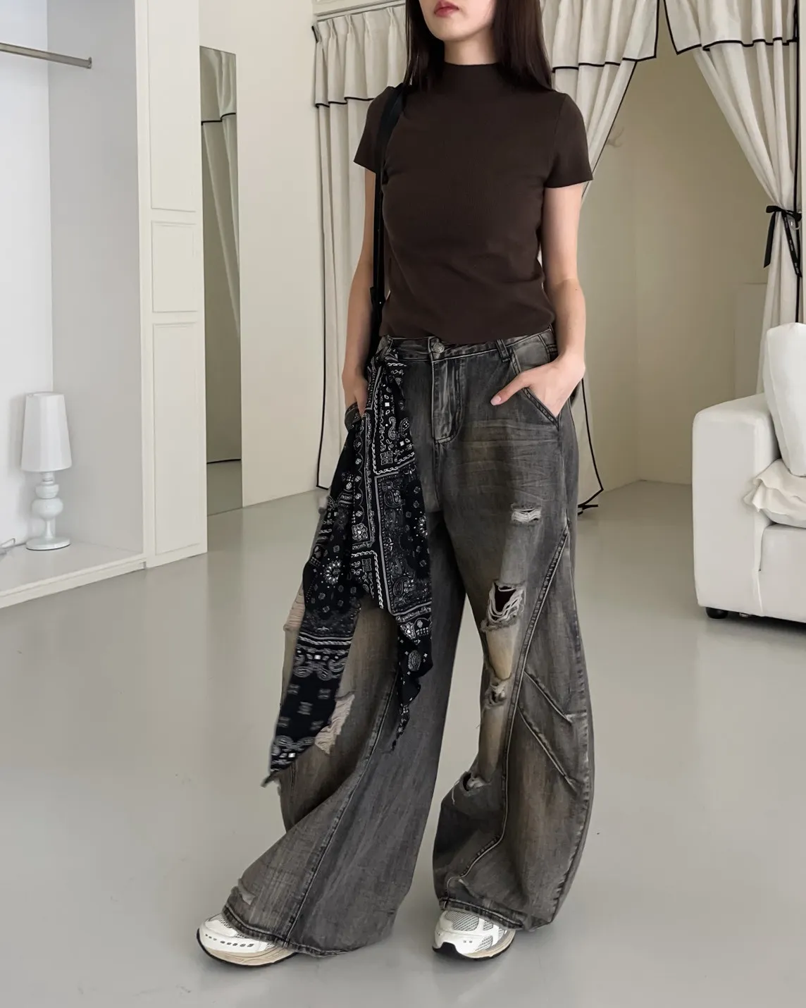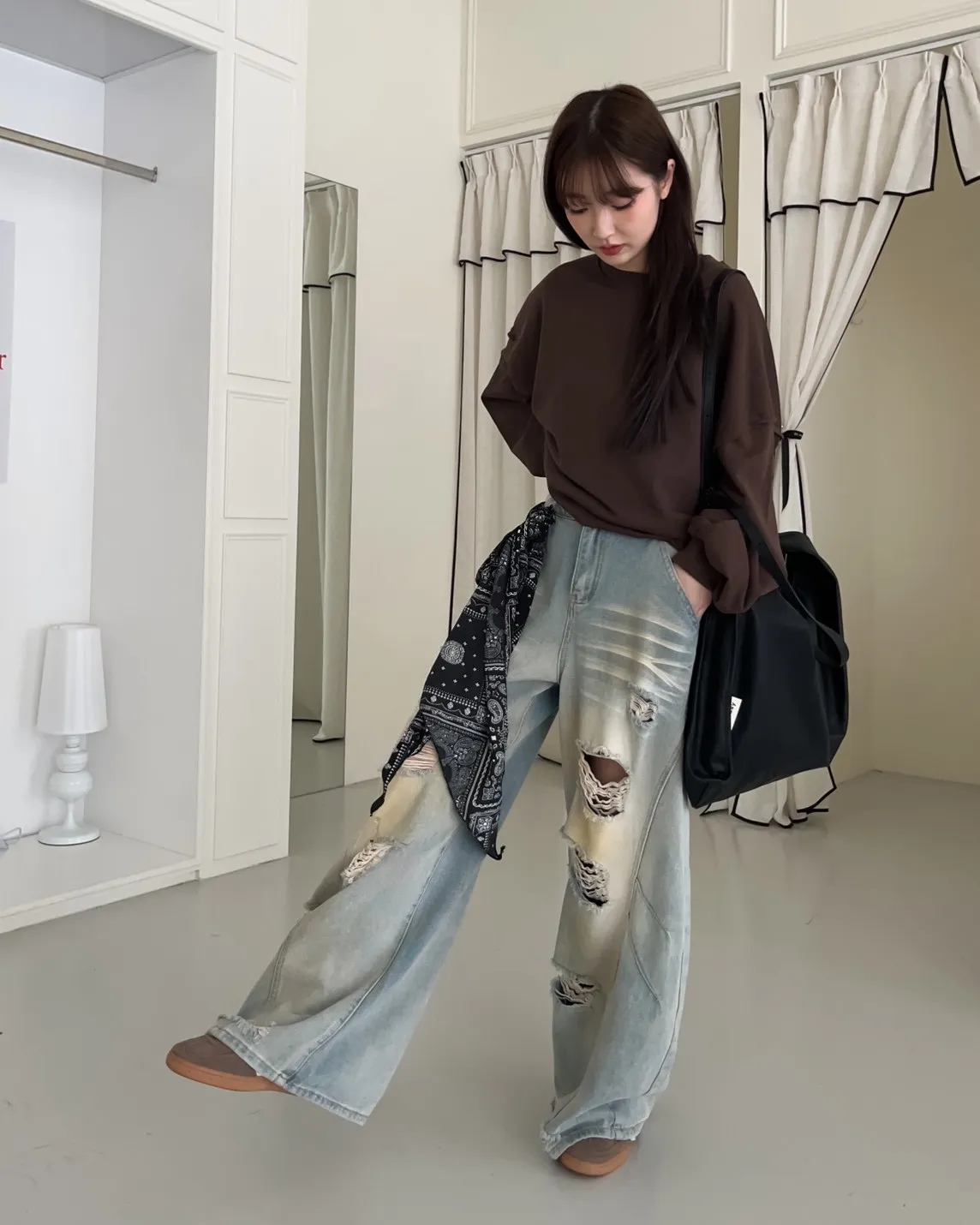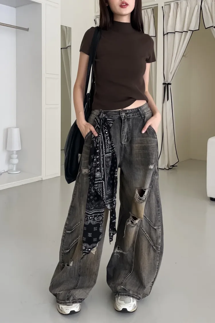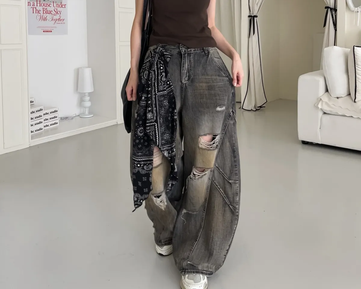 V0003(附三角巾)廢土風刷破小彎刀牛仔褲(藍/灰)