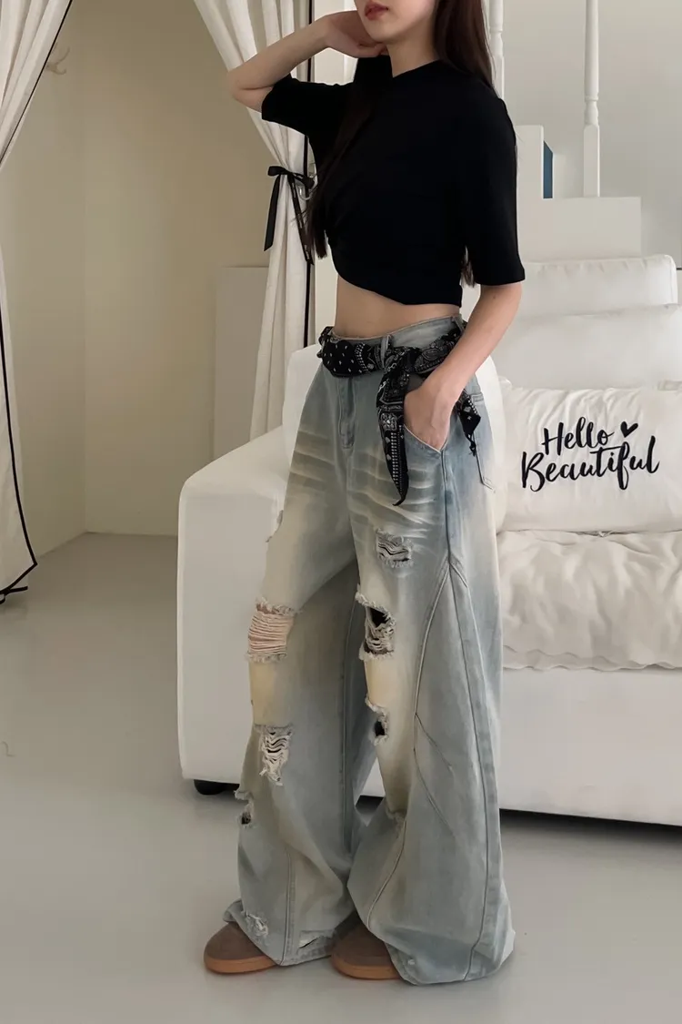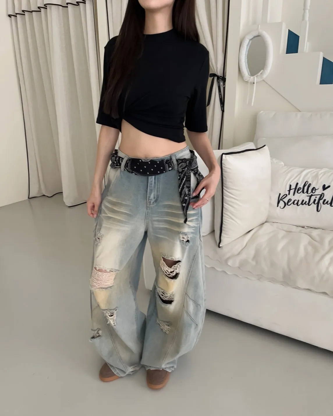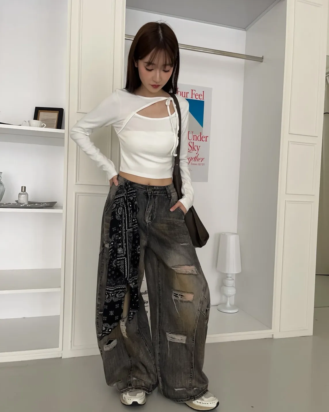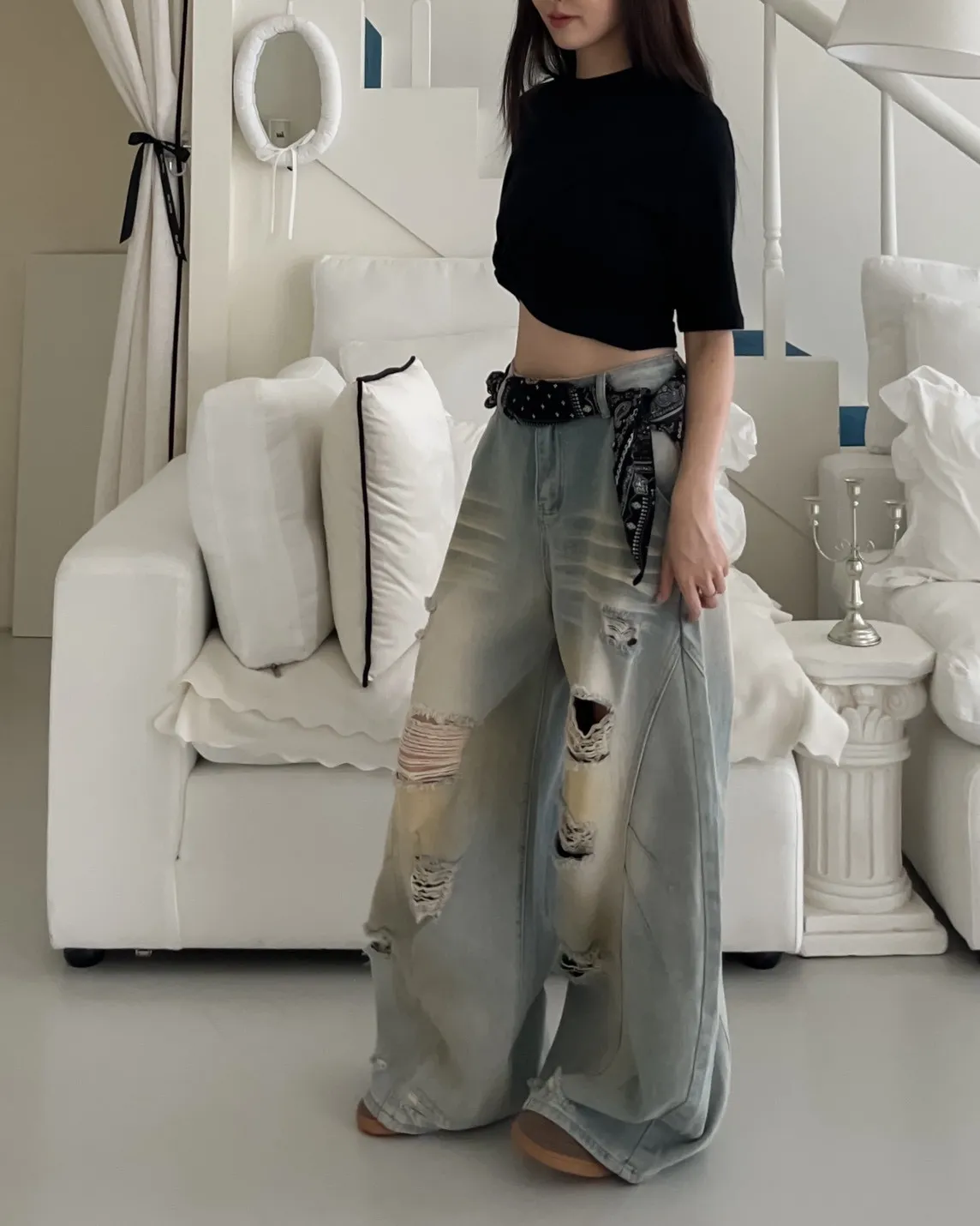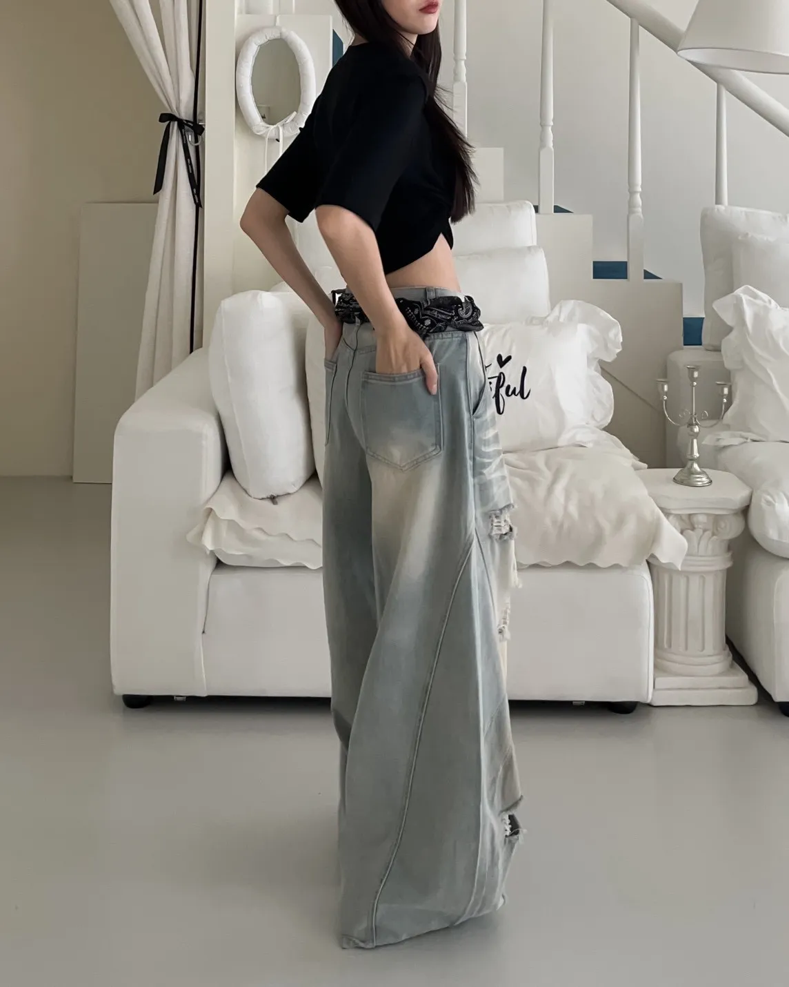 V0003(附三角巾)廢土風刷破小彎刀牛仔褲(藍/灰)