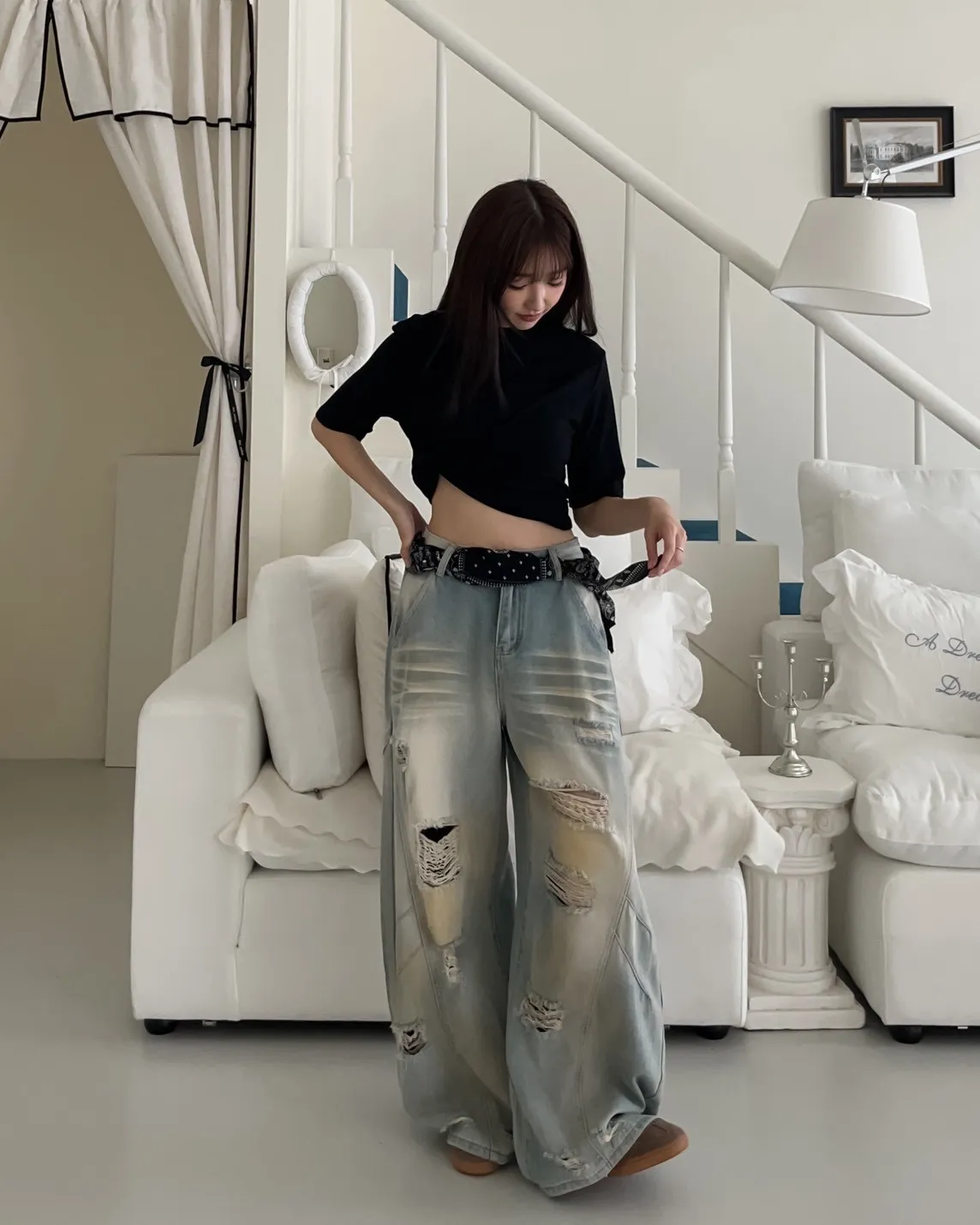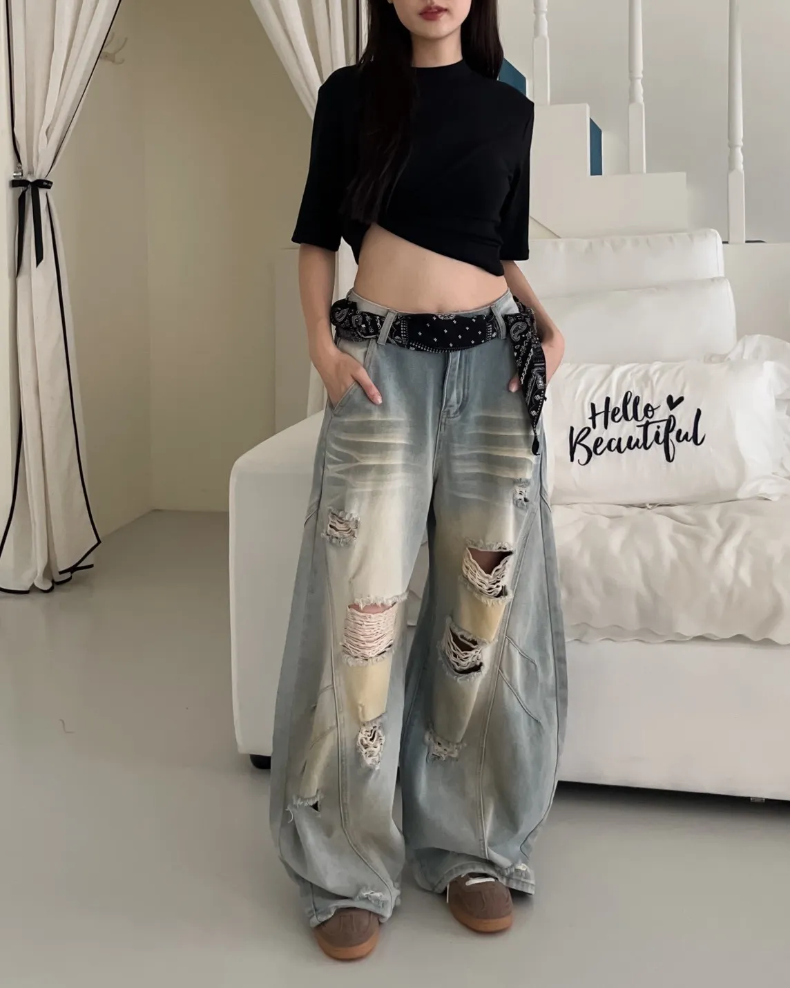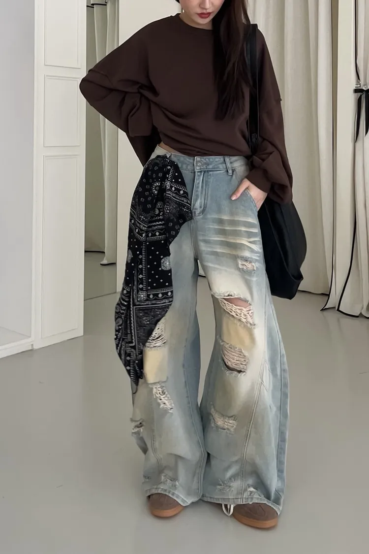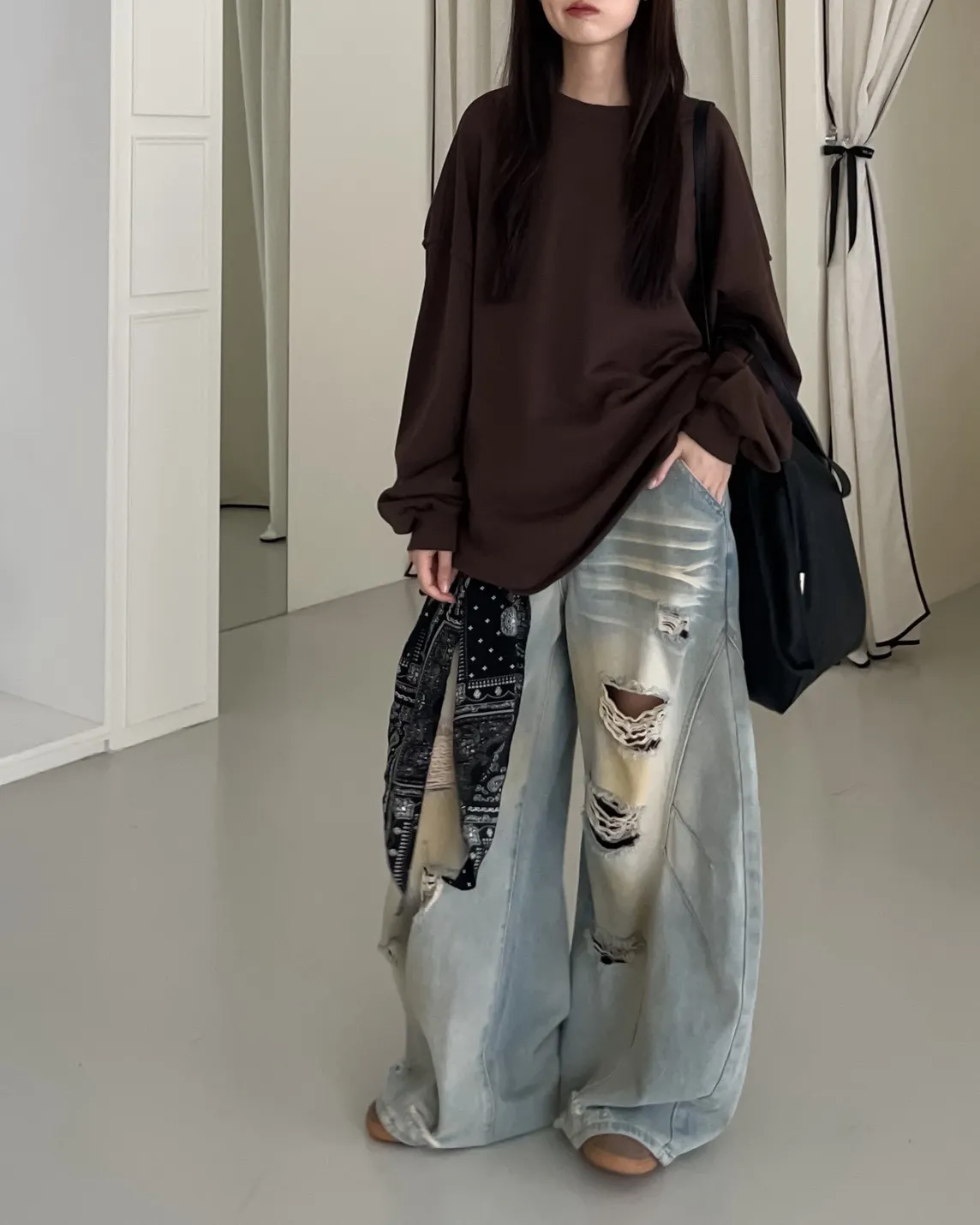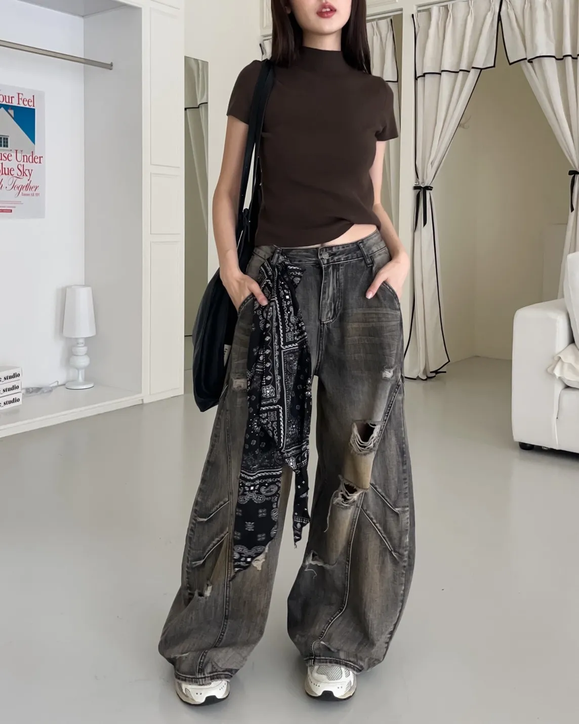 V0003(附三角巾)廢土風刷破小彎刀牛仔褲(藍/灰)