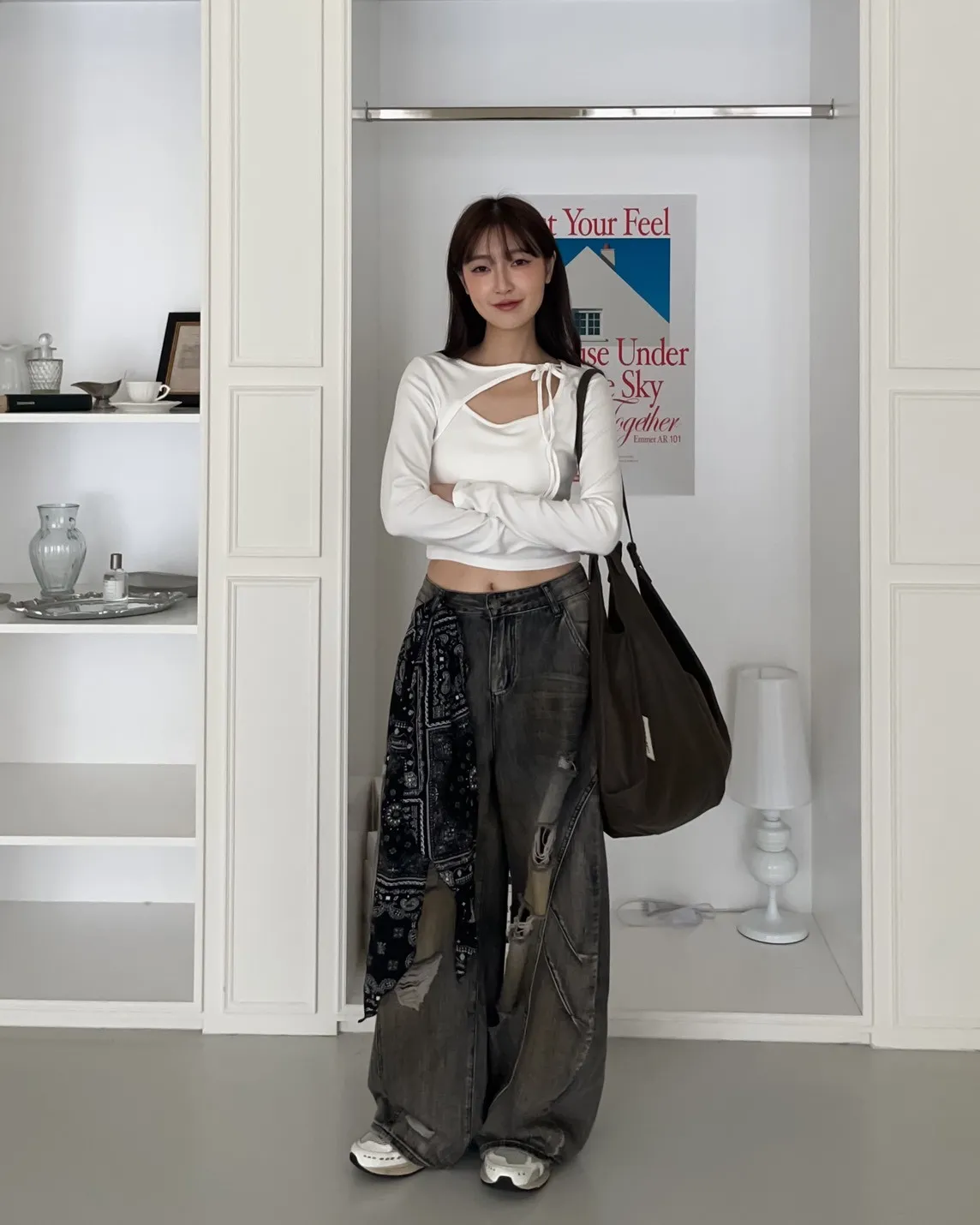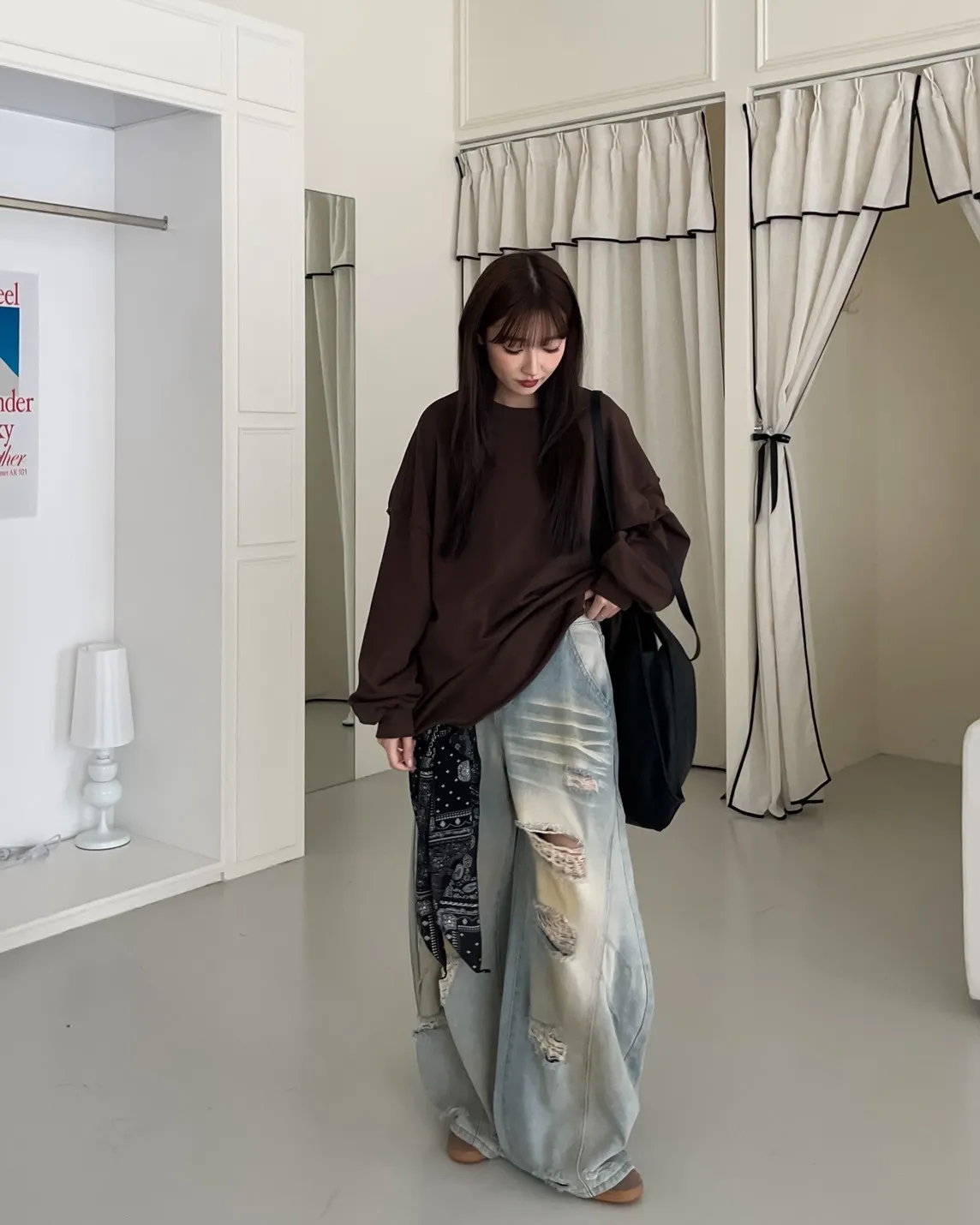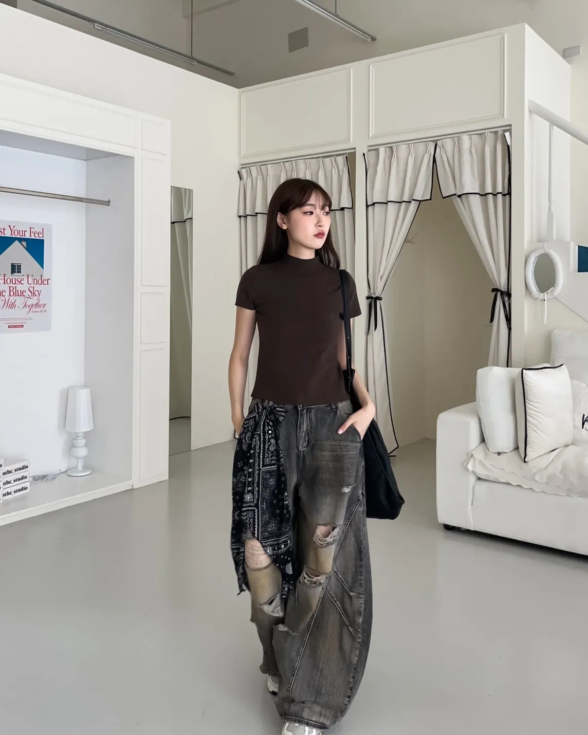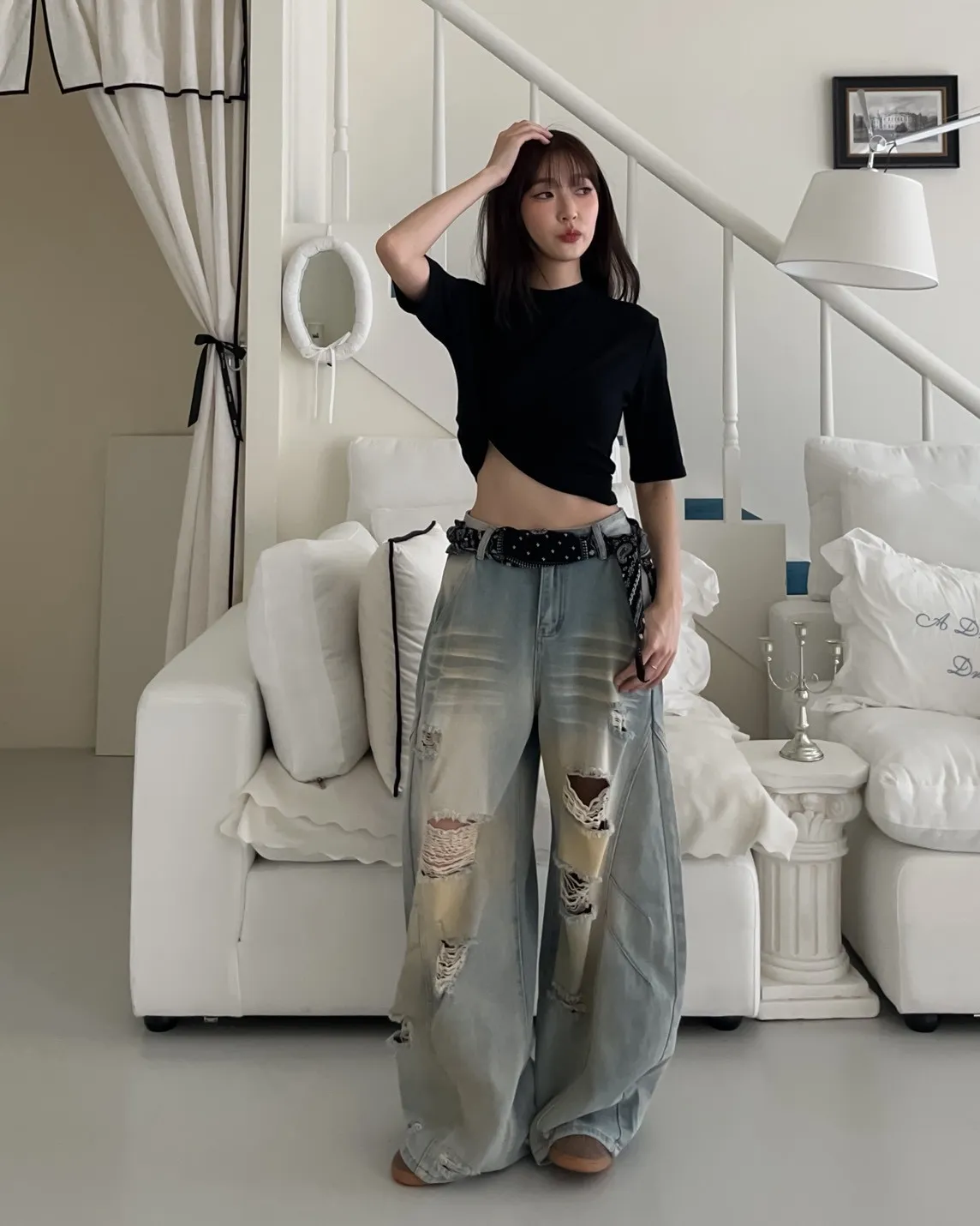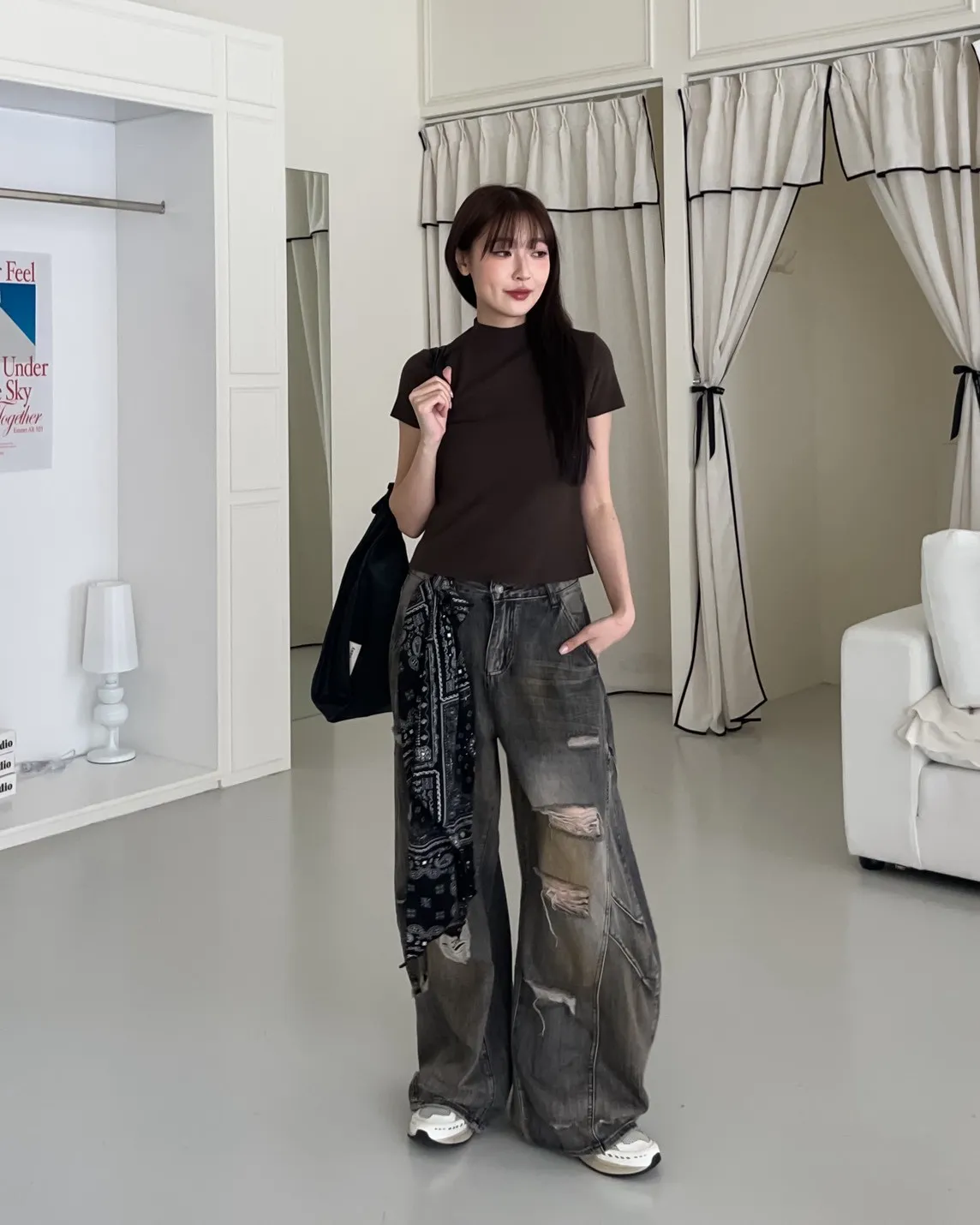 V0003(附三角巾)廢土風刷破小彎刀牛仔褲(藍/灰)