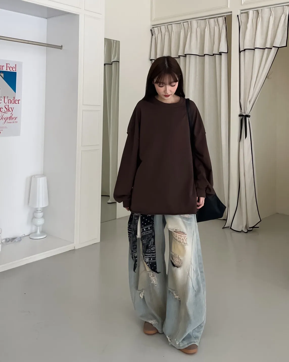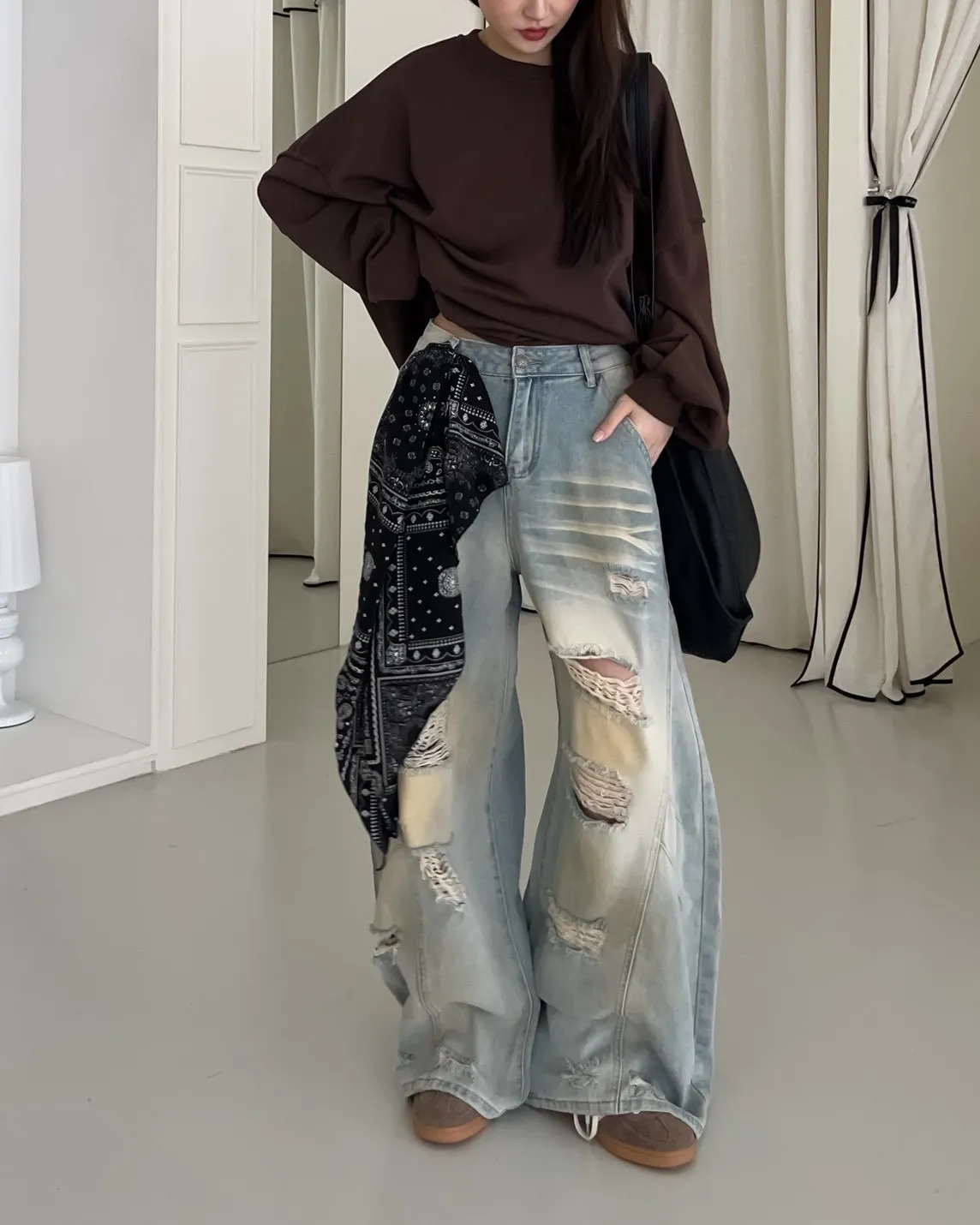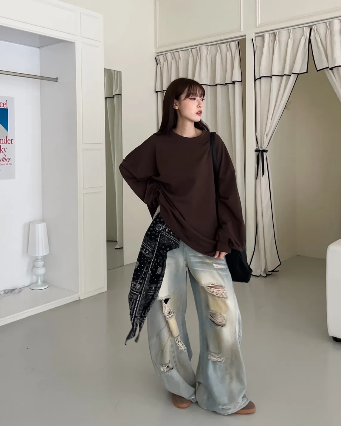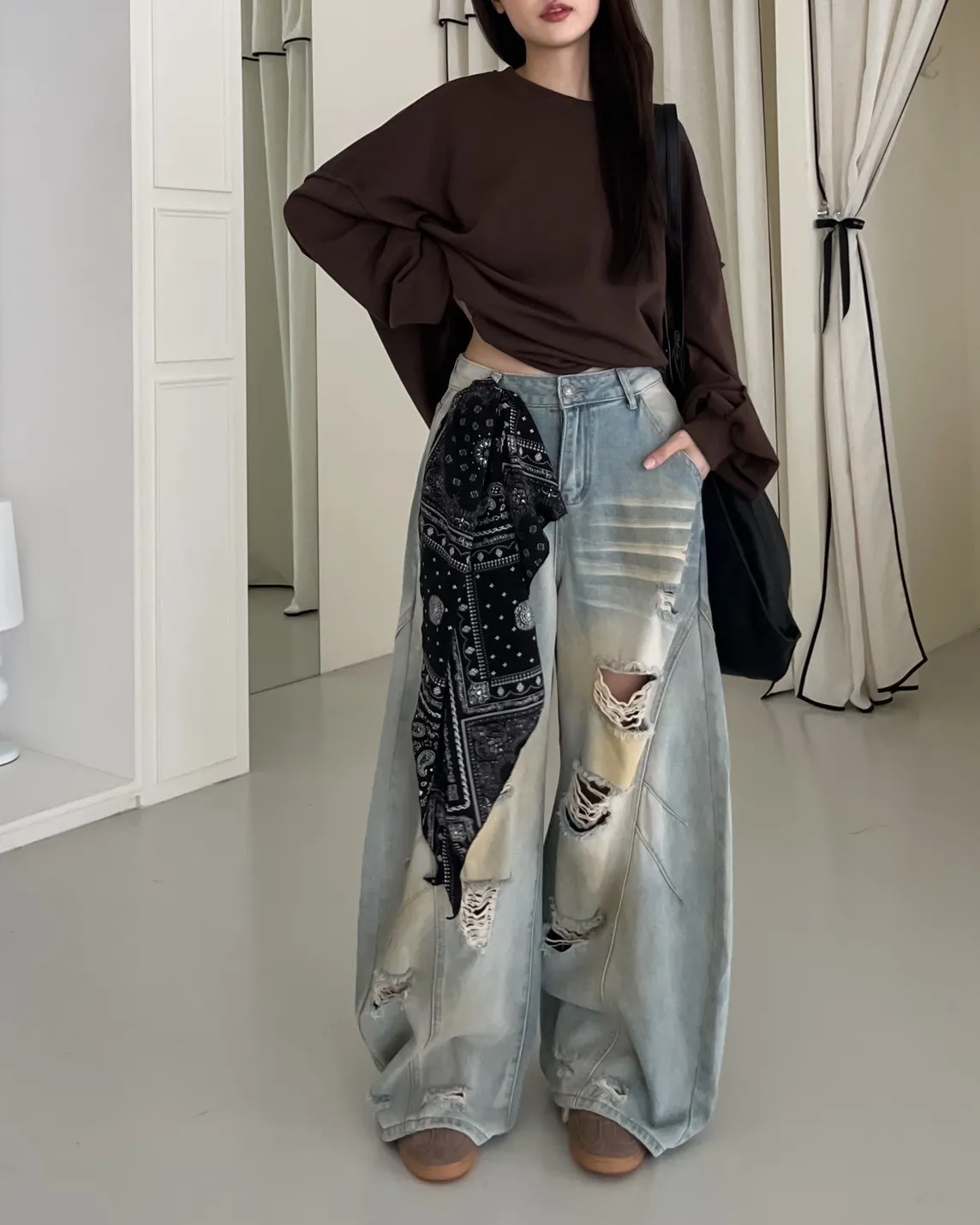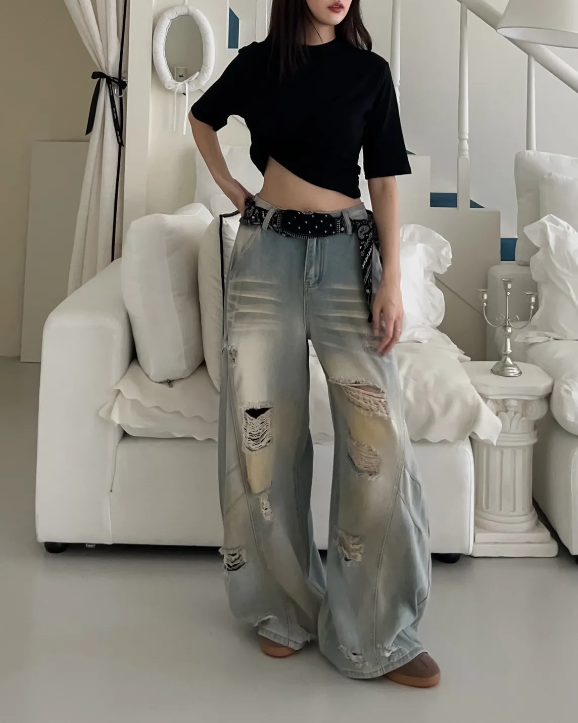 V0003(附三角巾)廢土風刷破小彎刀牛仔褲(藍/灰)