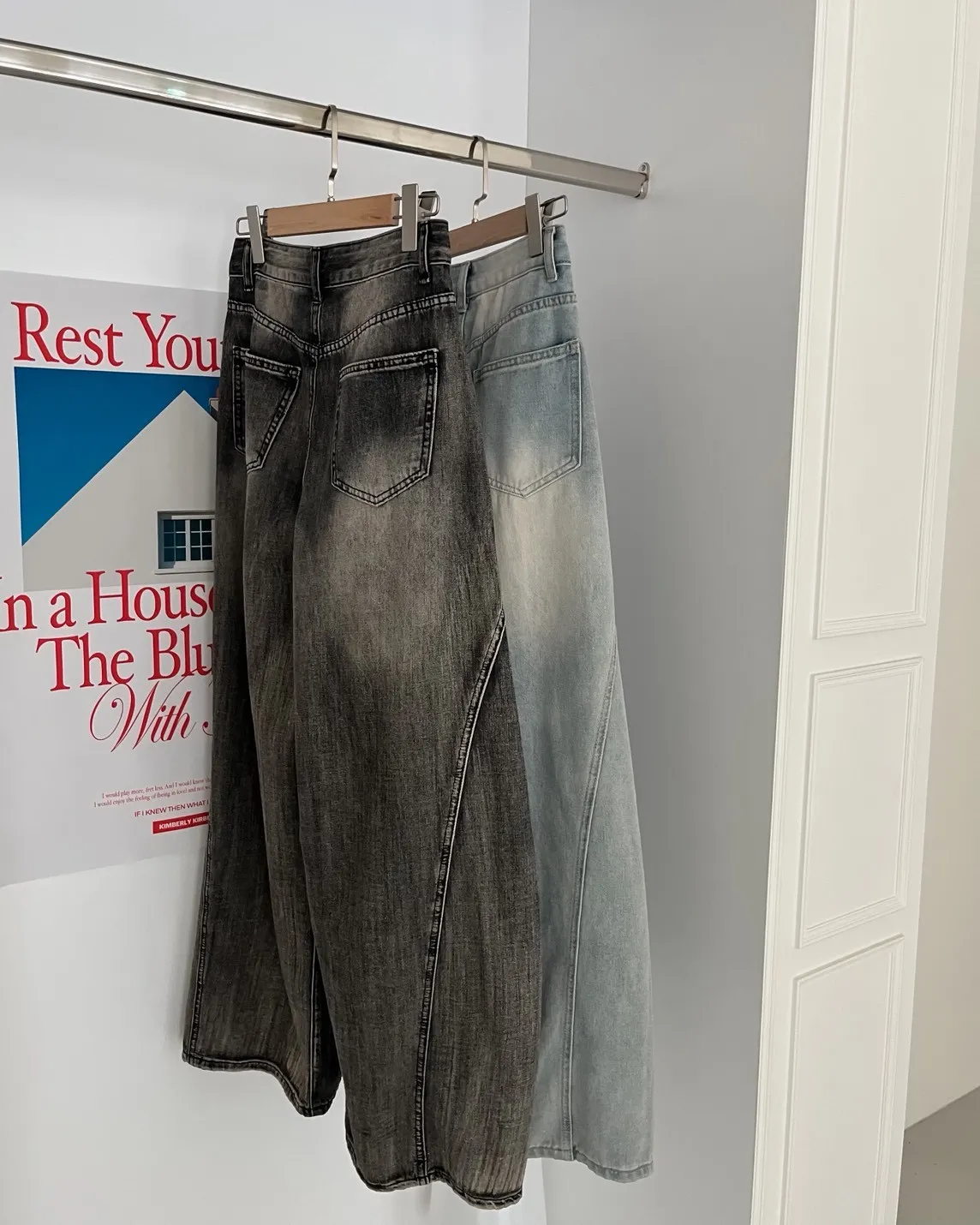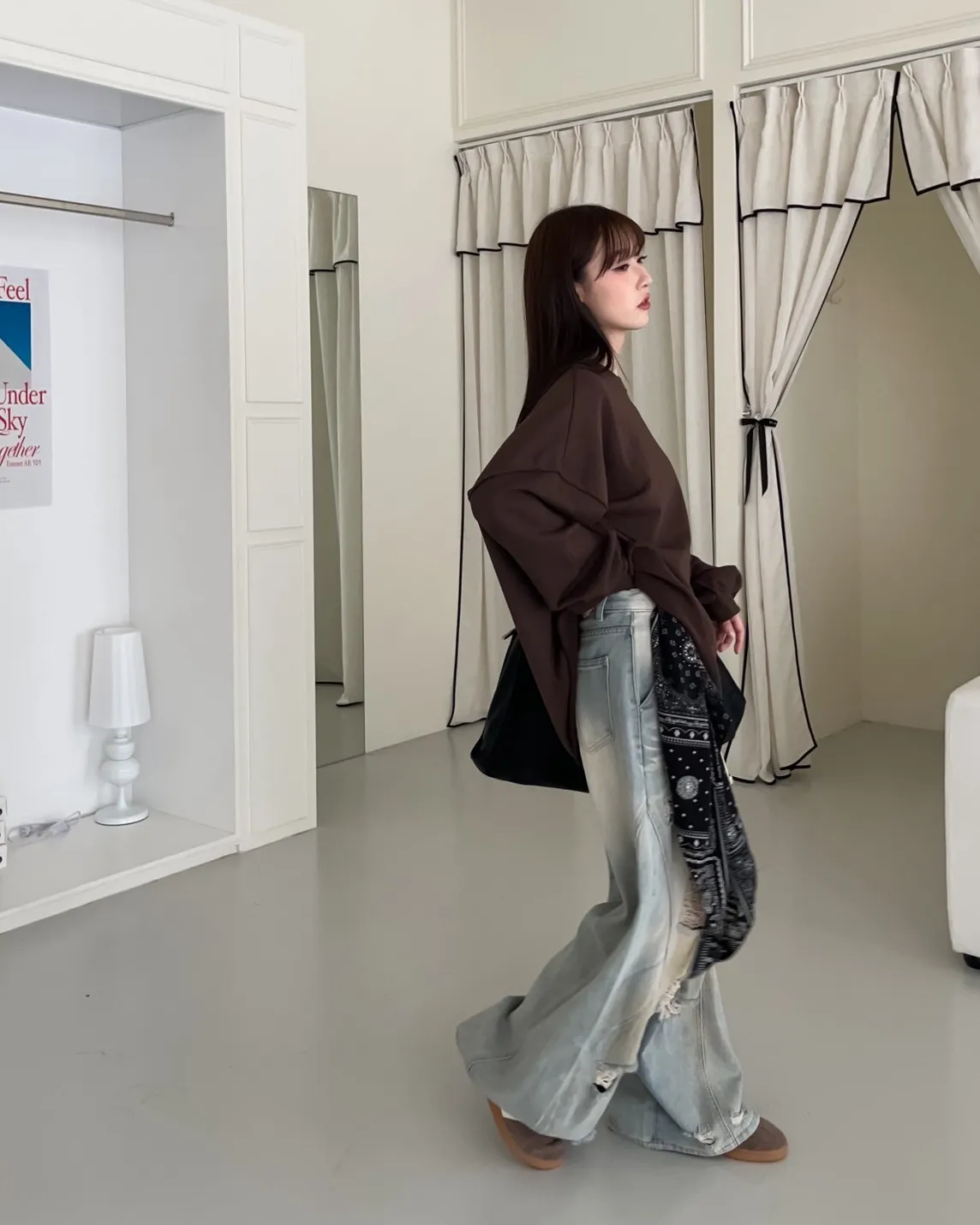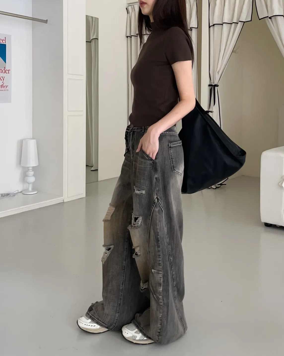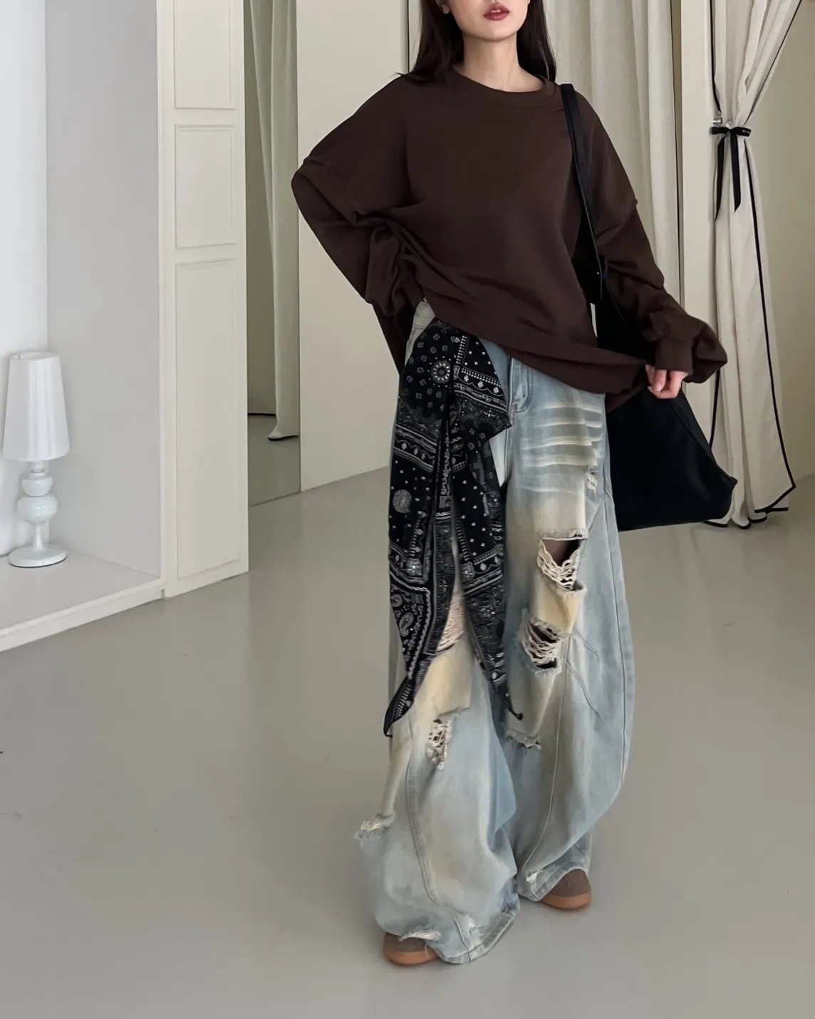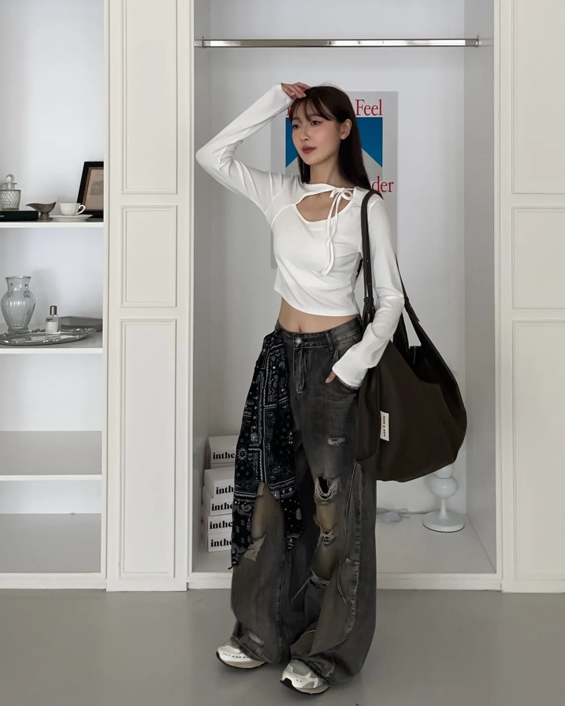 V0003(附三角巾)廢土風刷破小彎刀牛仔褲(藍/灰)