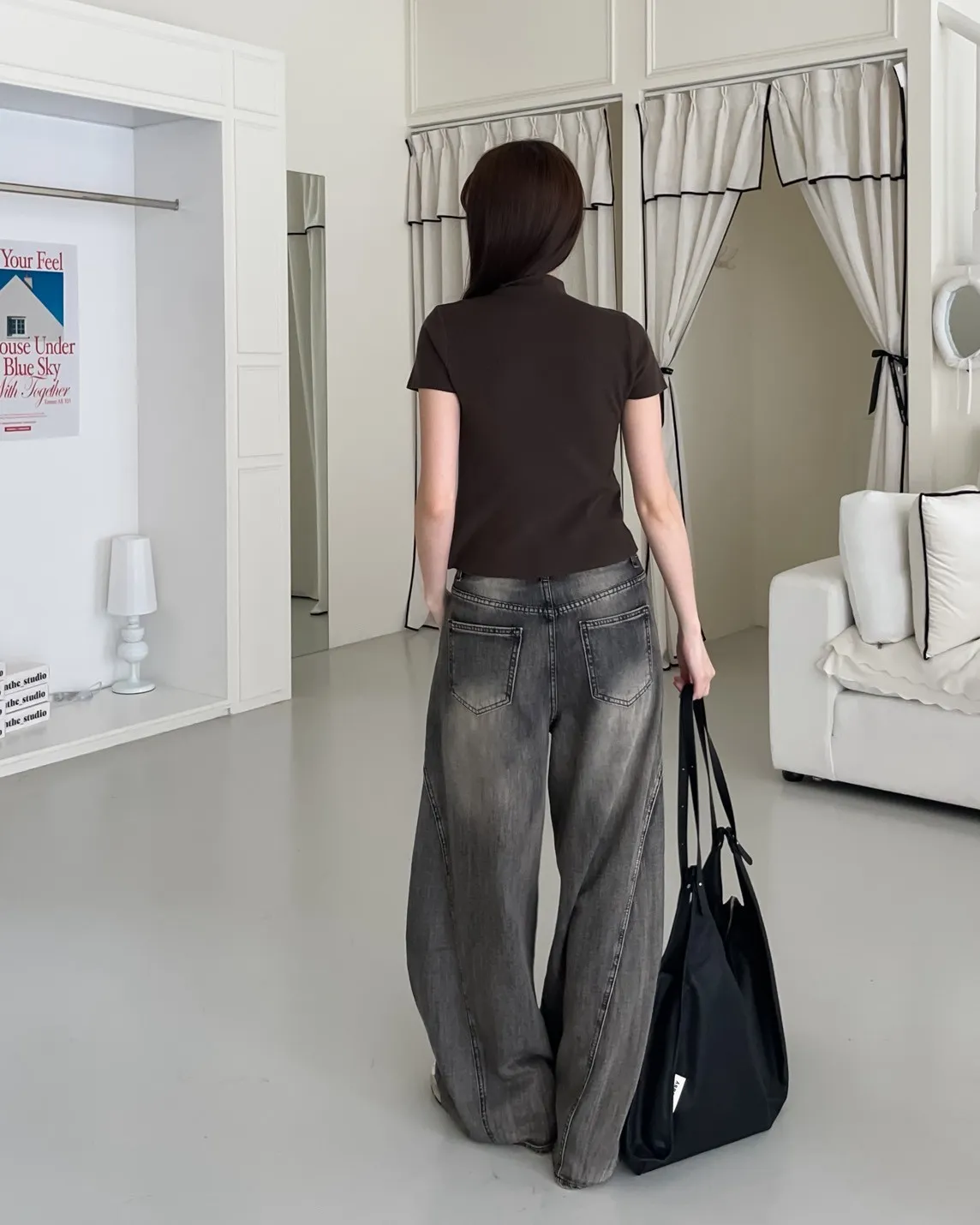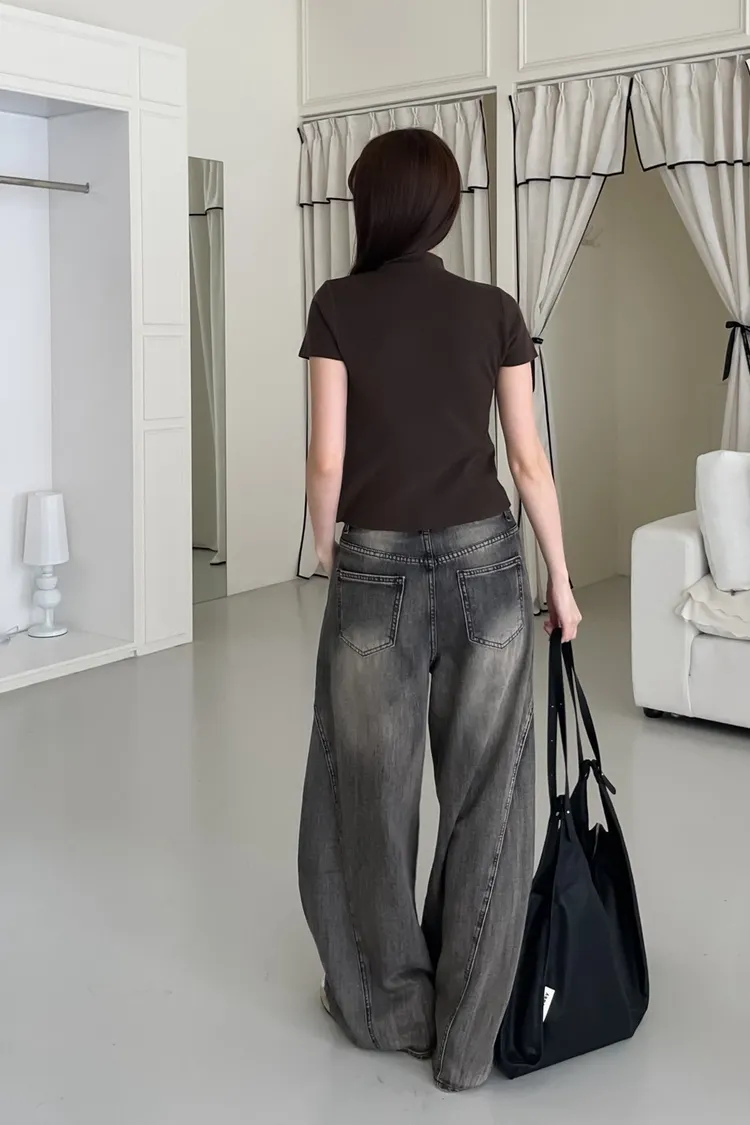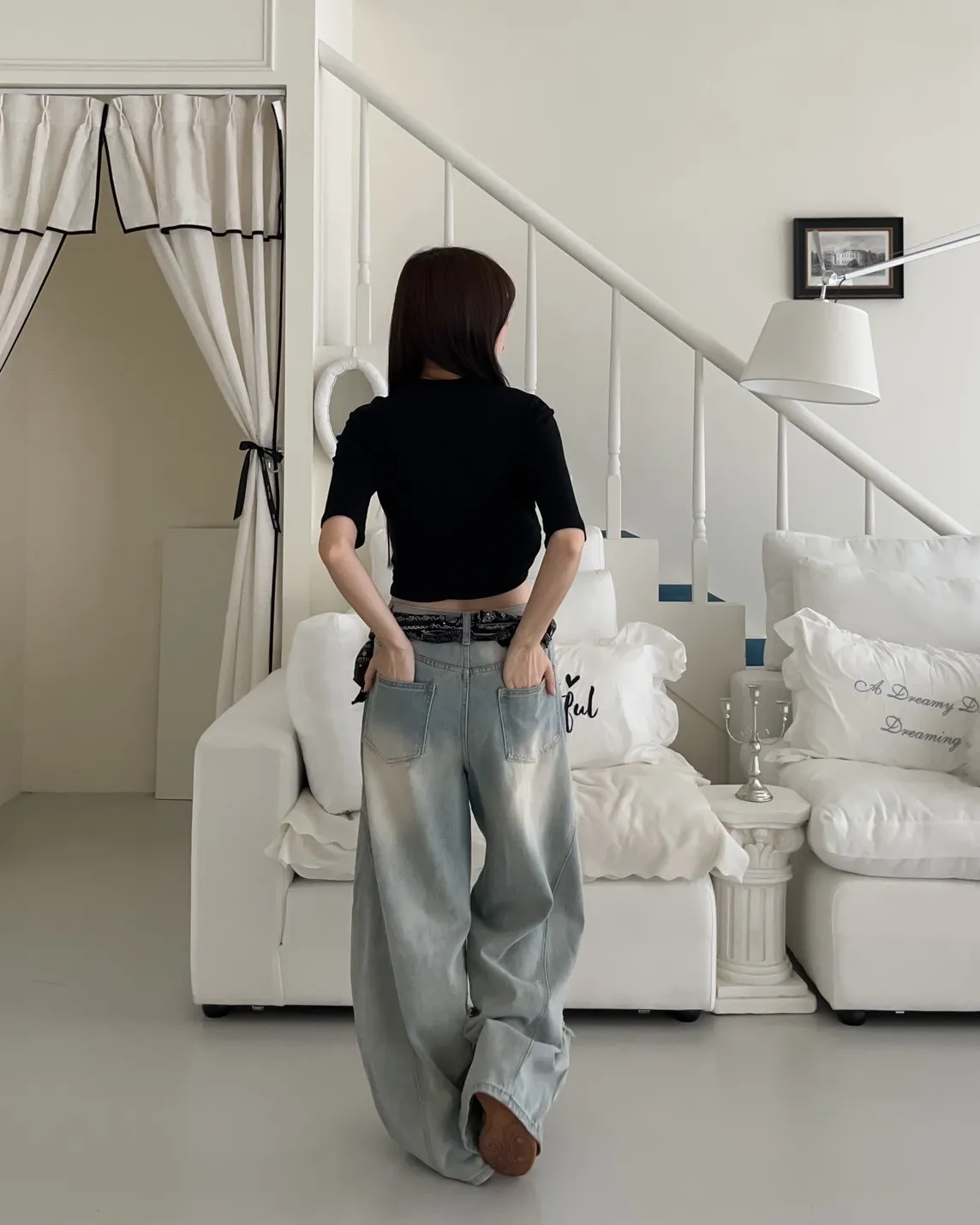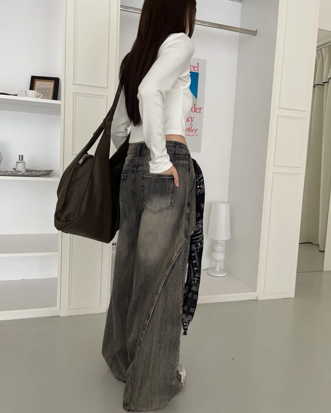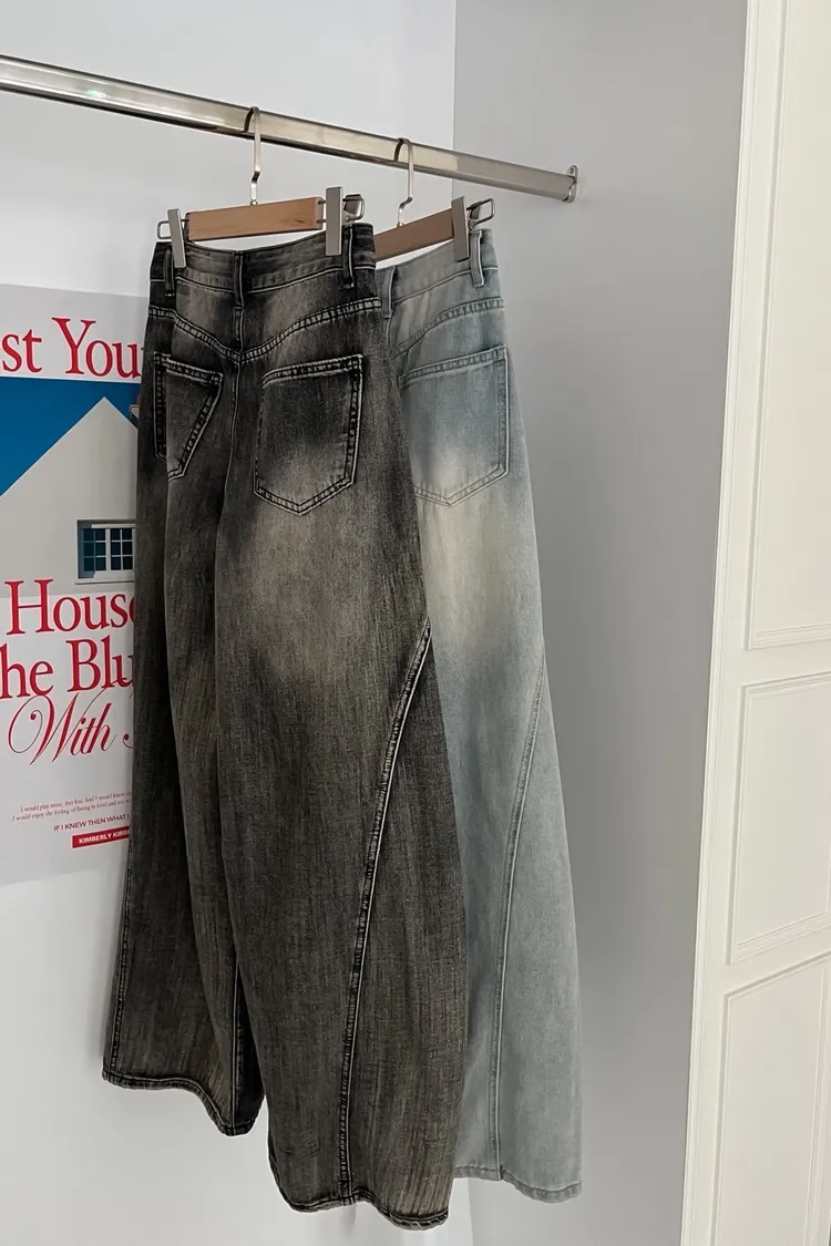 V0003(附三角巾)廢土風刷破小彎刀牛仔褲(藍/灰)