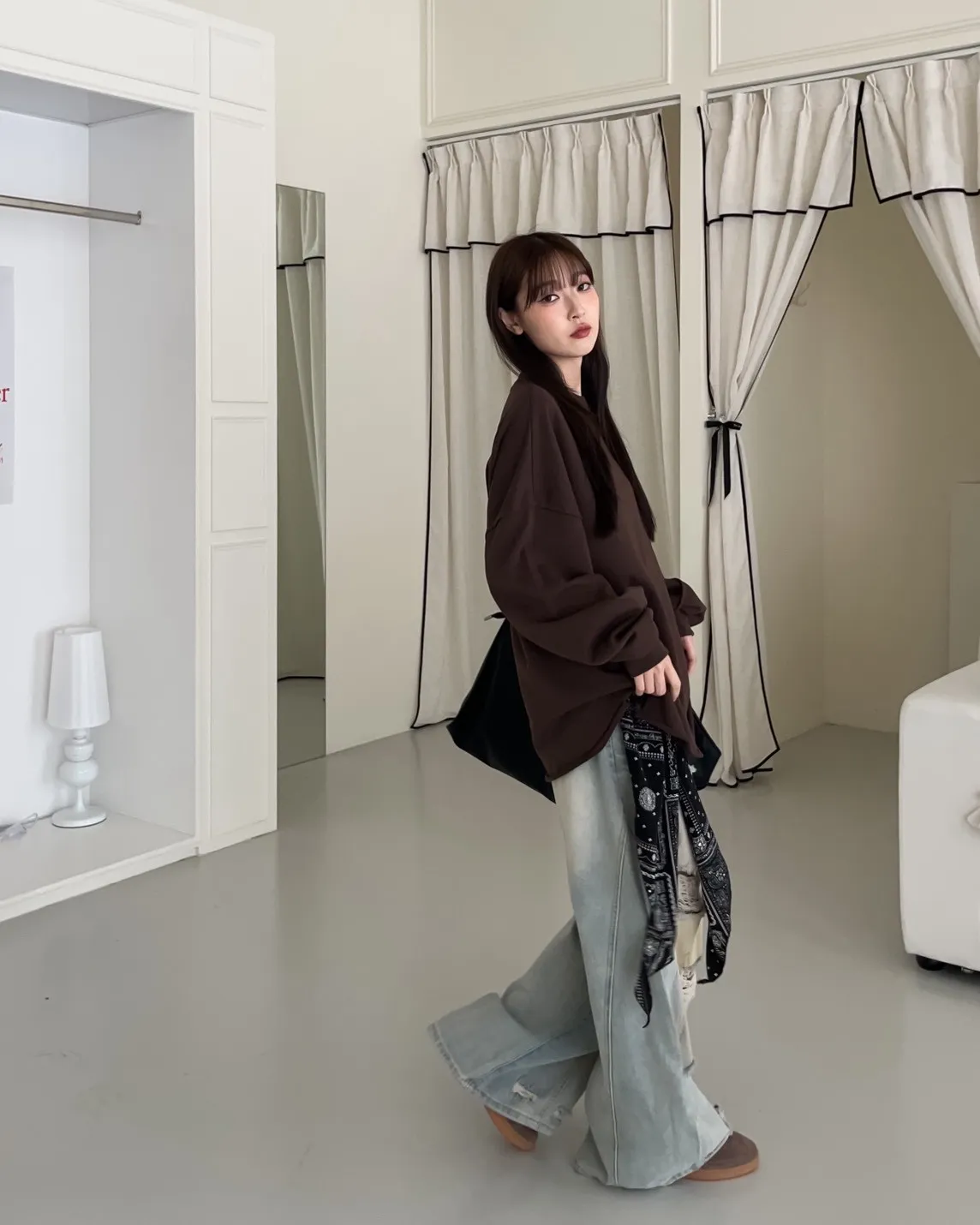 版型正常 兩側口袋 腿部刷黃 小彎刀版型 車線 破洞造型 附三角絲巾