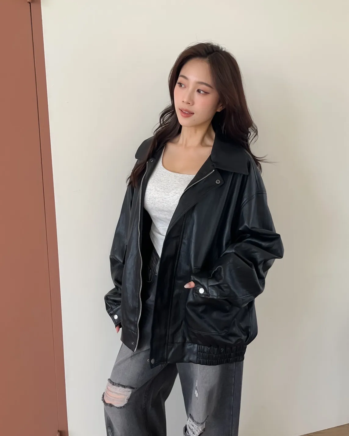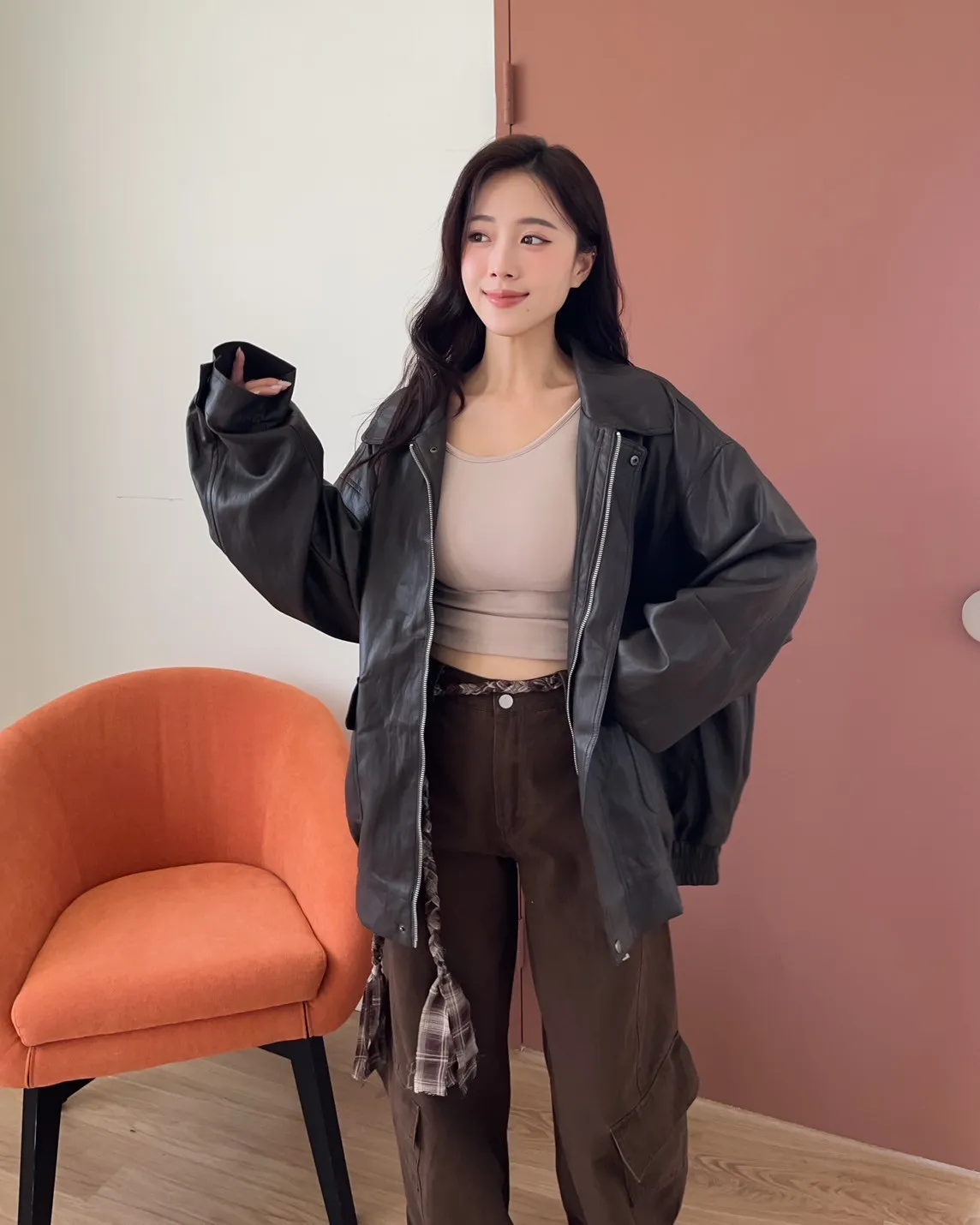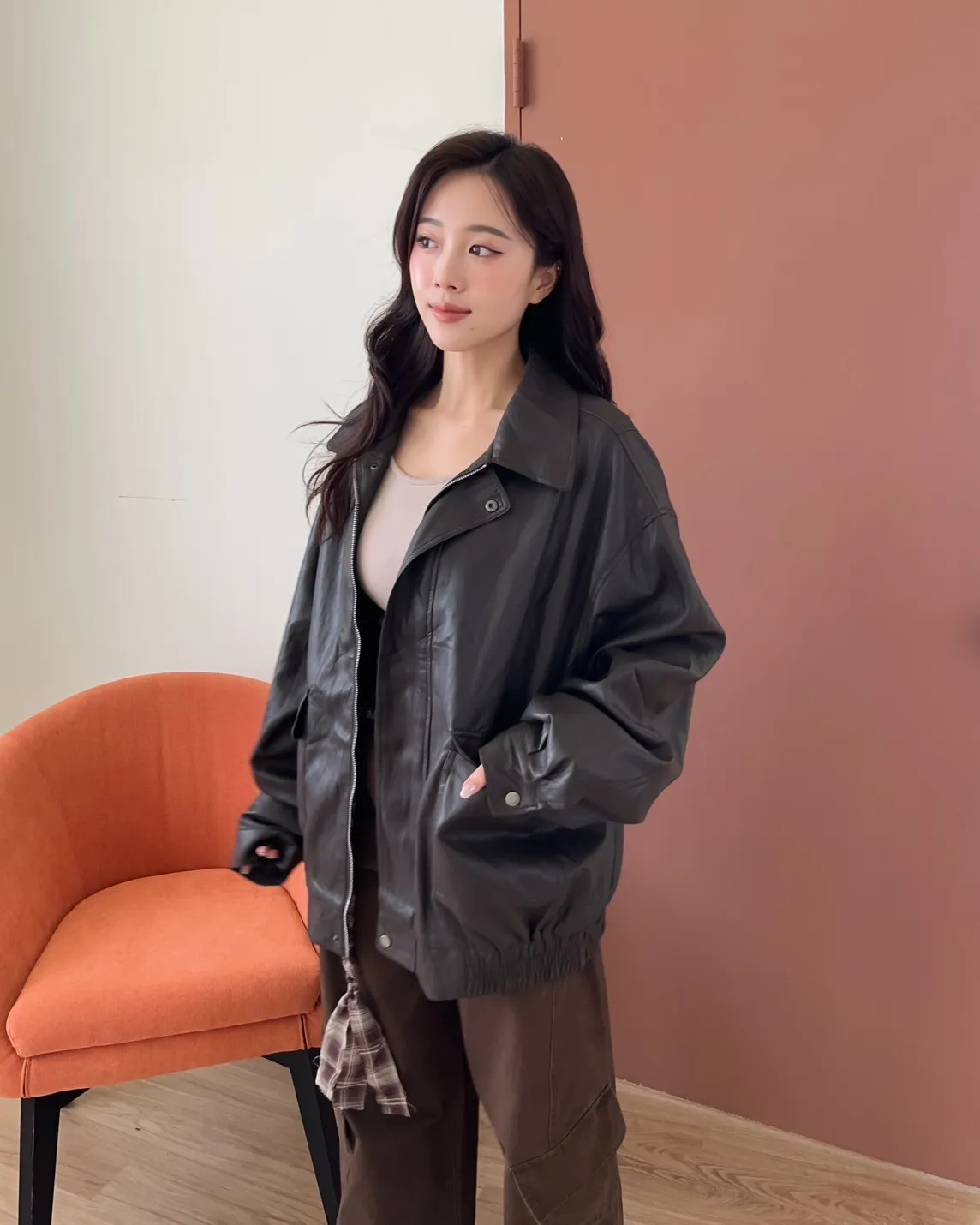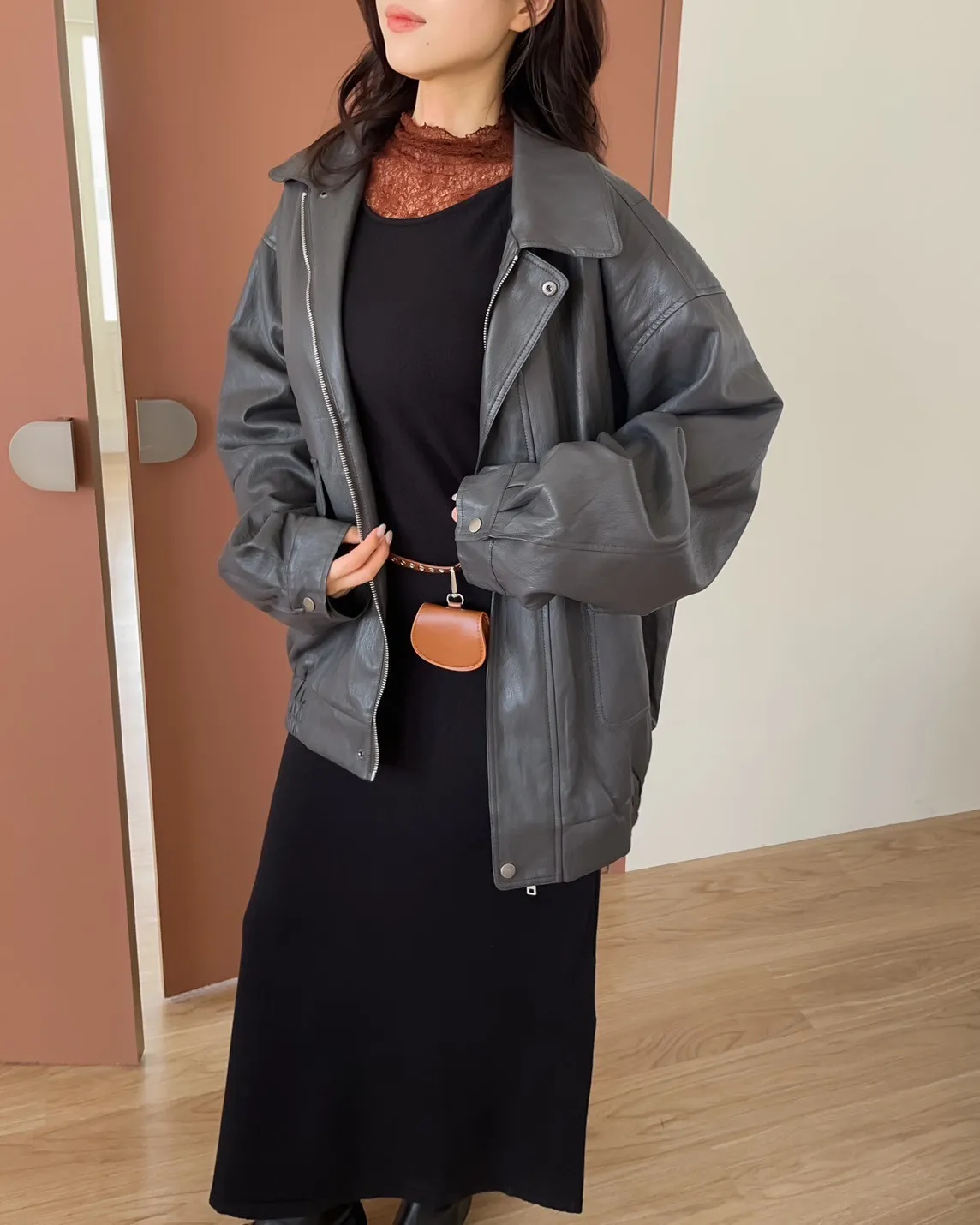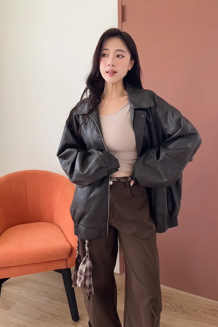 U0091超大件亮面皮革外套(咖啡/灰/黑)