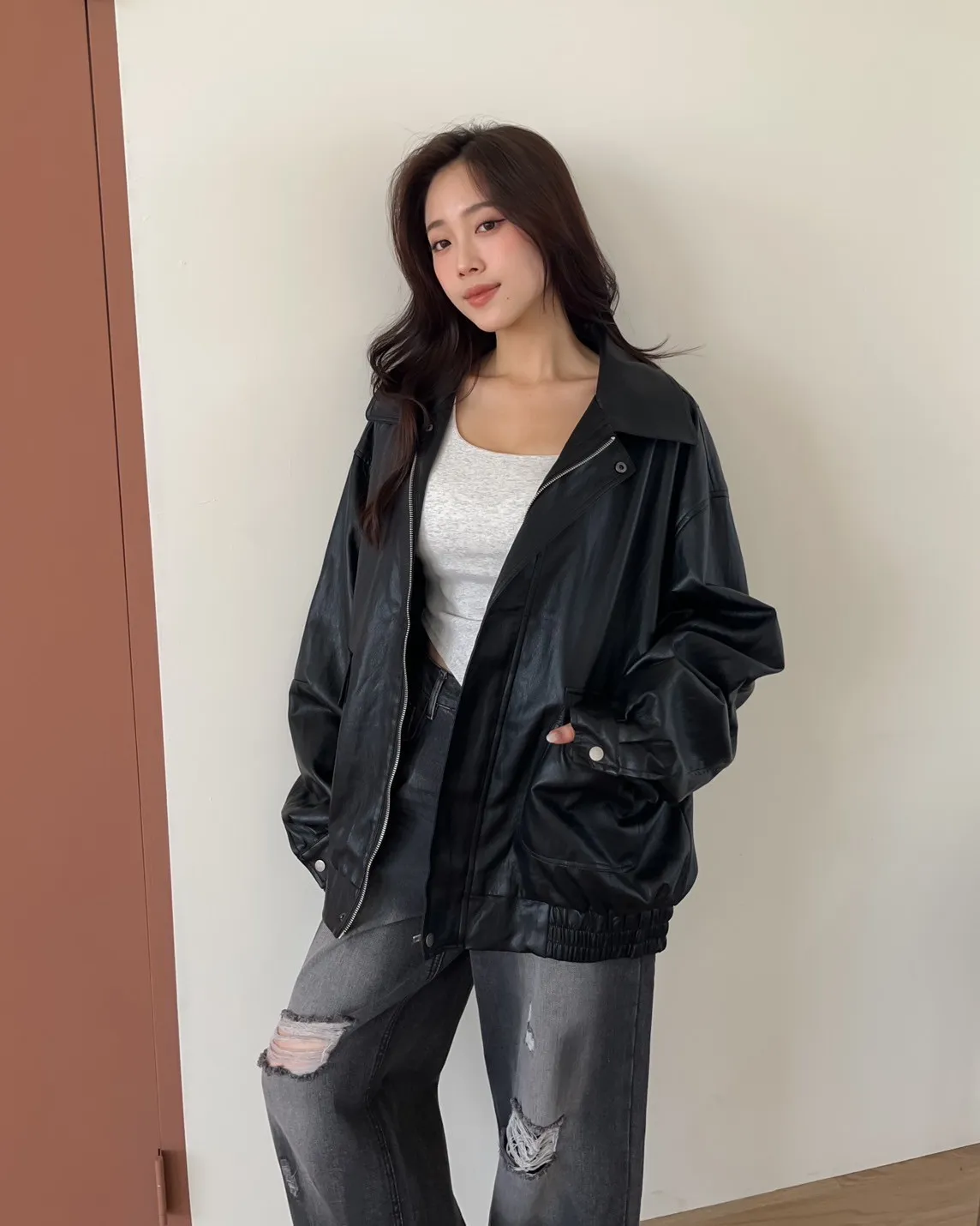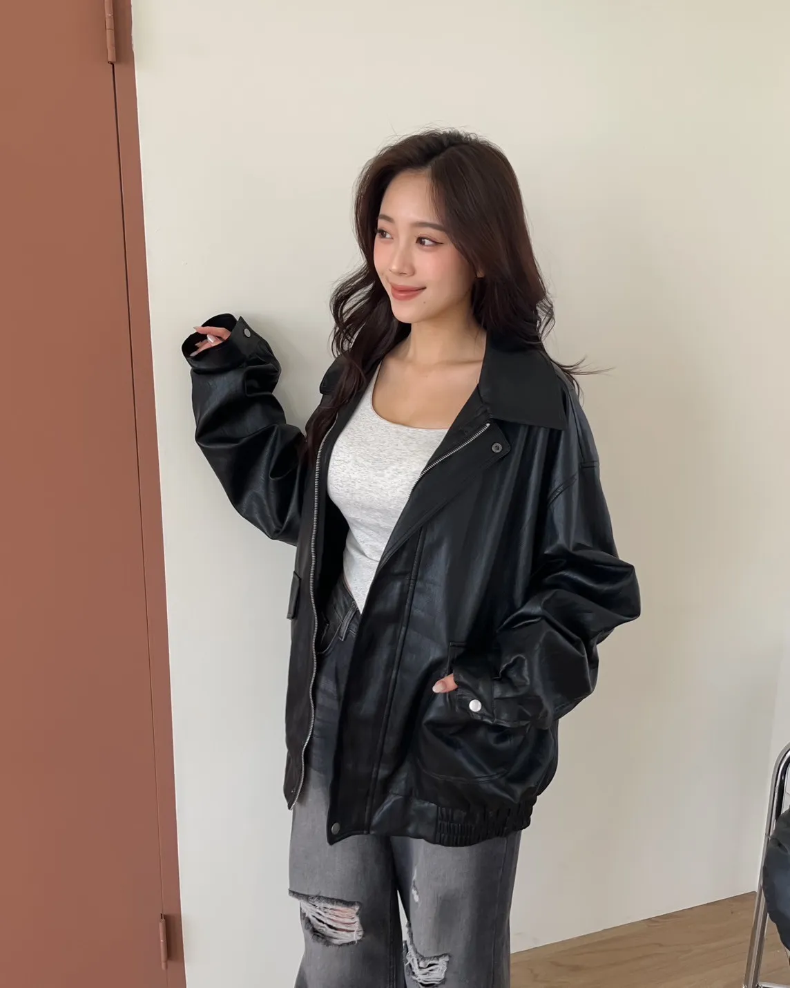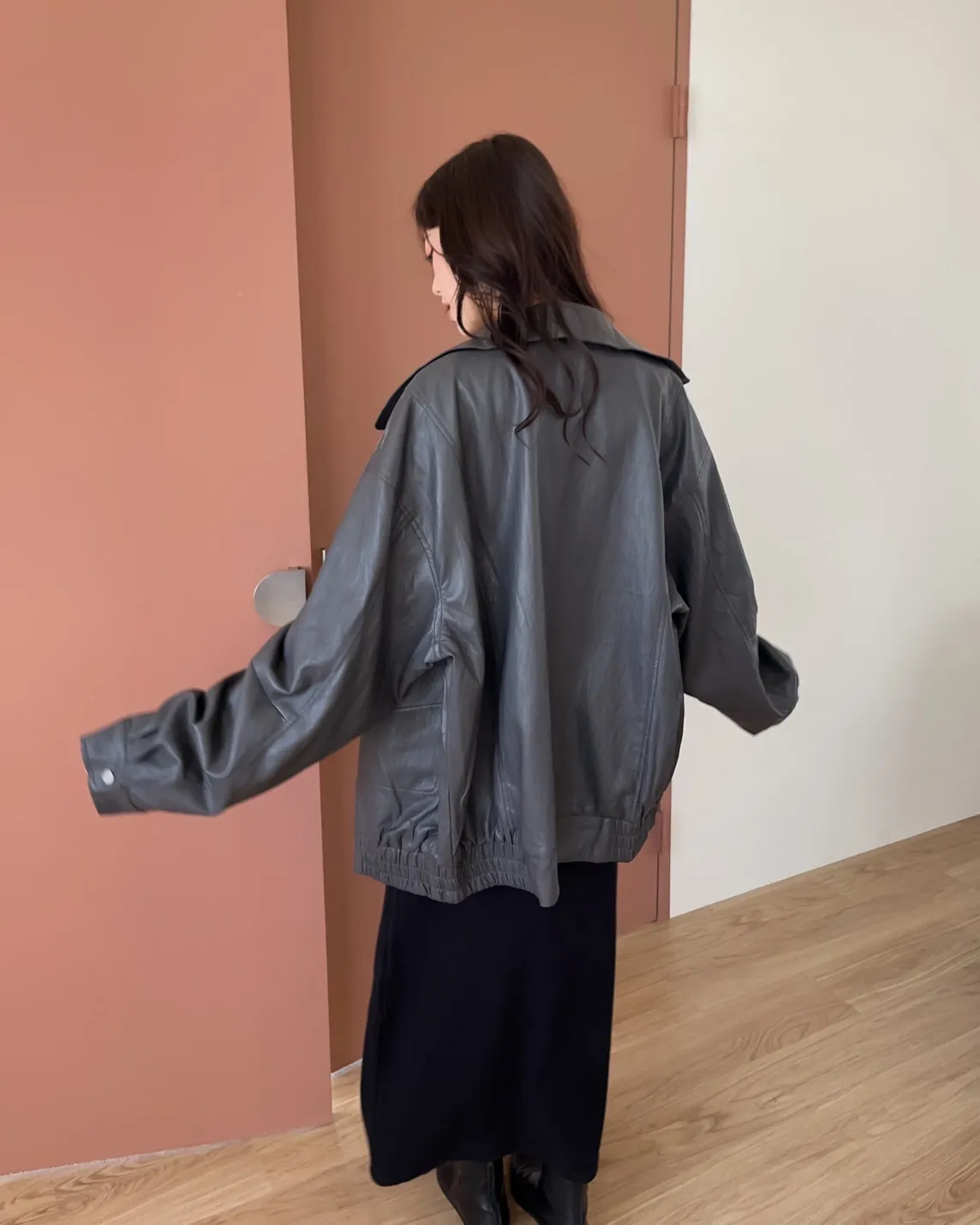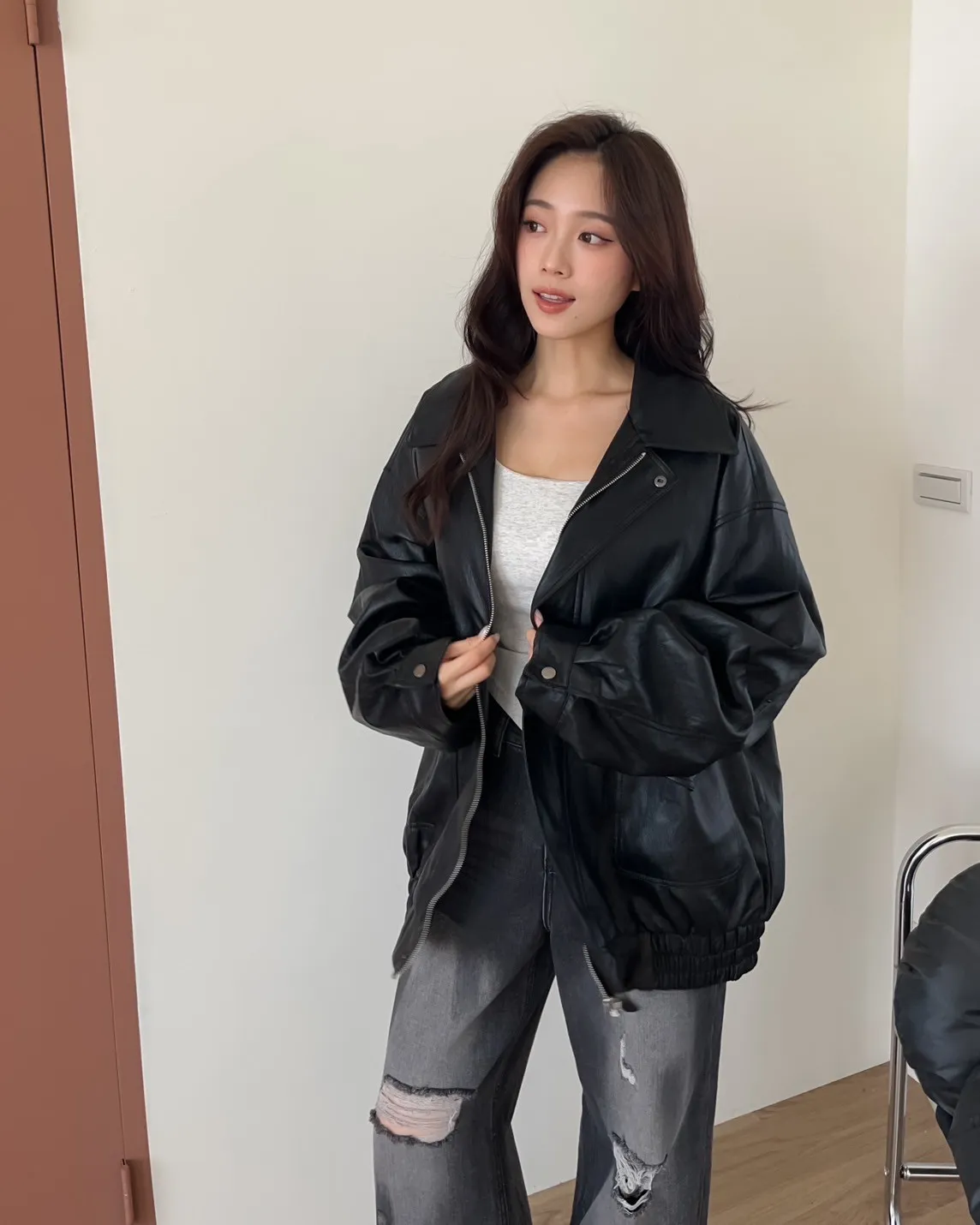 U0091超大件亮面皮革外套(咖啡/灰/黑)