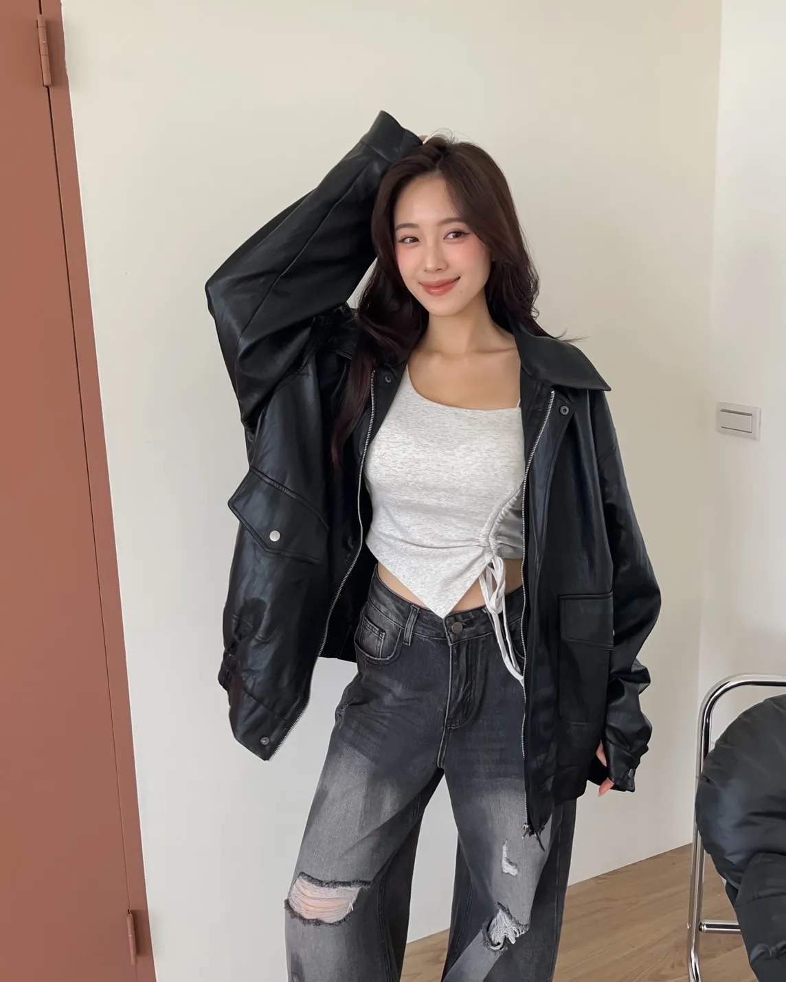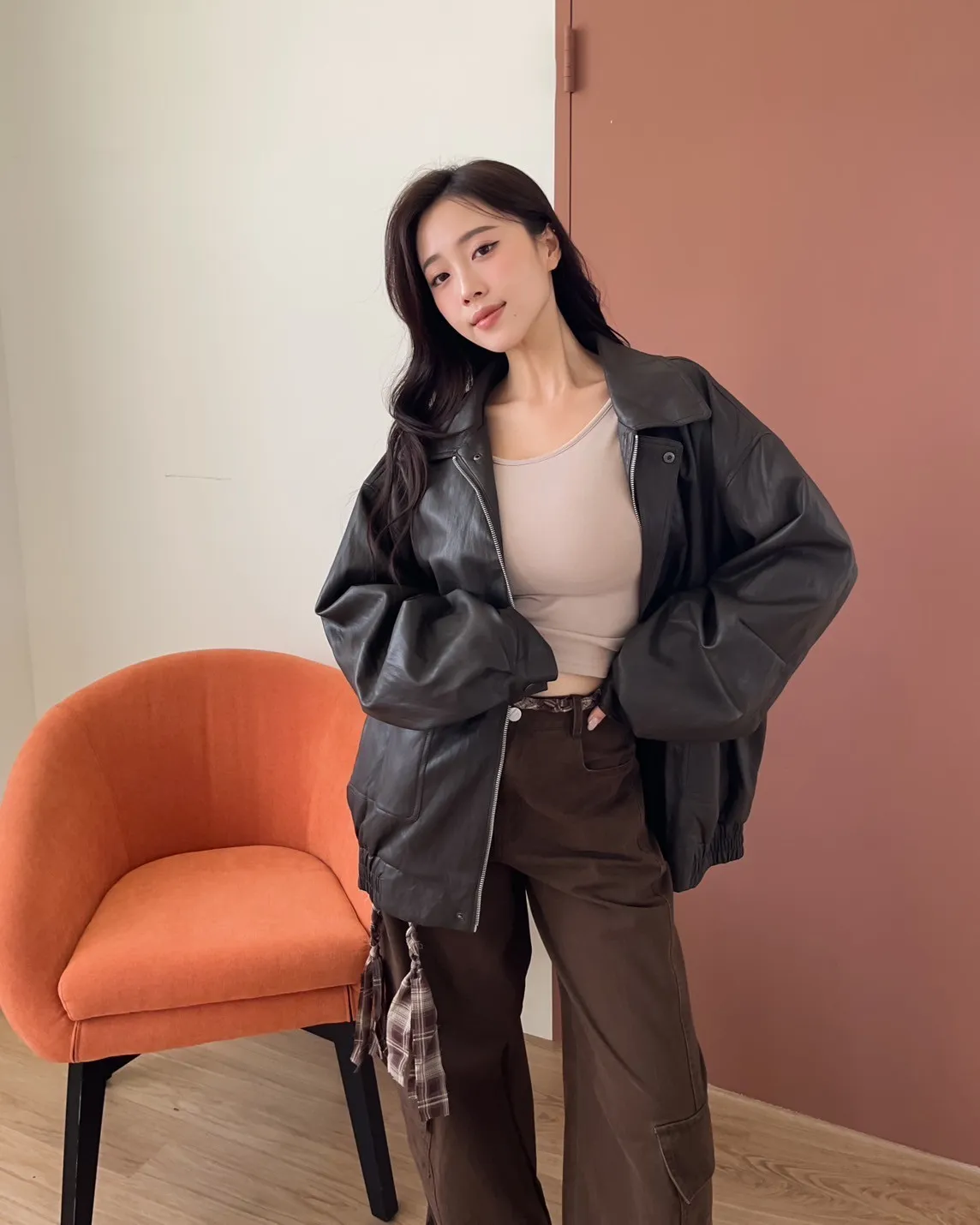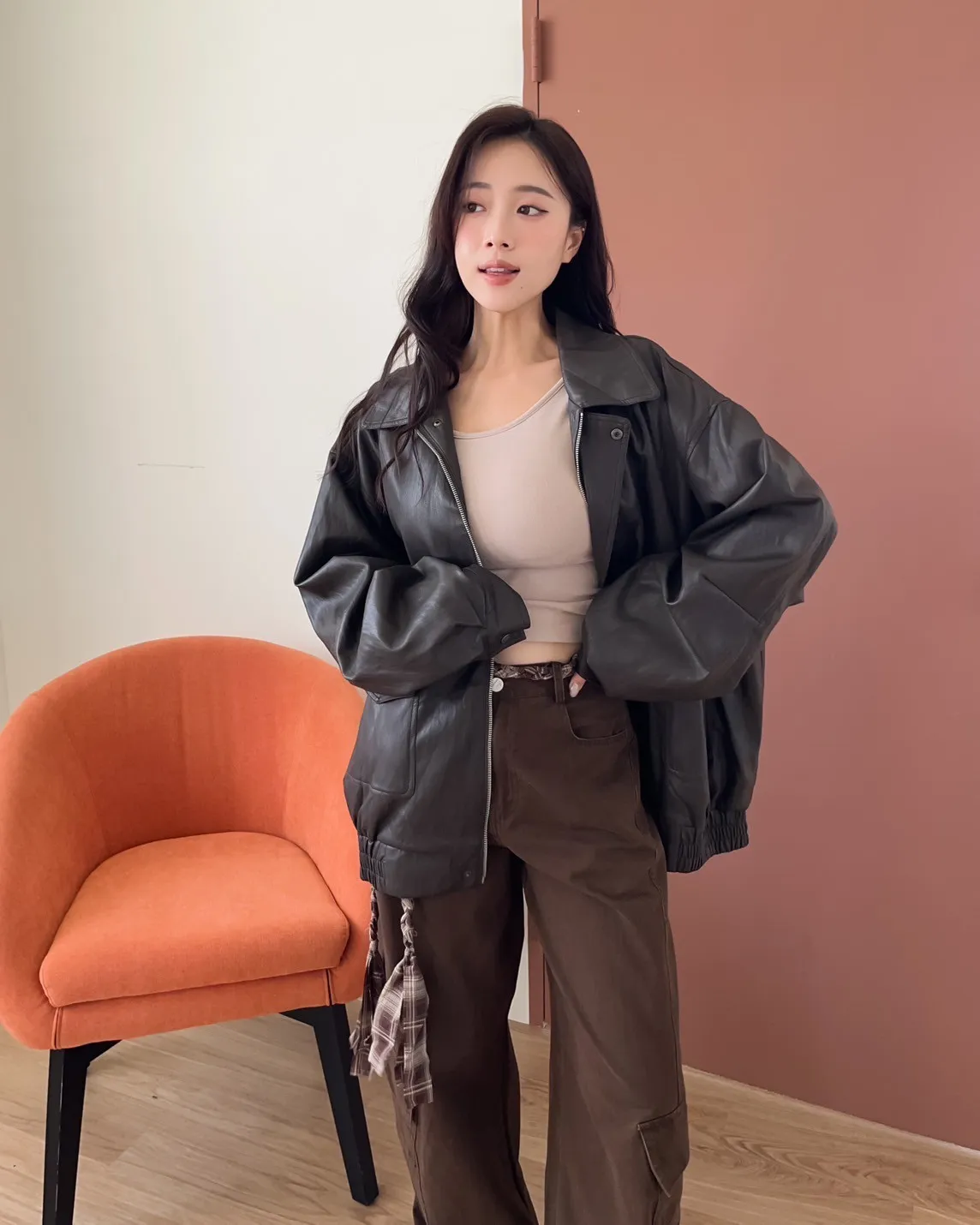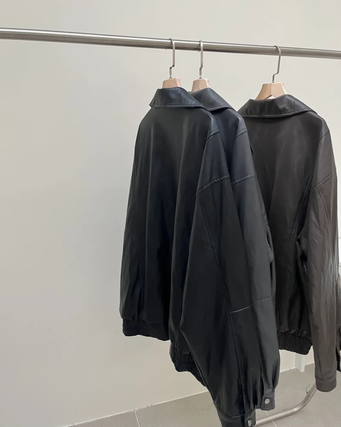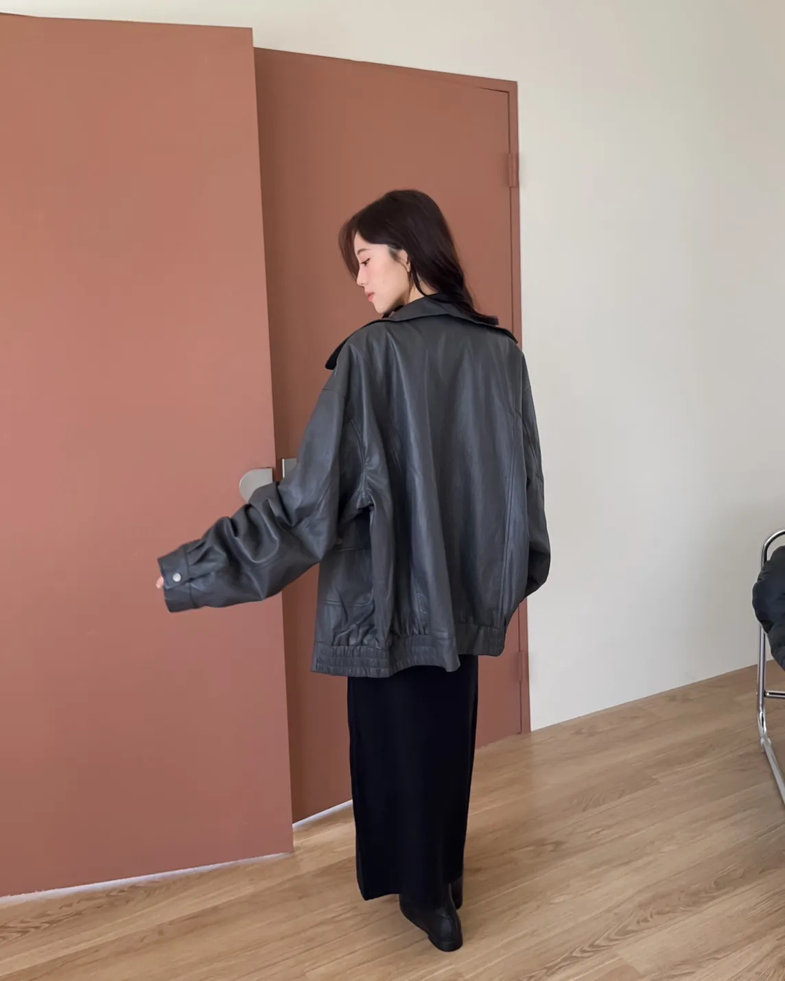 寬鬆落肩 下擺鬆緊 有內裡 兩側口袋 亮面軟皮革 微皺紋理