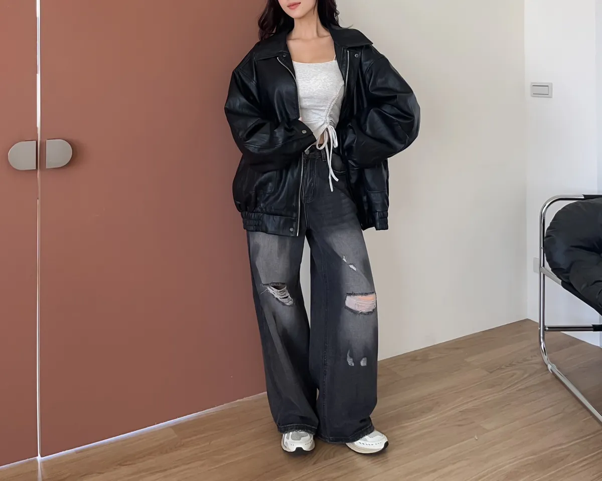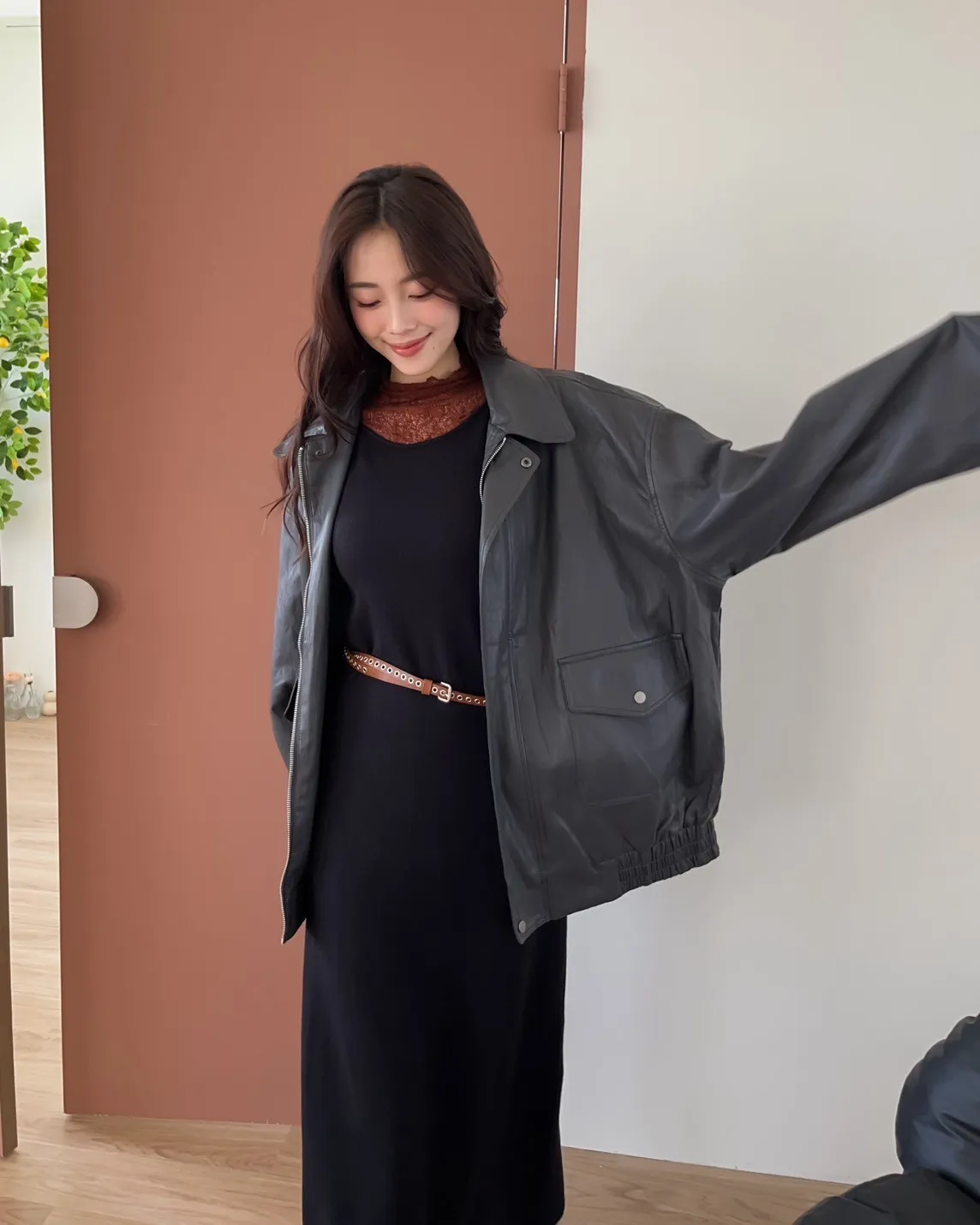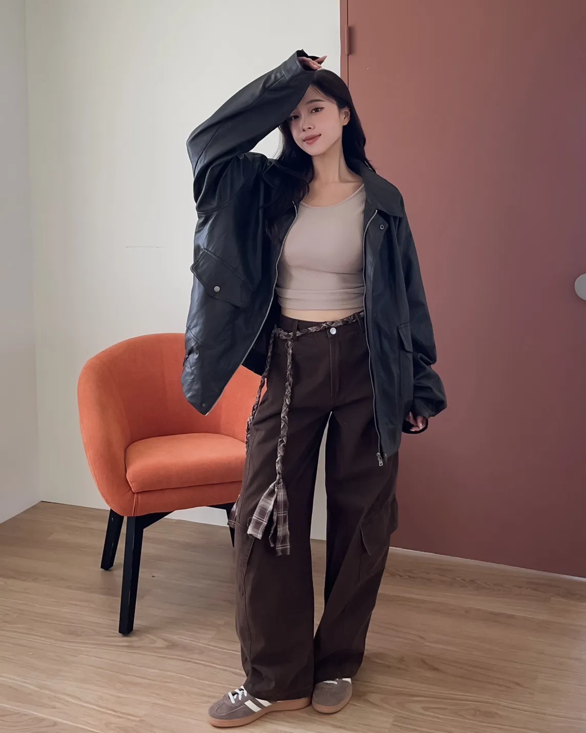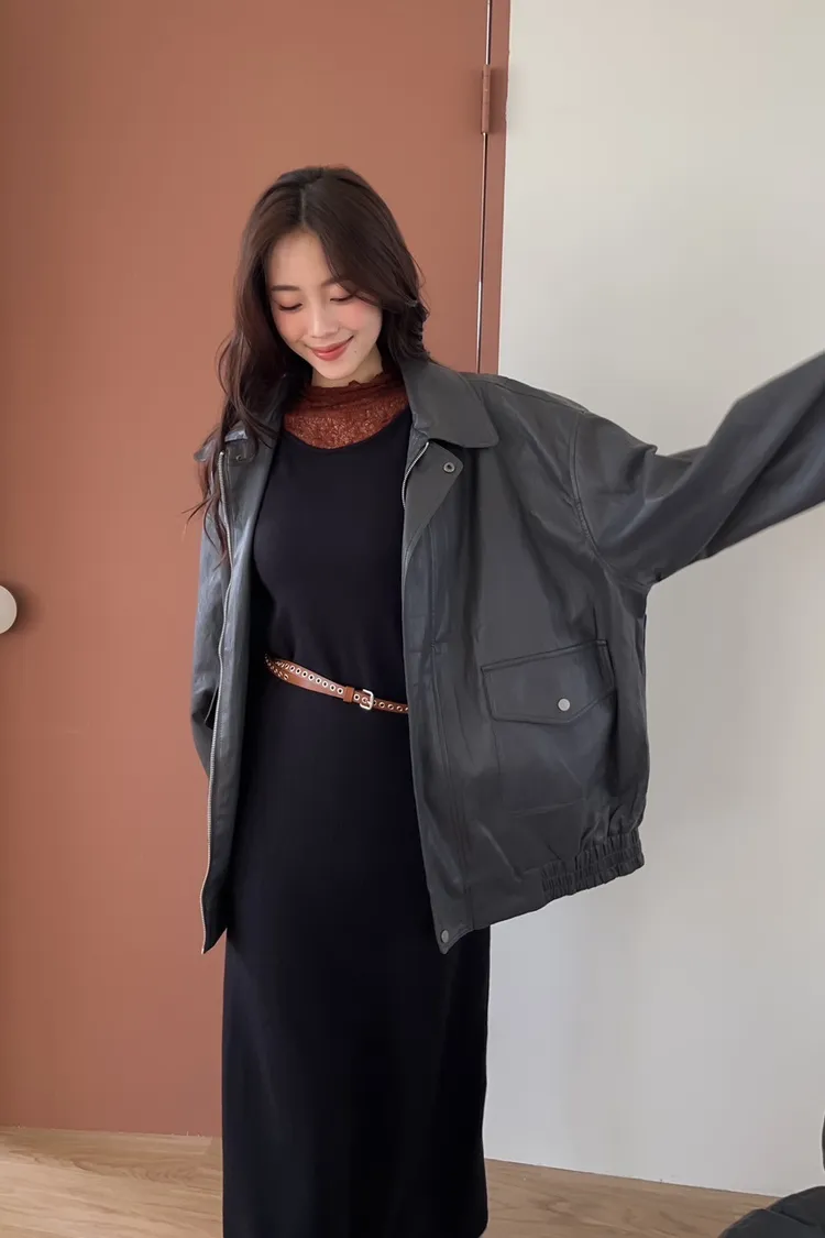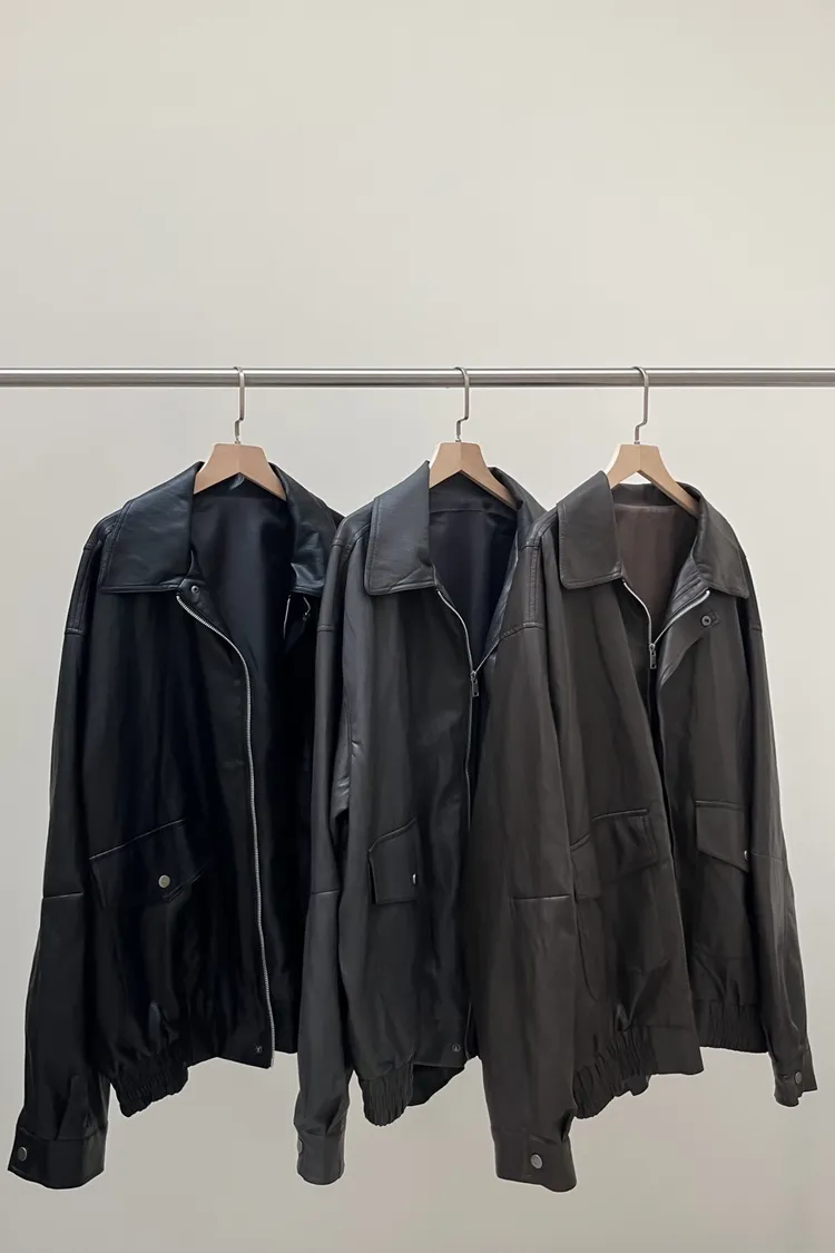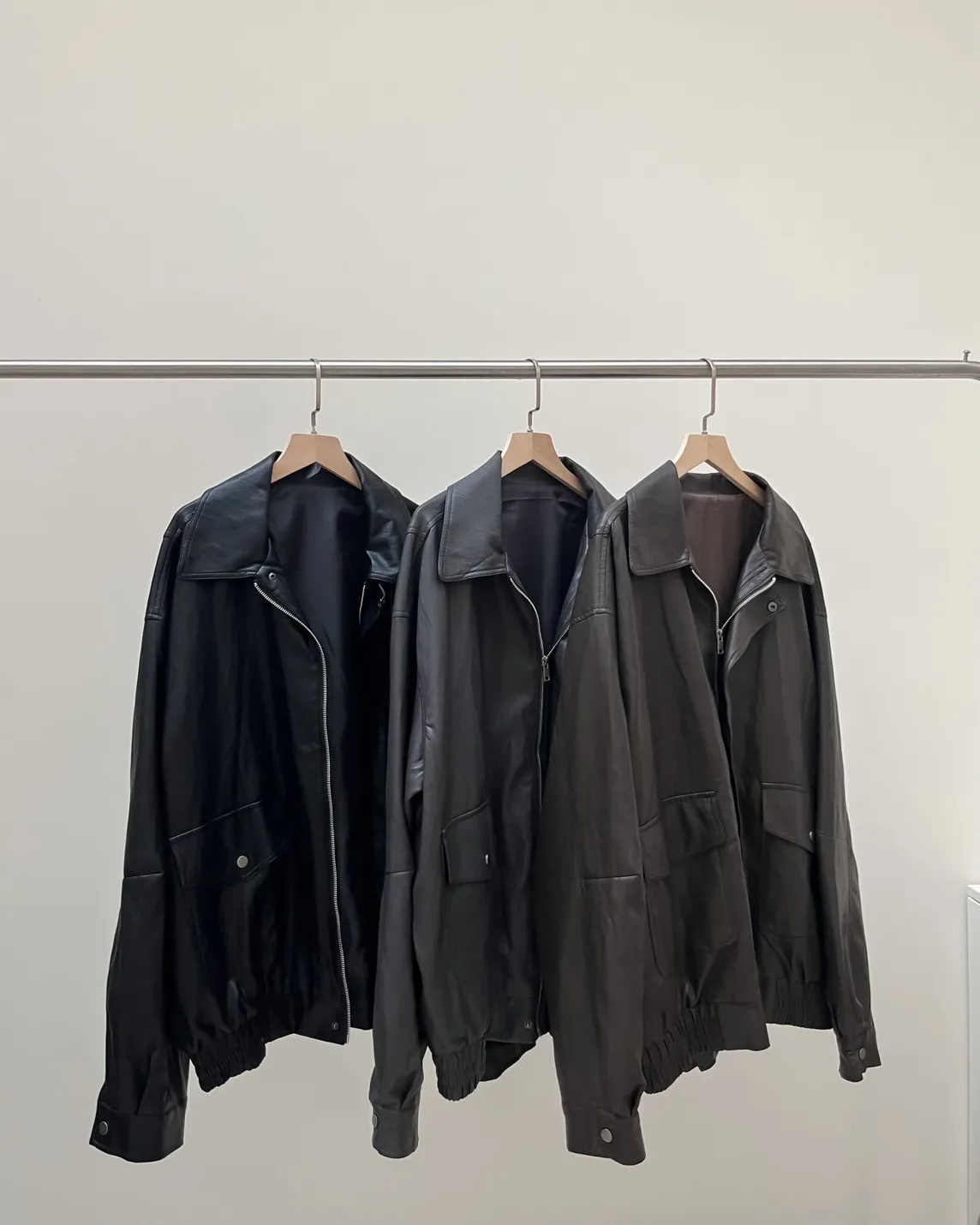 寬鬆落肩 下擺鬆緊 有內裡 兩側口袋 亮面軟皮革 微皺紋理