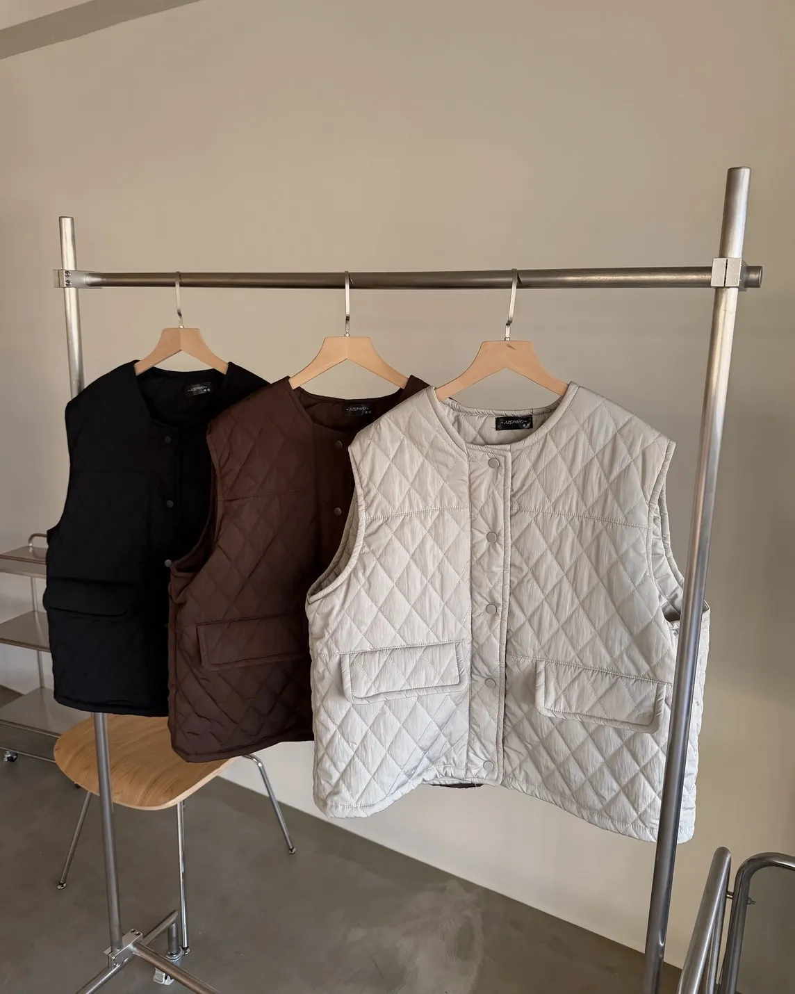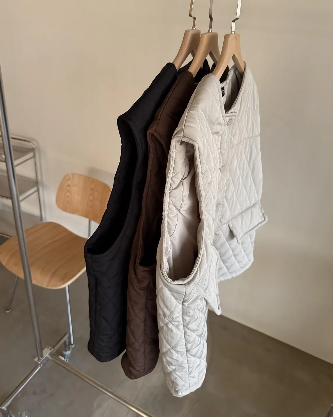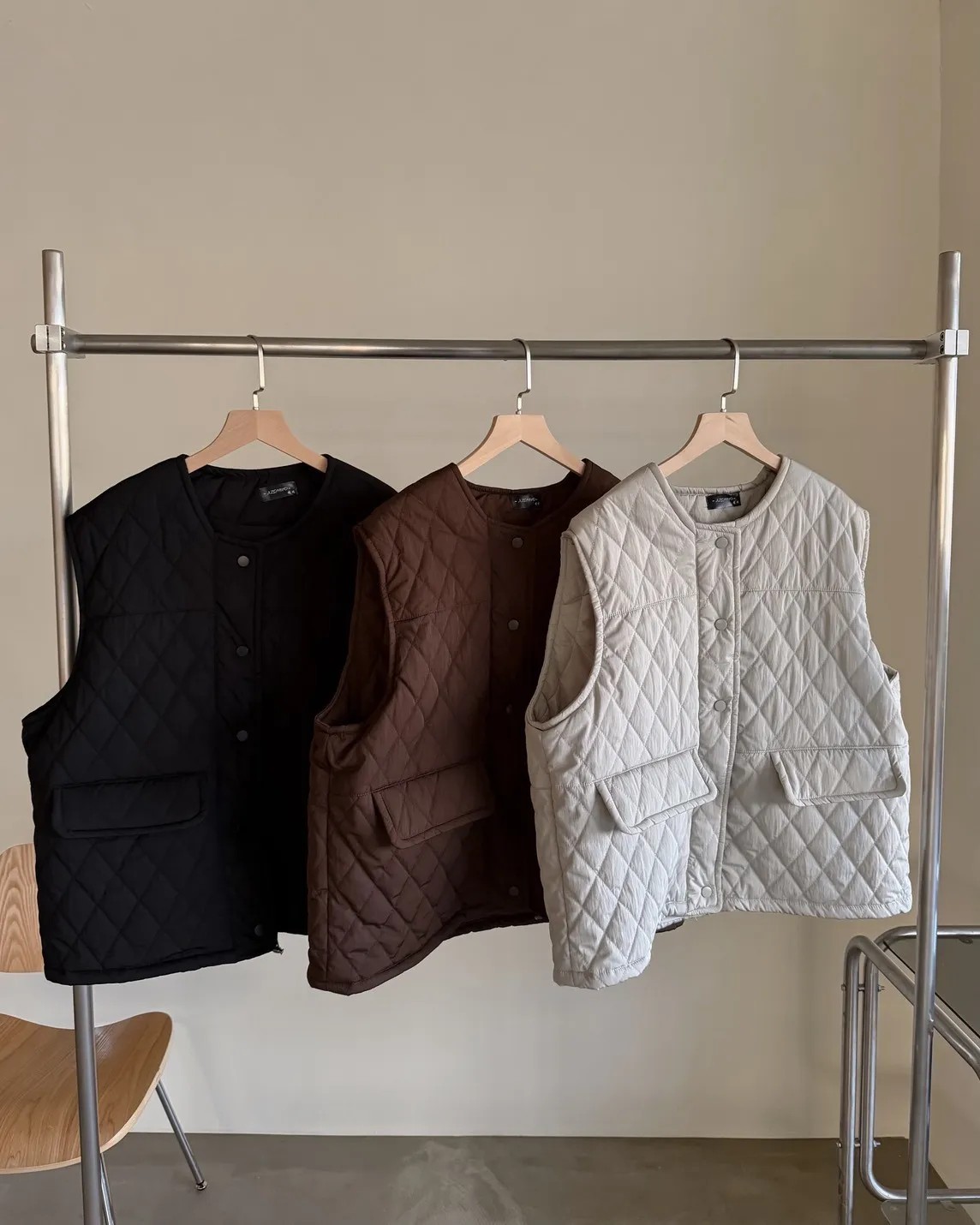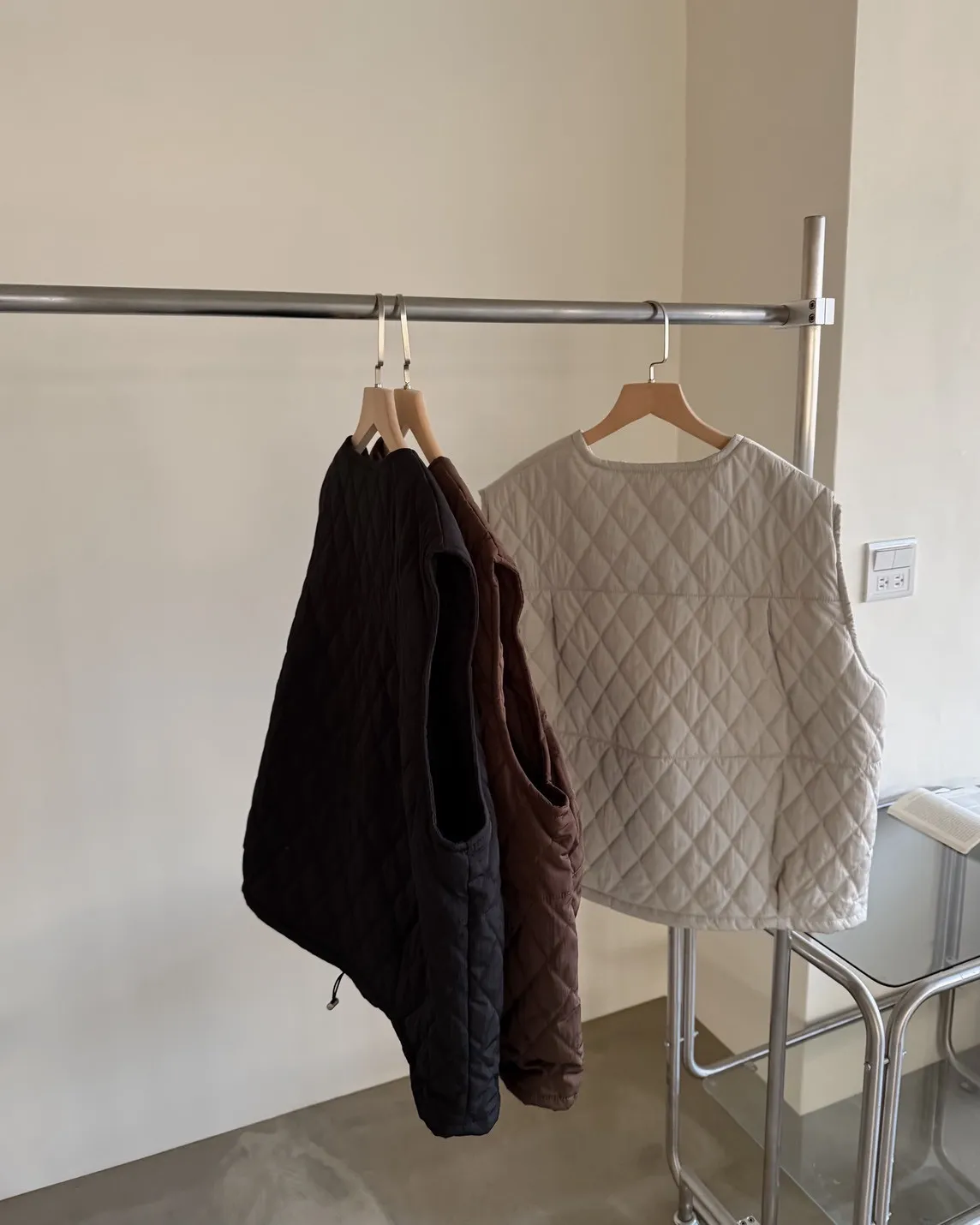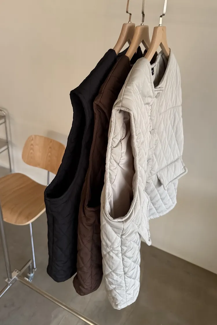 X0007菱格紋鋪棉澎澎背心(灰杏/咖啡/黑)