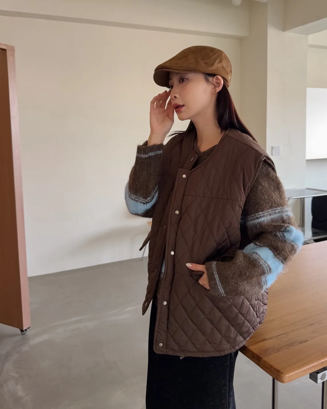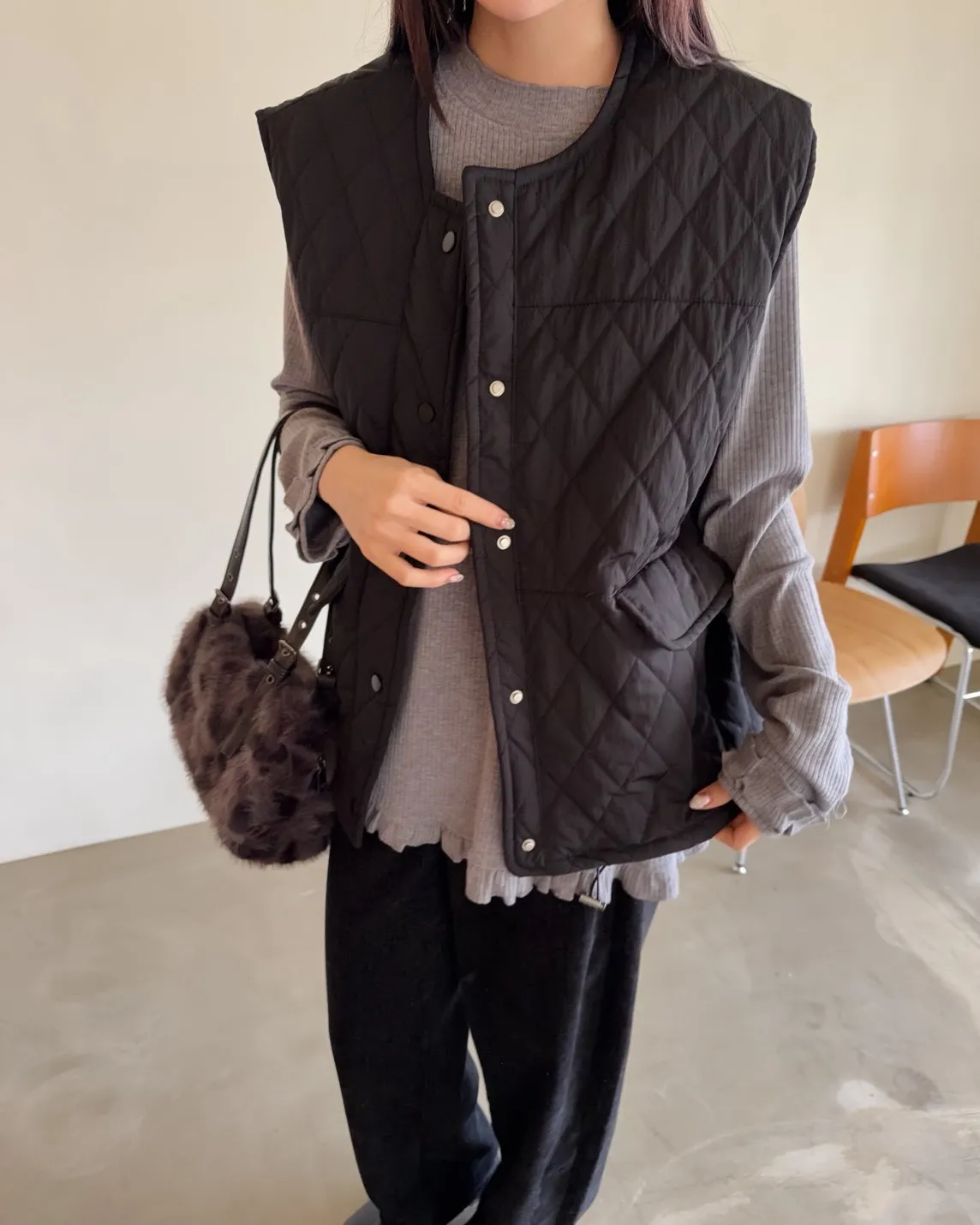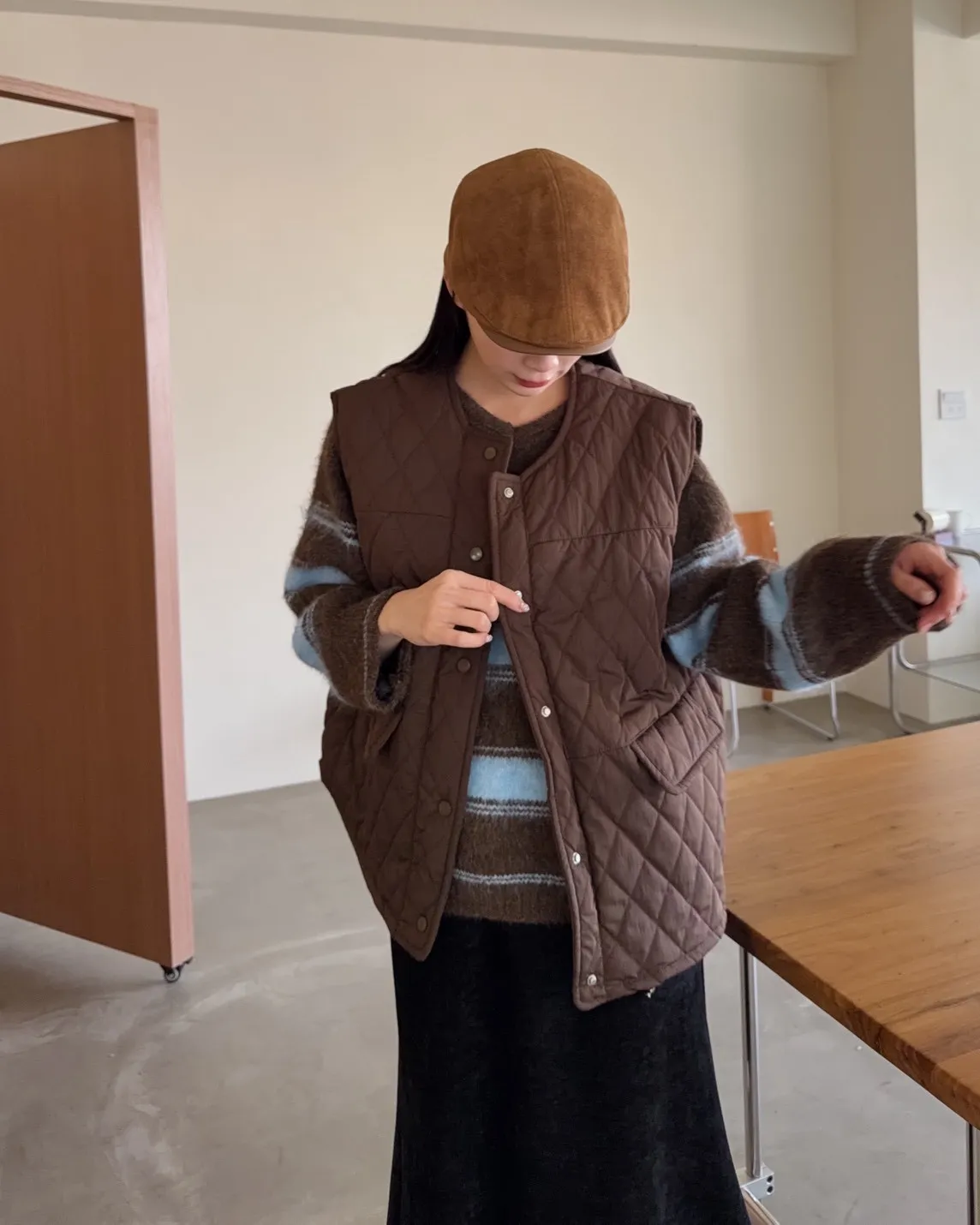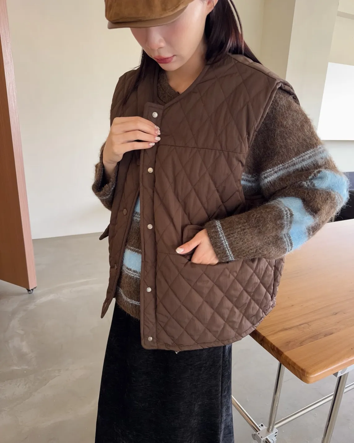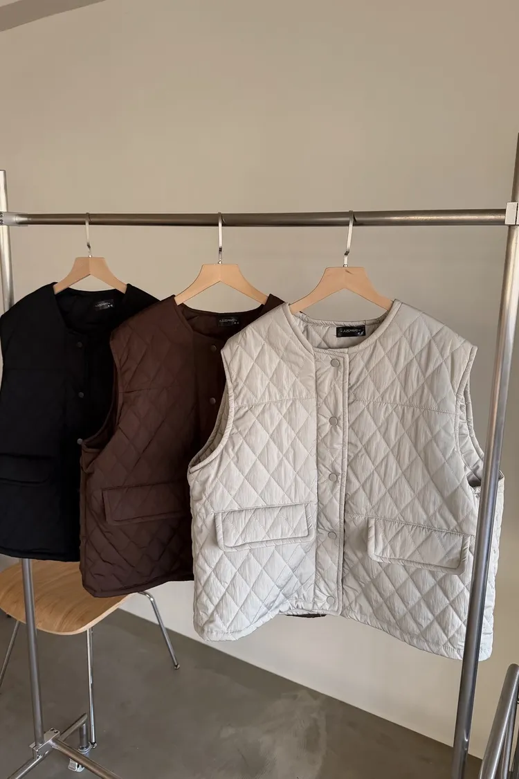 X0007菱格紋鋪棉澎澎背心(灰杏/咖啡/黑)
