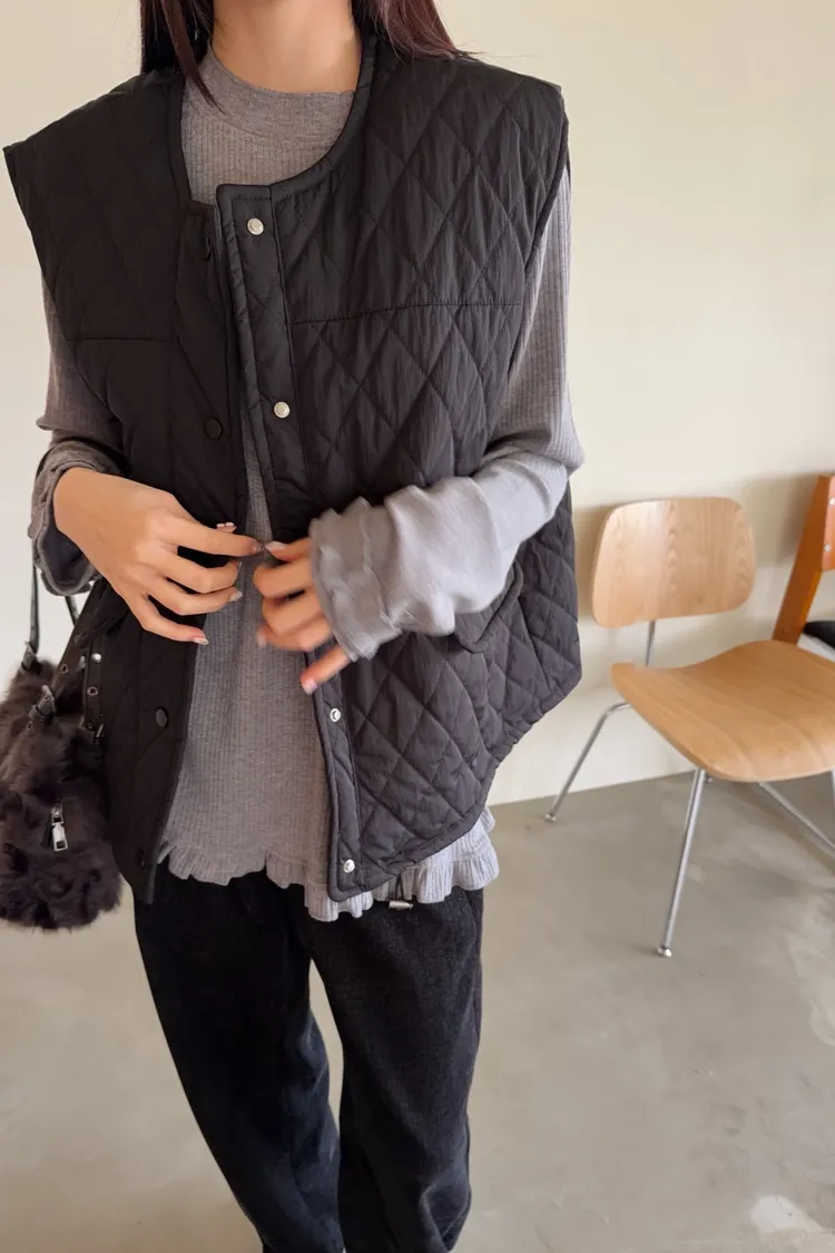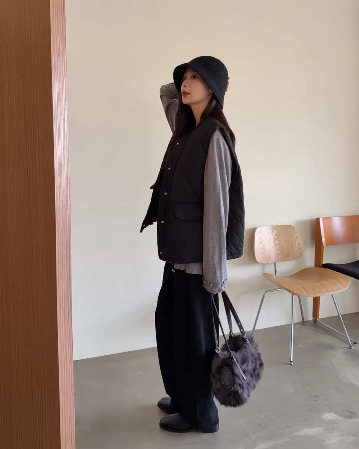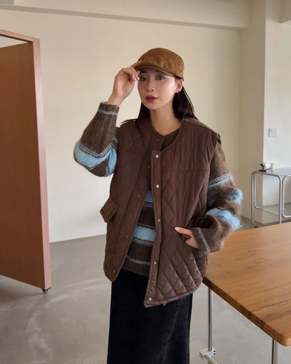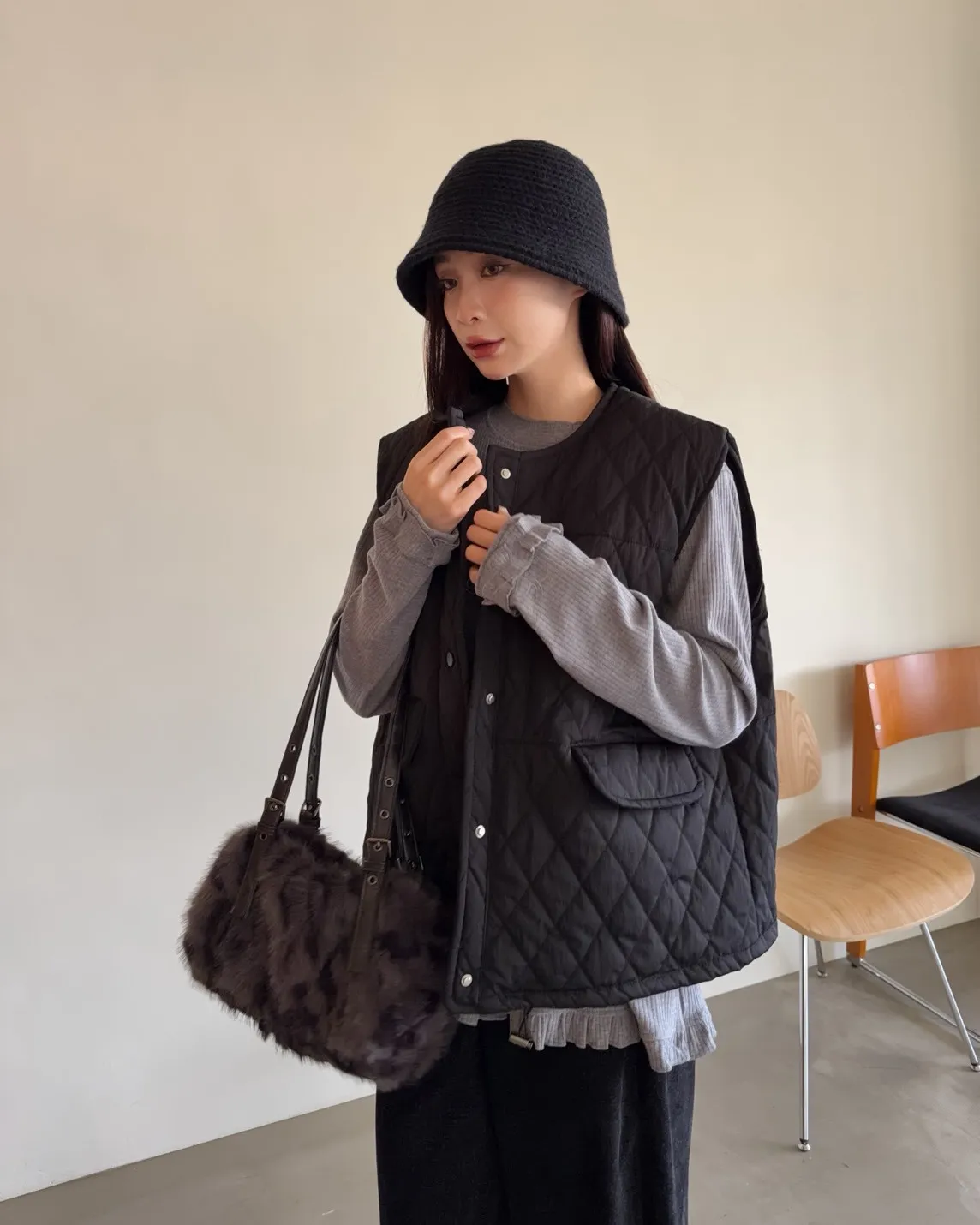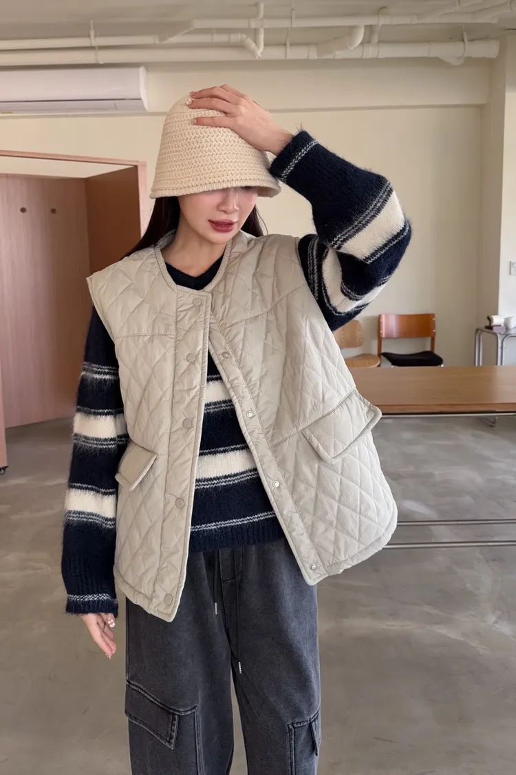 X0007菱格紋鋪棉澎澎背心(灰杏/咖啡/黑)