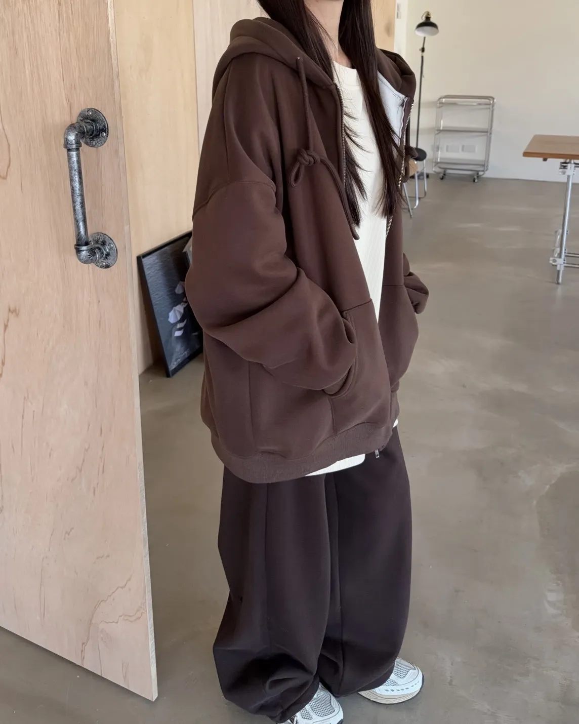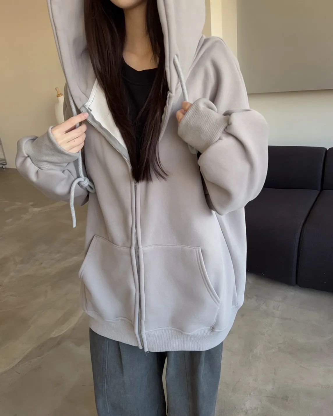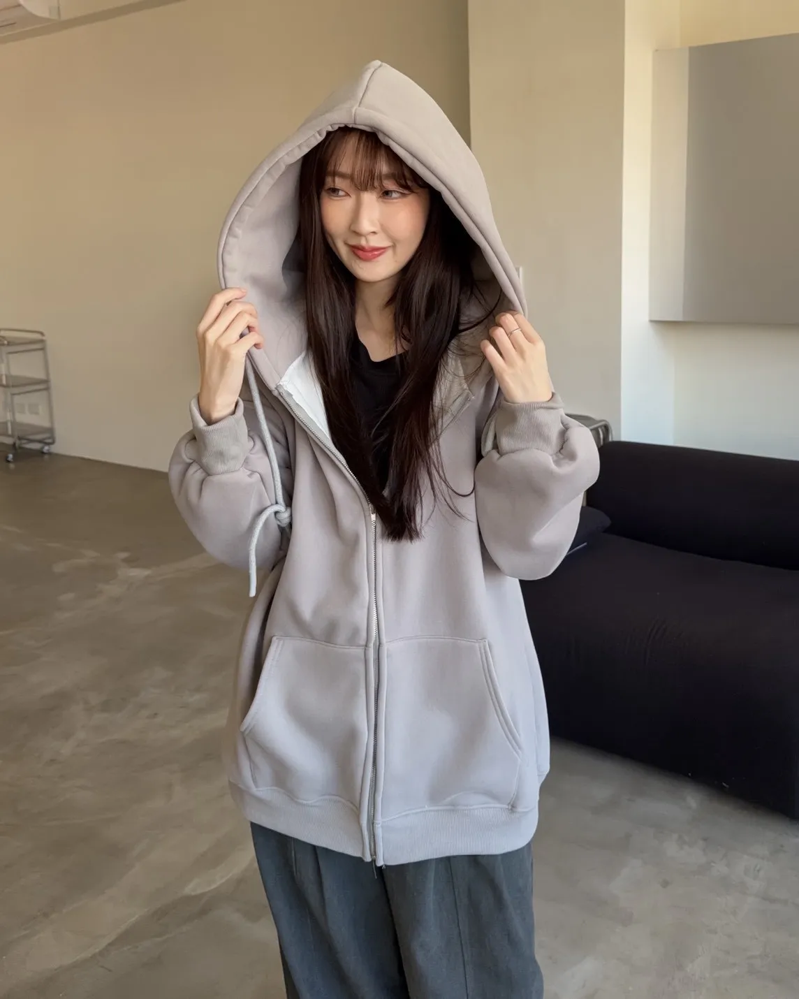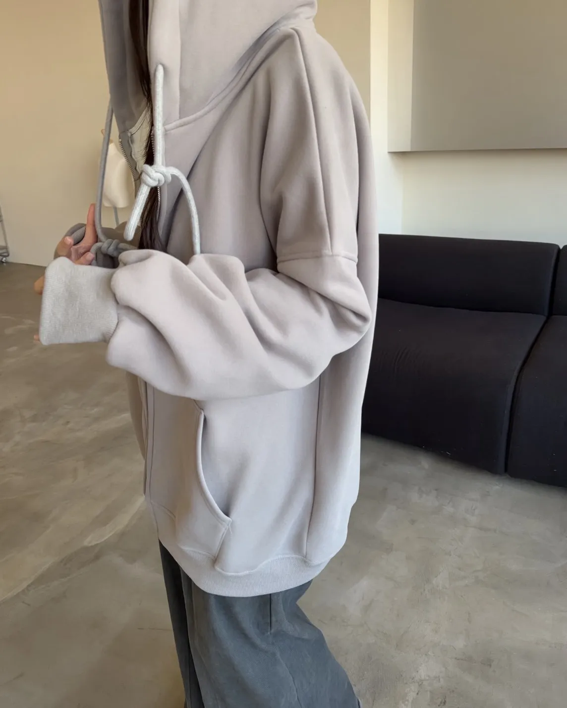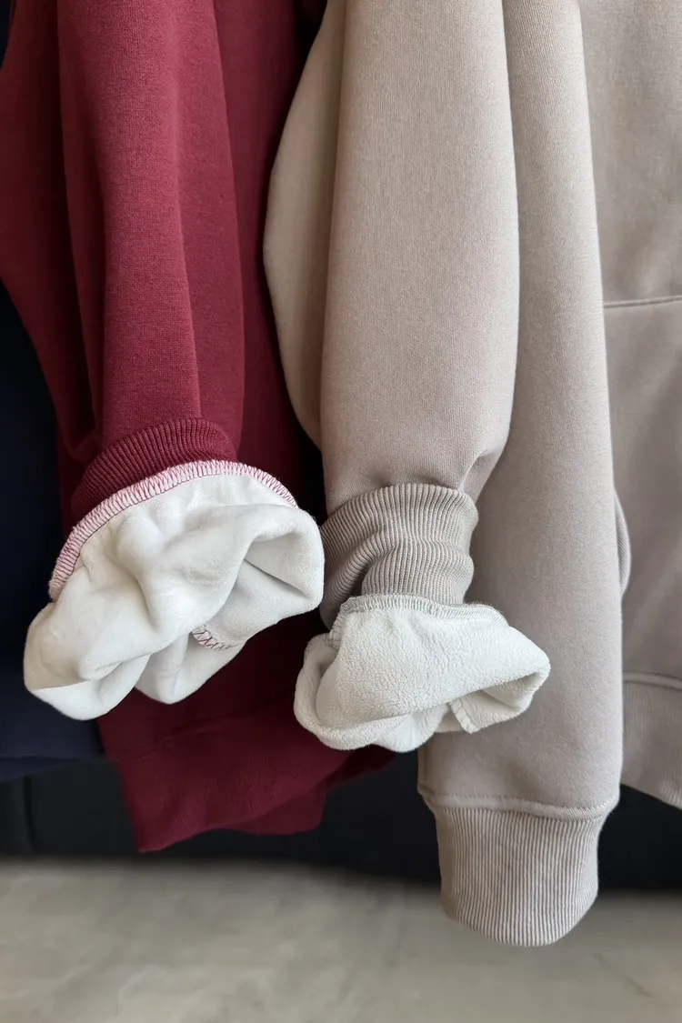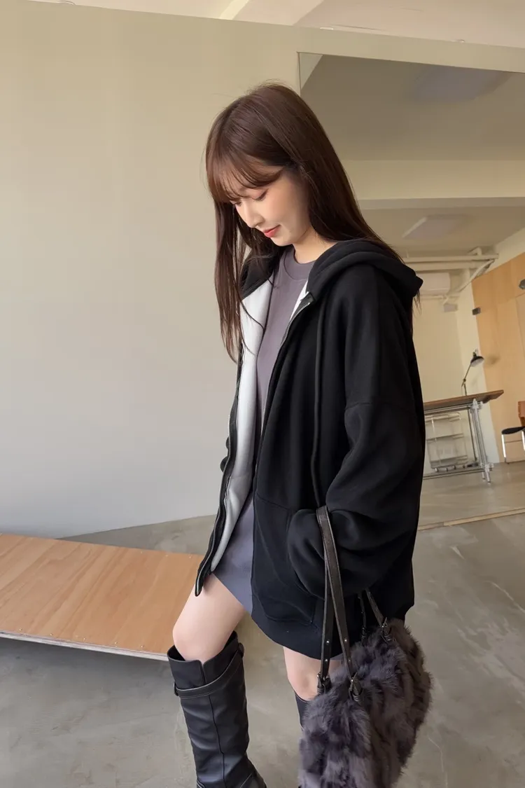 抽繩連帽 內刷絨毛 兩側口袋 寬鬆落肩