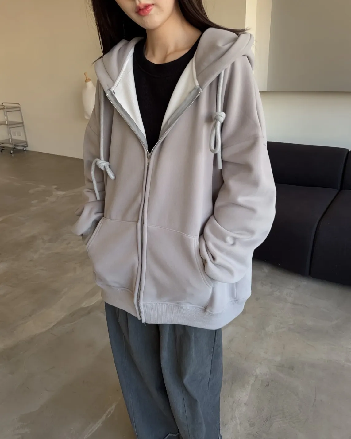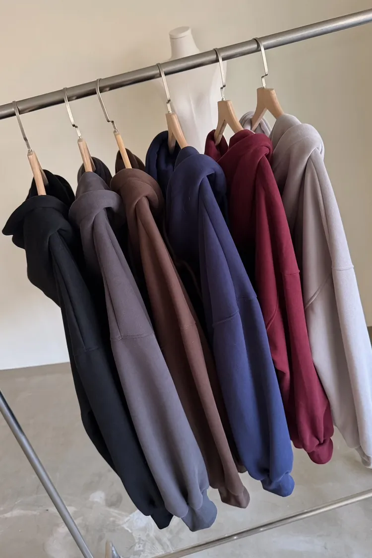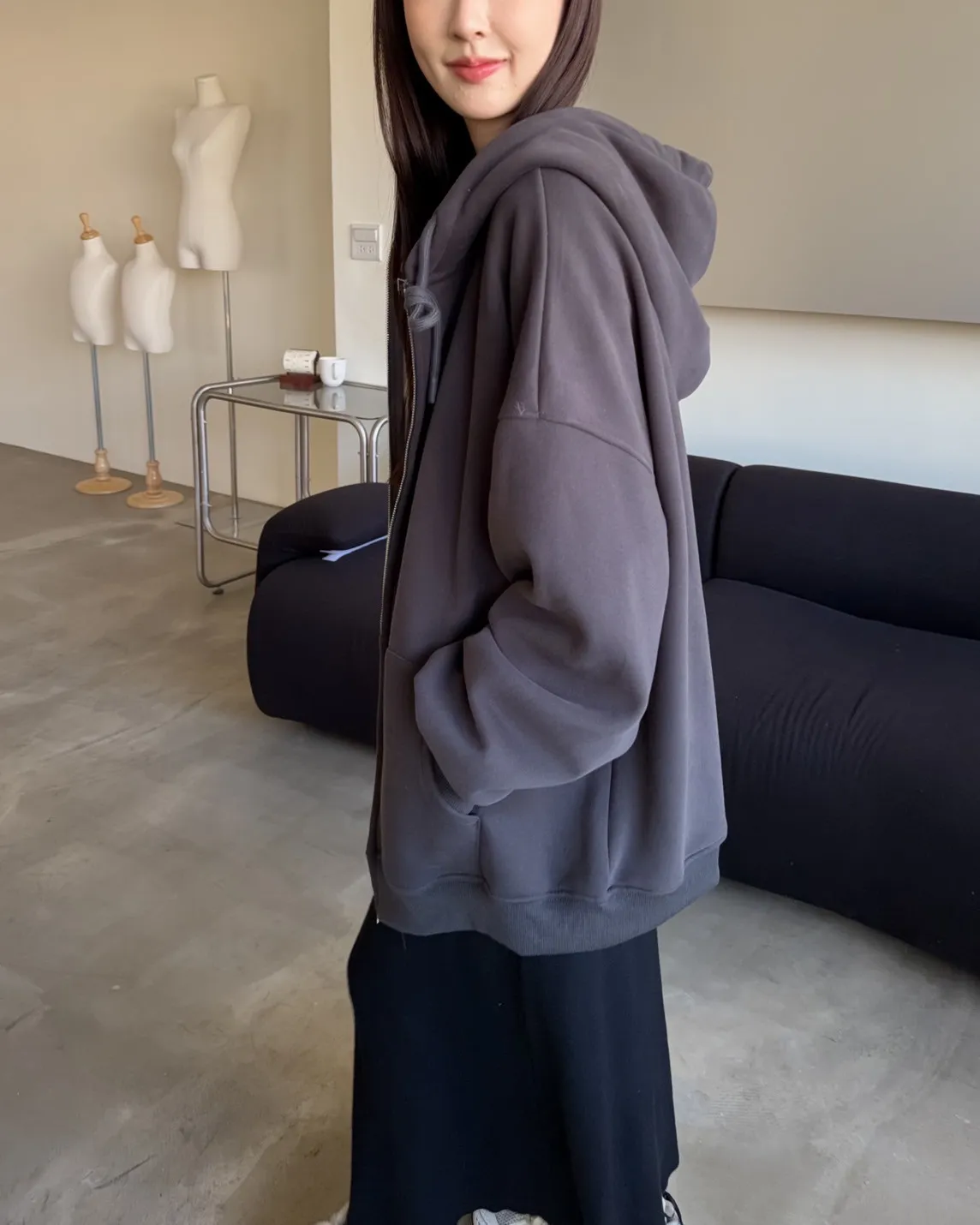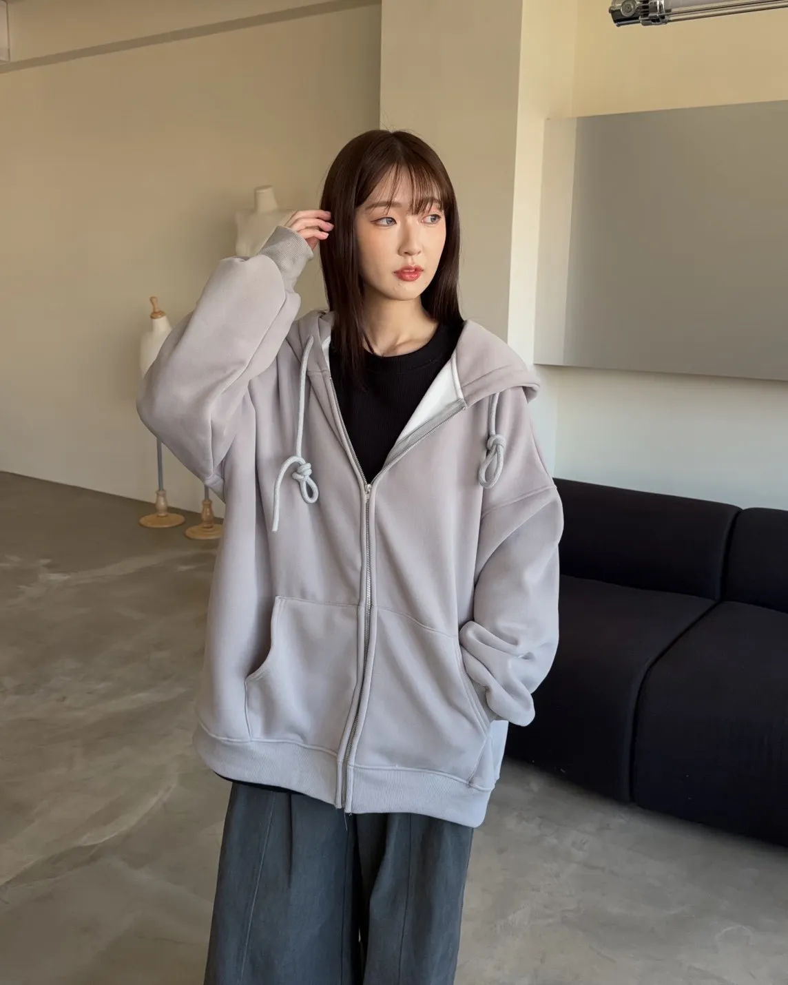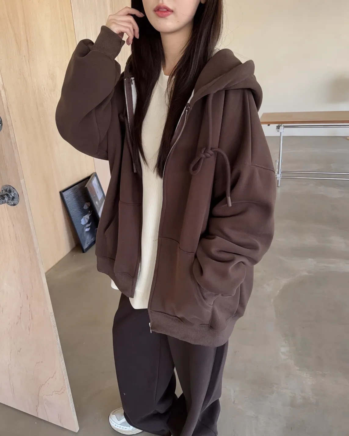 抽繩連帽 內刷絨毛 兩側口袋 寬鬆落肩