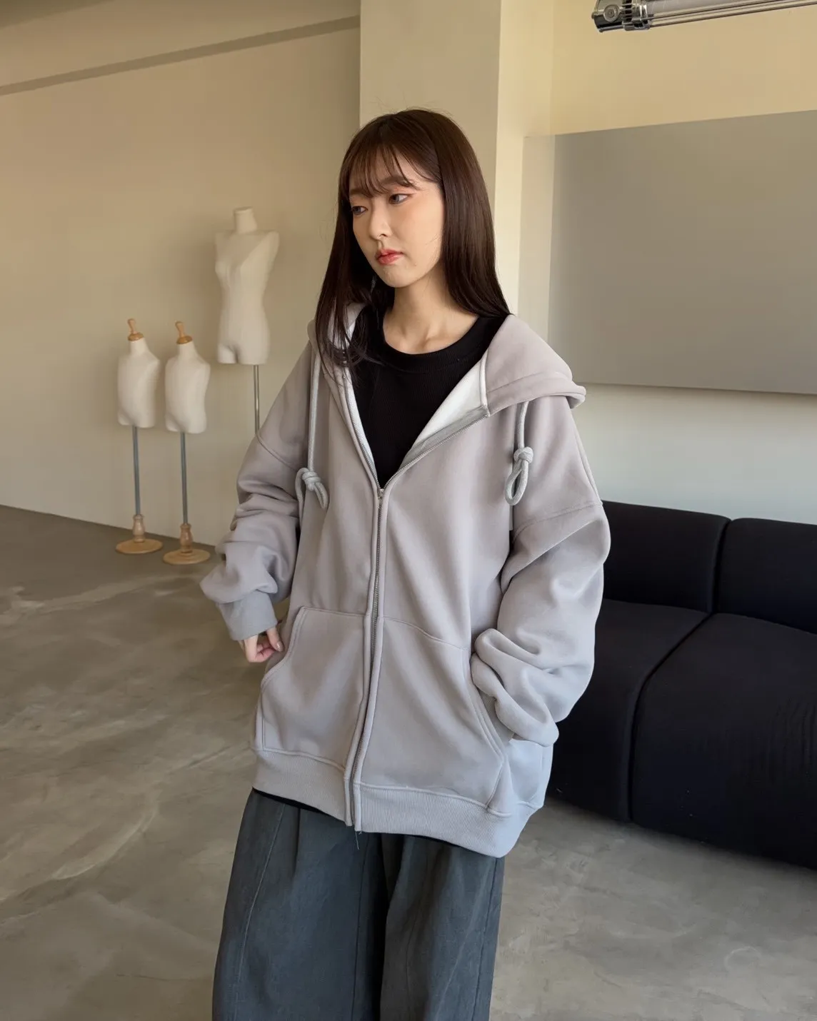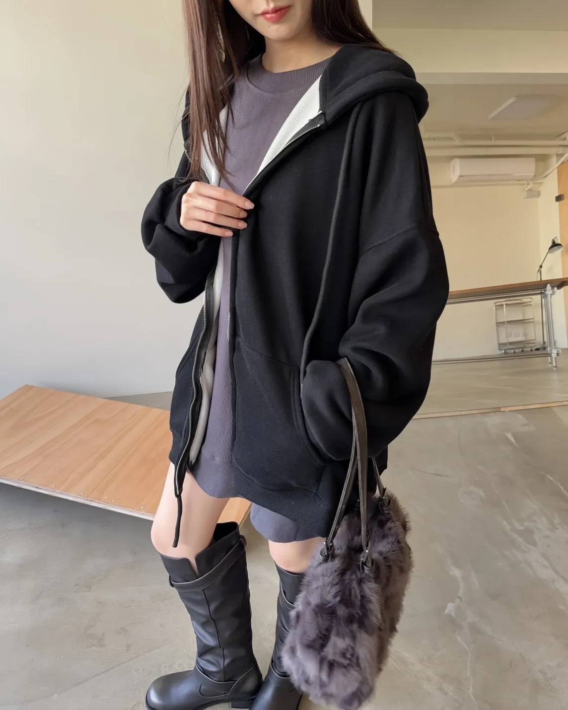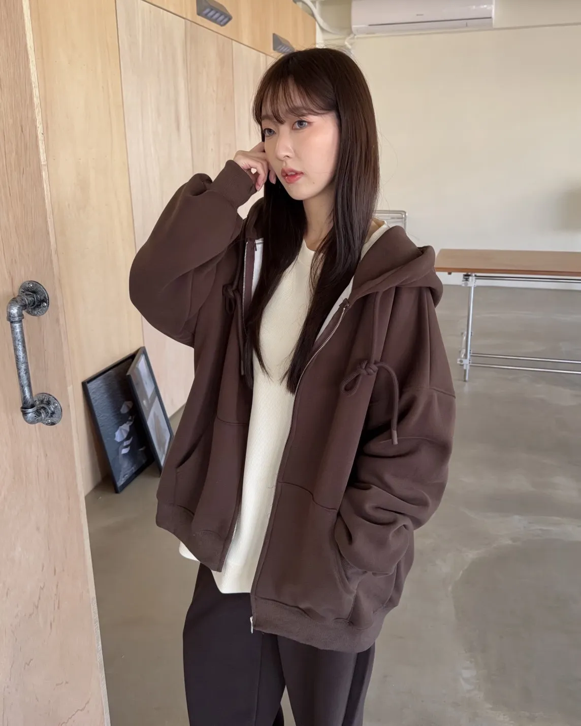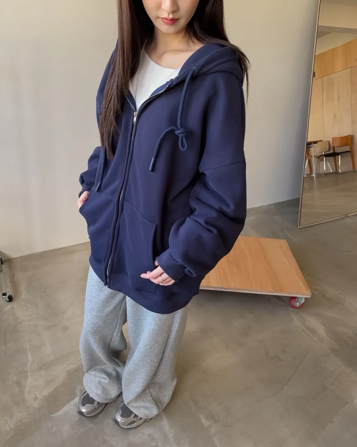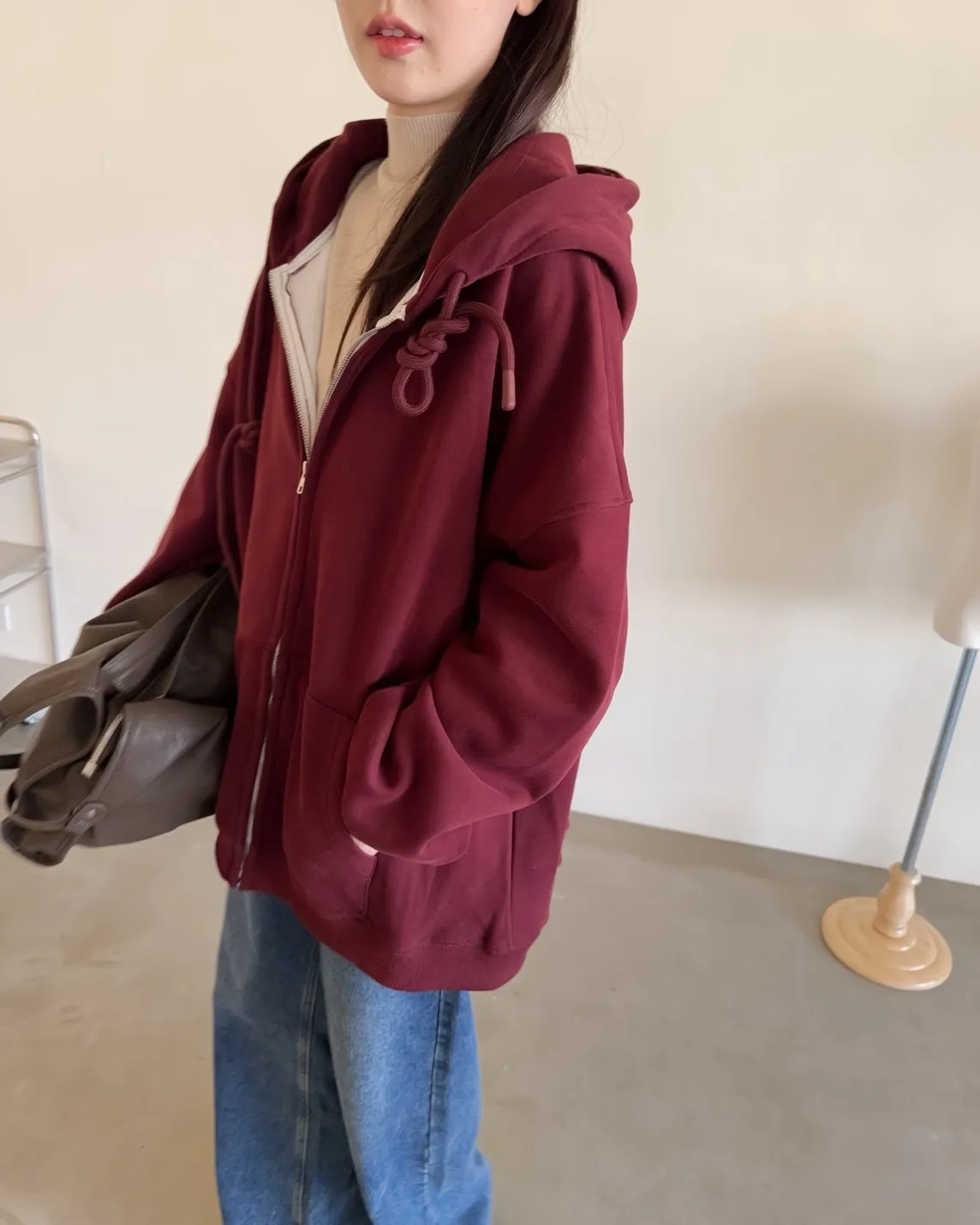 抽繩連帽 內刷絨毛 兩側口袋 寬鬆落肩