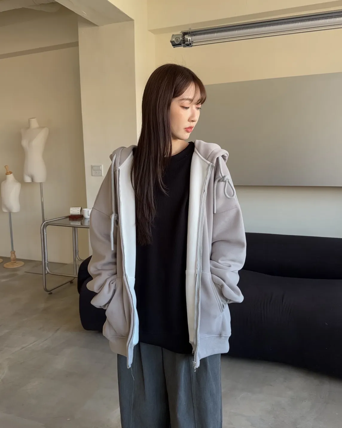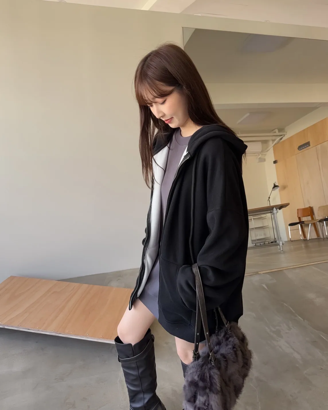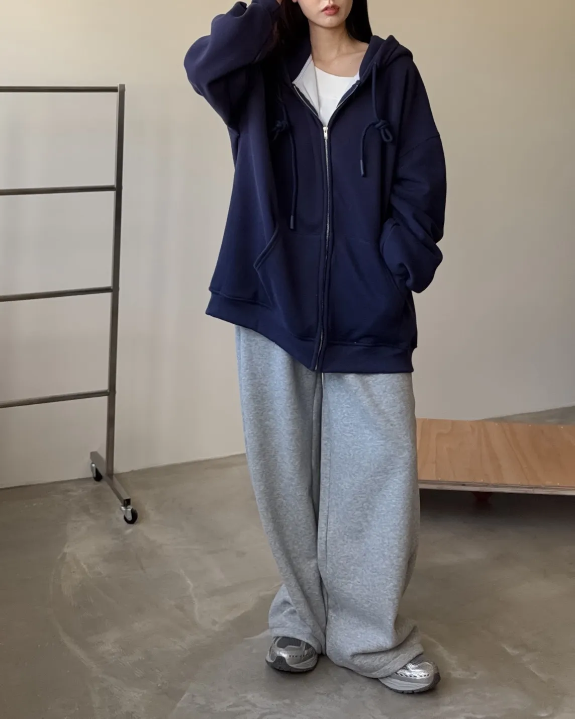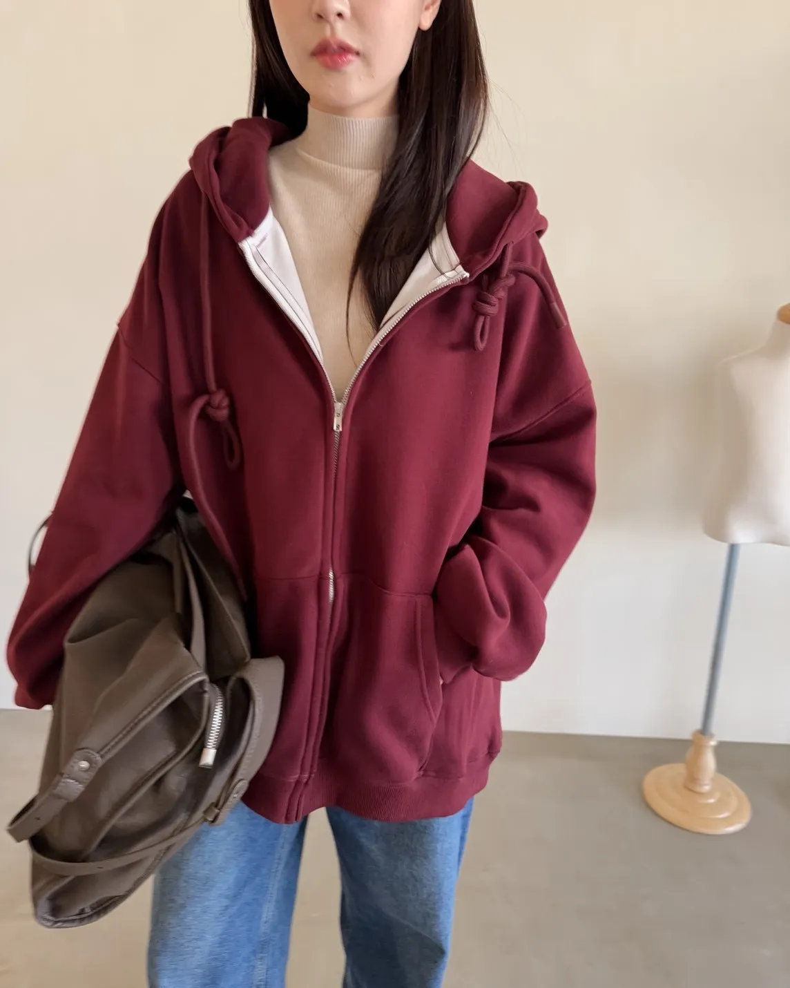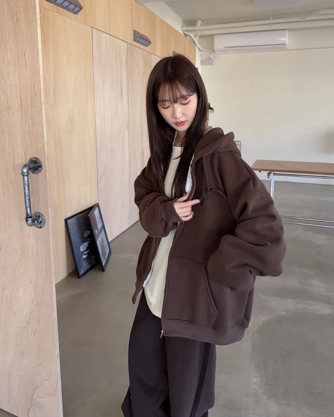 抽繩連帽 內刷絨毛 兩側口袋 寬鬆落肩