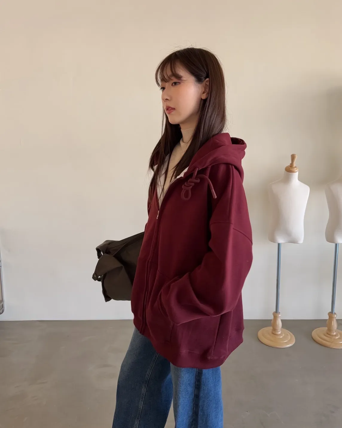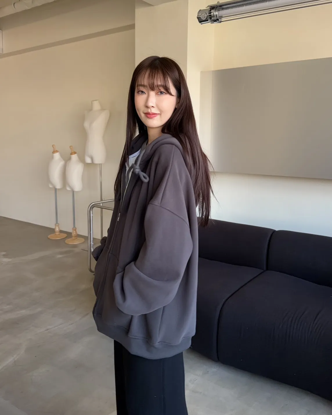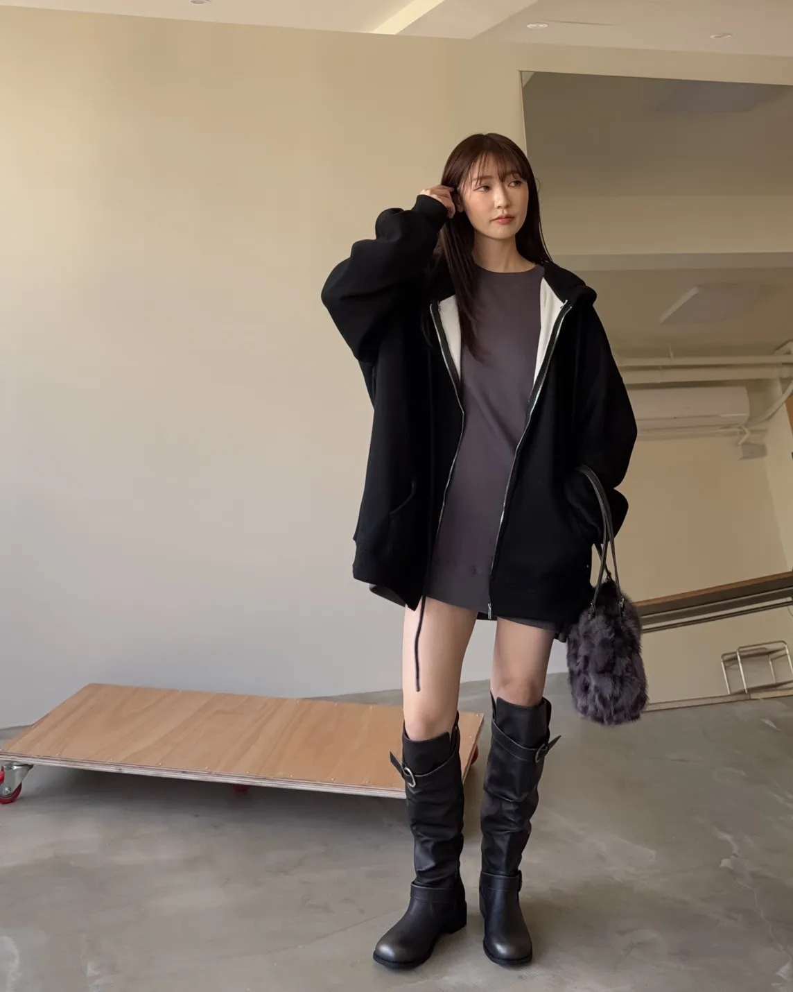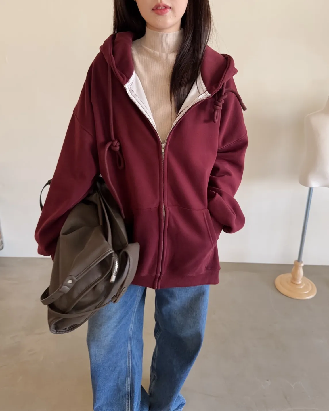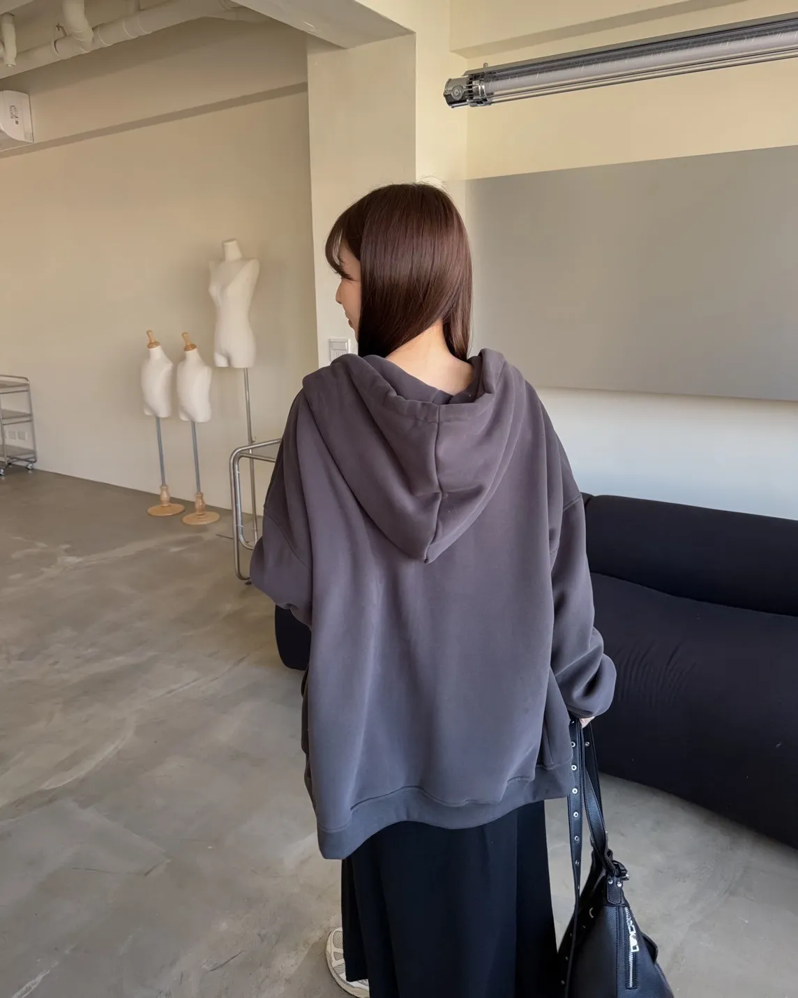 抽繩連帽 內刷絨毛 兩側口袋 寬鬆落肩