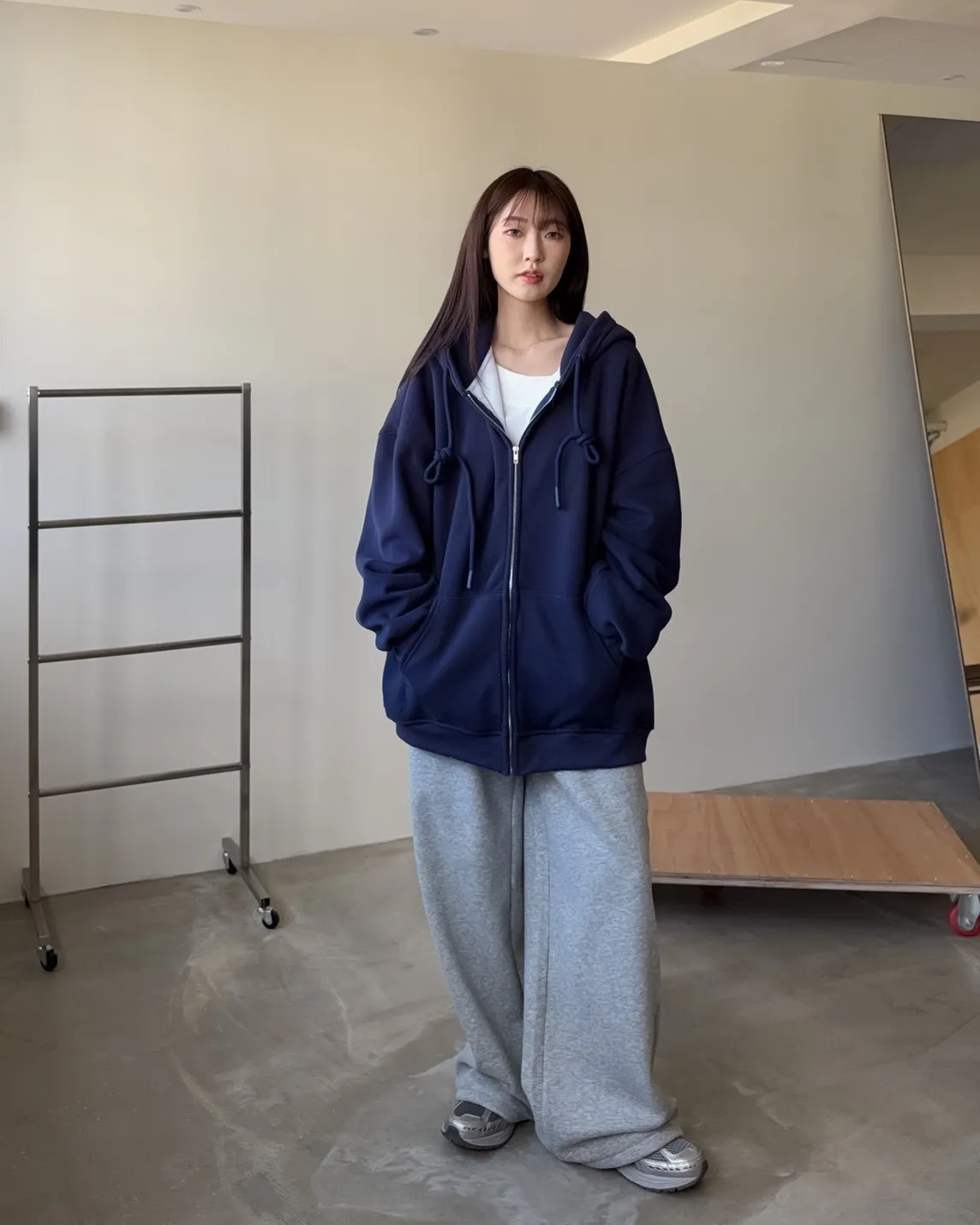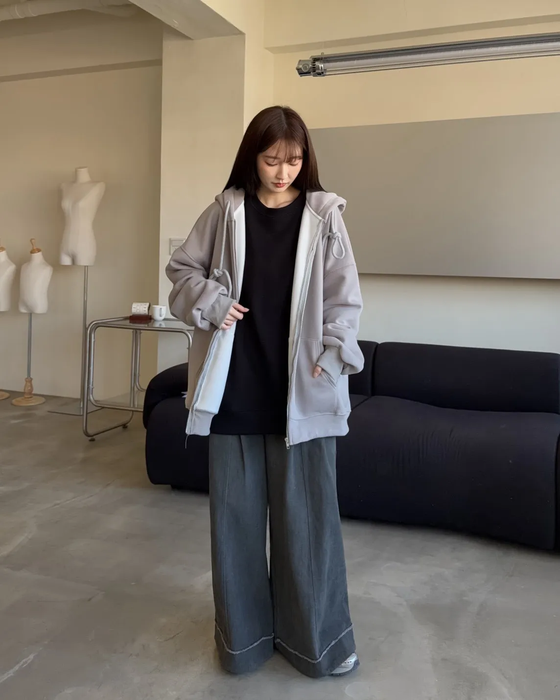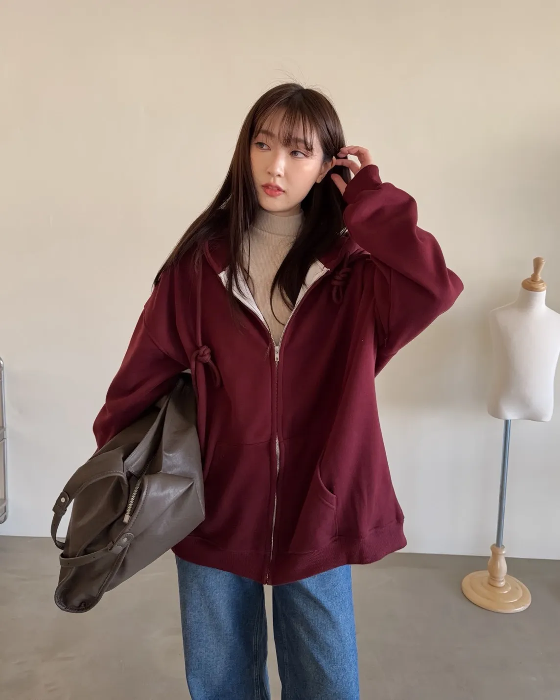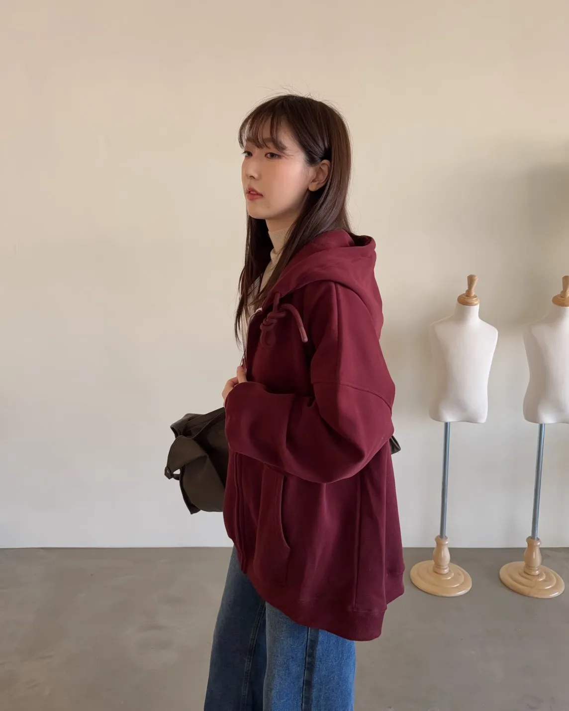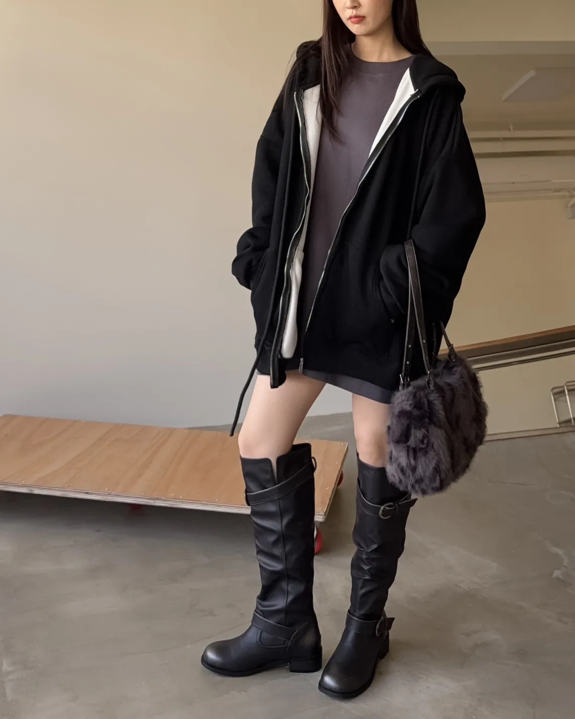 抽繩連帽 內刷絨毛 兩側口袋 寬鬆落肩