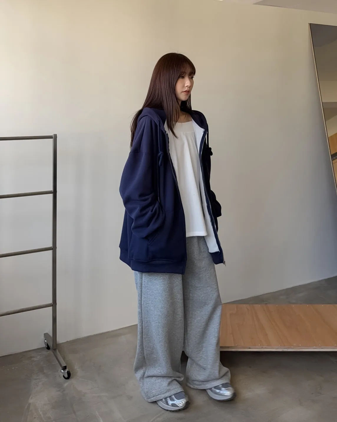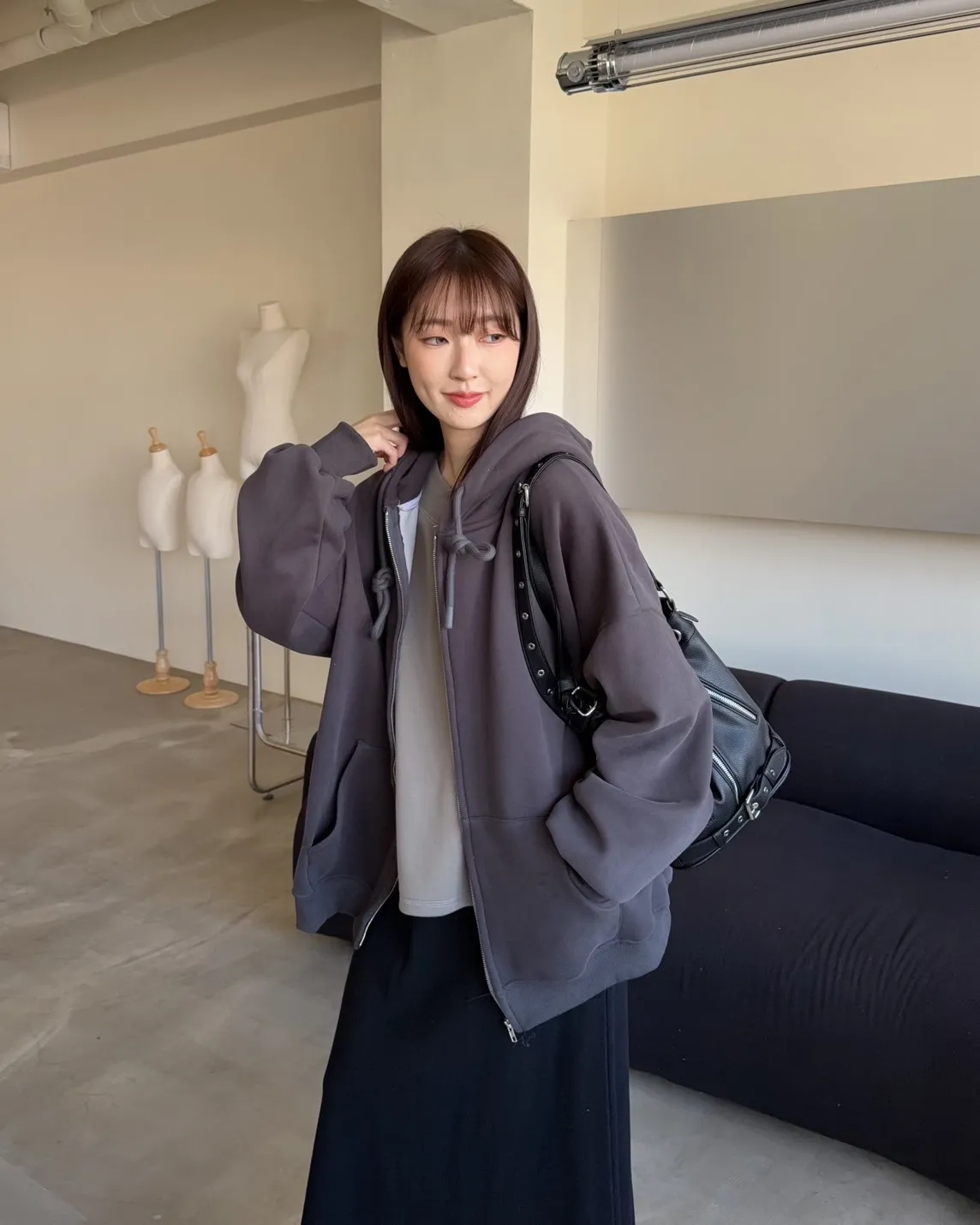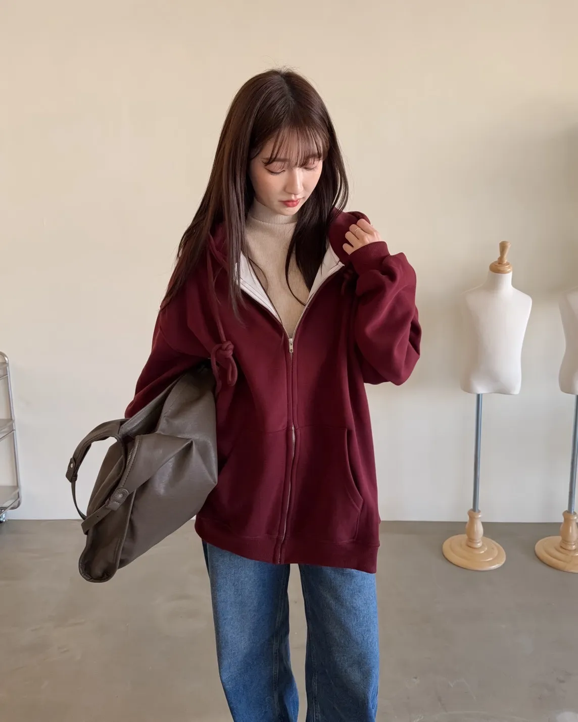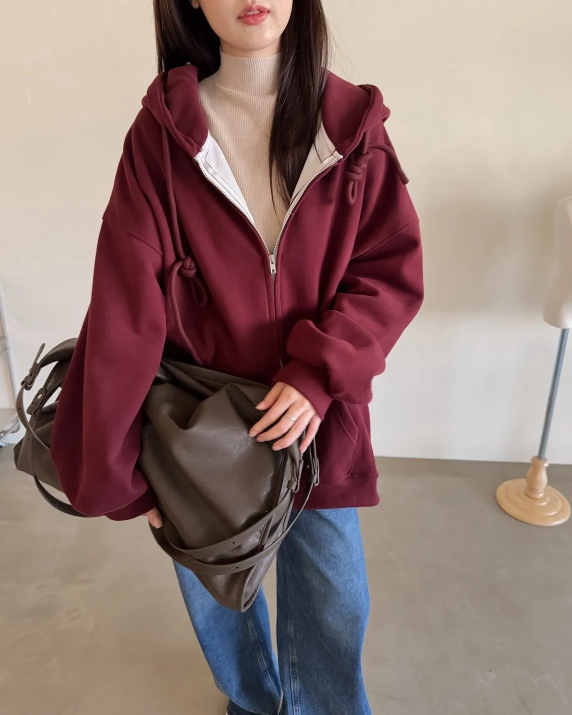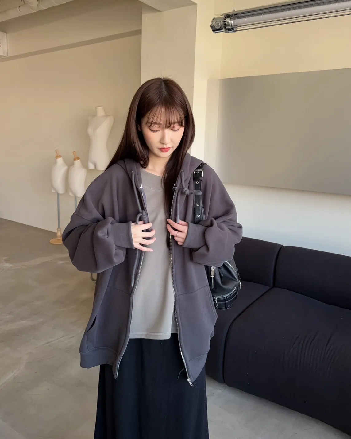 抽繩連帽 內刷絨毛 兩側口袋 寬鬆落肩