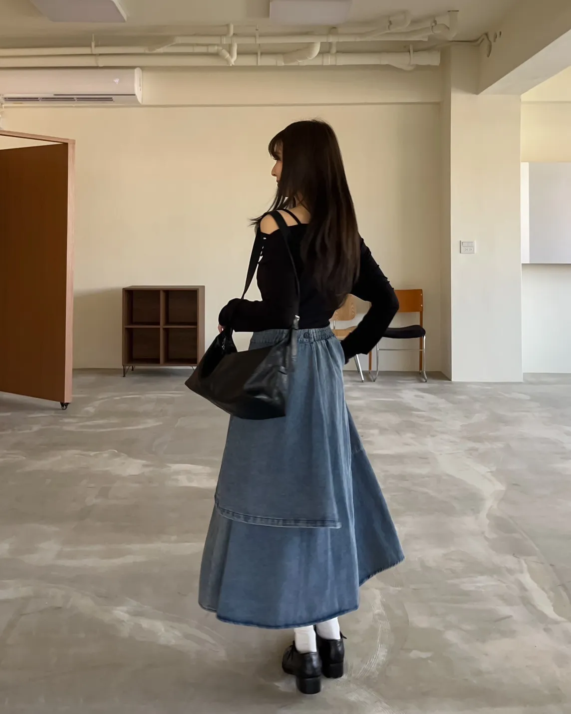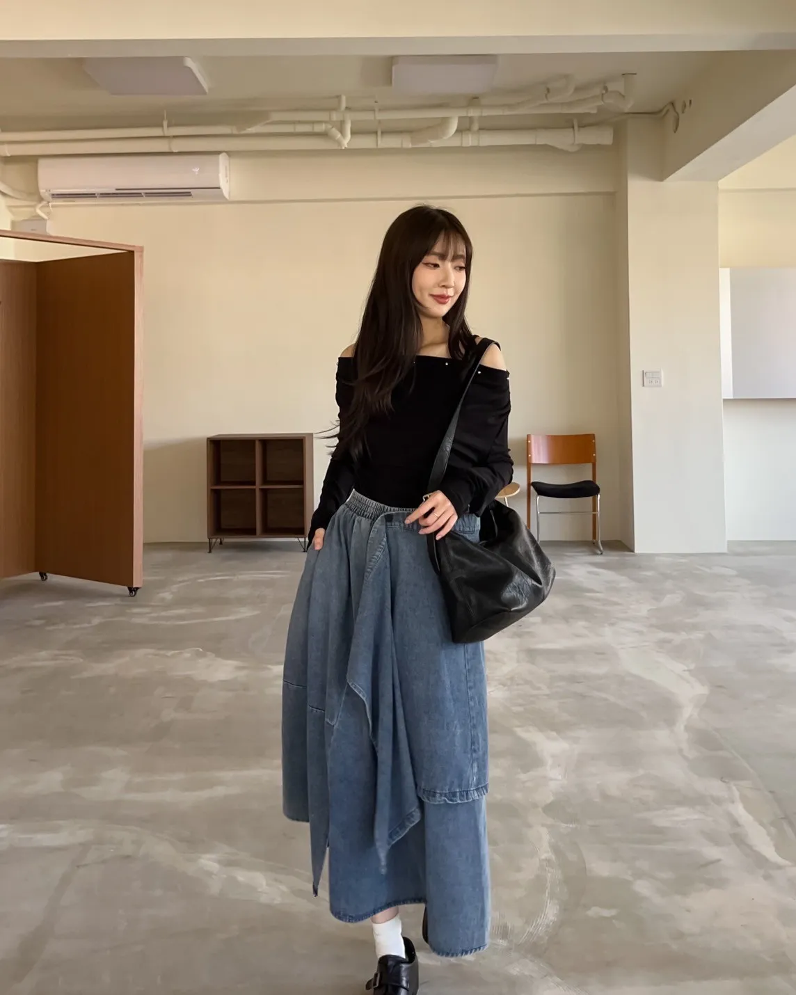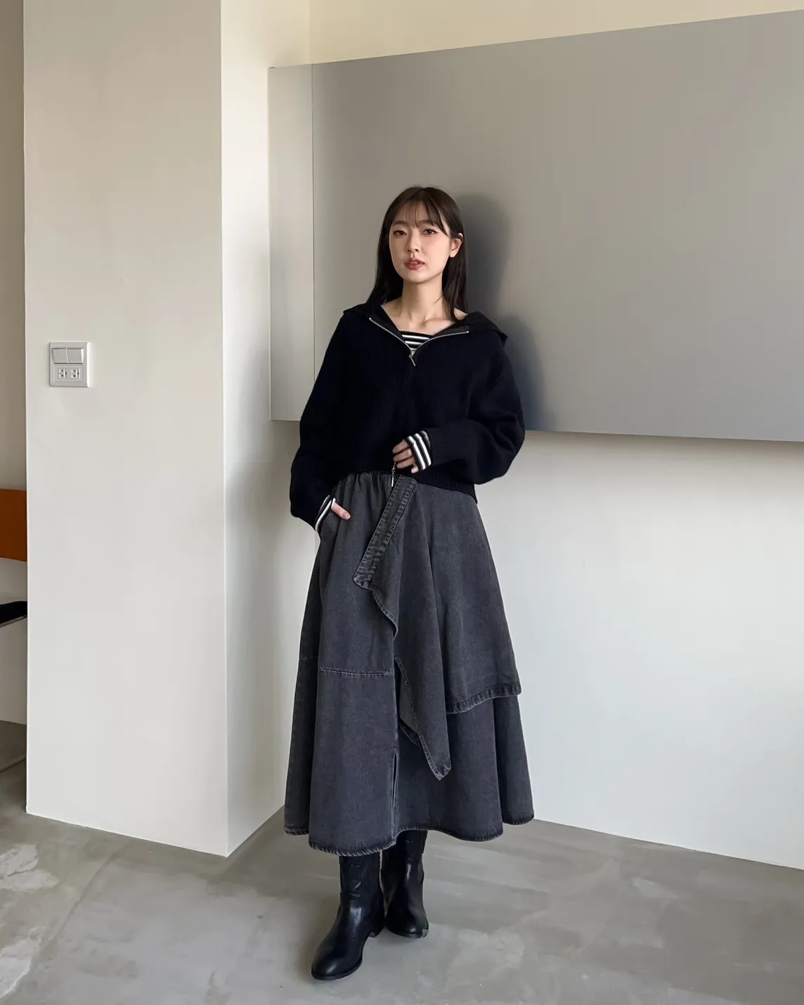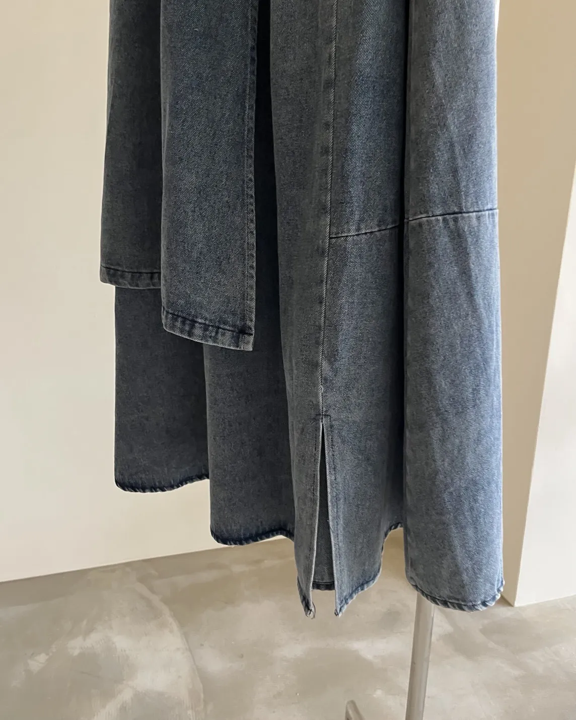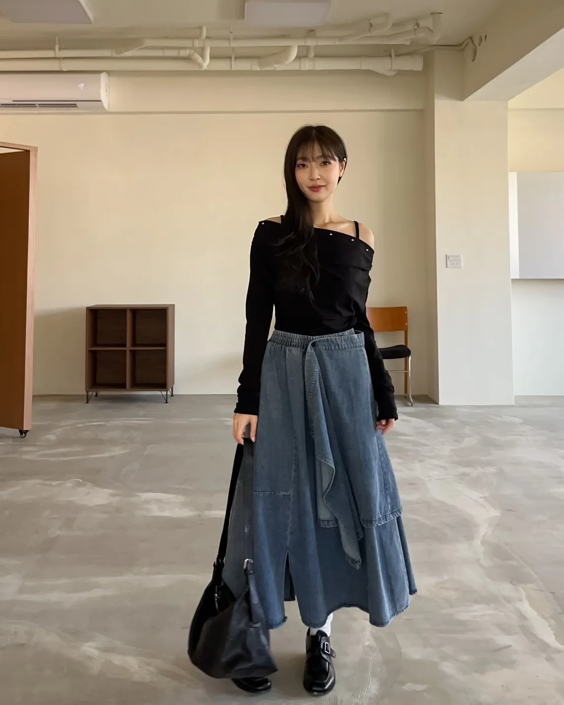 V0075設計感可拆片裙+寬牛仔半裙(藍/黑灰)