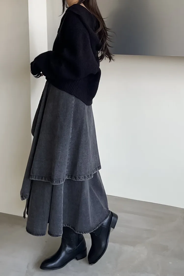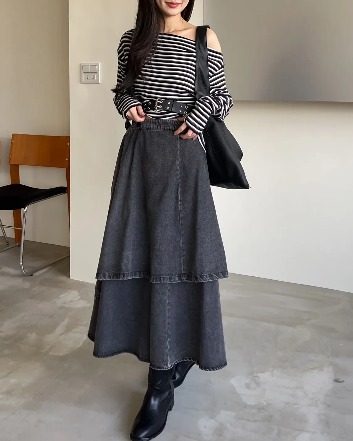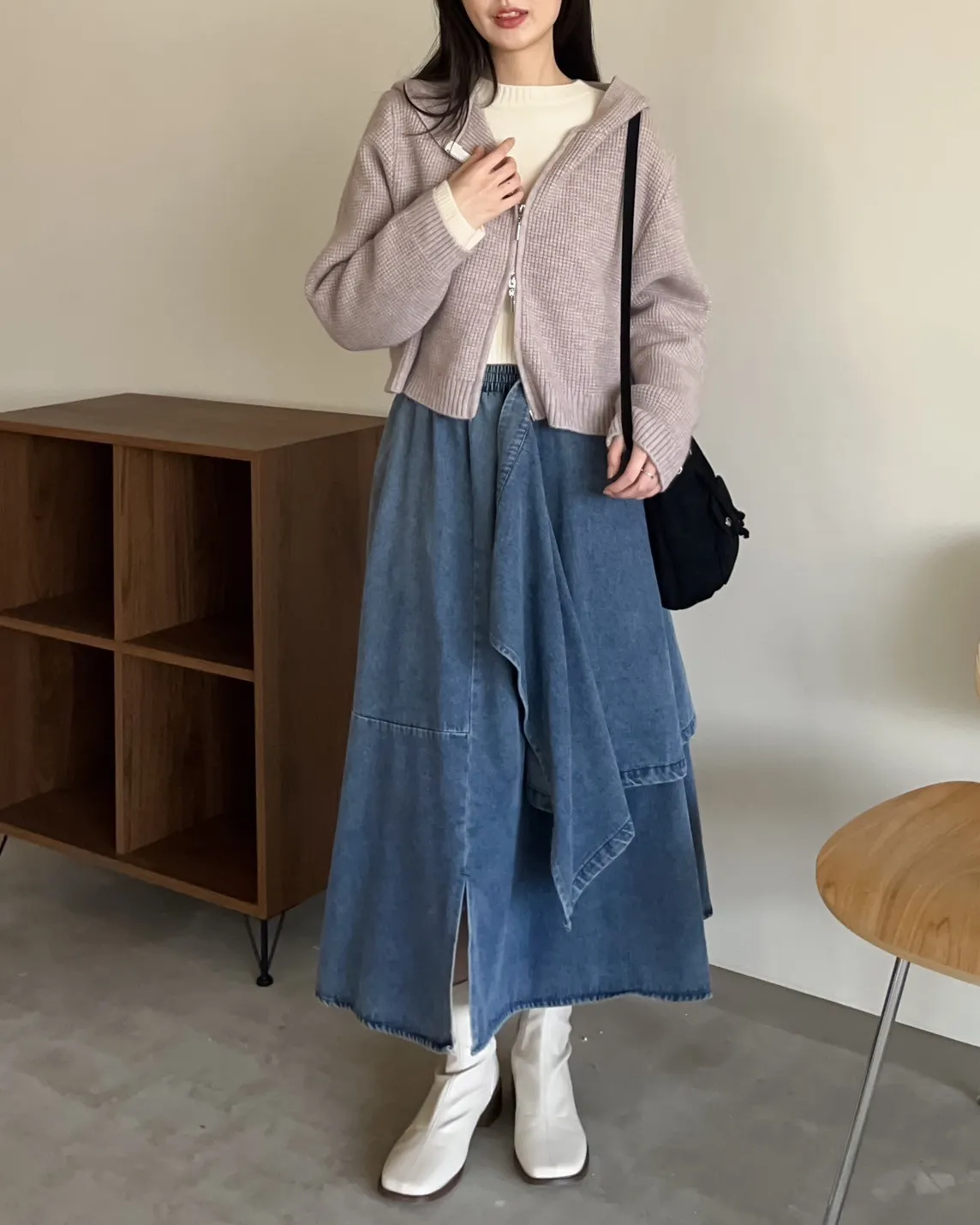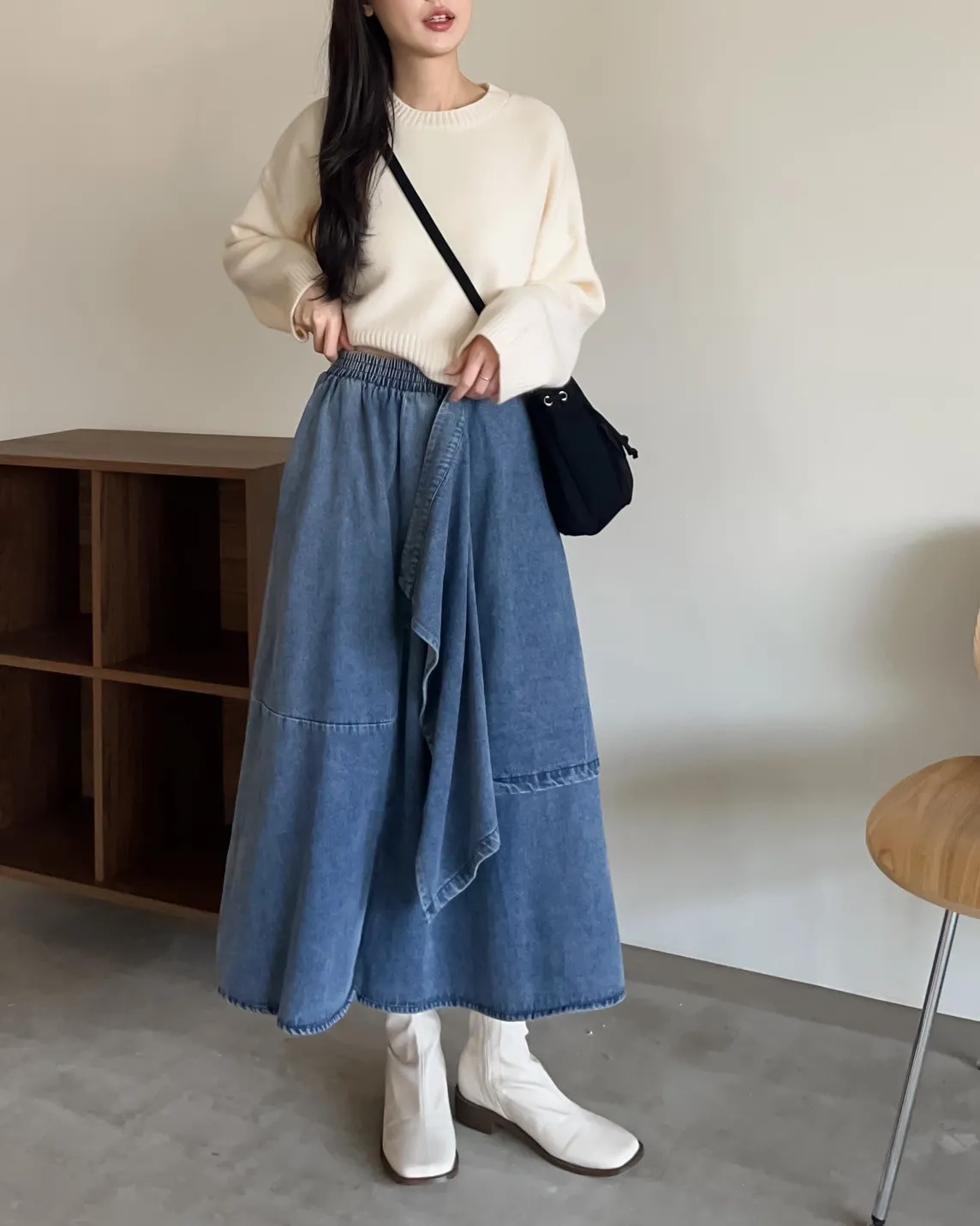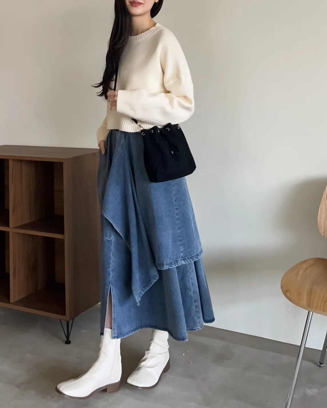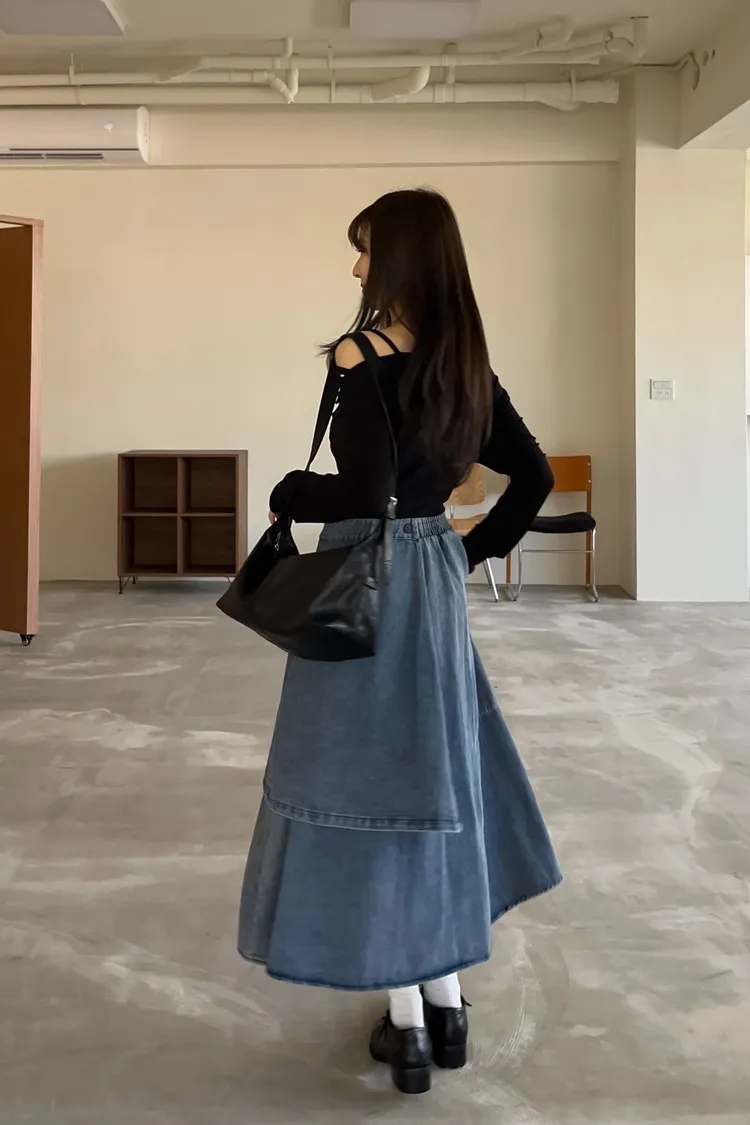 V0075設計感可拆片裙+寬牛仔半裙(藍/黑灰)