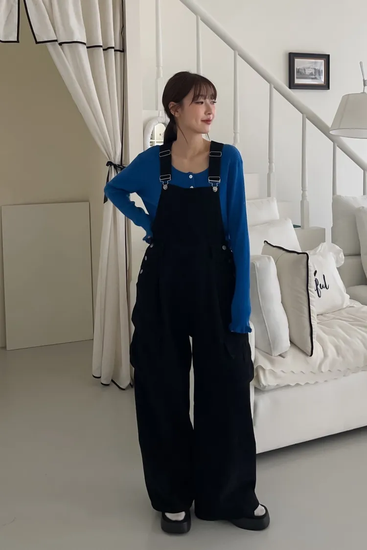 吊帶可調整長度(背後固定不可拆) 兩側口袋 兩邊翻蓋口袋 微繭型版型 褲管壓折
