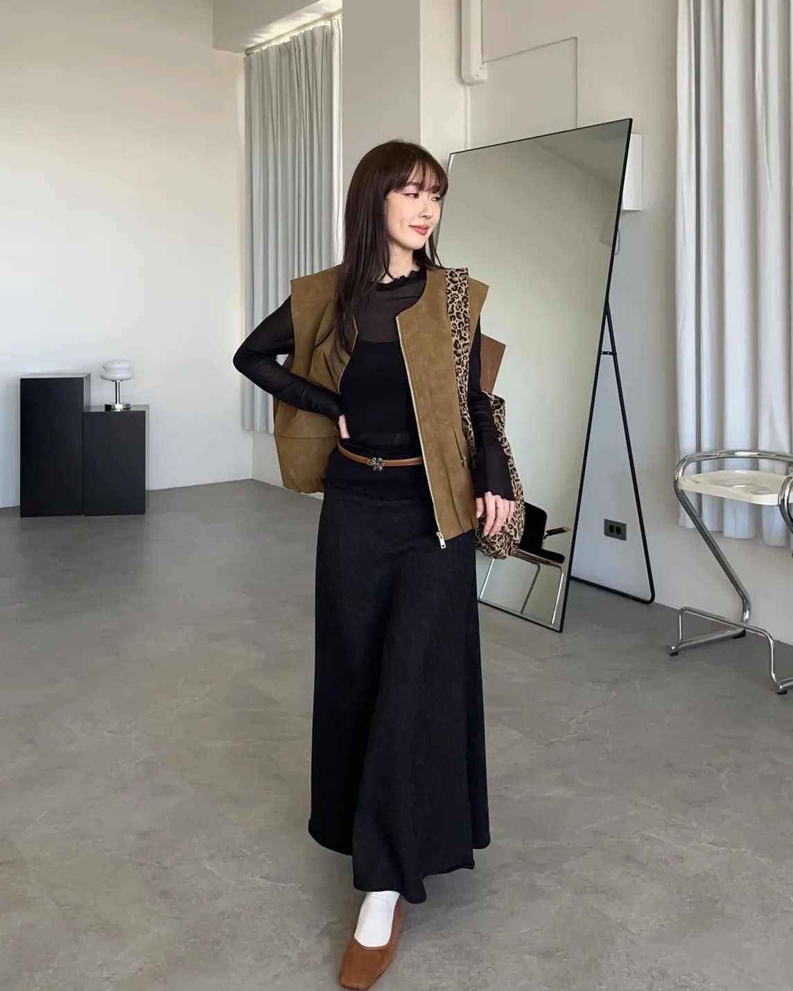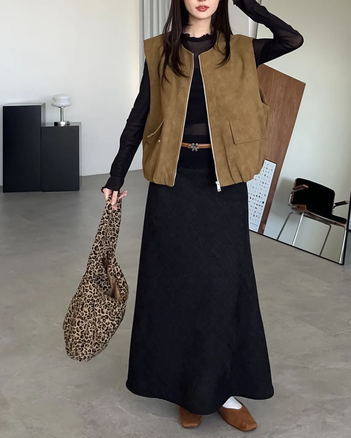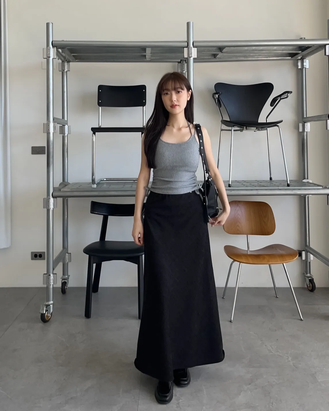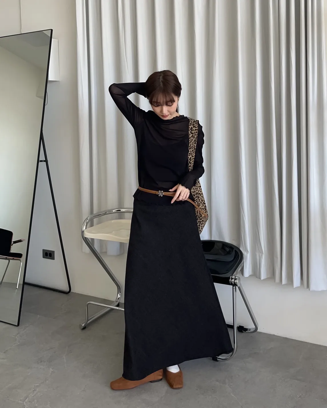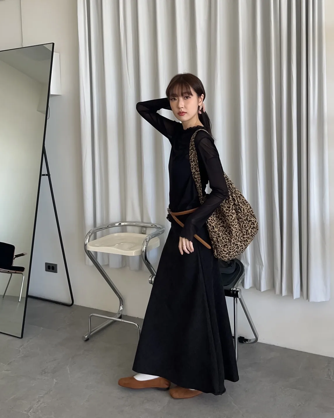 U0064小鐵標刷色磨毛寬魚尾裙(深藍/黑)