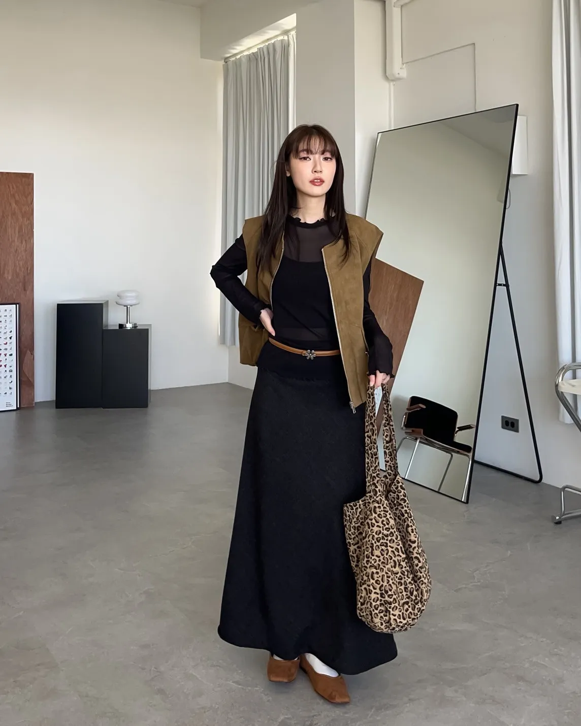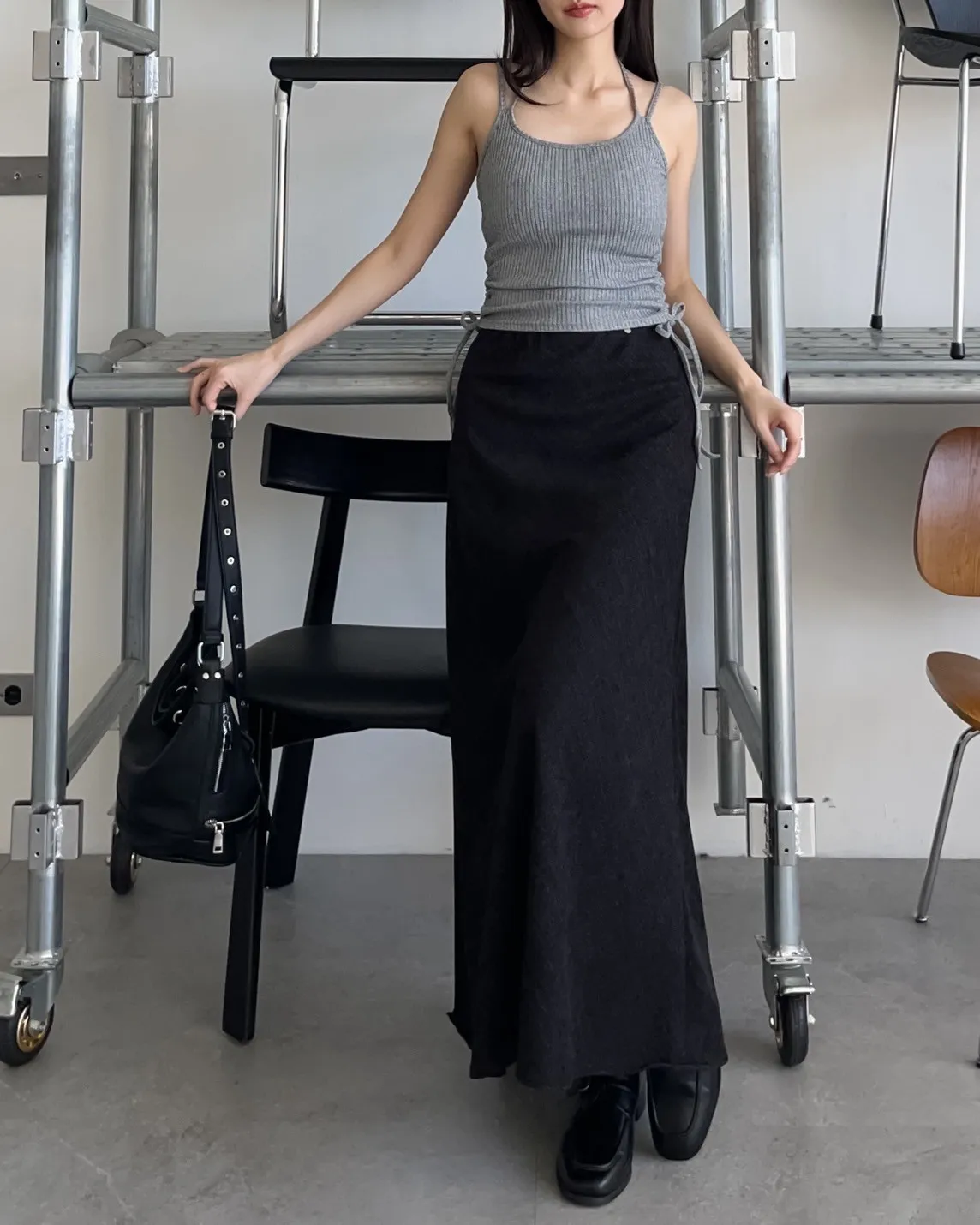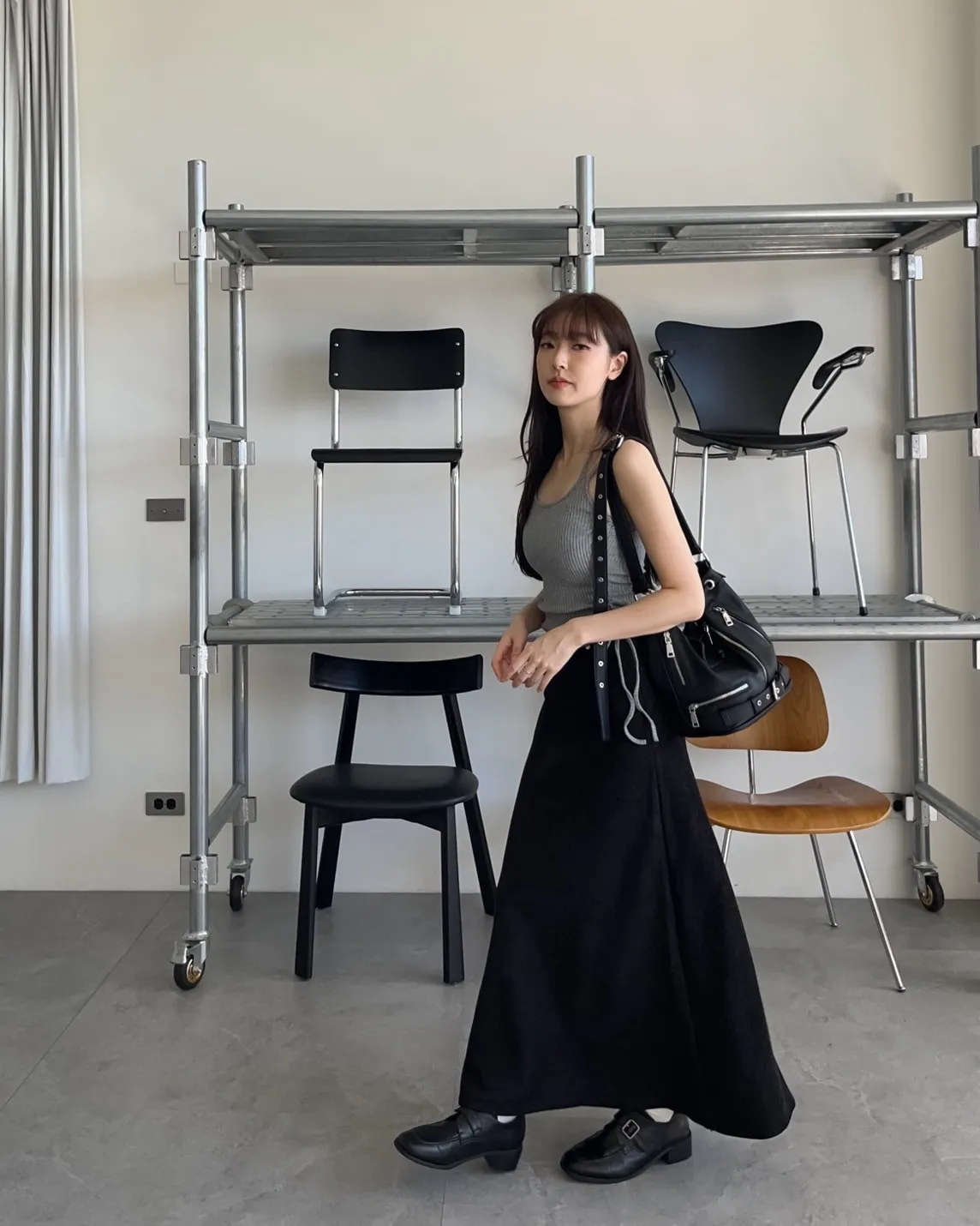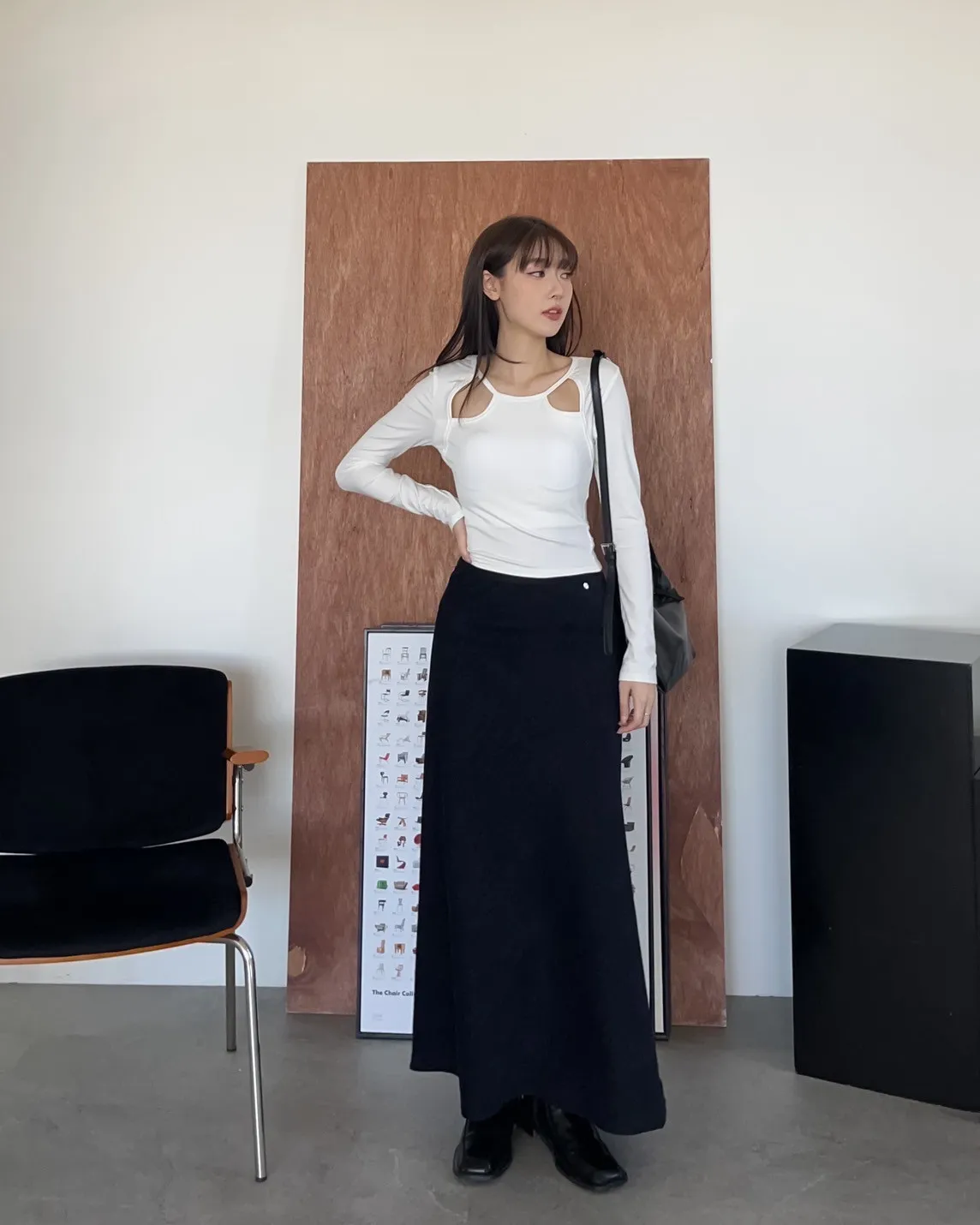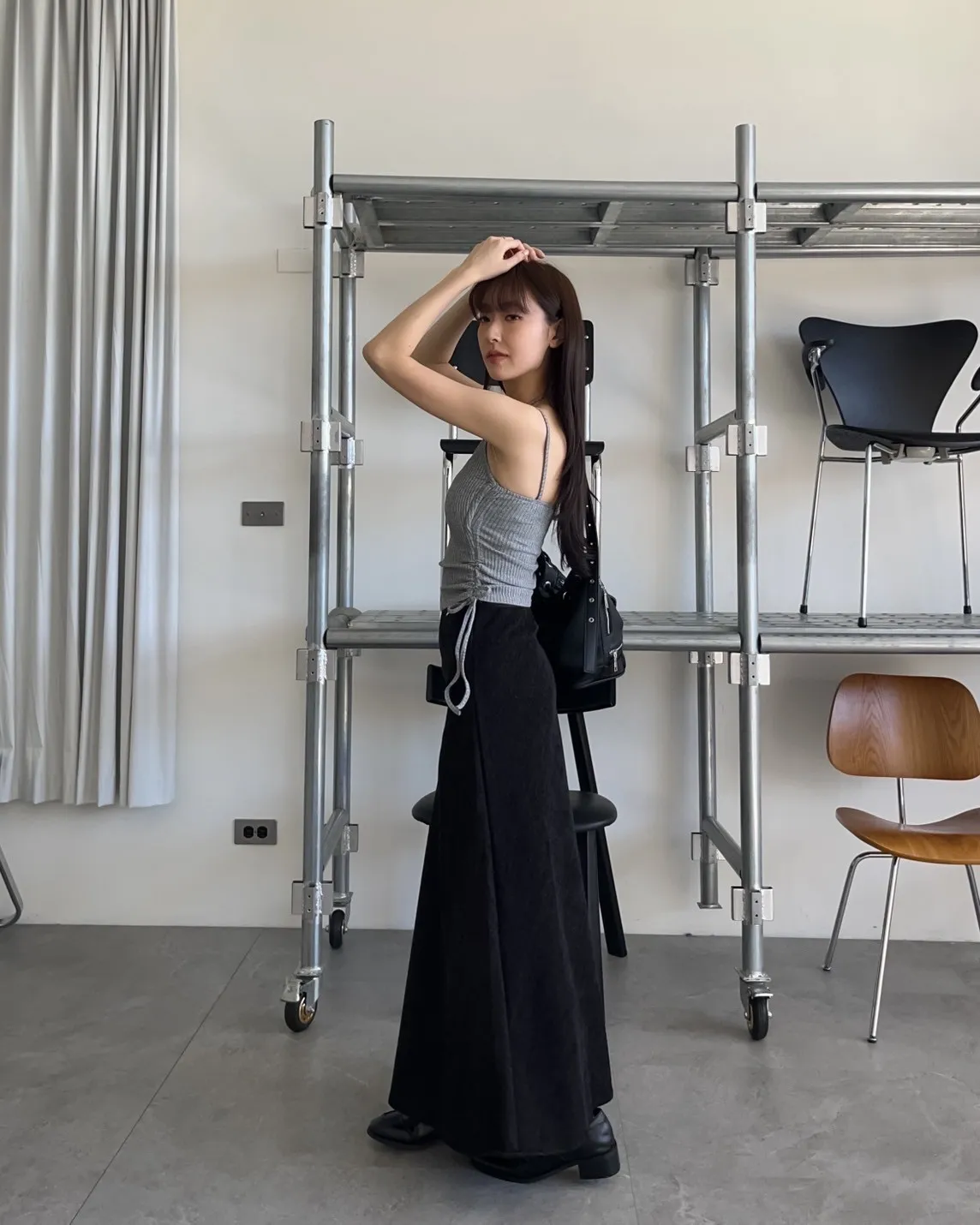 U0064小鐵標刷色磨毛寬魚尾裙(深藍/黑)
