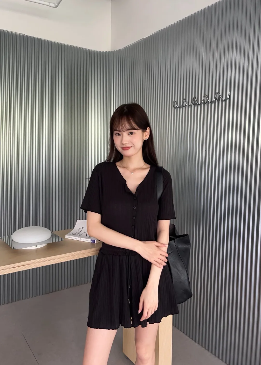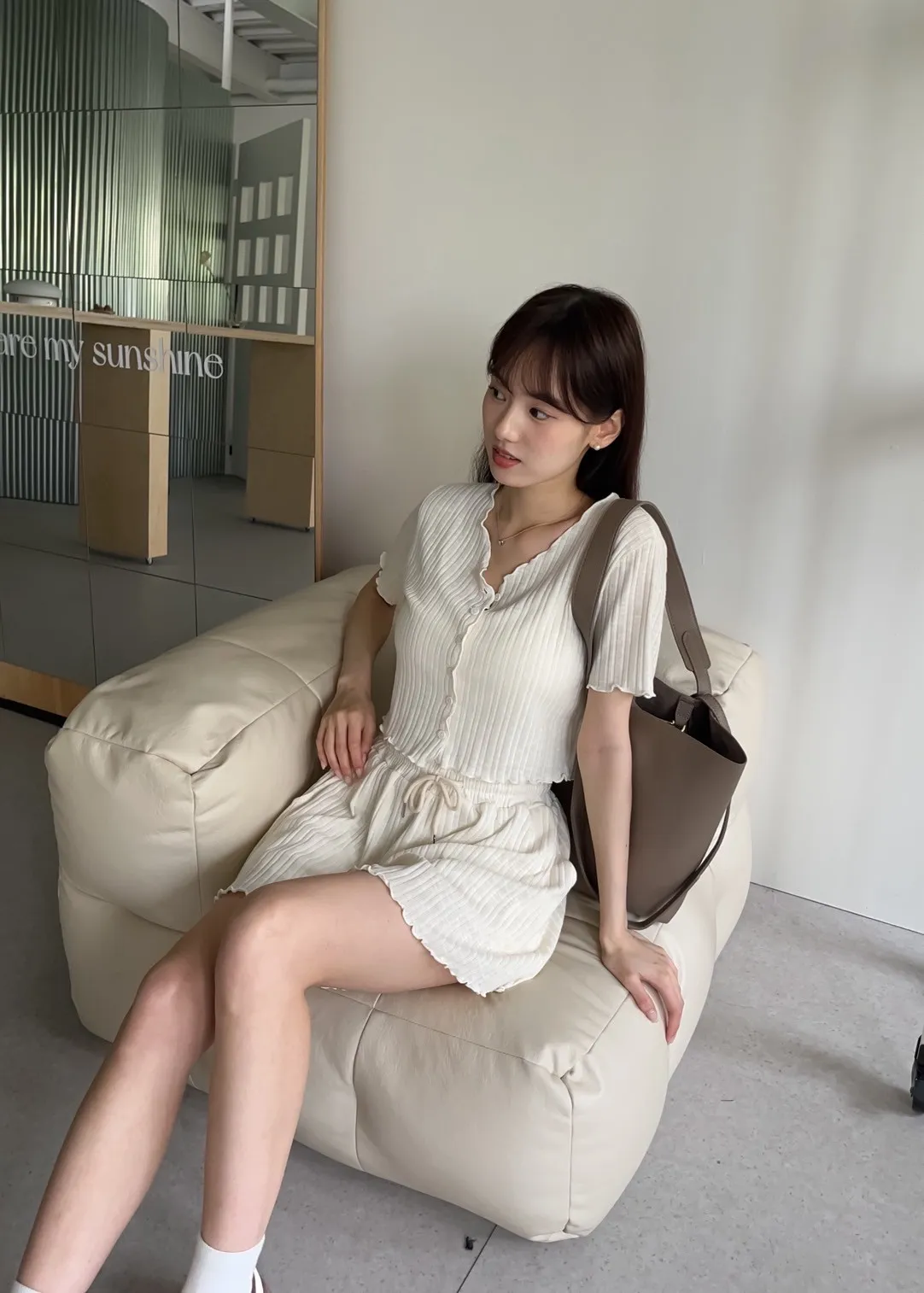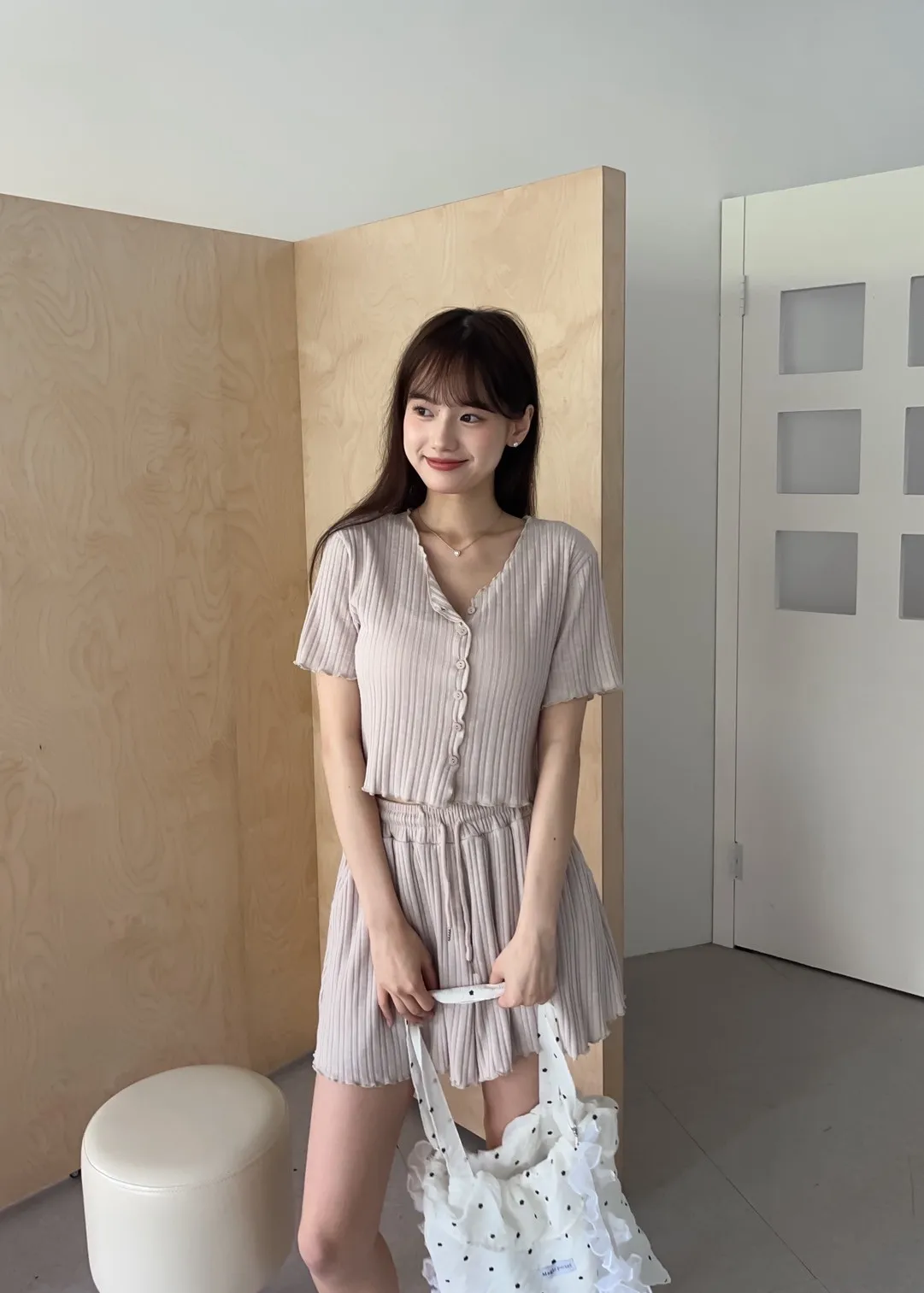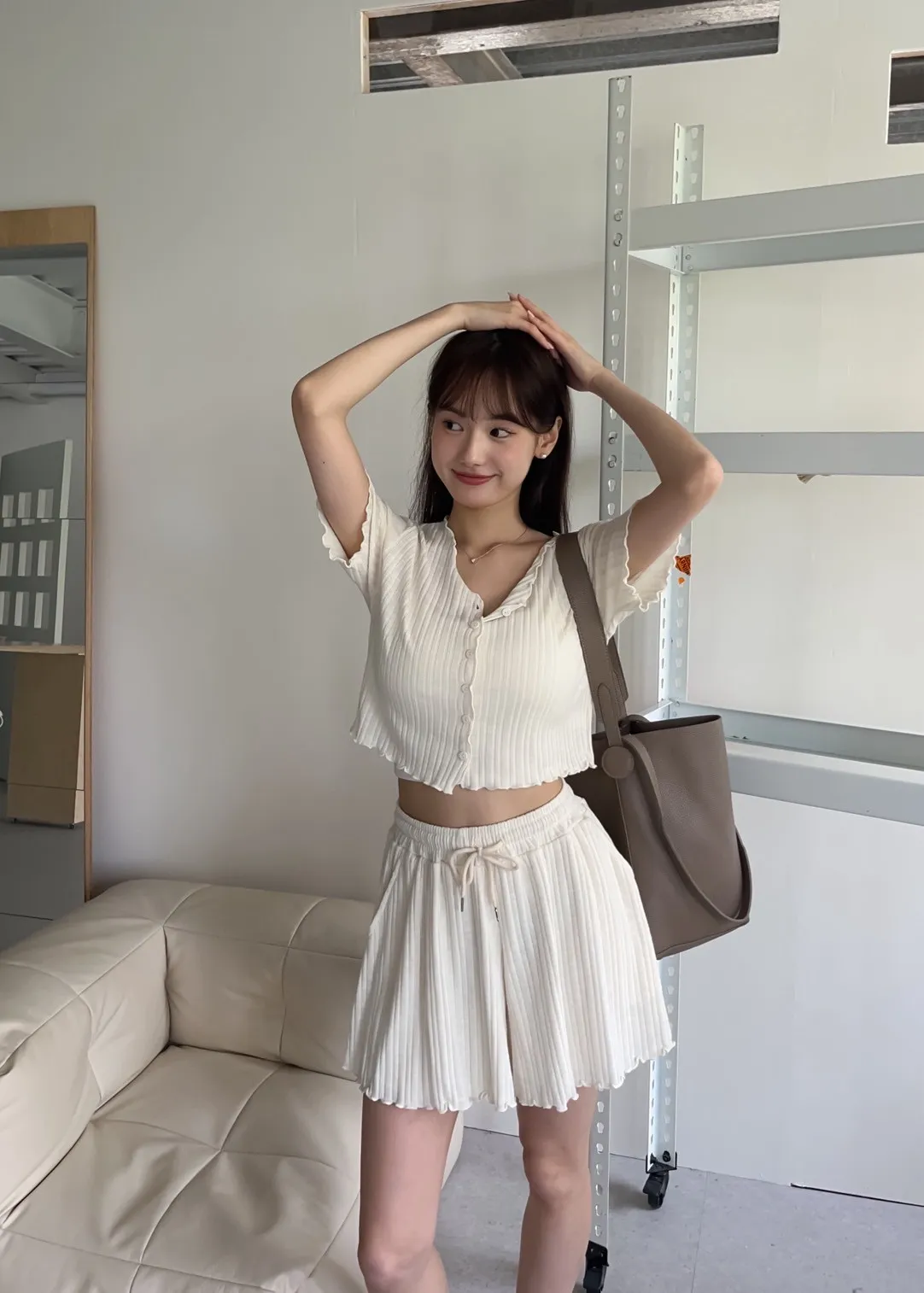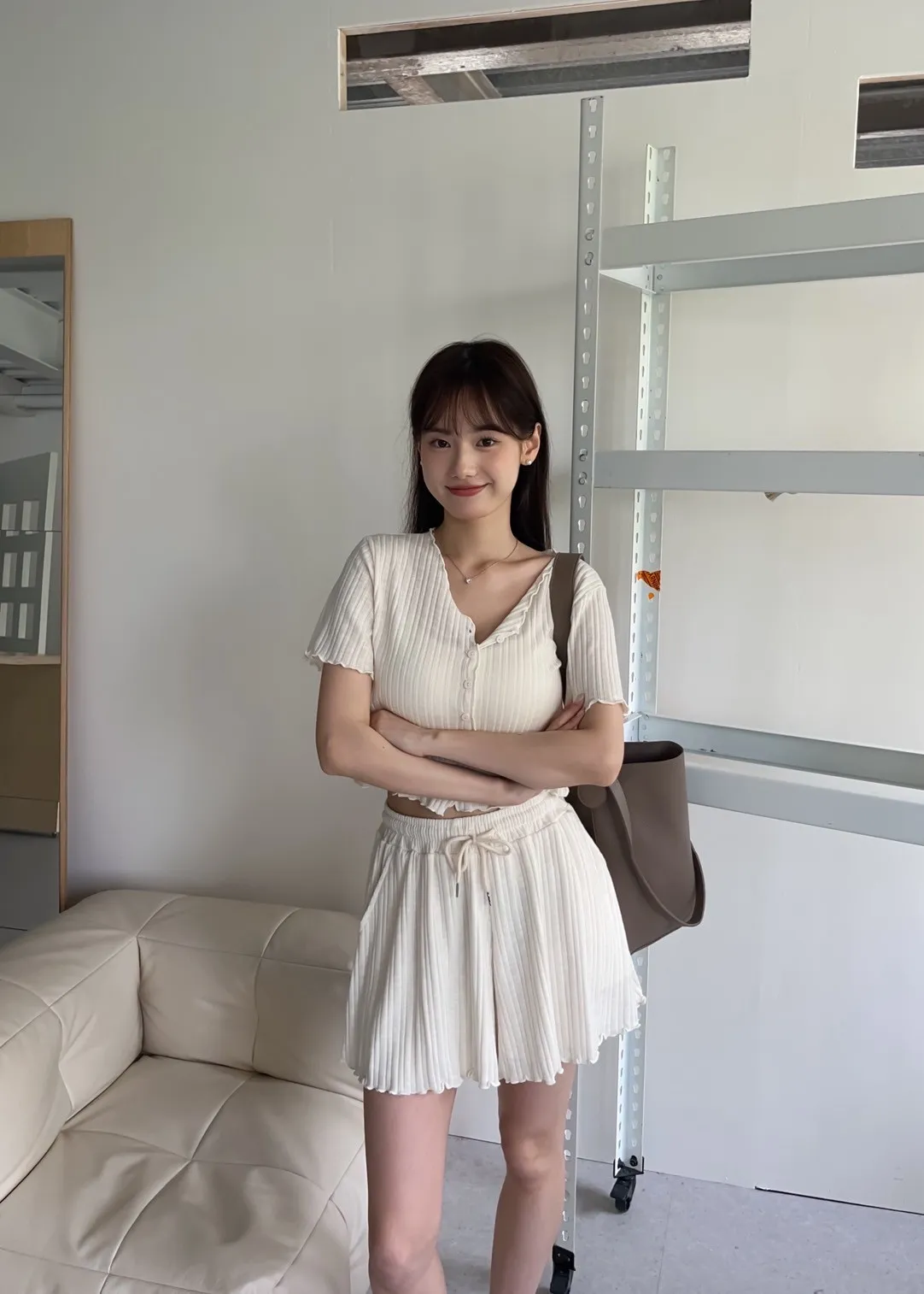 sm1504(She made)浪漫捲邊排扣上衣+捲邊短褲(米/藕粉/黑)(售完不補)